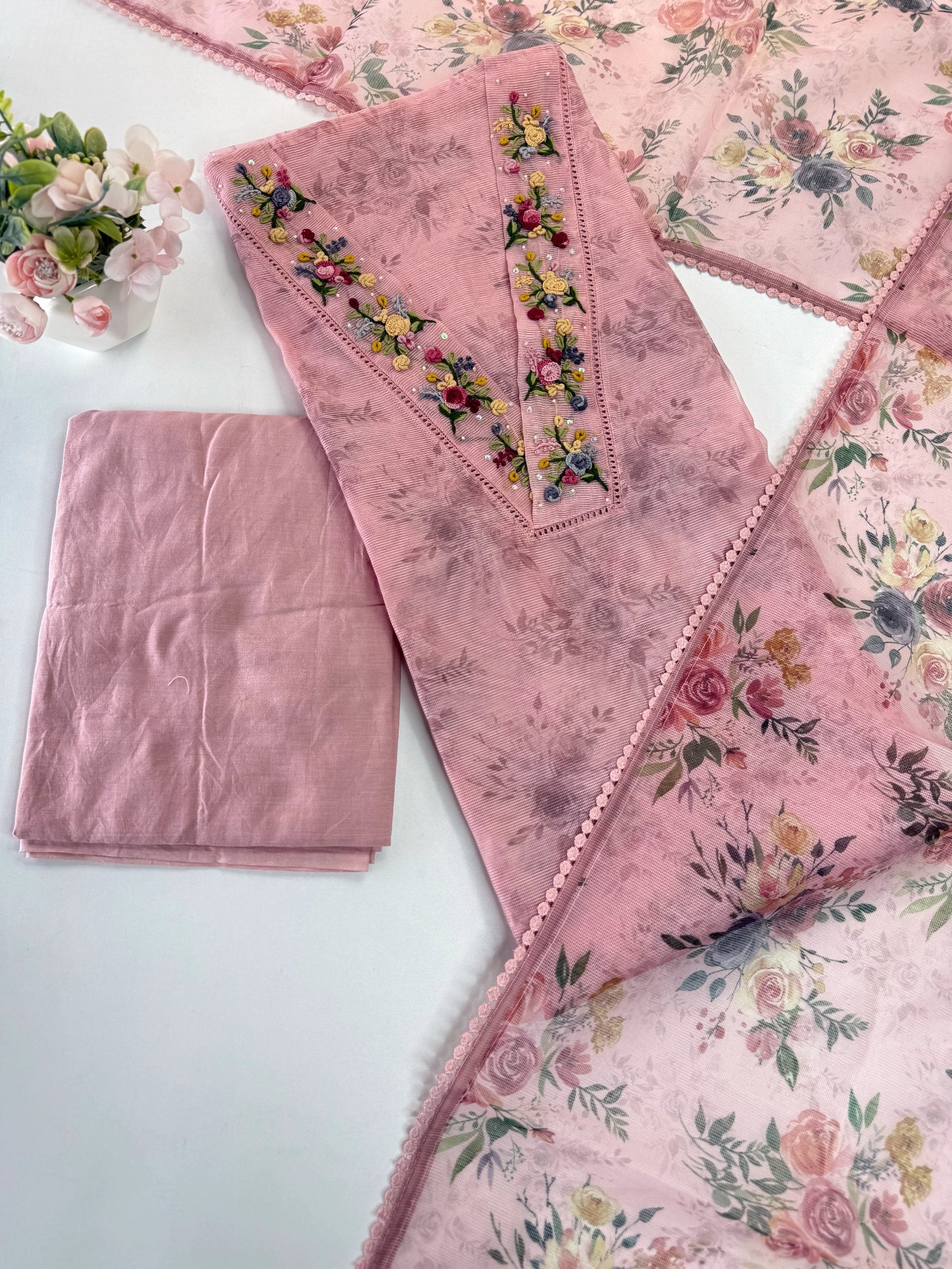 This elegant unstitched salwar set is crafted in airy printed Kota fabric, offering a lightweight and breathable feel. The top is beautifully enhanced with intricate hand embroidery along the V-neckline, featuring delicate floral motifs highlighted with fine detailing for a refined handcrafted finish.