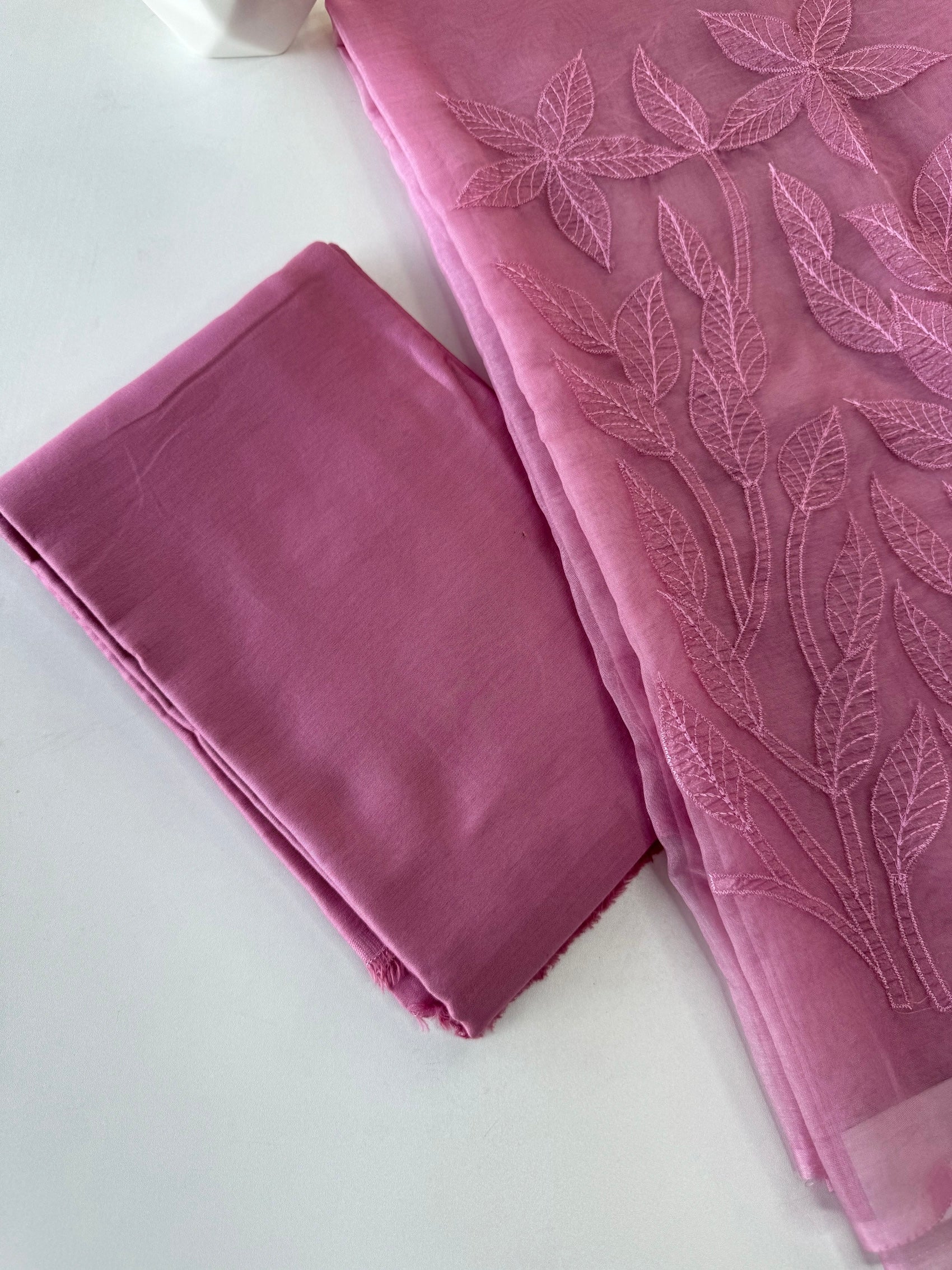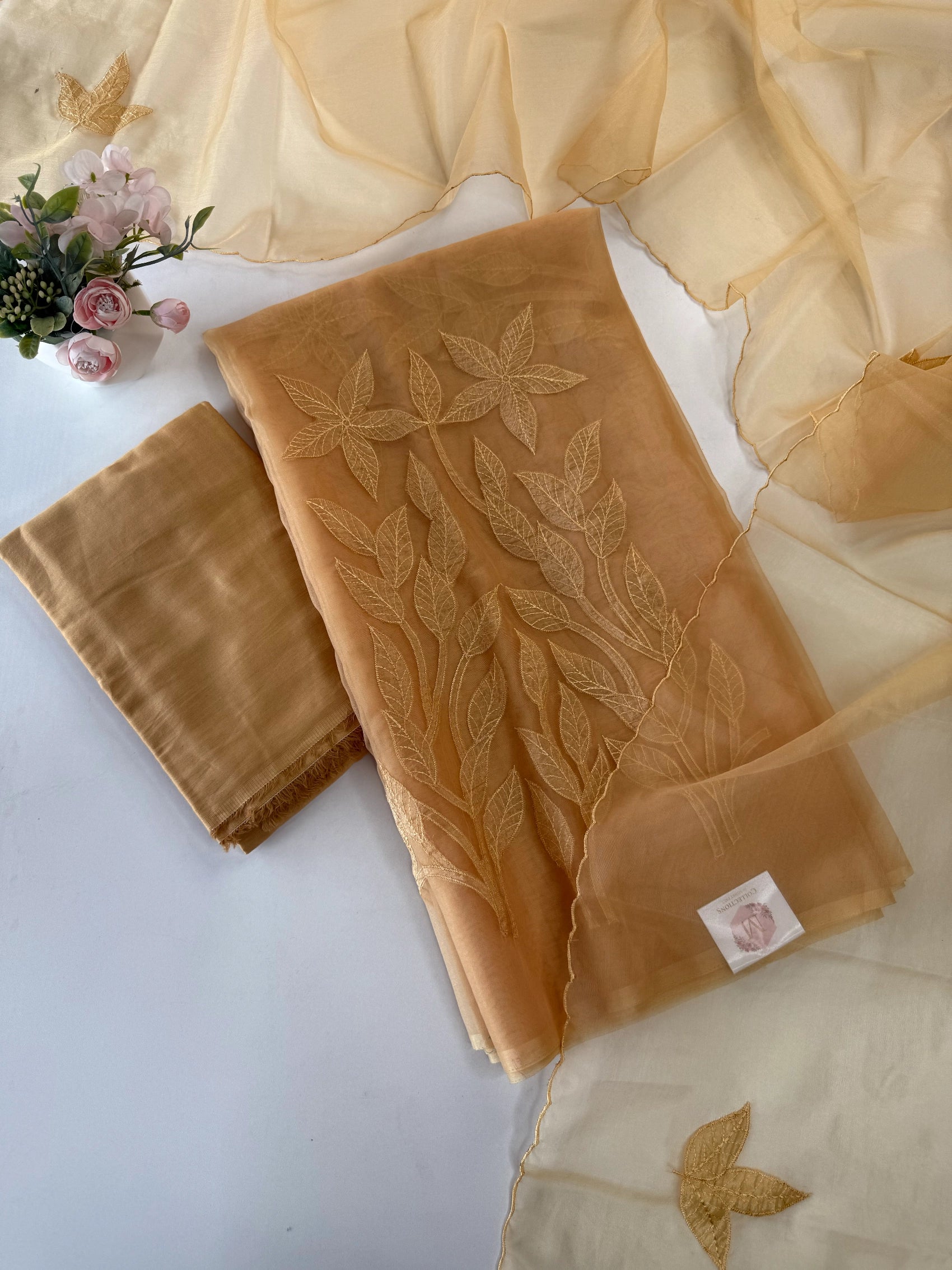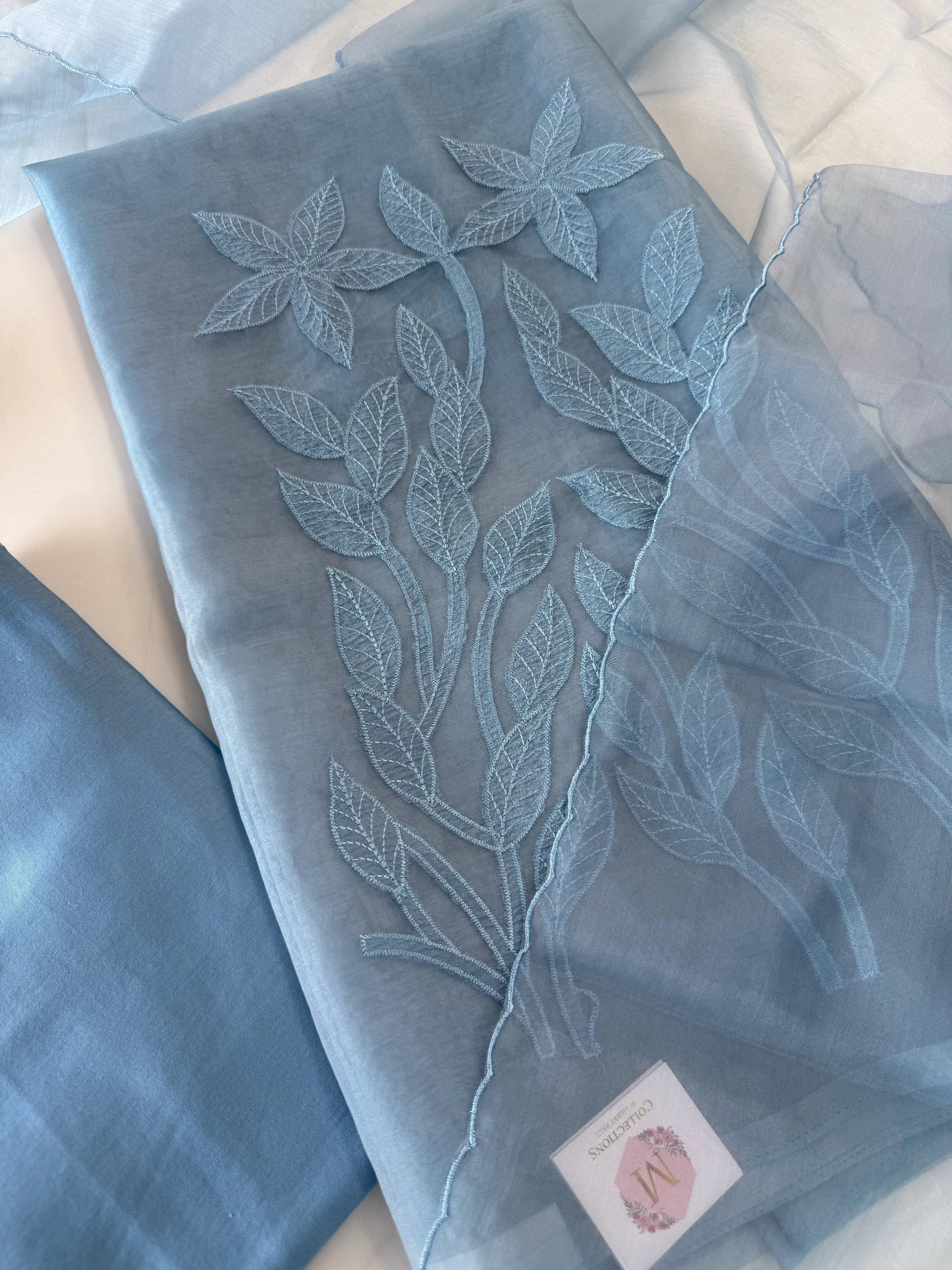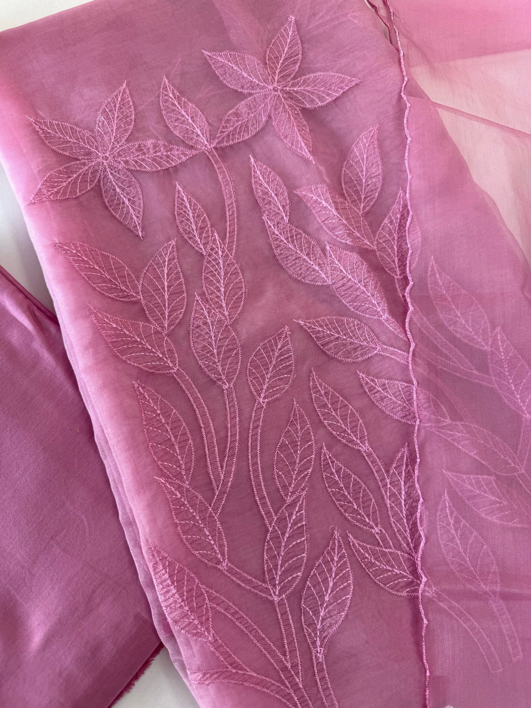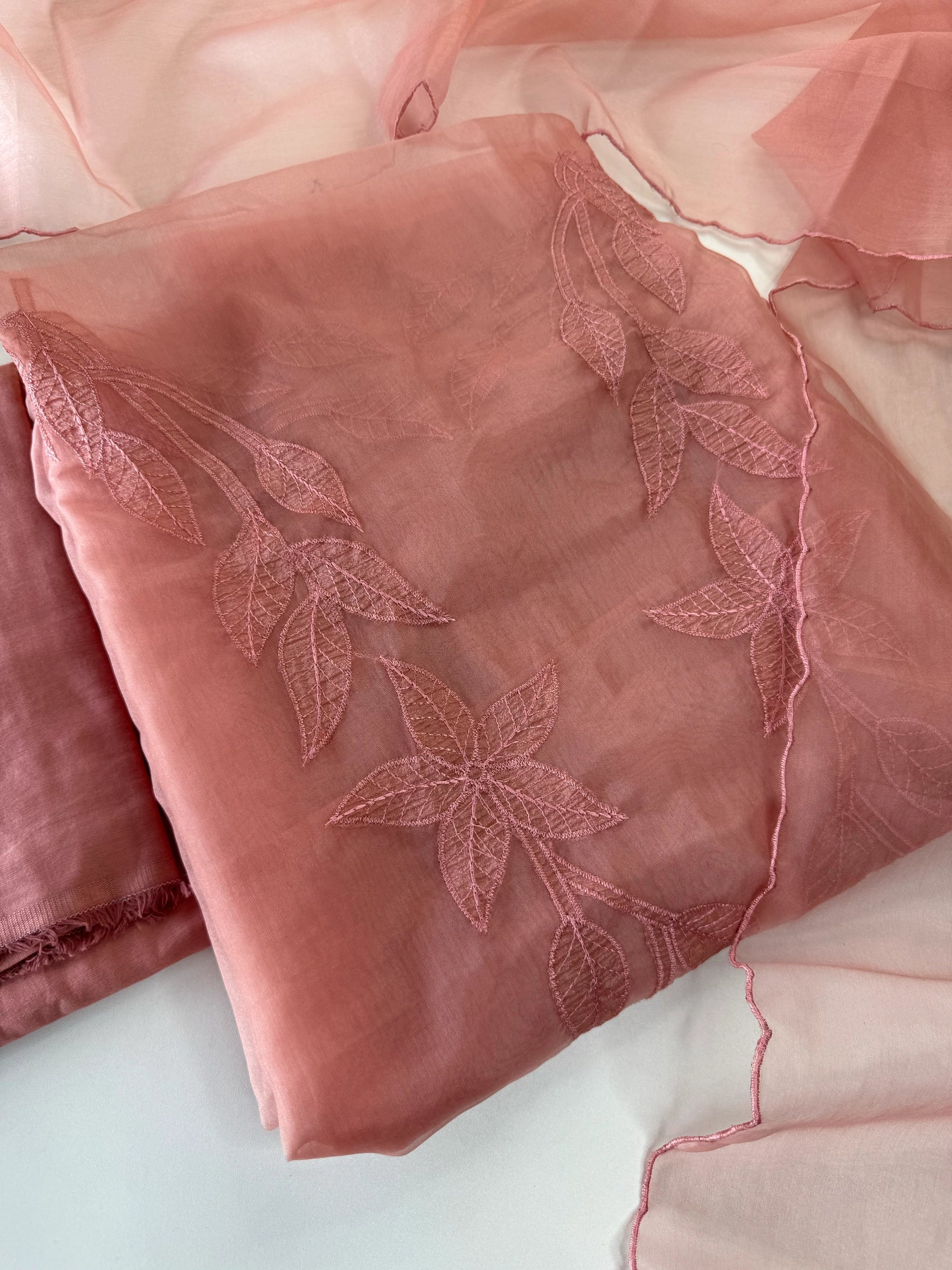 Elegant soft organza top fabric paired with a matching organza dupatta, beautifully highlighted with delicate leaf-inspired thread work spread across the dupatta.