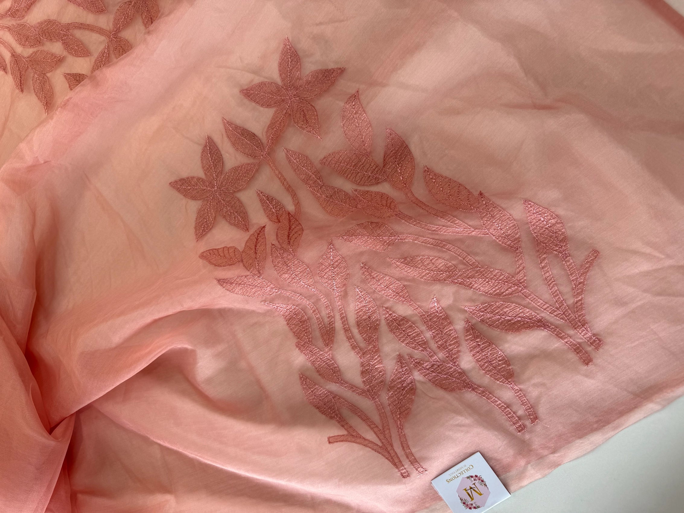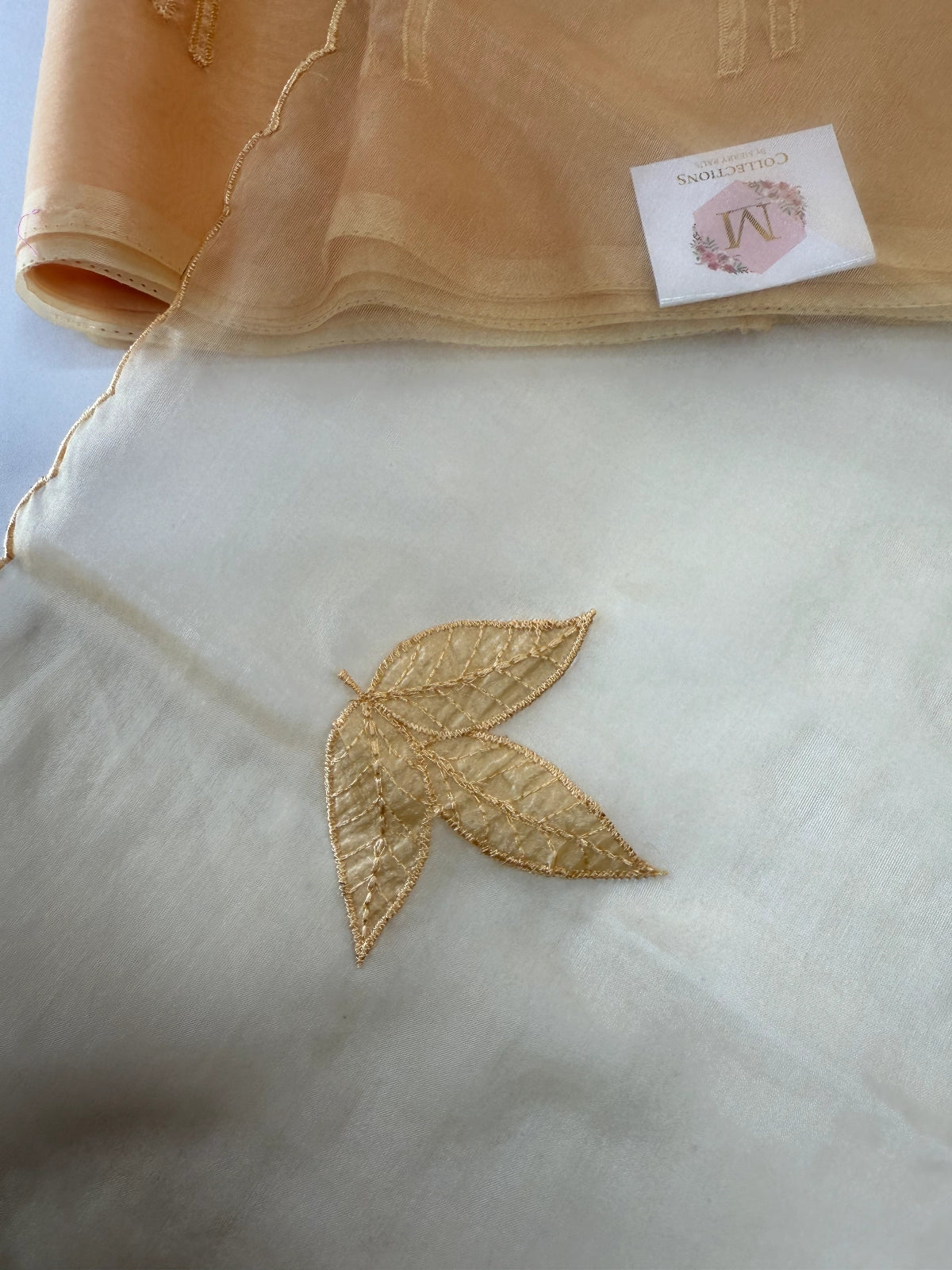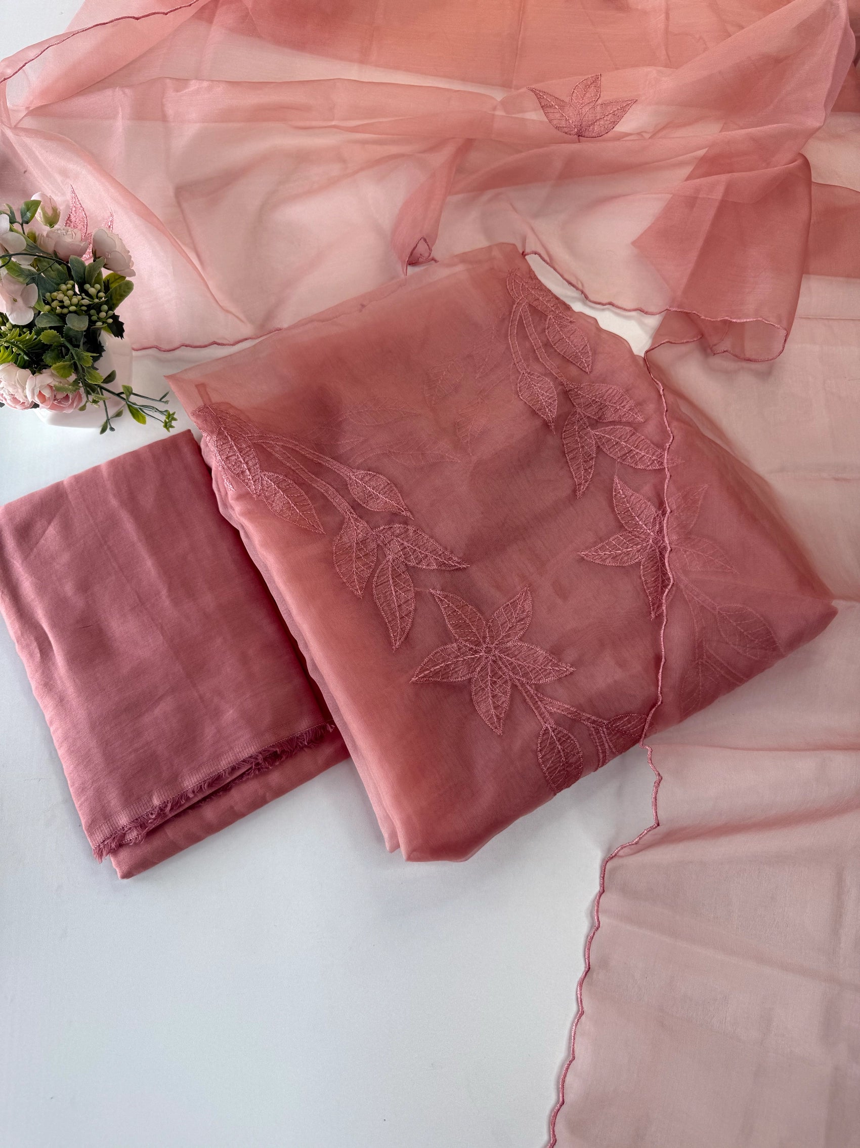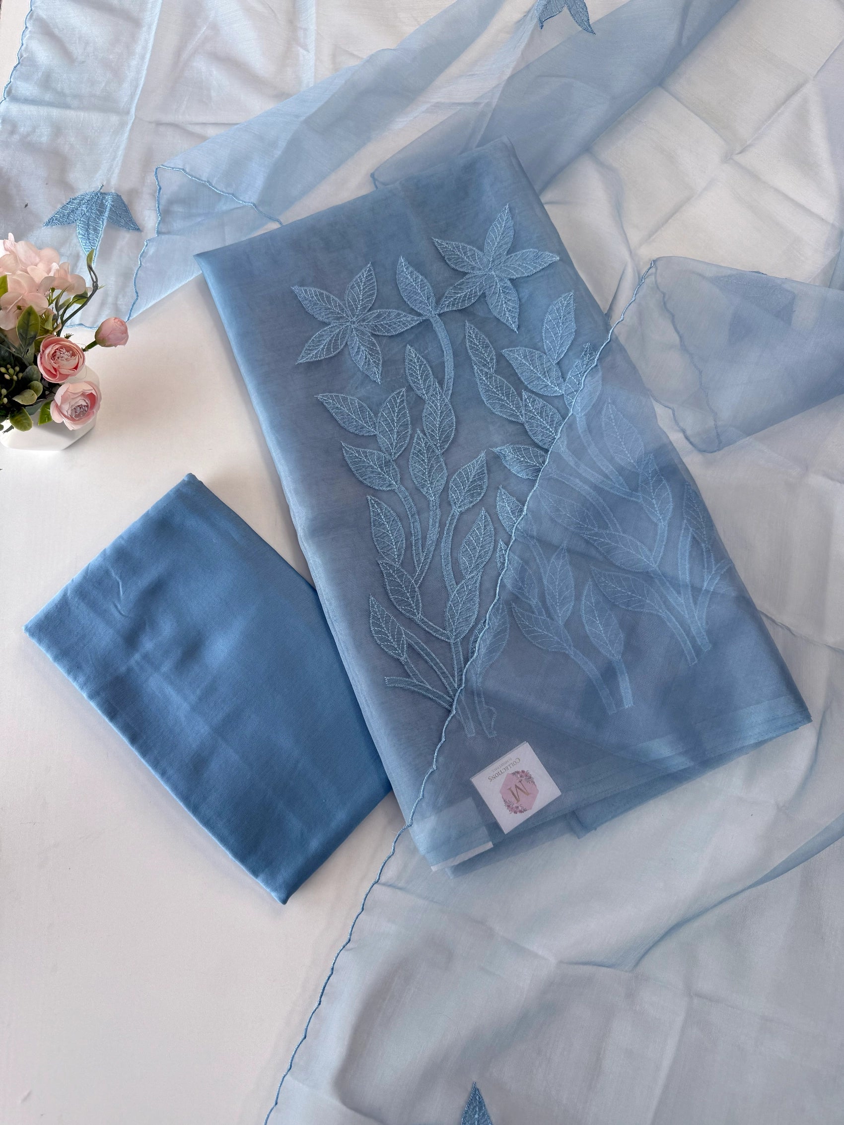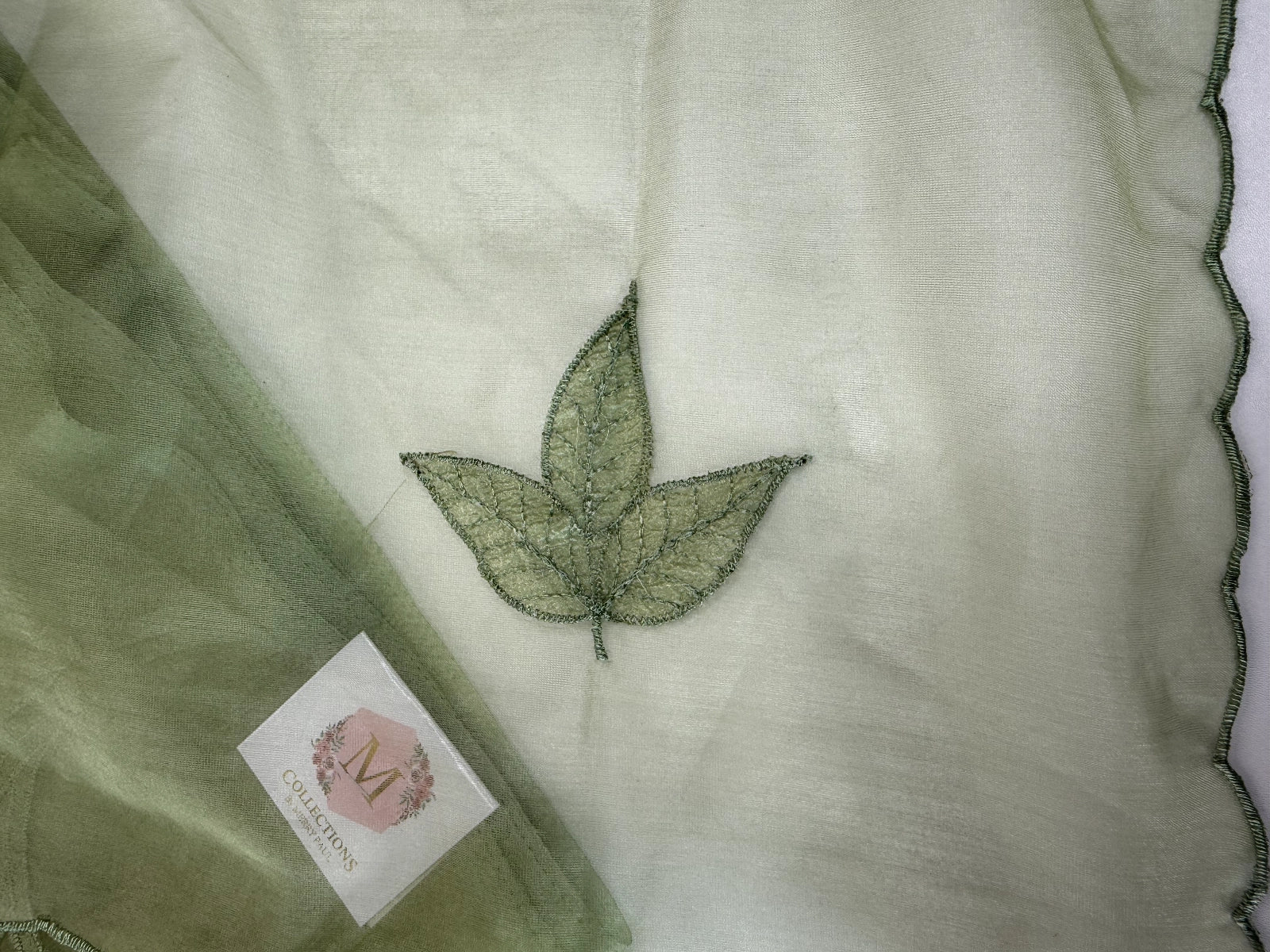 Elegant soft organza top fabric paired with a matching organza dupatta, beautifully highlighted with delicate leaf-inspired thread work spread across the dupatta.