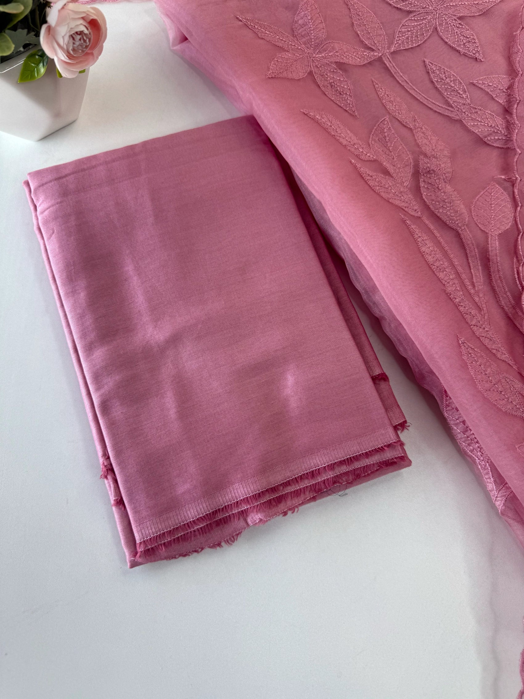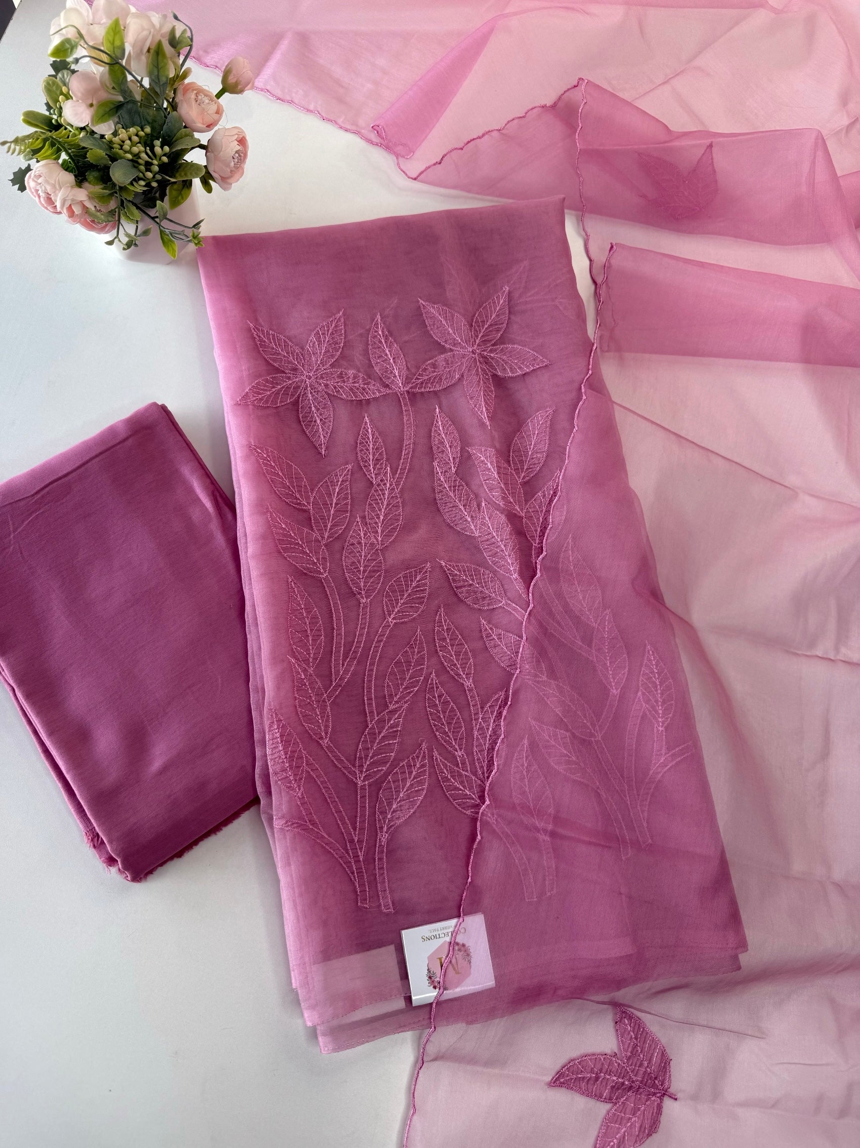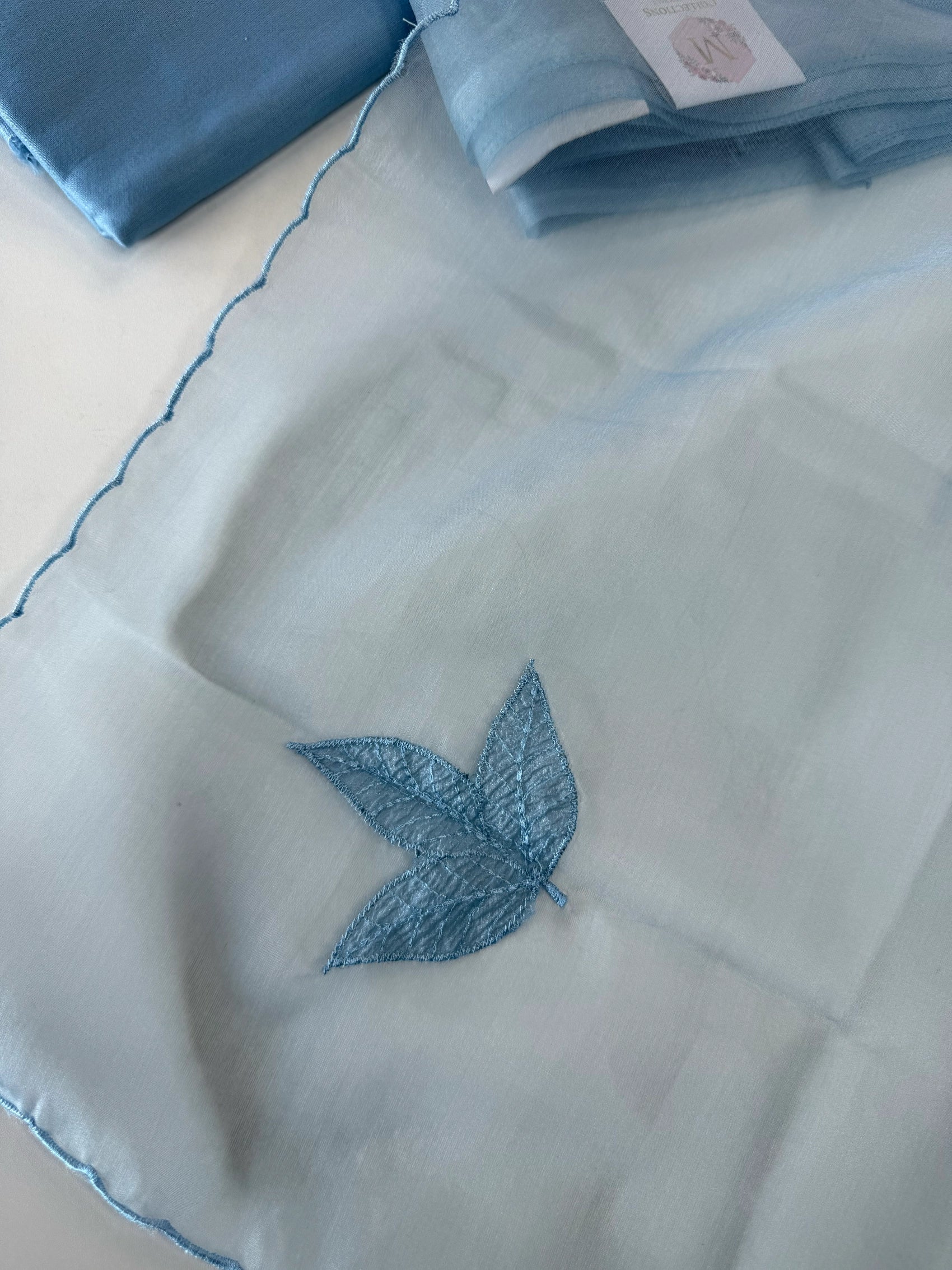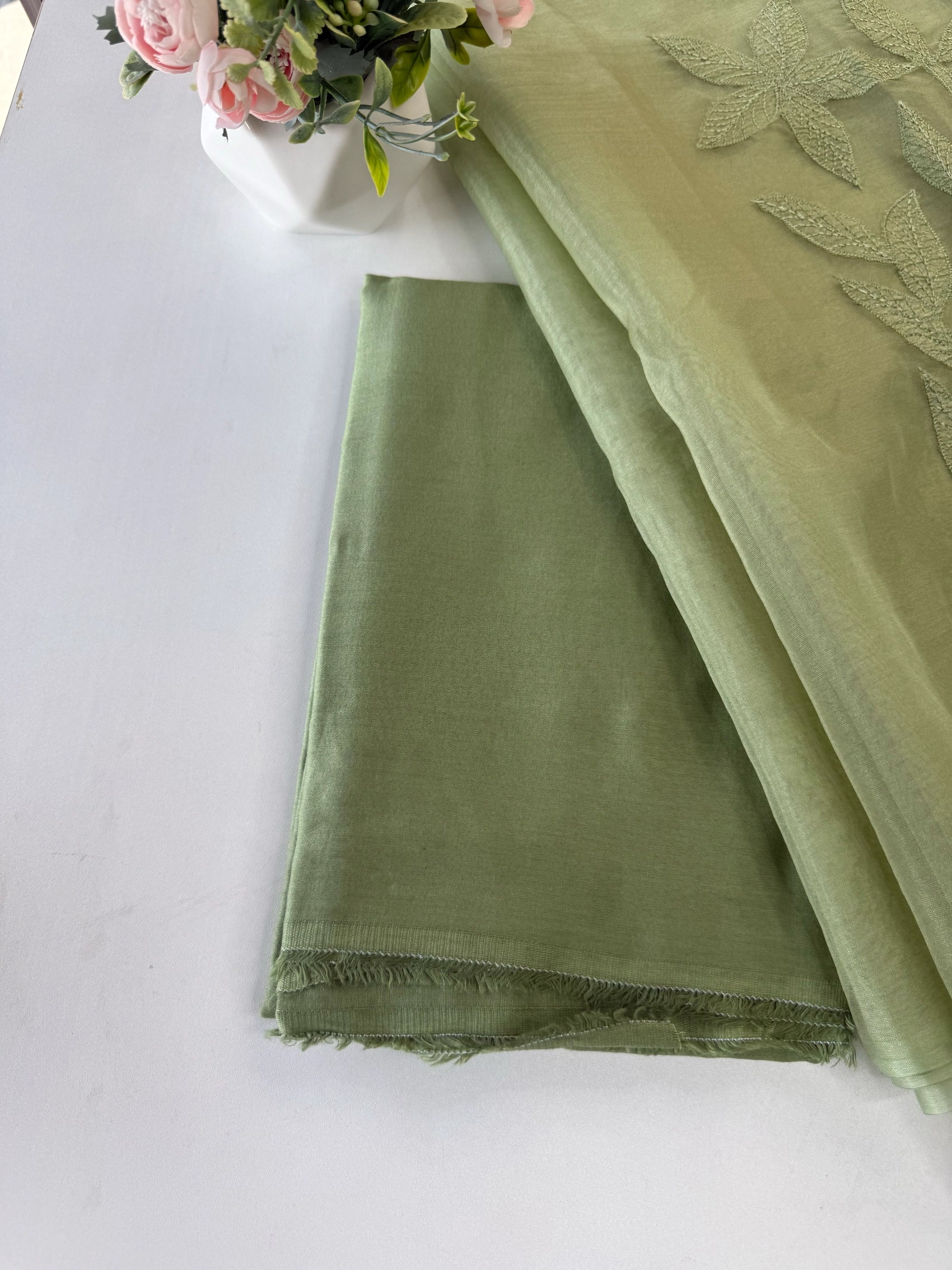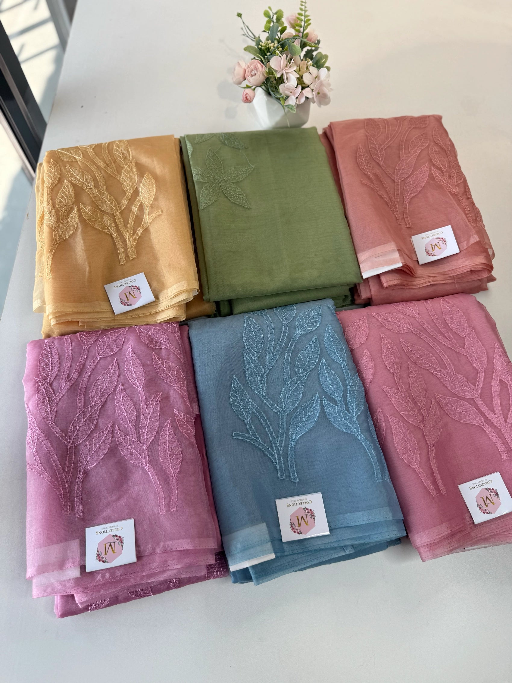 Elegant soft organza top fabric paired with a matching organza dupatta, beautifully highlighted with delicate leaf-inspired thread work spread across the dupatta.