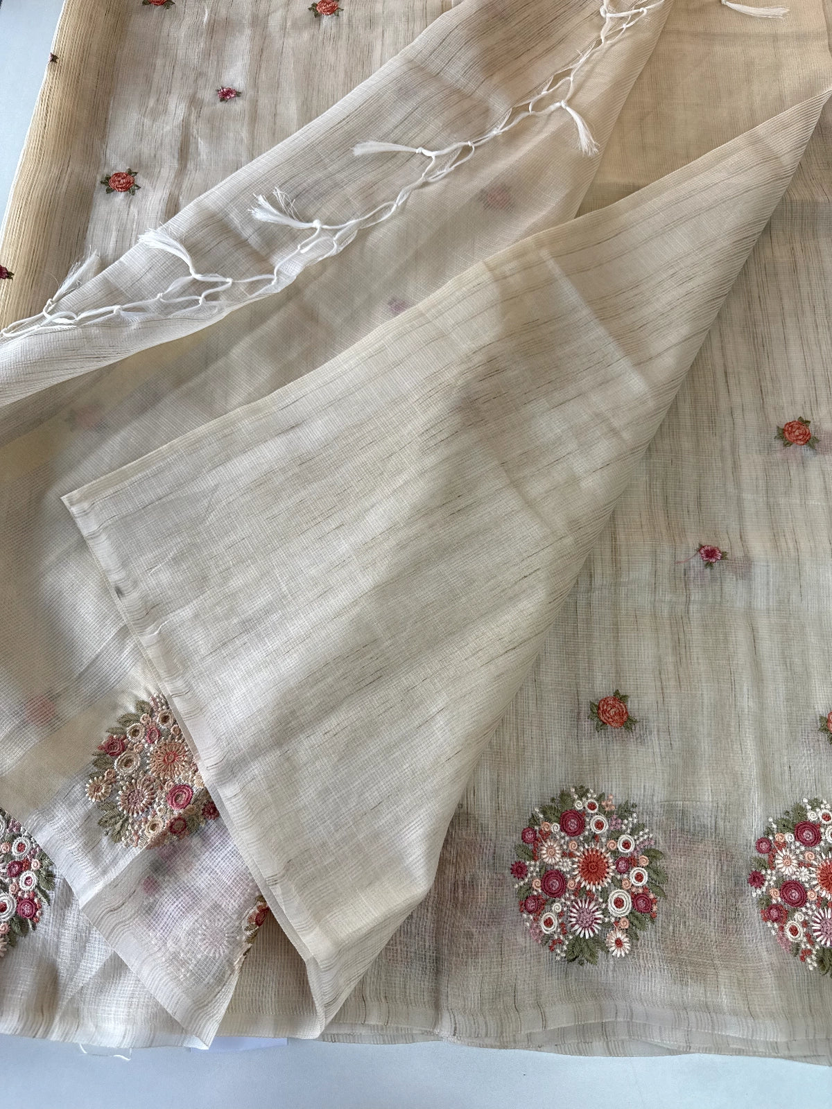Chanderi Kota–blended saree with a half inch geri border and thread-worked floral pattern in a circle design along the border. Features smaller floral motifs spread across the body and comes with a running plain blouse piece. Lightweight, easy to drape, easy to maintain, and very lightly transparent—perfect for elegant everyday wear.