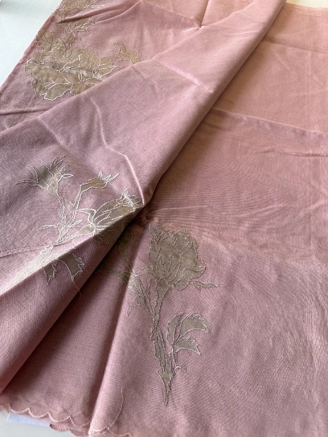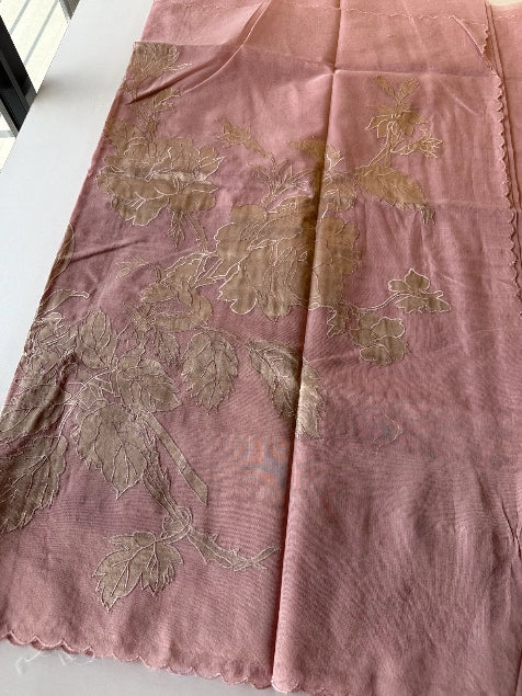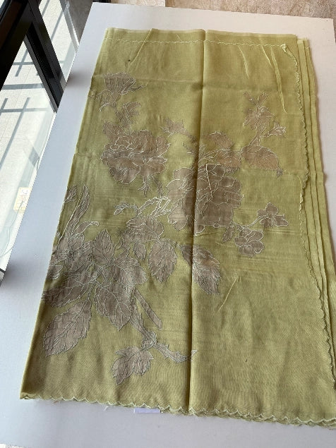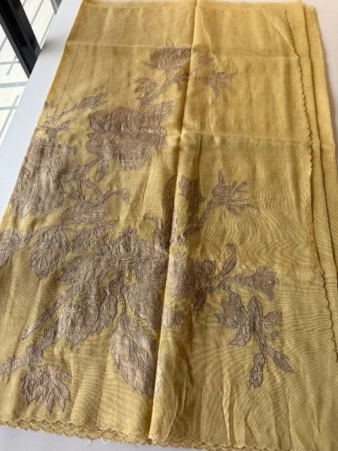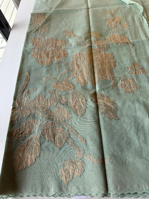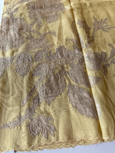 Chanderi tissue blend saree featuring golden appliqué work gracefully highlighted on the pallu. The borders are delicately scalloped, while golden appliqué motifs are scattered across the body for a subtle shimmer. The blouse piece carries dainty floral appliqué botas, complementing the saree beautifully. Lightweight and mildly transparent, this saree is perfect for an elegant and refined look.