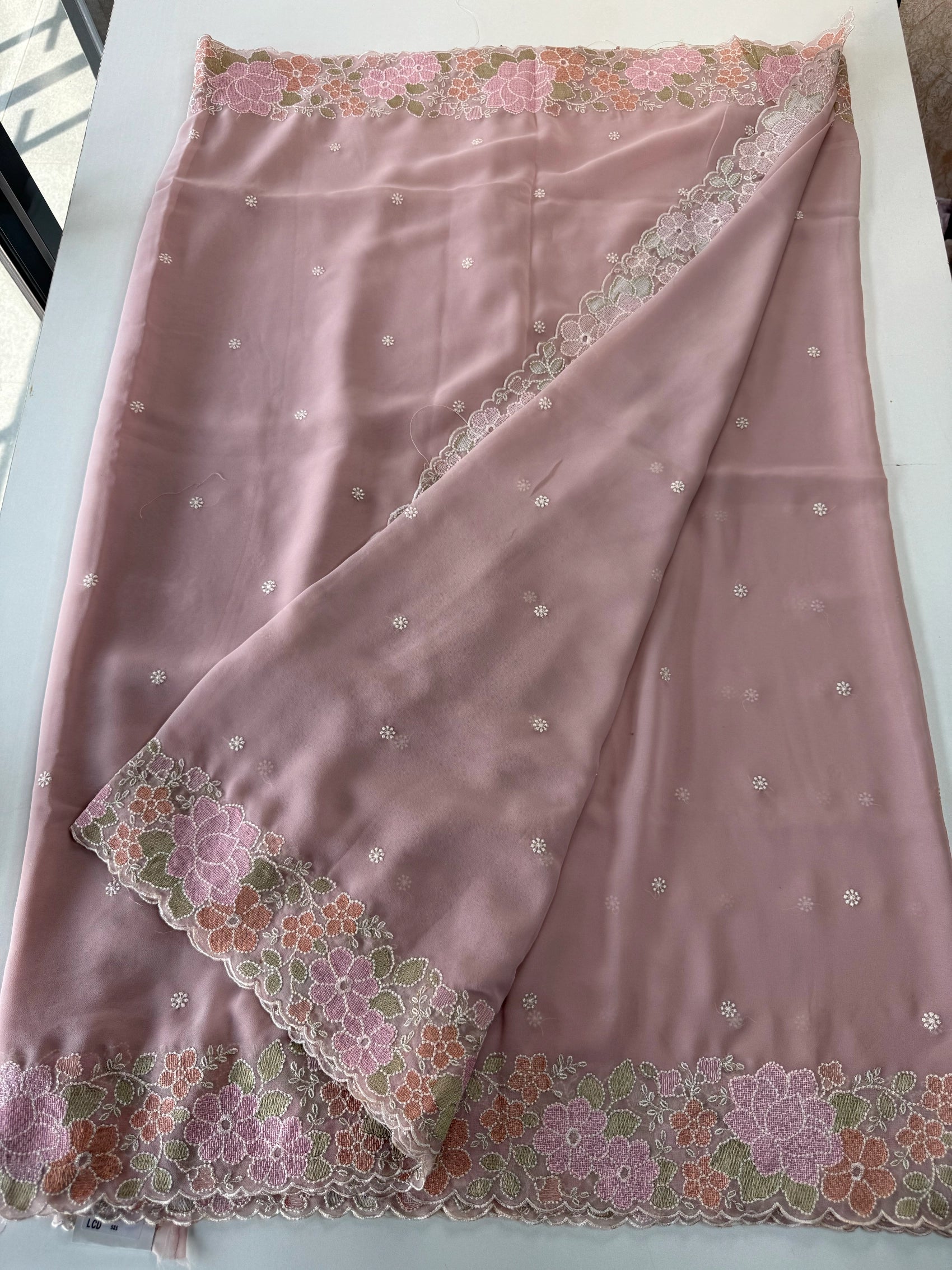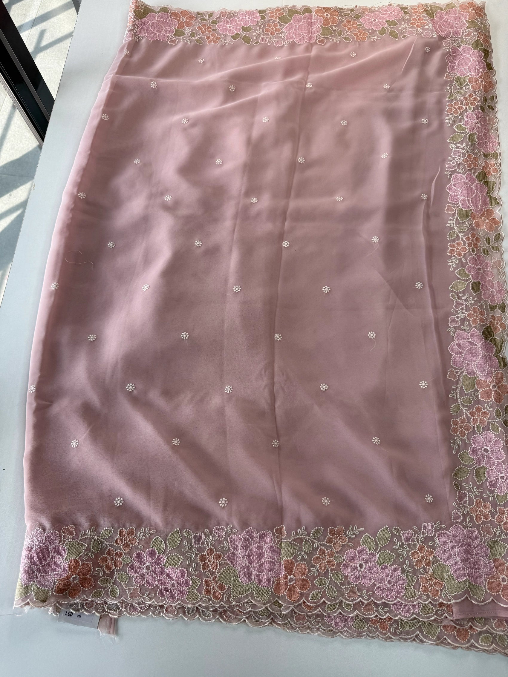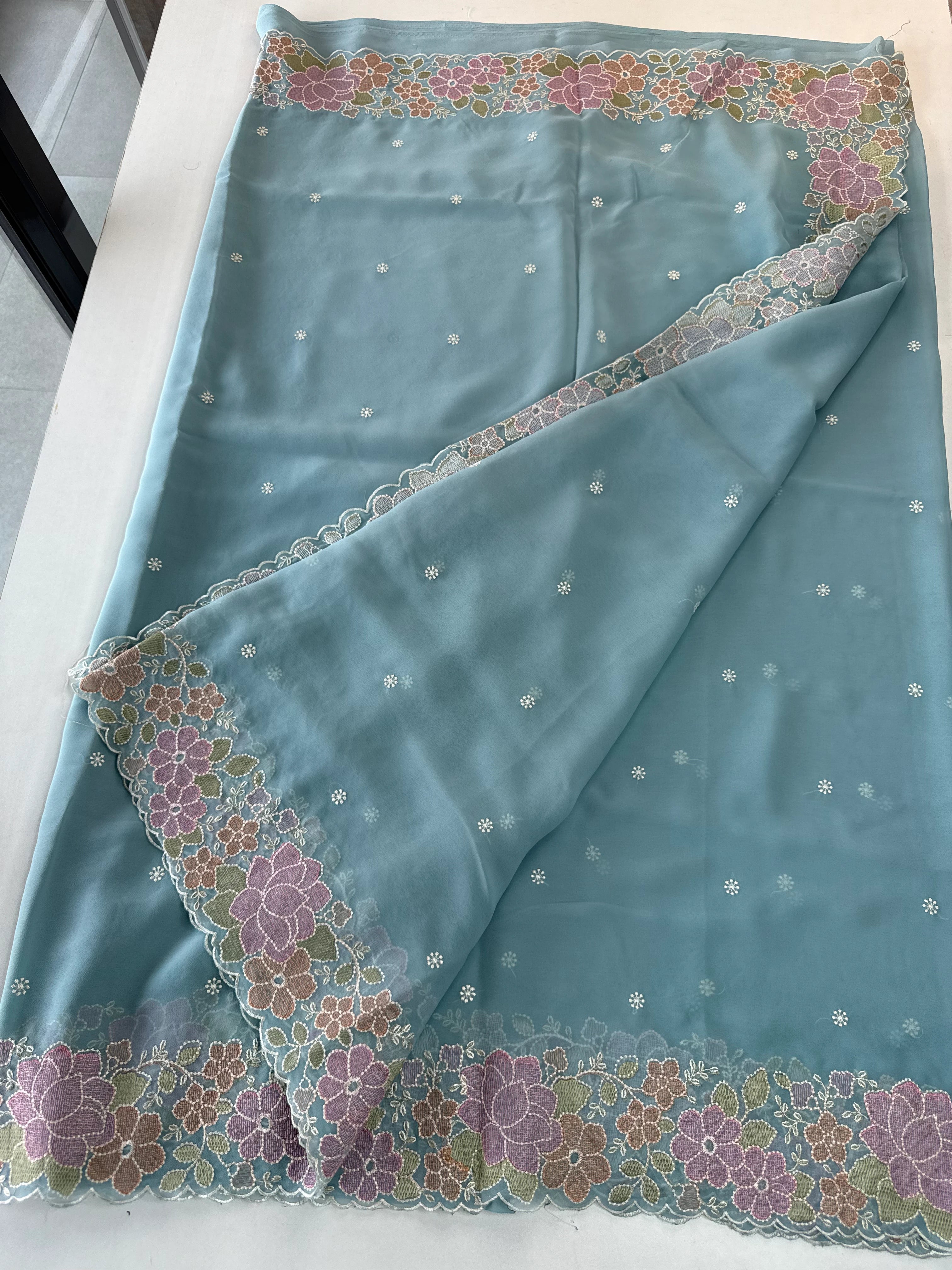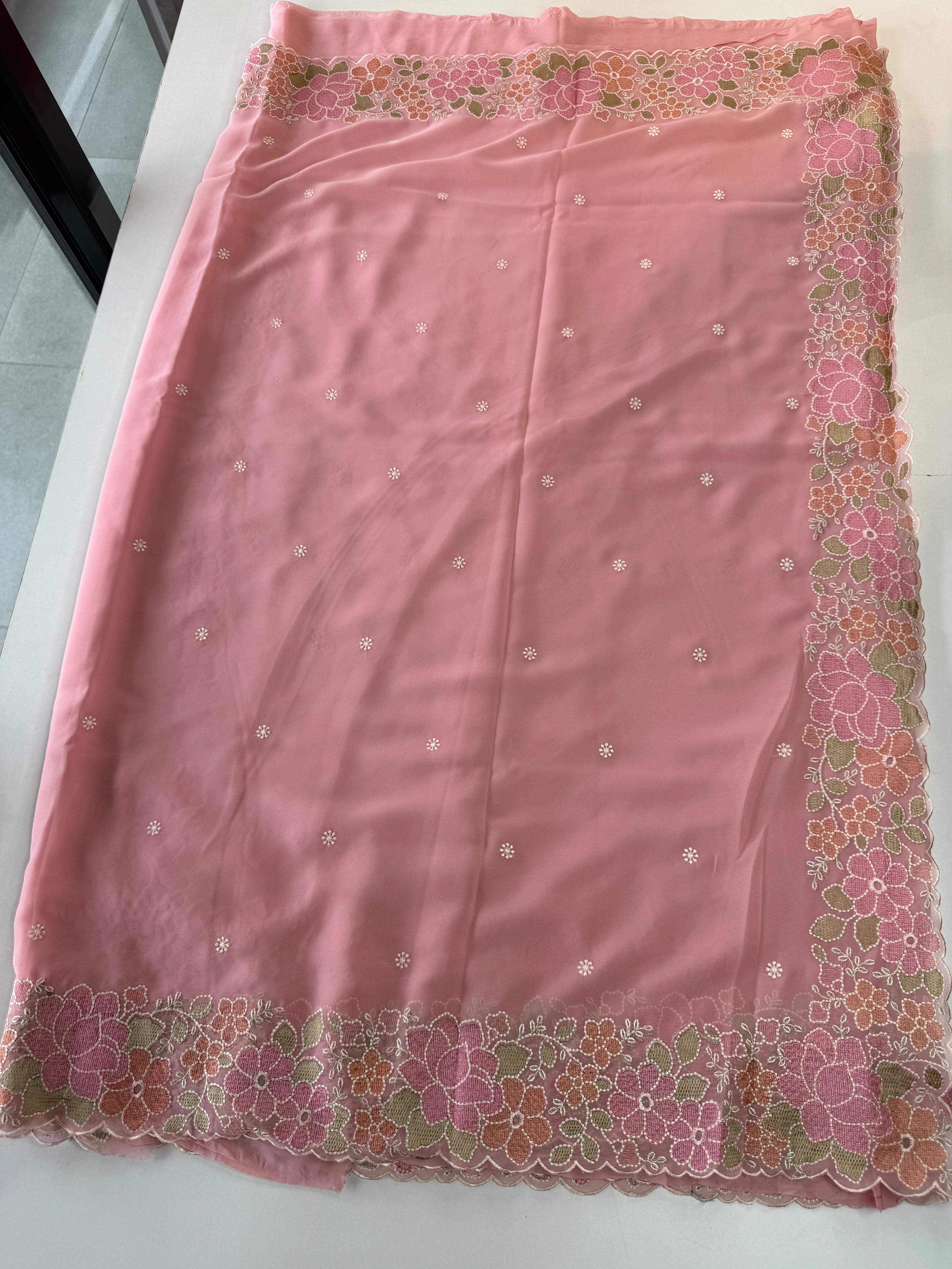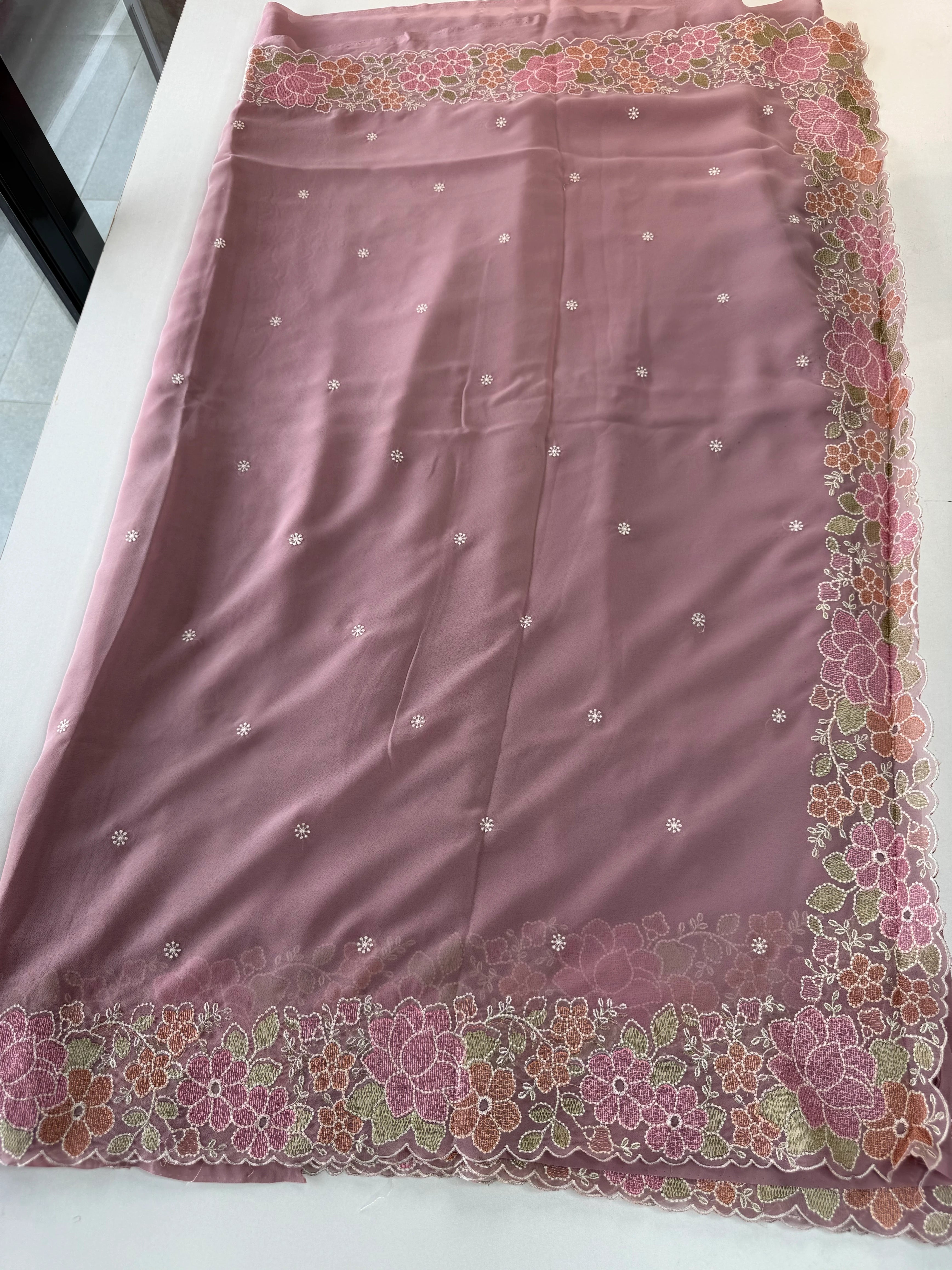 A flowy Georgette saree featuring an elegant thread-worked border, paired with a running blouse piece in the same fabric with matching sleeve-end detailing. The fabric drapes beautifully, is lightweight, slightly transparent, and extremely easy to carry—perfect for creating a graceful and effortless party-wear look.