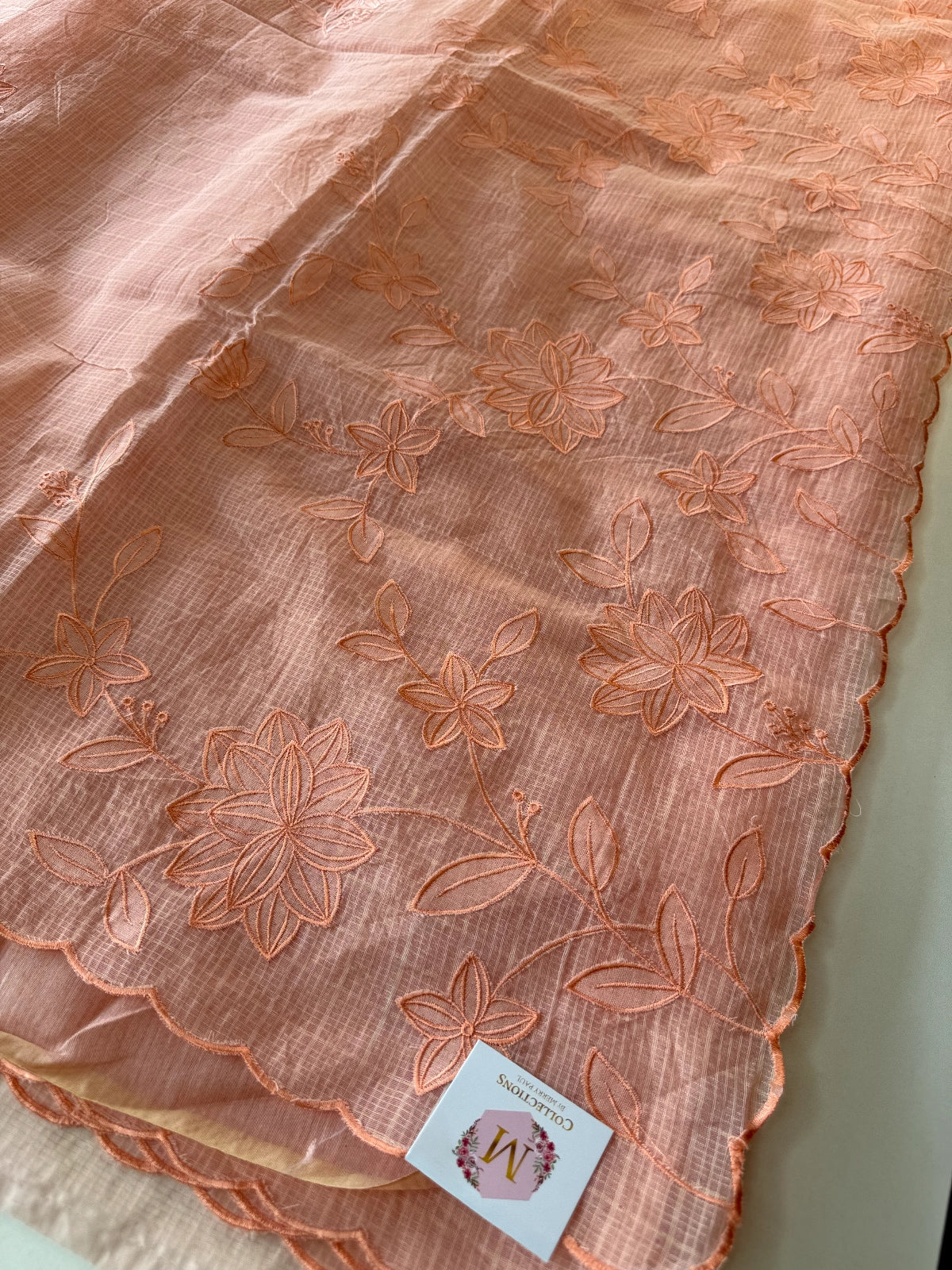 Net Kota saree featuring floral appliqué work on the pallu with scattered motifs across the body. Paired with a plain Chanderi-blend blouse piece. Medium-stiff drape with a mildly transparent finish.