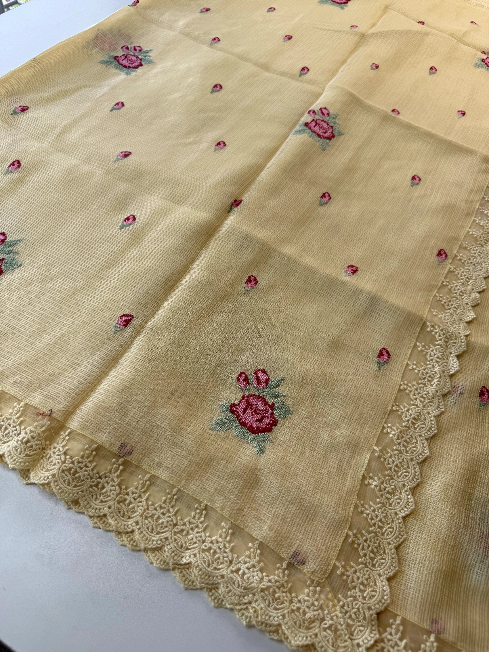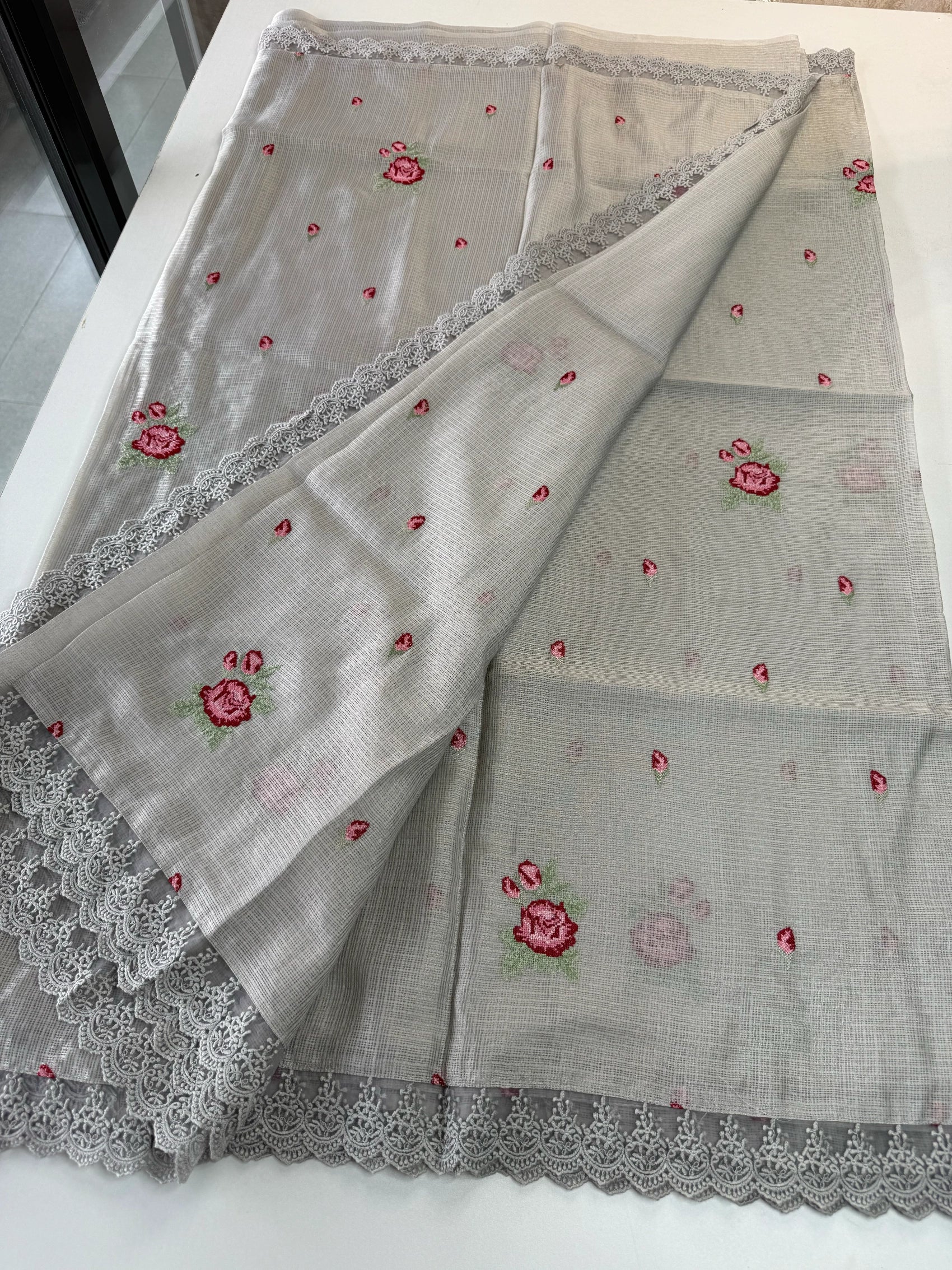 This silky Kota saree features delicate floral thread work spread gracefully across the body, adding a soft handcrafted charm. The borders are beautifully finished with fine lace detailing, enhancing the overall elegance of the drape. Lightweight and airy, this saree is easy to carry and perfect for long hours of wear. It comes with a running blouse piece, highlighted with matching lace detailing at the sleeve ends, completing the look effortlessly. Ideal for festive occasions, daytime functions, and elegant gatherings.