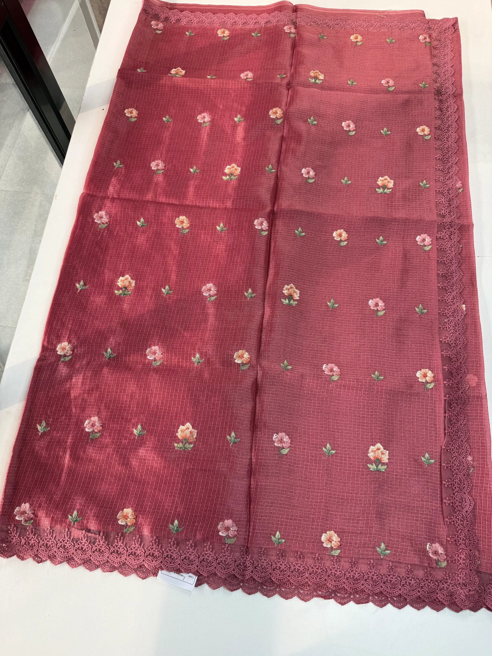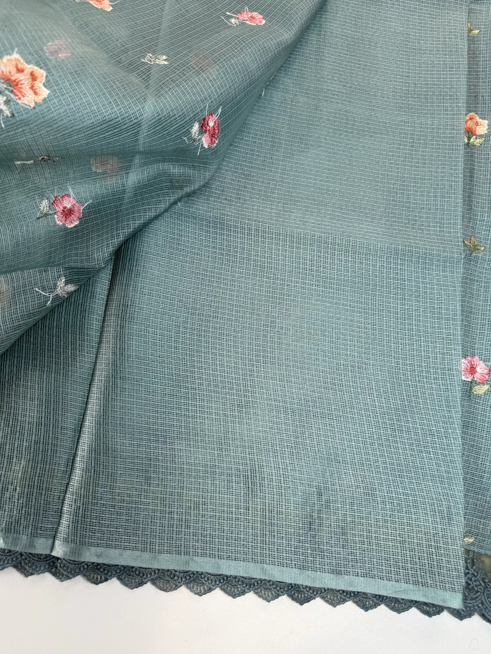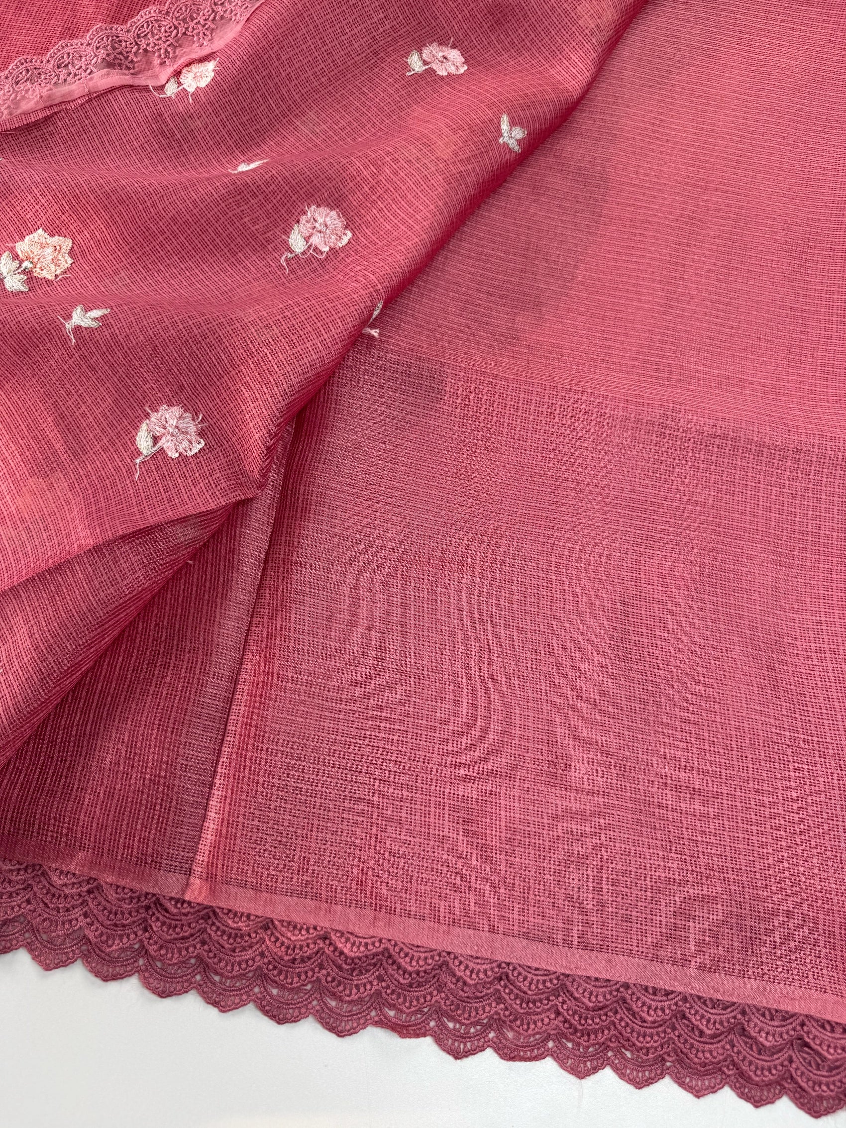 This silky Kota saree features delicate floral thread work spread gracefully across the body, adding a soft handcrafted charm. The borders are beautifully finished with fine lace detailing, enhancing the overall elegance of the drape. Lightweight and airy, this saree is easy to carry and perfect for long hours of wear. It comes with a running blouse piece, highlighted with matching lace detailing at the sleeve ends, completing the look effortlessly. Ideal for festive occasions, daytime functions, and elegant gatherings.