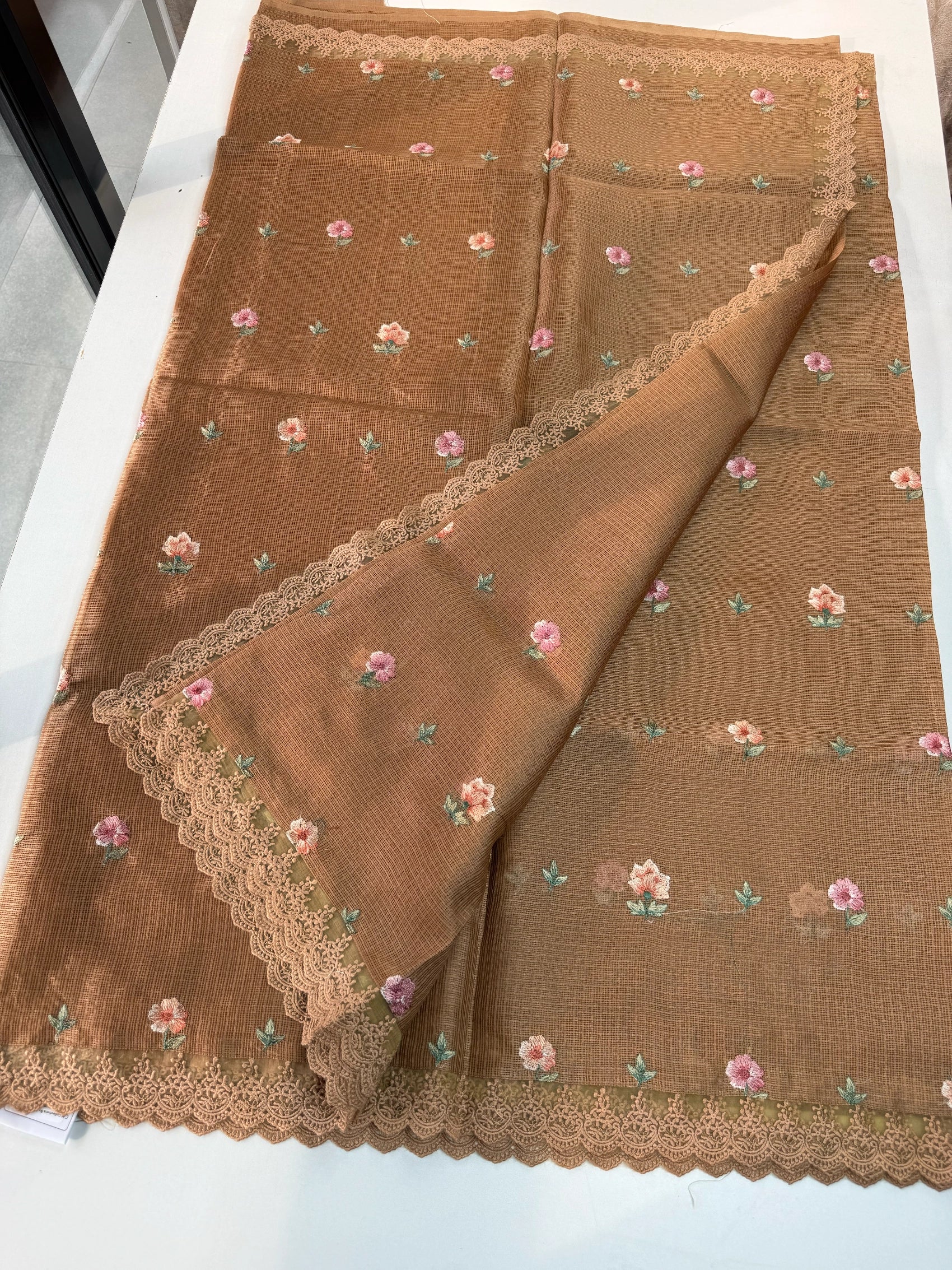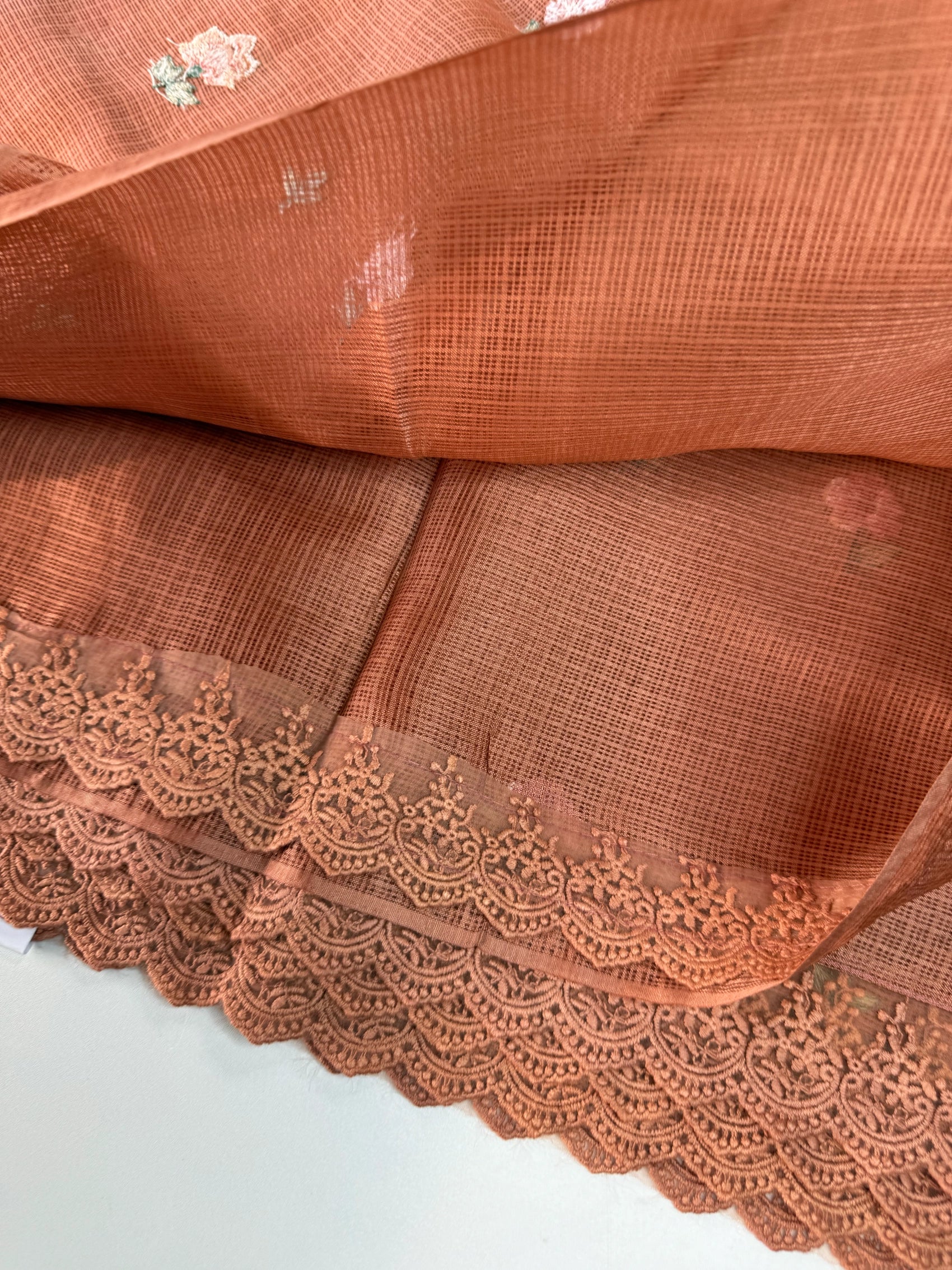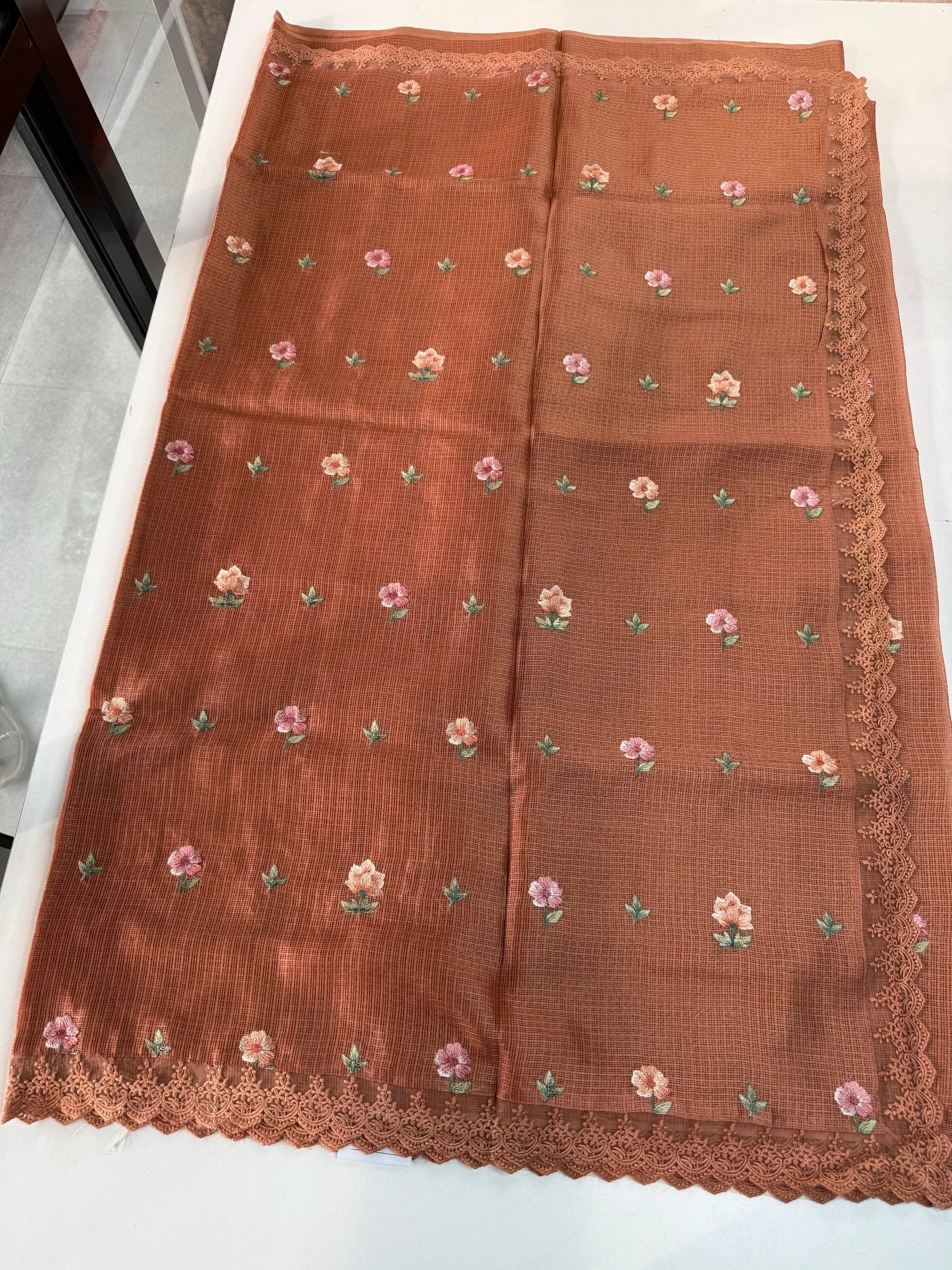 This silky Kota saree features delicate floral thread work spread gracefully across the body, adding a soft handcrafted charm. The borders are beautifully finished with fine lace detailing, enhancing the overall elegance of the drape. Lightweight and airy, this saree is easy to carry and perfect for long hours of wear. It comes with a running blouse piece, highlighted with matching lace detailing at the sleeve ends, completing the look effortlessly. Ideal for festive occasions, daytime functions, and elegant gatherings.