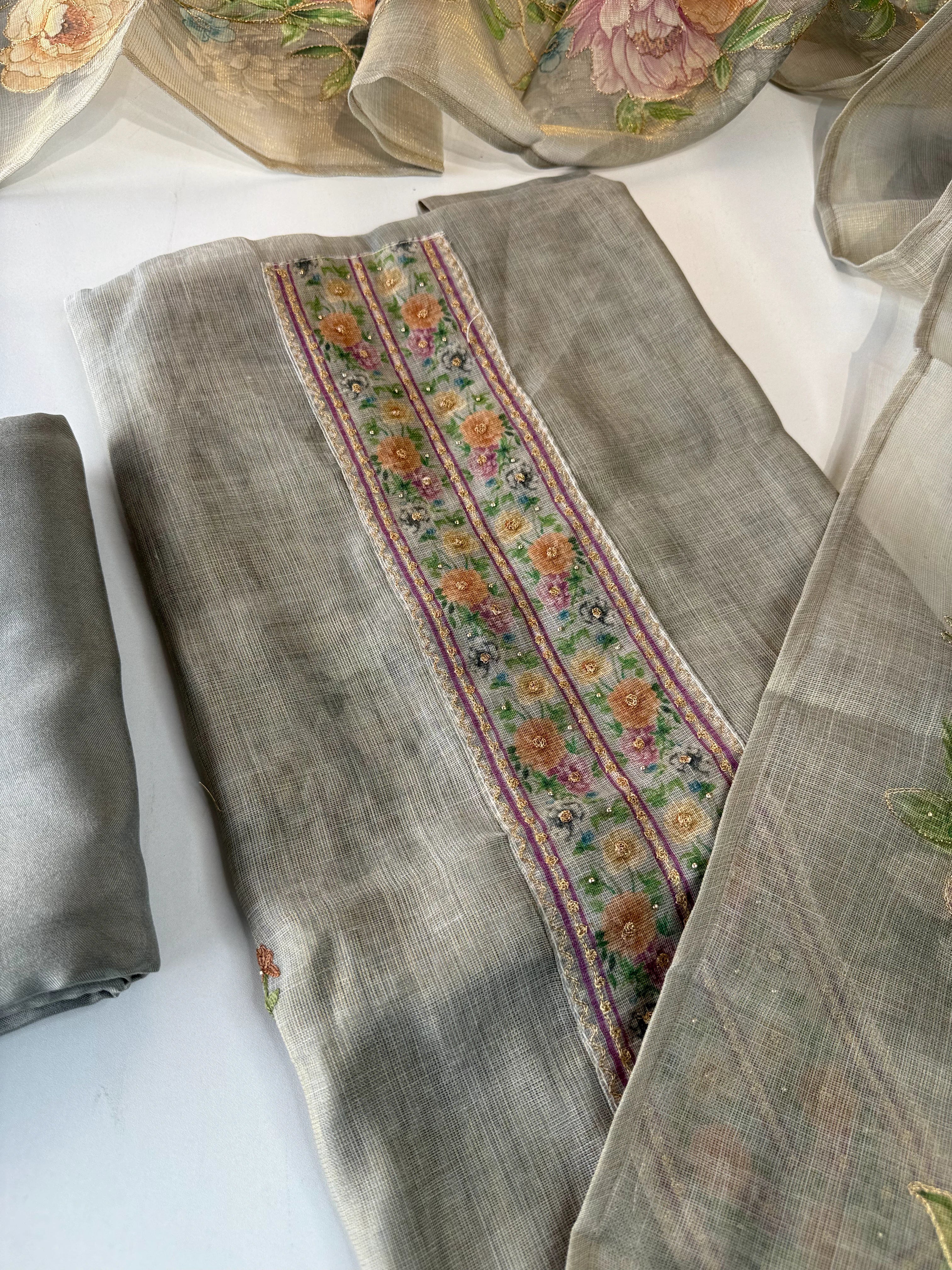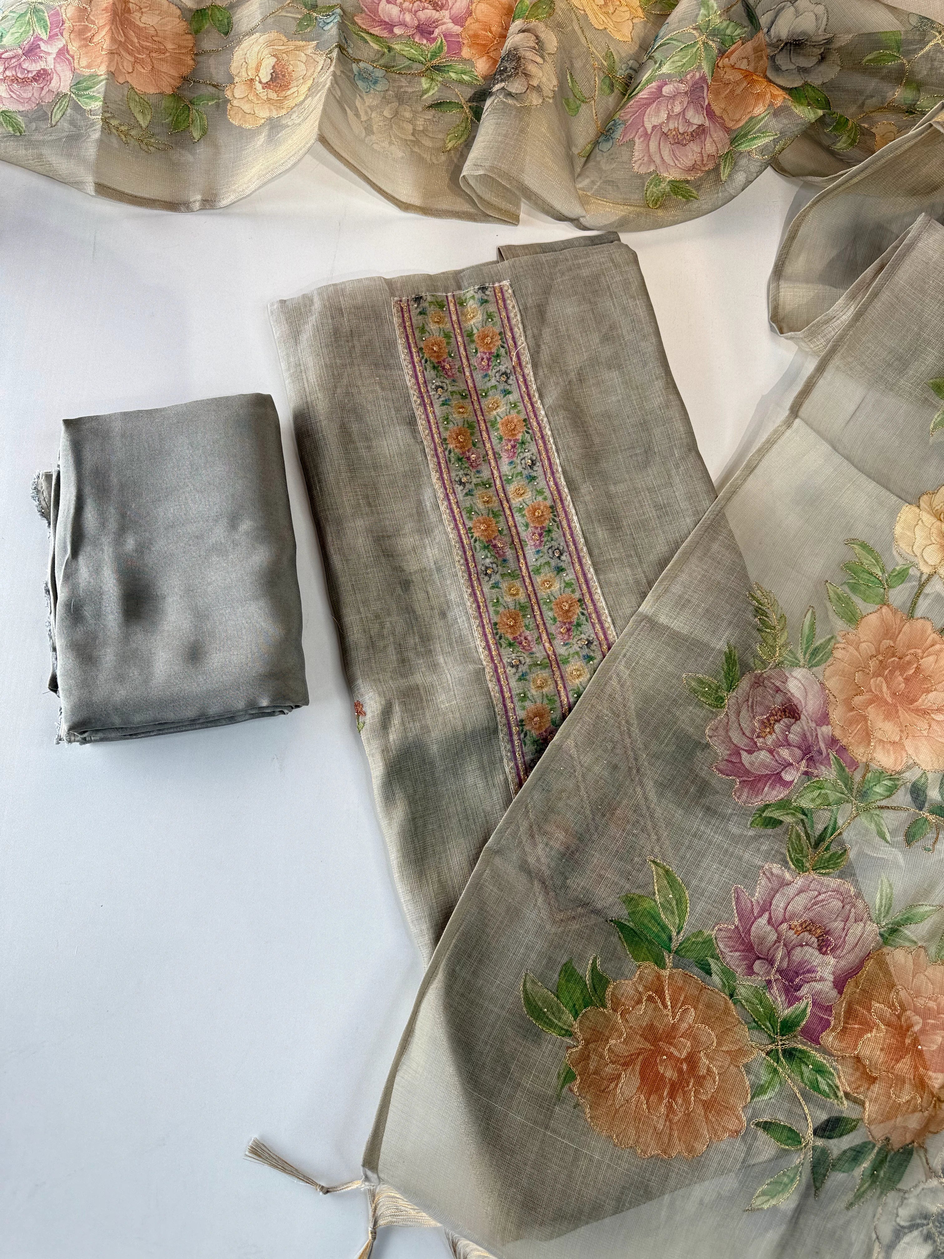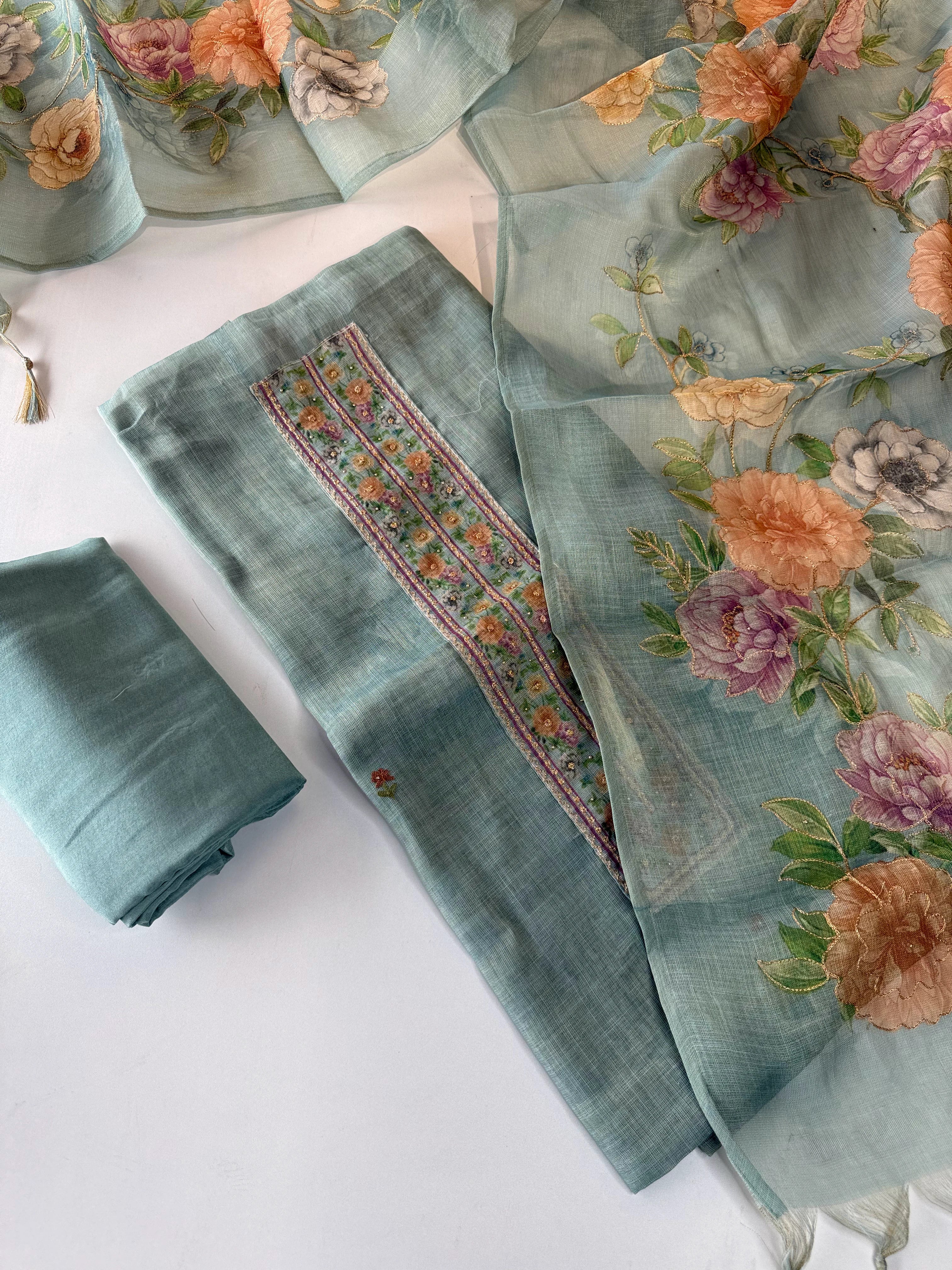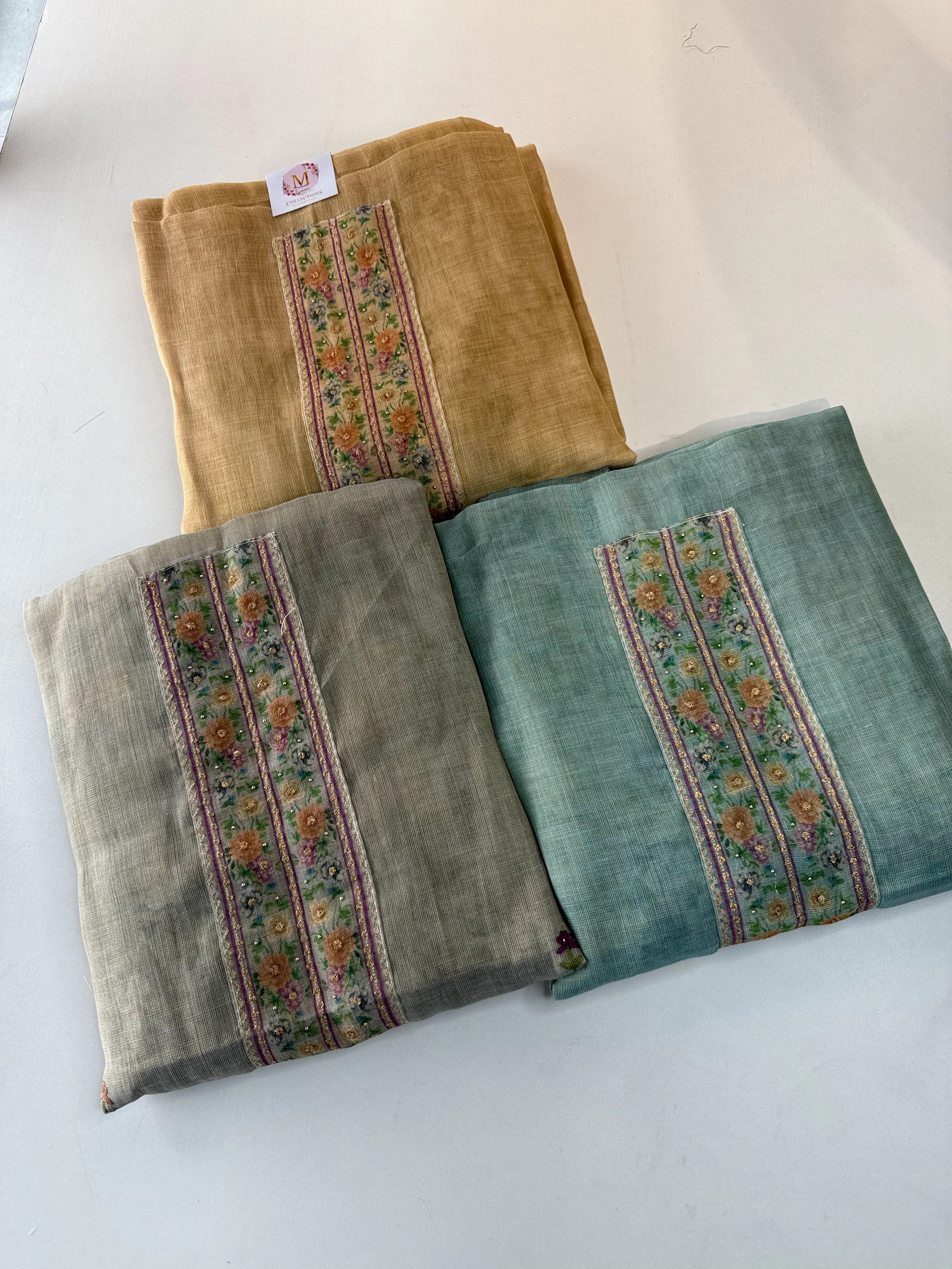Tissue linen salwar set featuring delicate work along the front yoke, paired with a beautifully printed dupatta and comfortable cotton bottom. A graceful blend of elegance and ease, ideal for refined everyday wear or light occasions.