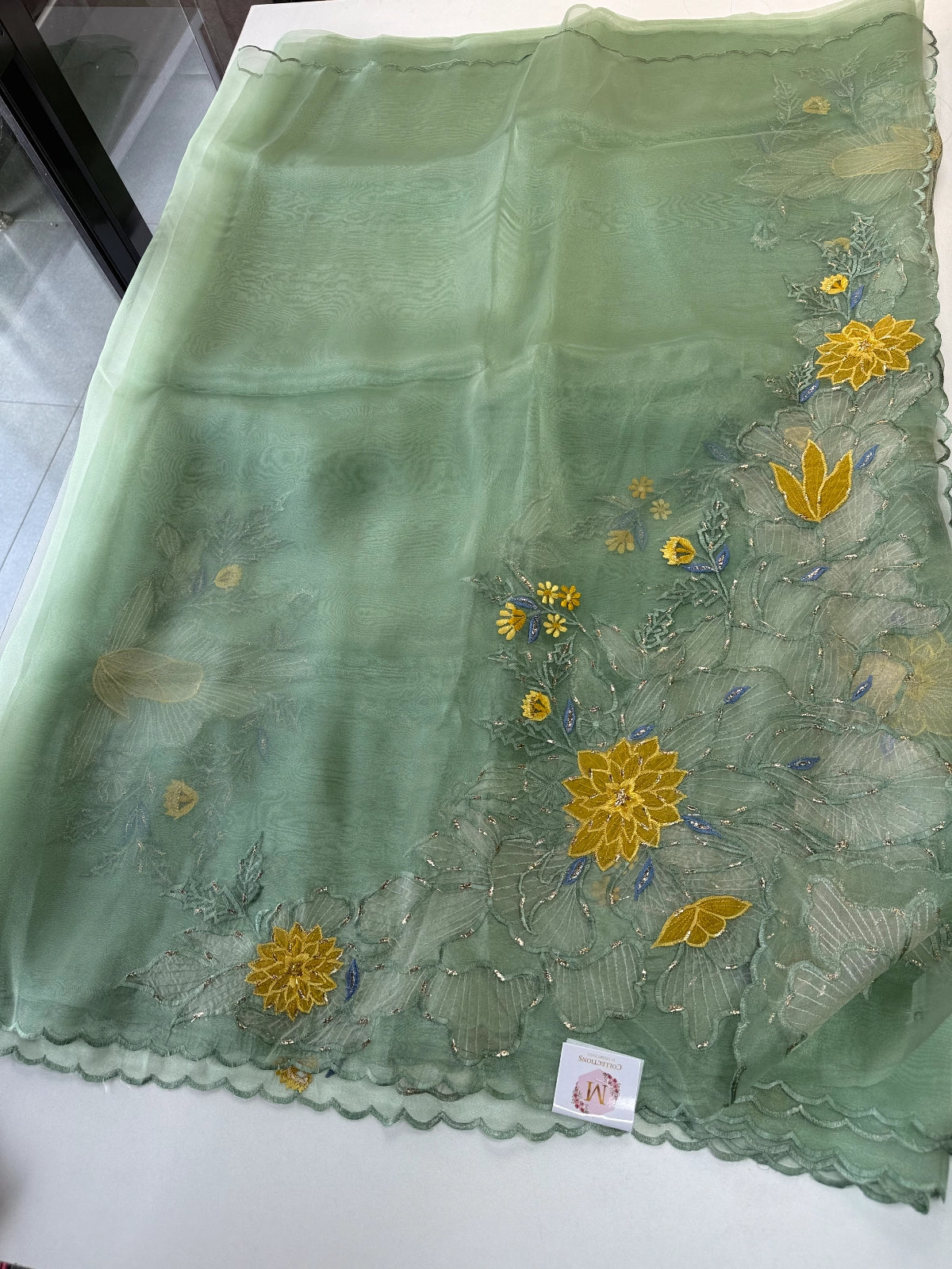 This saree is crafted from glass organza, a sheer and lightweight fabric known for its smooth, crisp texture and subtle shine. It holds its shape beautifully, giving a rich, structured drape that feels light and graceful. The slightly glossy finish adds an elegant touch, making it perfect for special occasions.