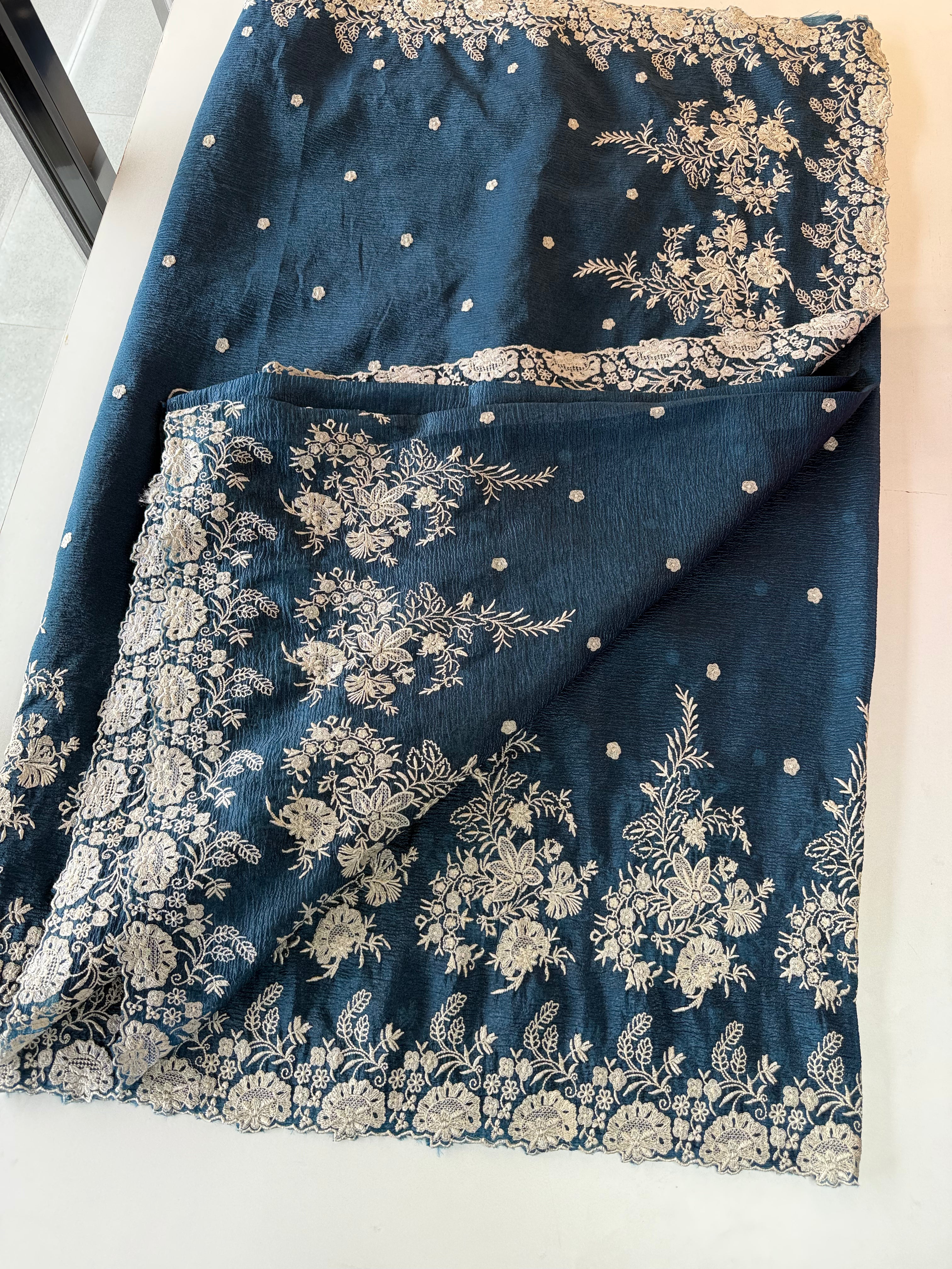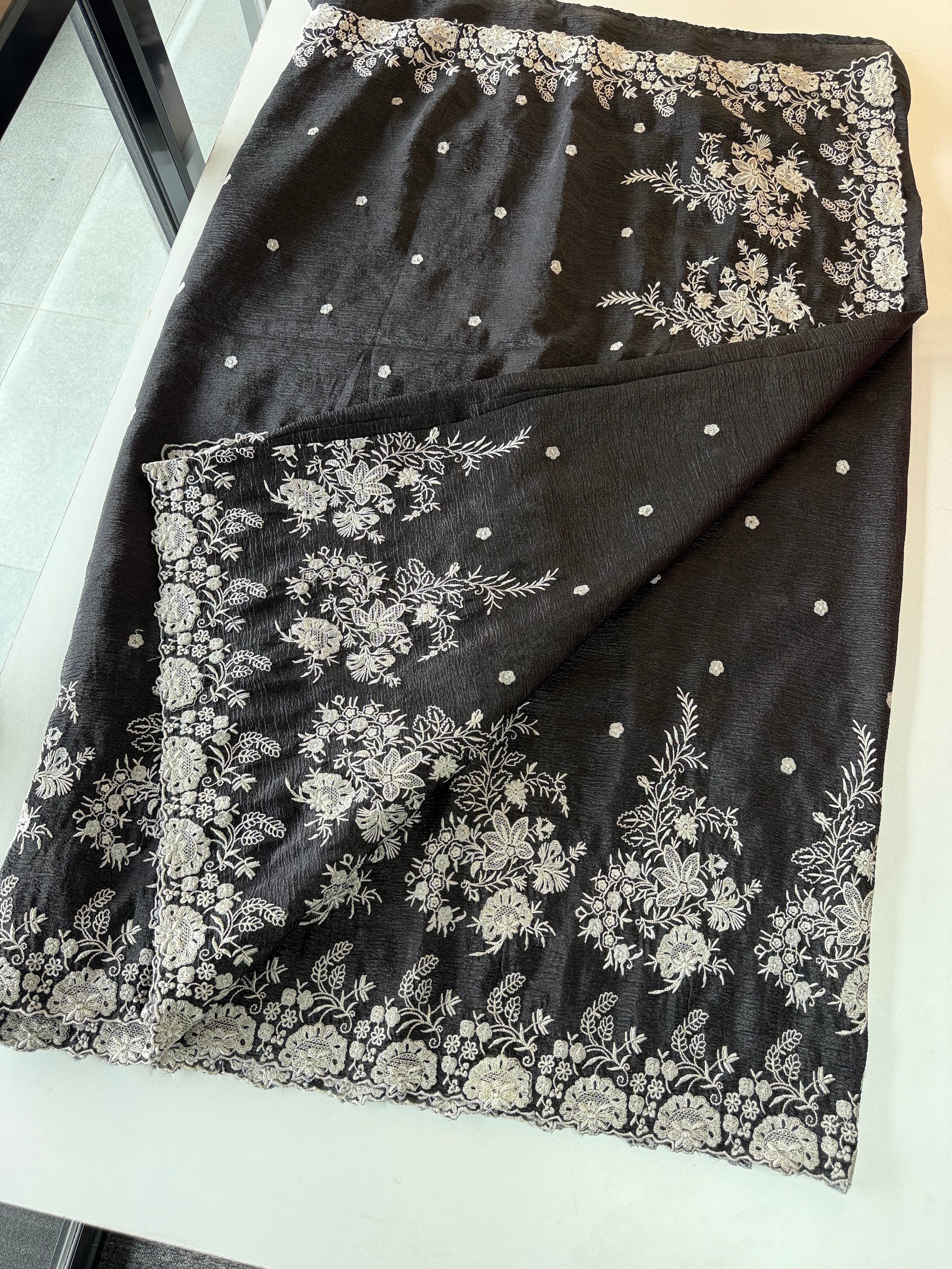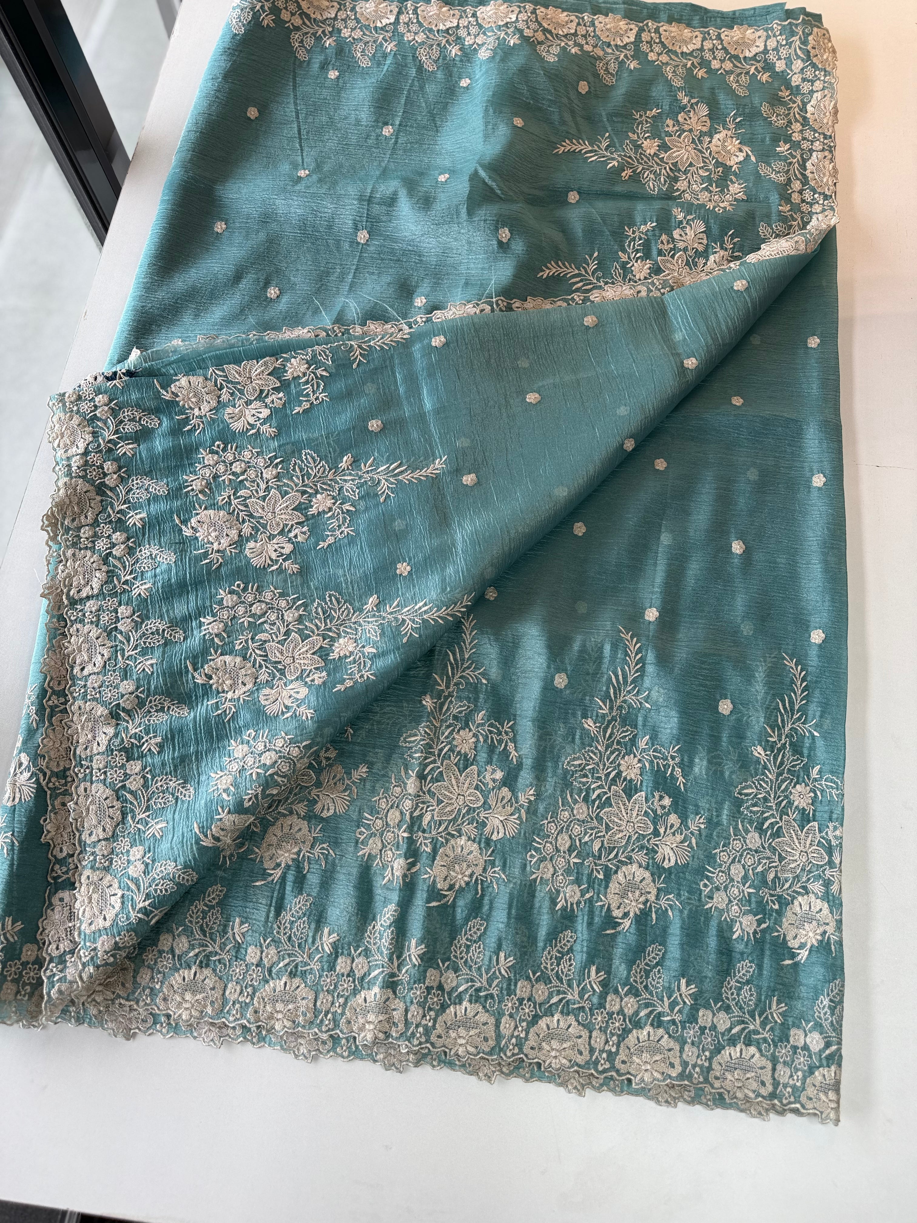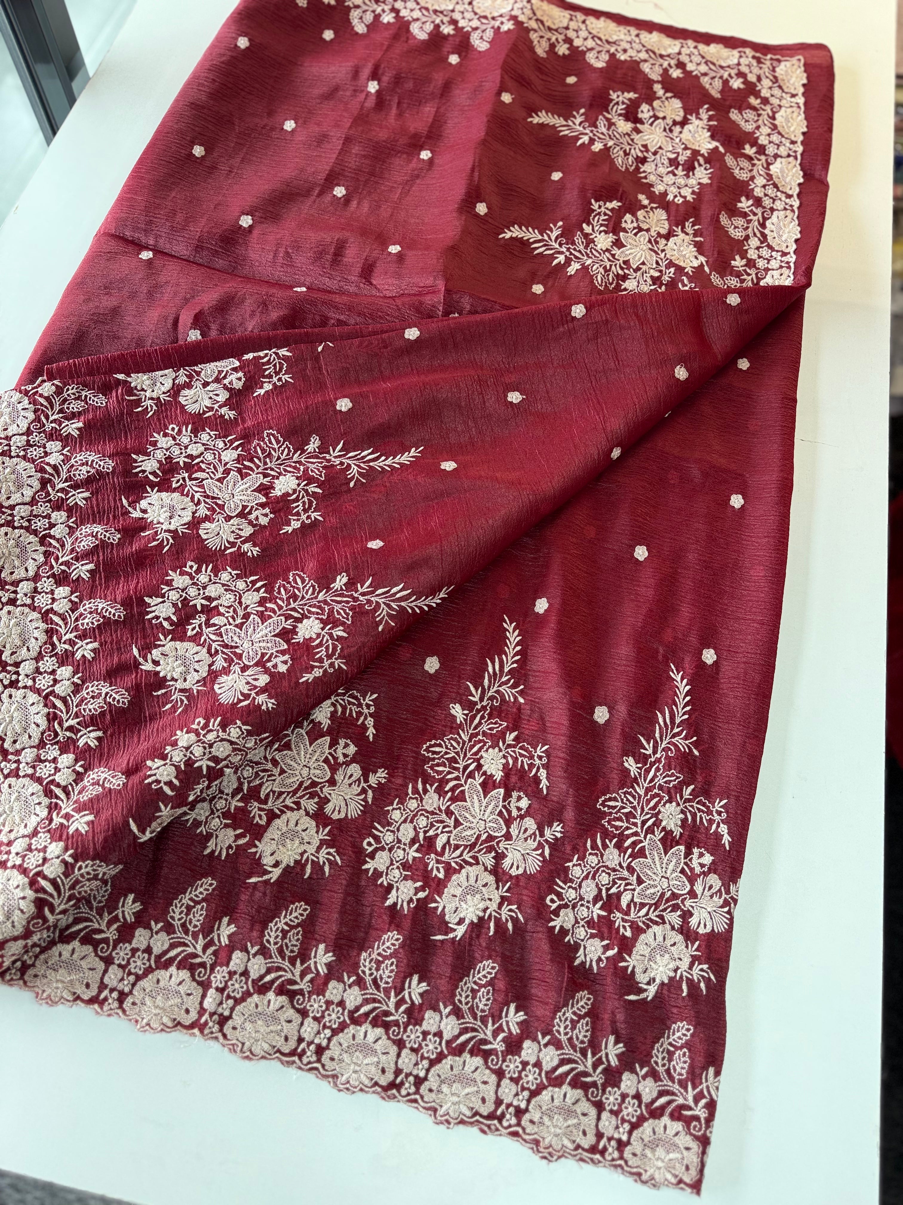 Crushed Crepe Saree with delicate threadwork on the border, pallu, and pleats. The blouse comes in the same running fabric with matching sleeve and border detailing for a complete look. The saree features a dual-width border – a narrower one on the upper portion and a wider, more prominent one at the bottom, adding graceful contrast. Lightweight, easy to drape, non-transparent, and perfect for party wear.
