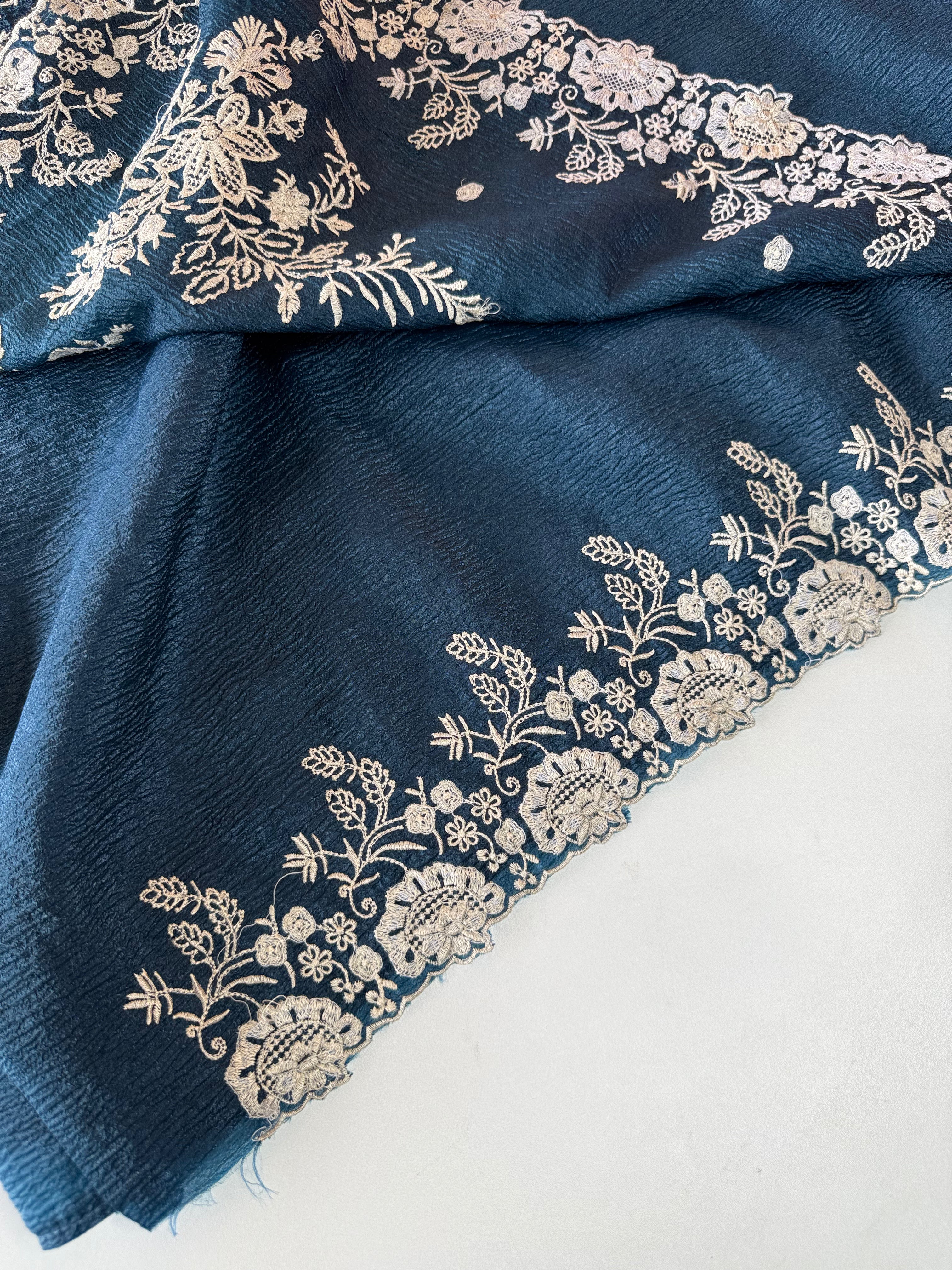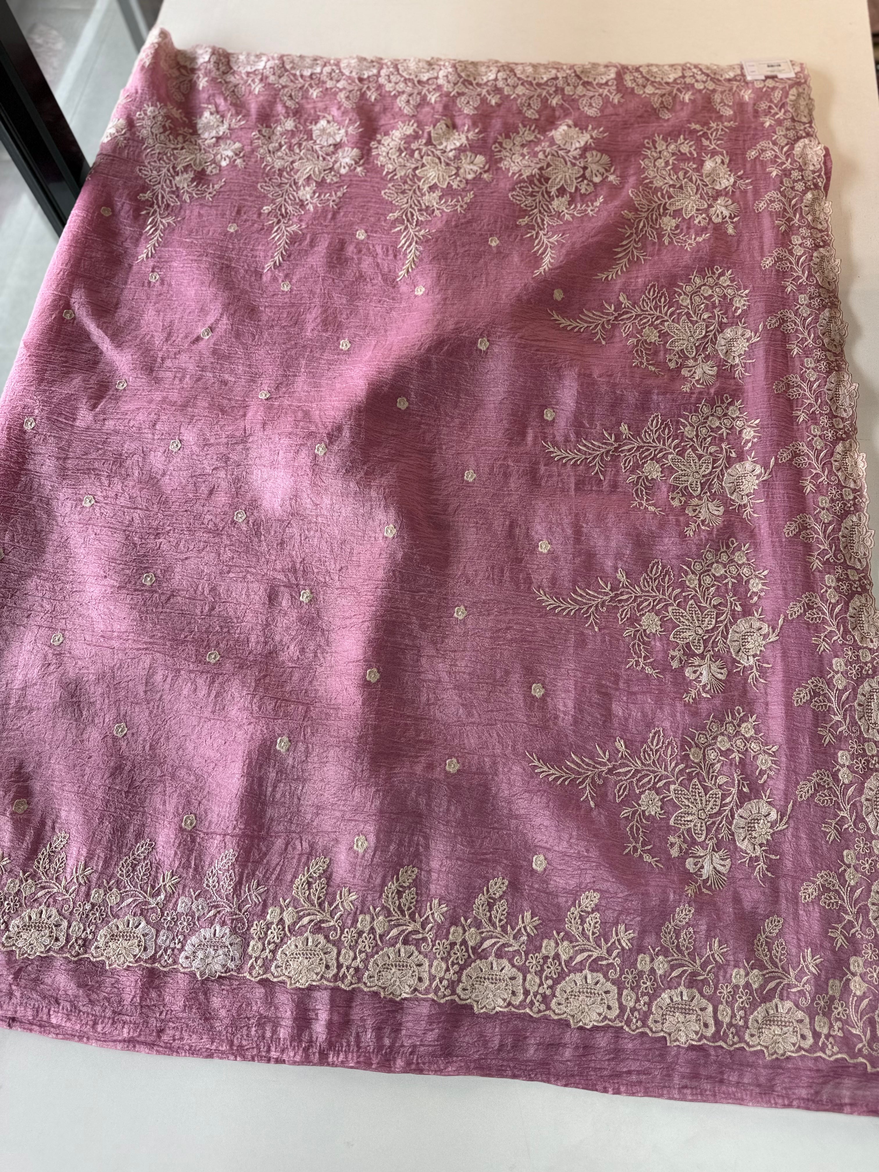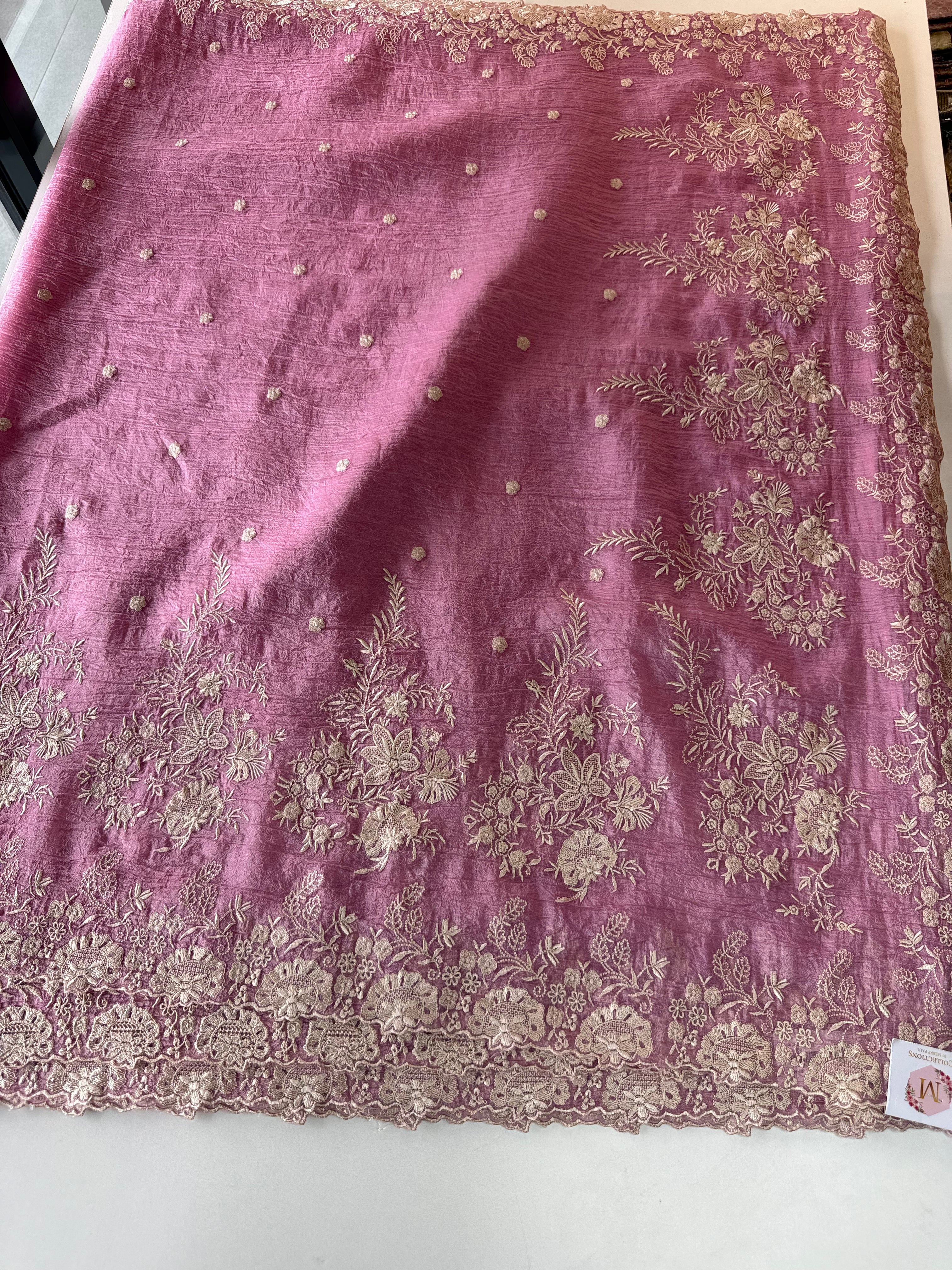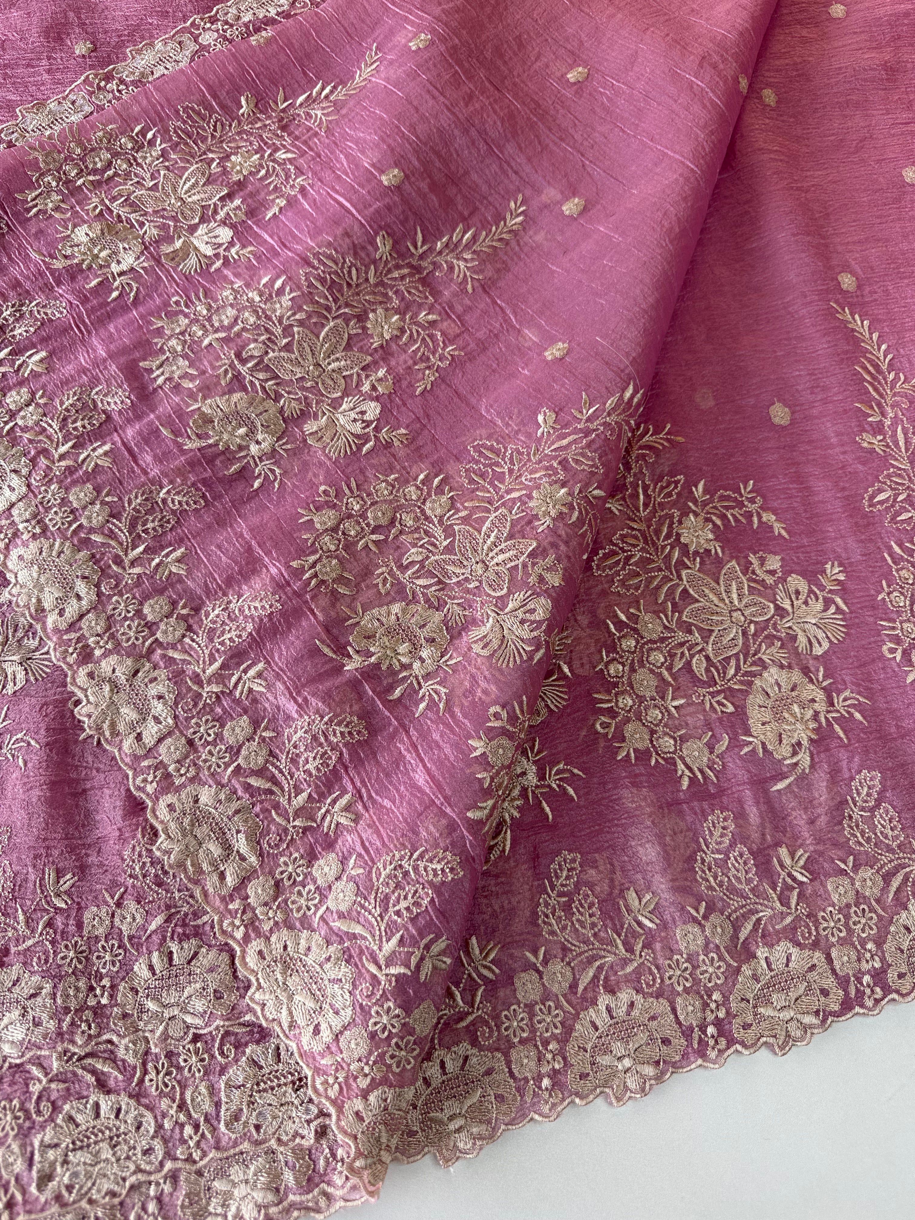Crushed Crepe Saree with delicate threadwork on the border, pallu, and pleats. The blouse comes in the same running fabric with matching sleeve and border detailing for a complete look. The saree features a dual-width border – a narrower one on the upper portion and a wider, more prominent one at the bottom, adding graceful contrast. Lightweight, easy to drape, non-transparent, and perfect for party wear.