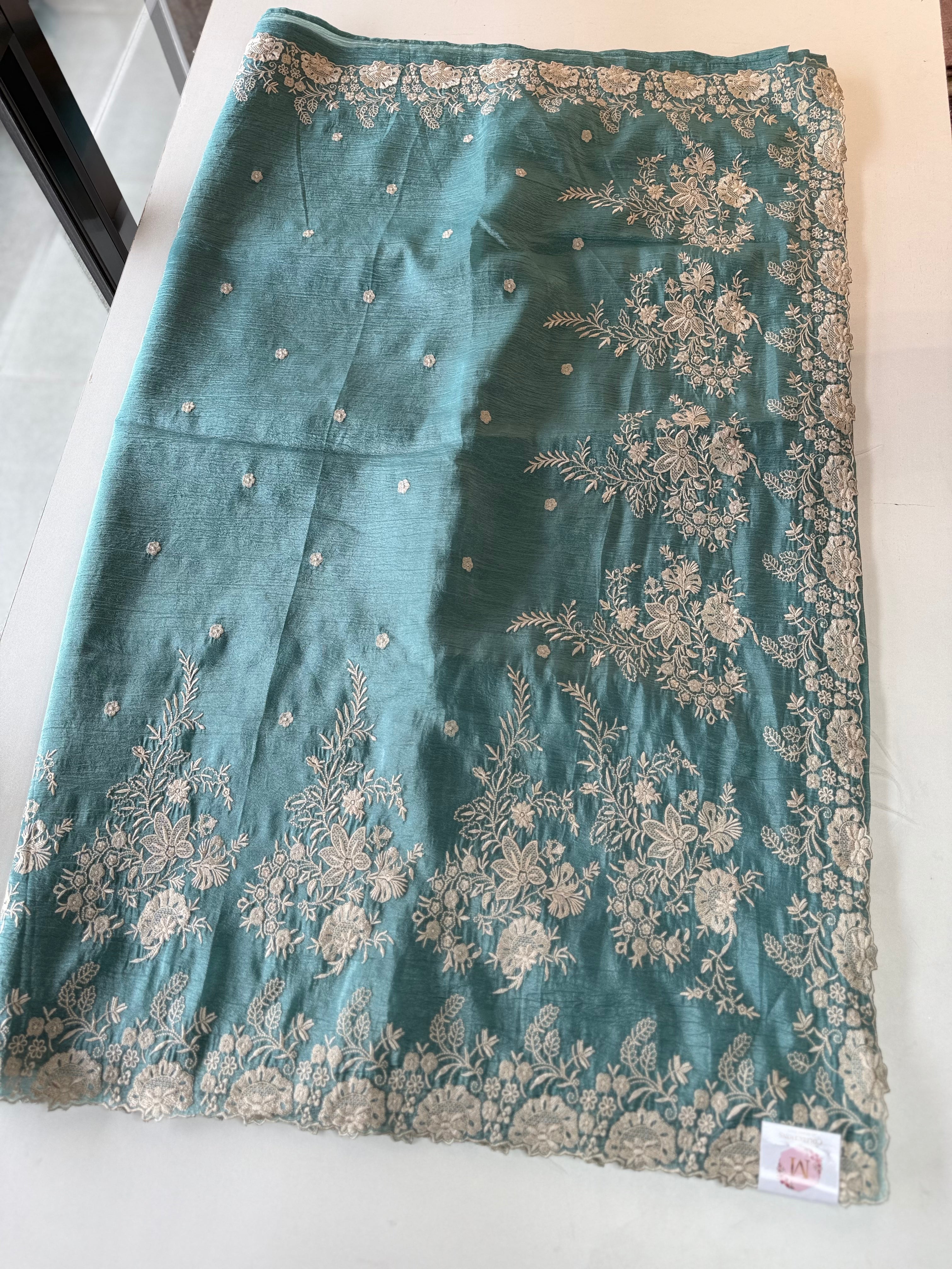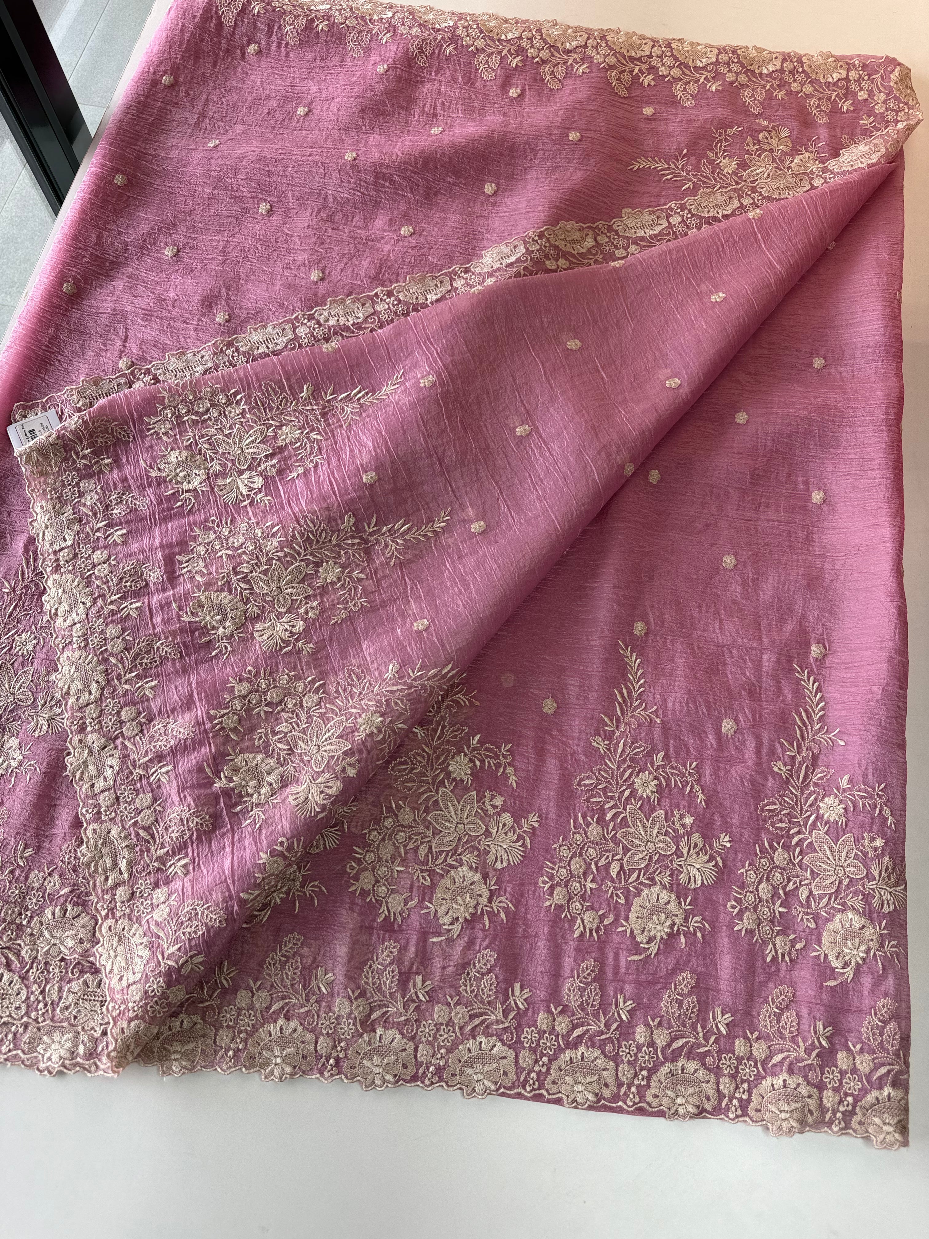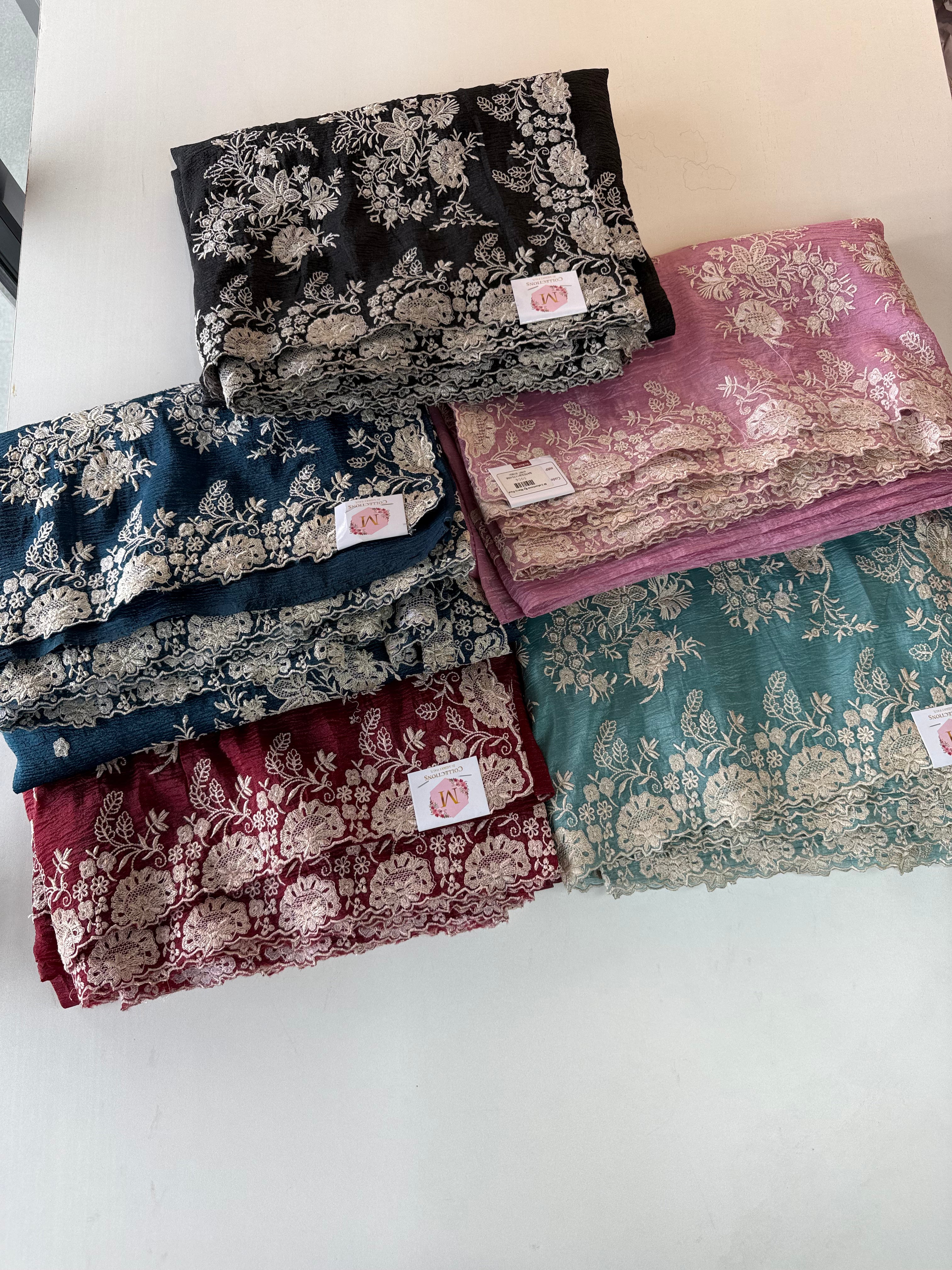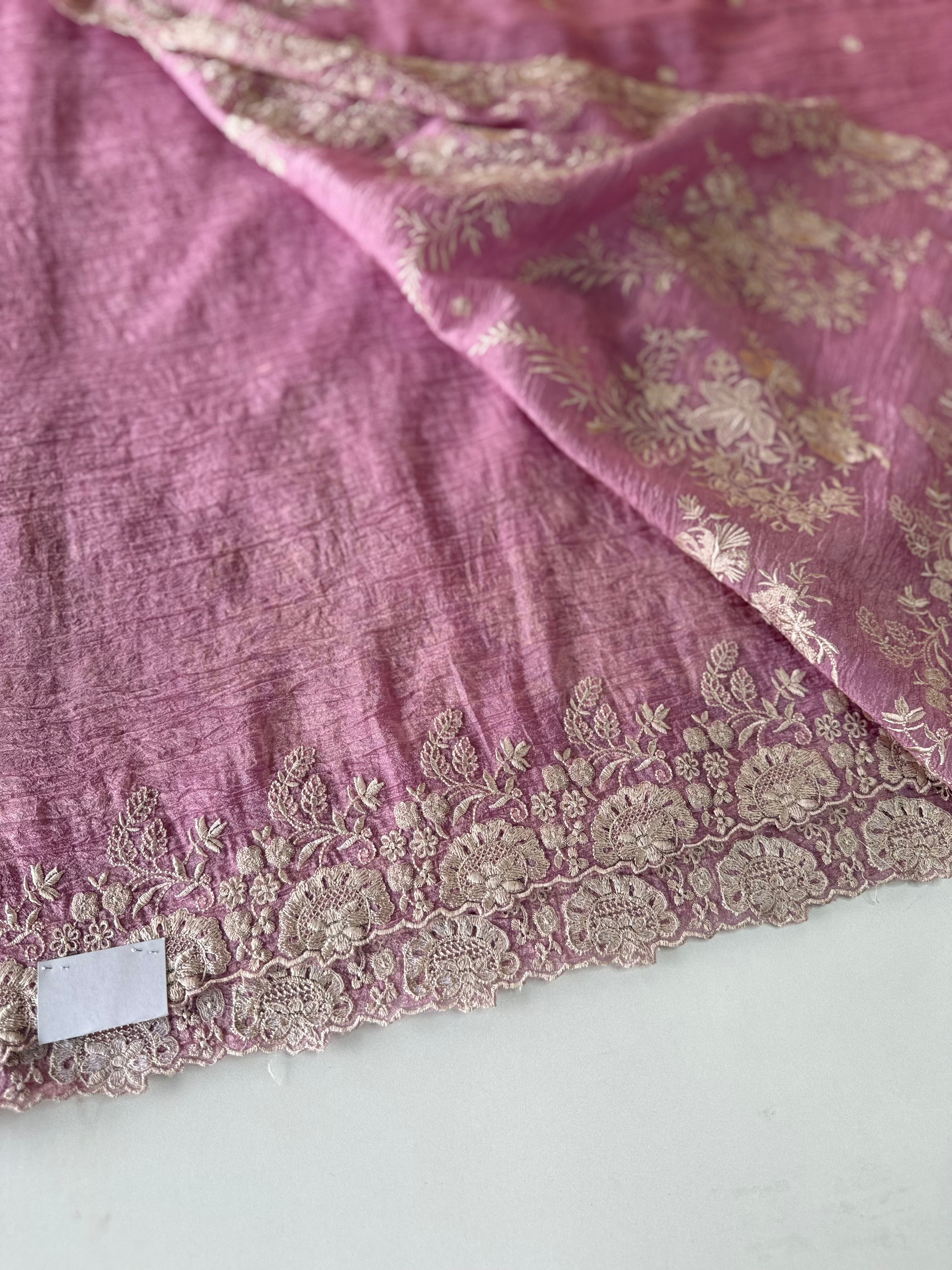 Crushed Crepe Saree with delicate threadwork on the border, pallu, and pleats. The blouse comes in the same running fabric with matching sleeve and border detailing for a complete look. The saree features a dual-width border – a narrower one on the upper portion and a wider, more prominent one at the bottom, adding graceful contrast. Lightweight, easy to drape, non-transparent, and perfect for party wear.