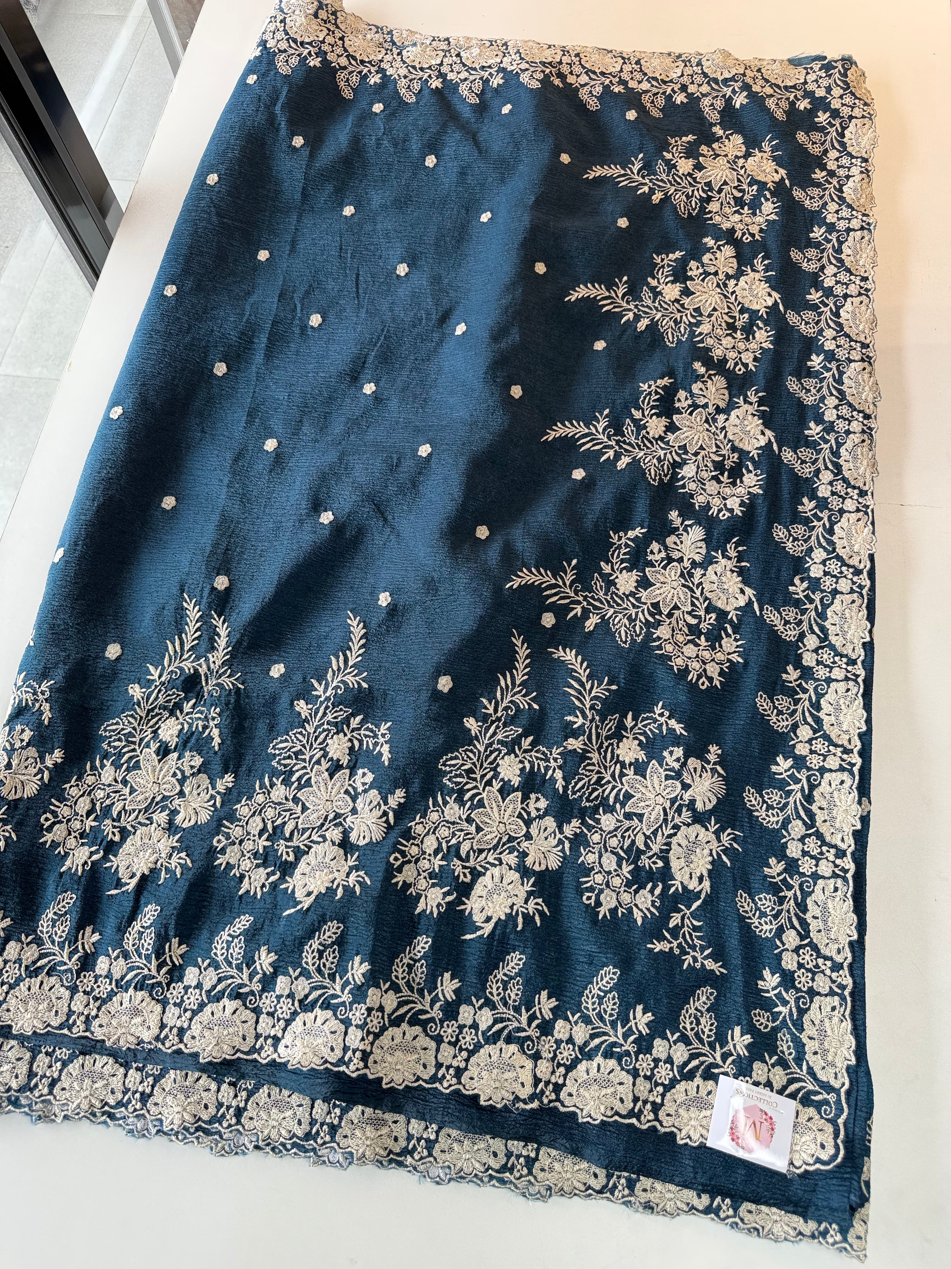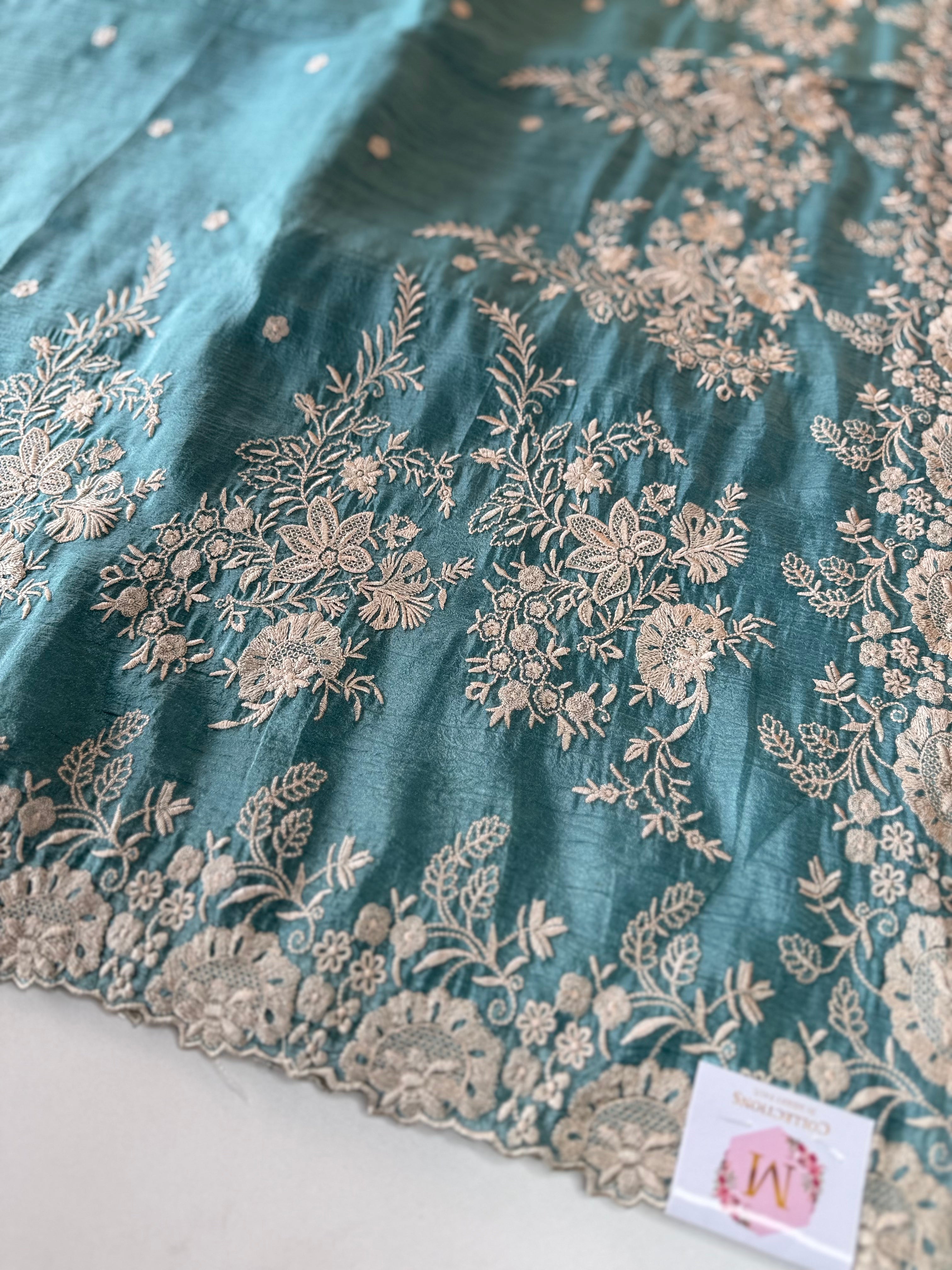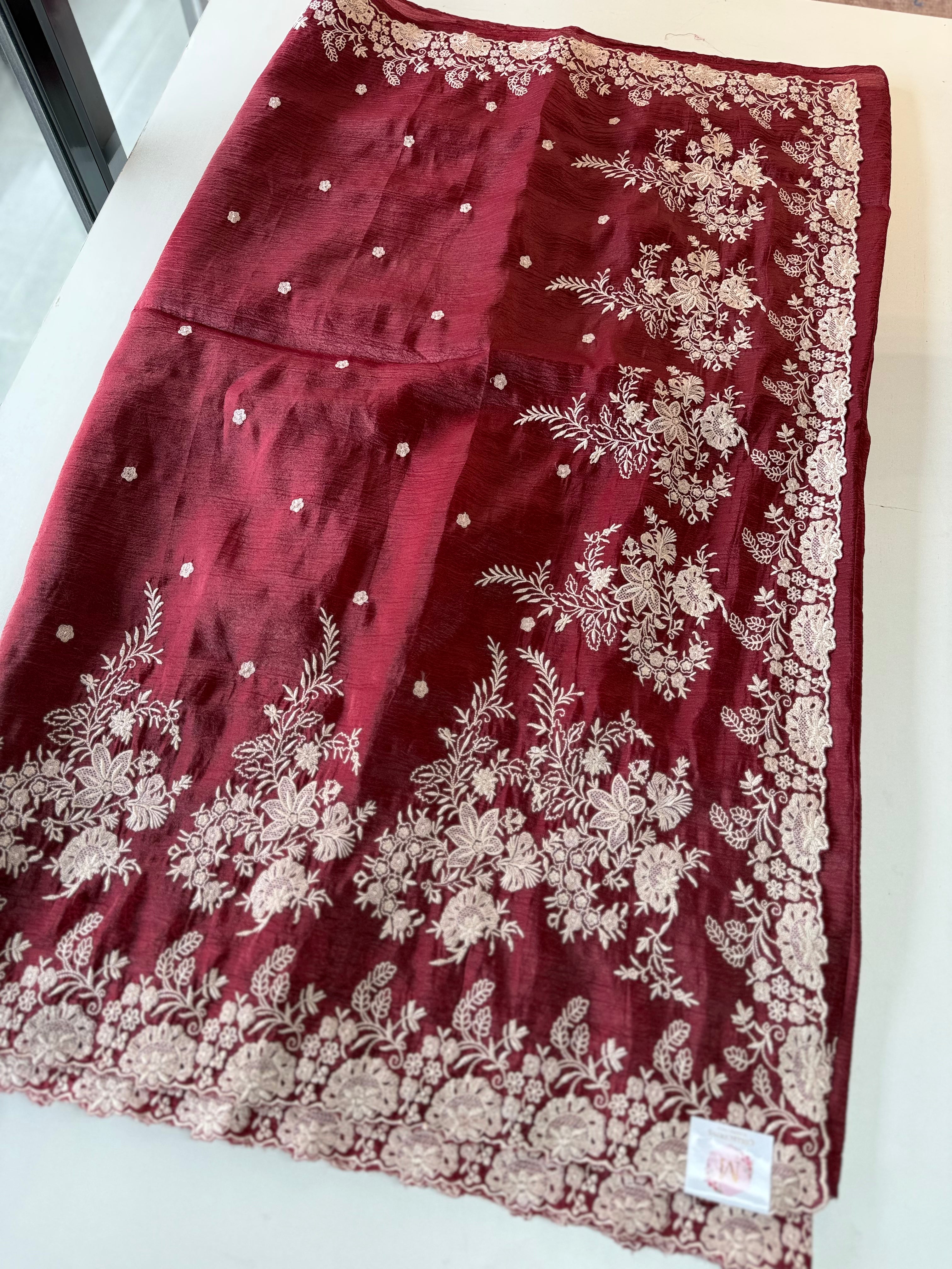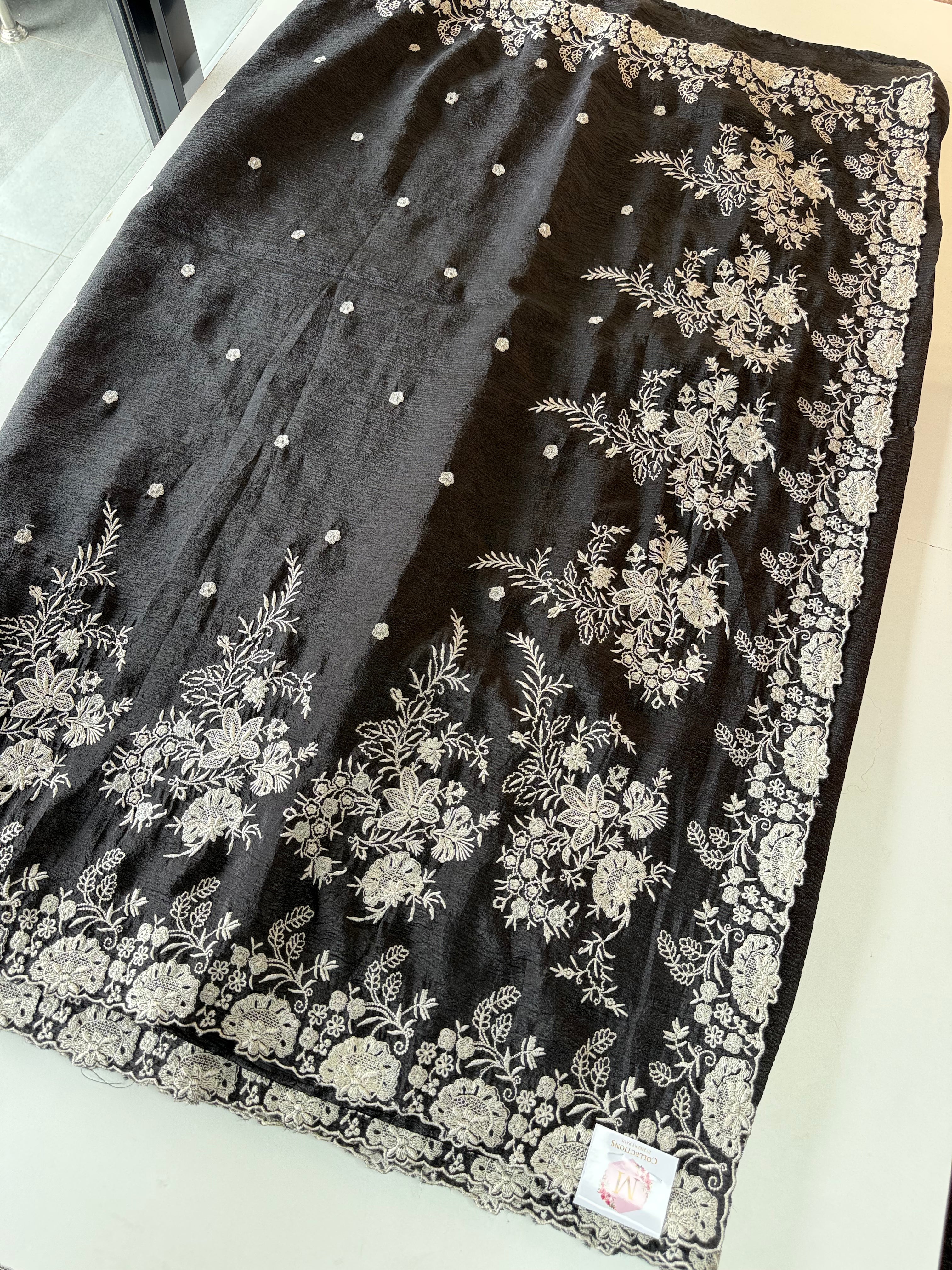 Crushed Crepe Saree with delicate threadwork on the border, pallu, and pleats. The blouse comes in the same running fabric with matching sleeve and border detailing for a complete look. The saree features a dual-width border – a narrower one on the upper portion and a wider, more prominent one at the bottom, adding graceful contrast. Lightweight, easy to drape, non-transparent, and perfect for party wear.