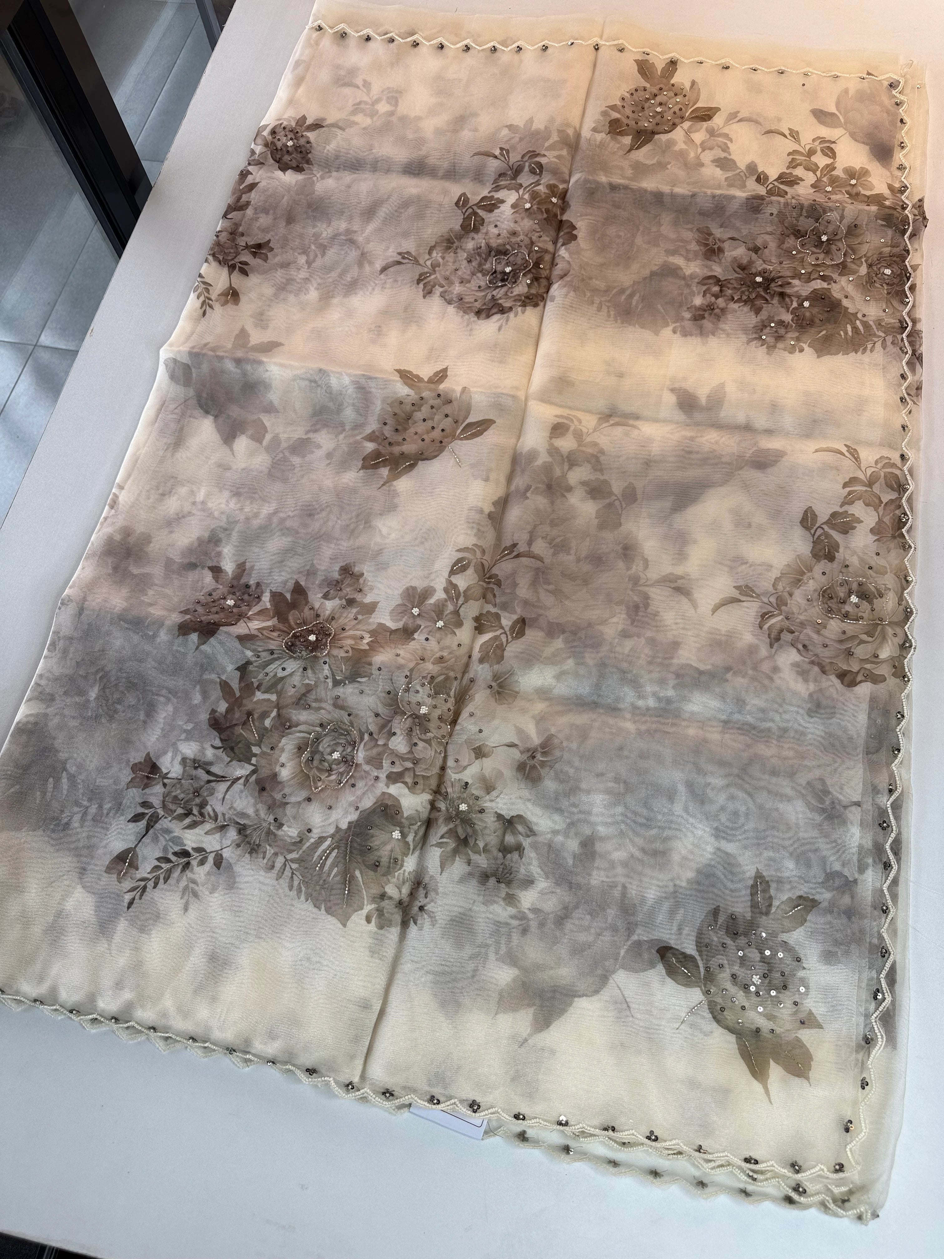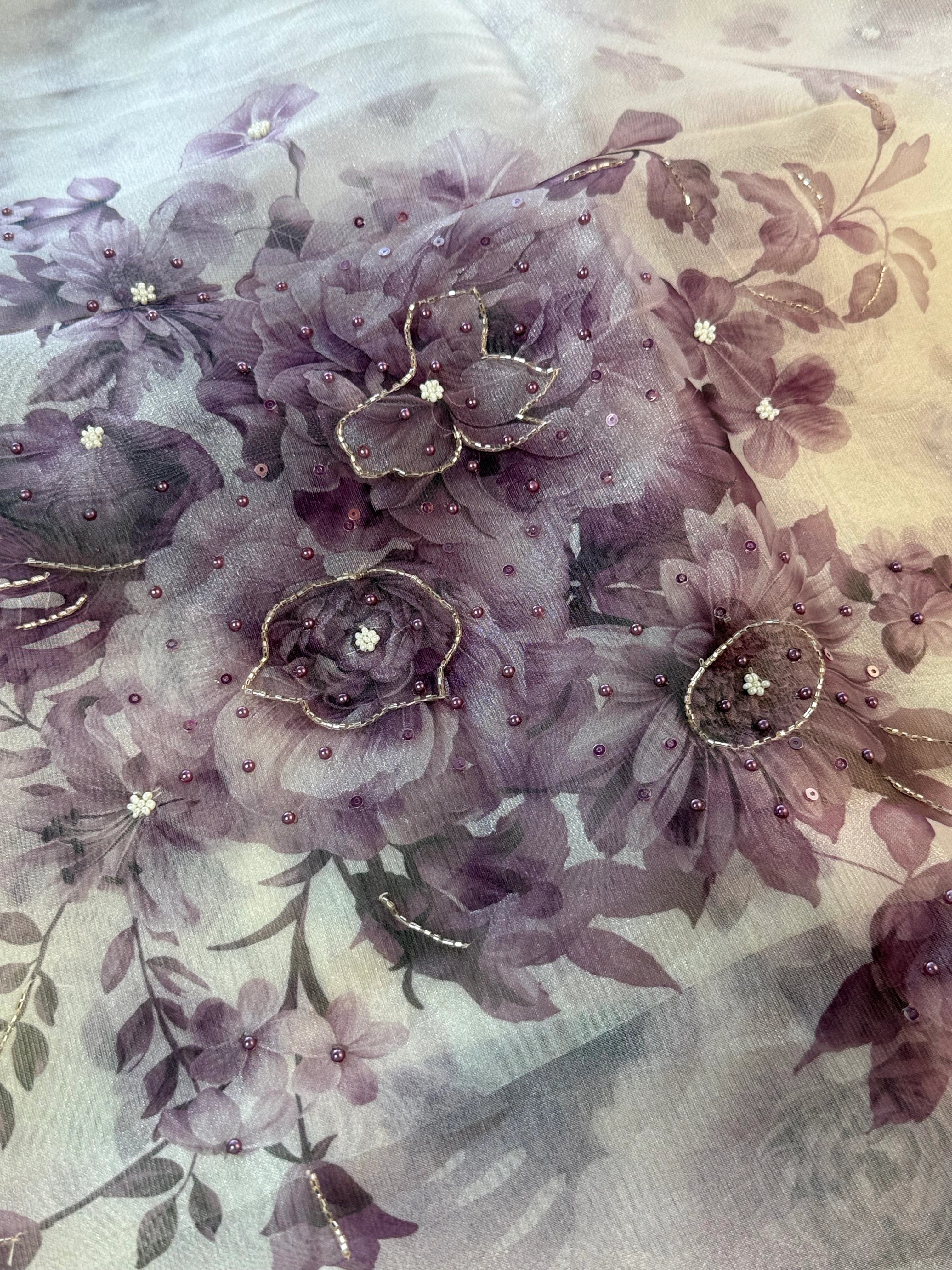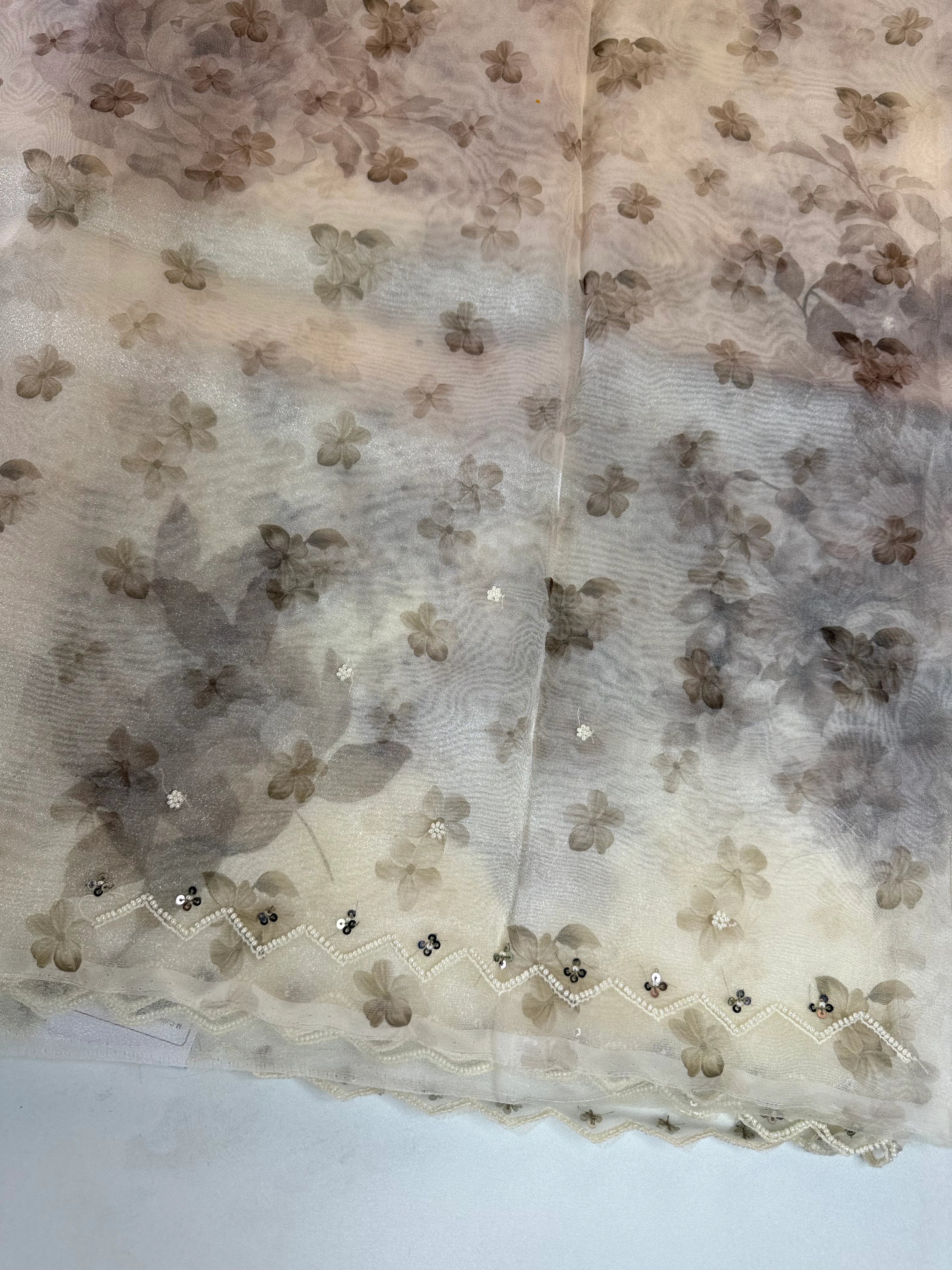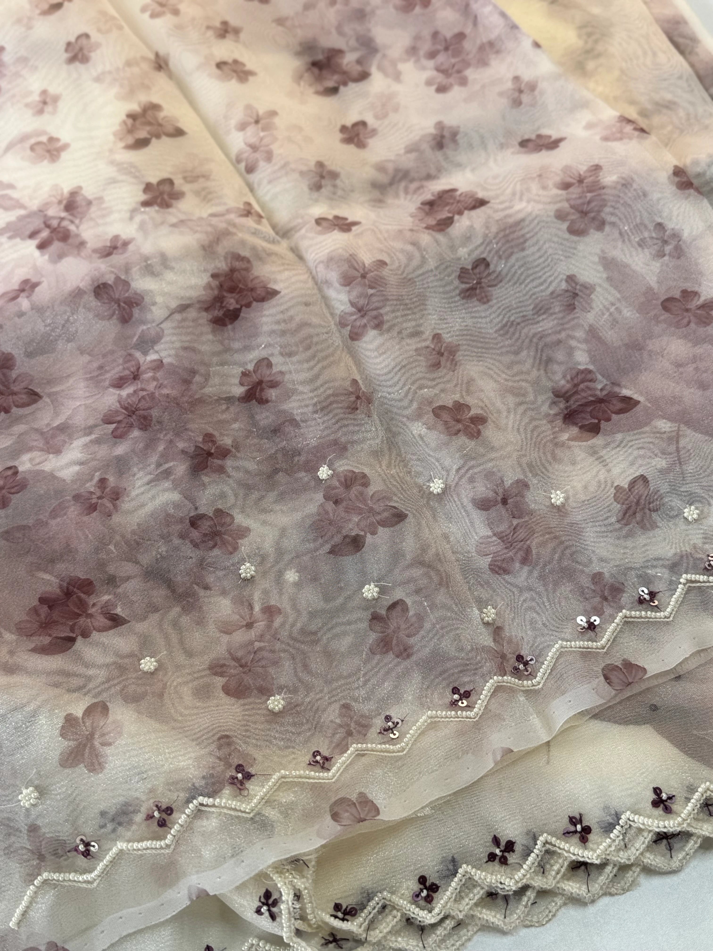 Elegant and lightweight, this digital printed organza saree comes in a soft, sheer fabric that drapes beautifully. The saree is highlighted with delicate cutbead work for a subtle shimmer and includes a matching running blouse in a smaller floral print for a stylish contrast. The border and blouse sleeve ends are finely embellished with cutbeads and pearls, adding a luxurious finish. Perfect for festive occasions, parties, or elegant daytime wear.