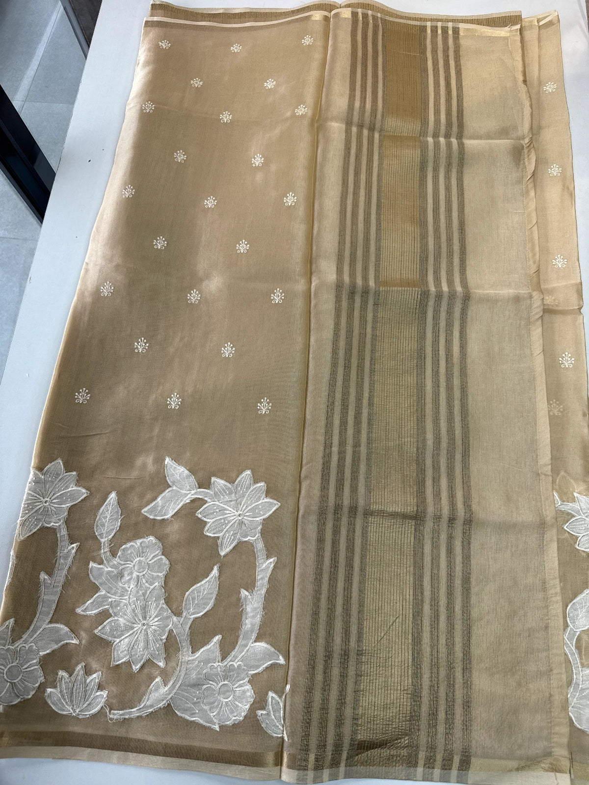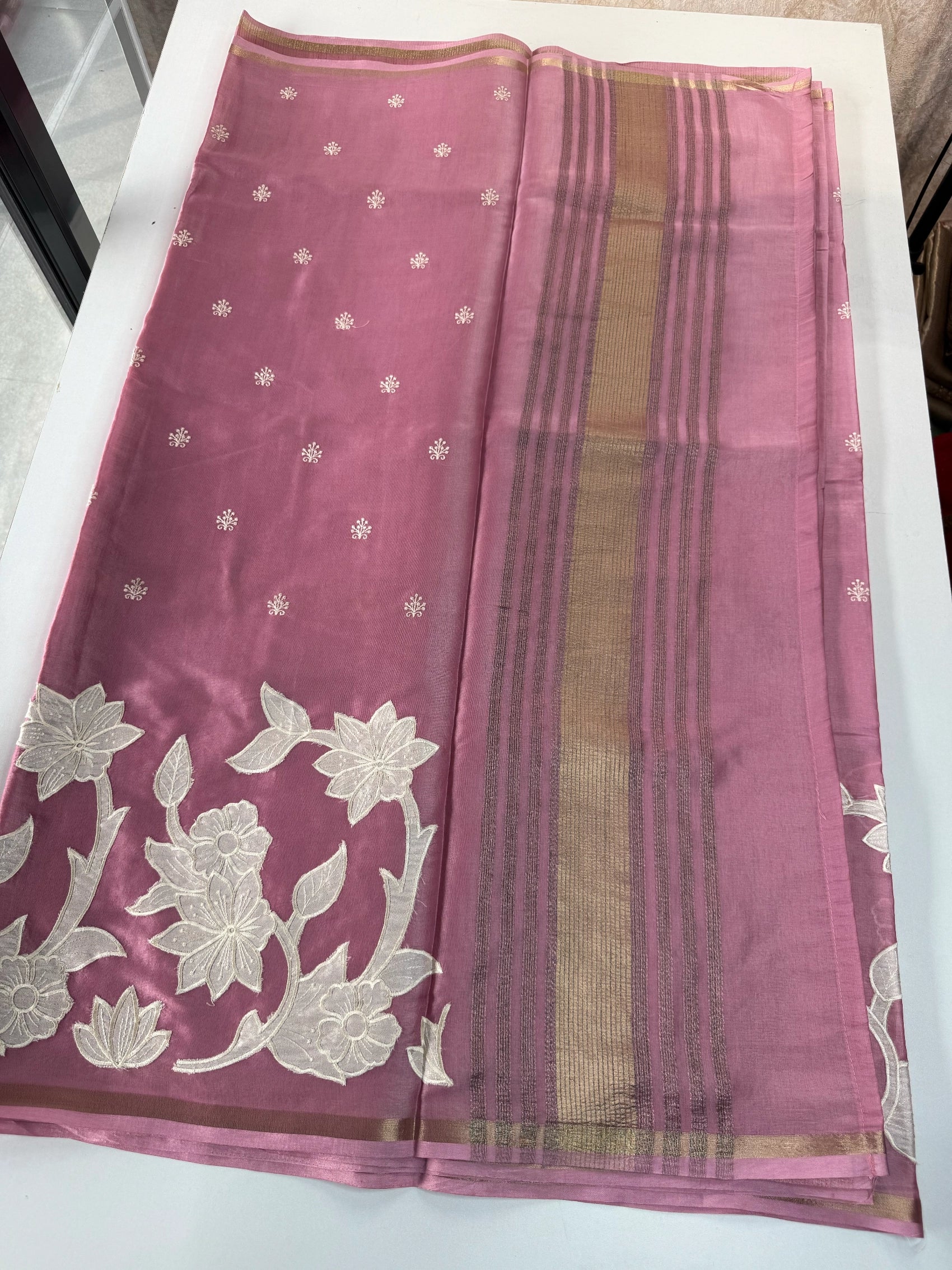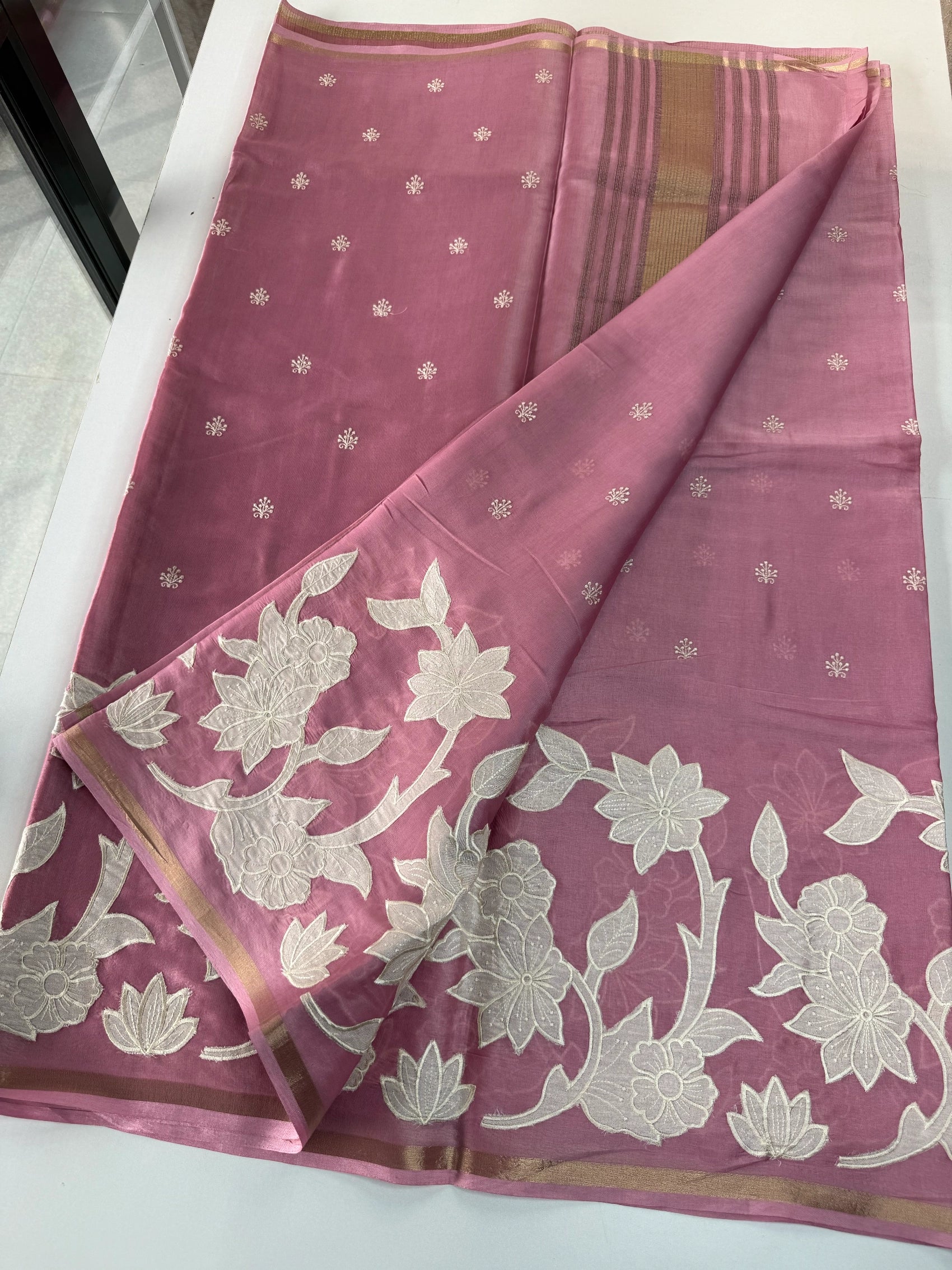 Chanderi organza blend saree featuring an elegant Geri pallu and delicately thread-worked body. Highlighted with refined appliqué floral work along the lower portion of the saree, adding a graceful handcrafted touch. Comes with a running semi-jute blouse piece. Lightweight, non-transparent, and easy to drape—perfect for elegant day functions and festive wear.