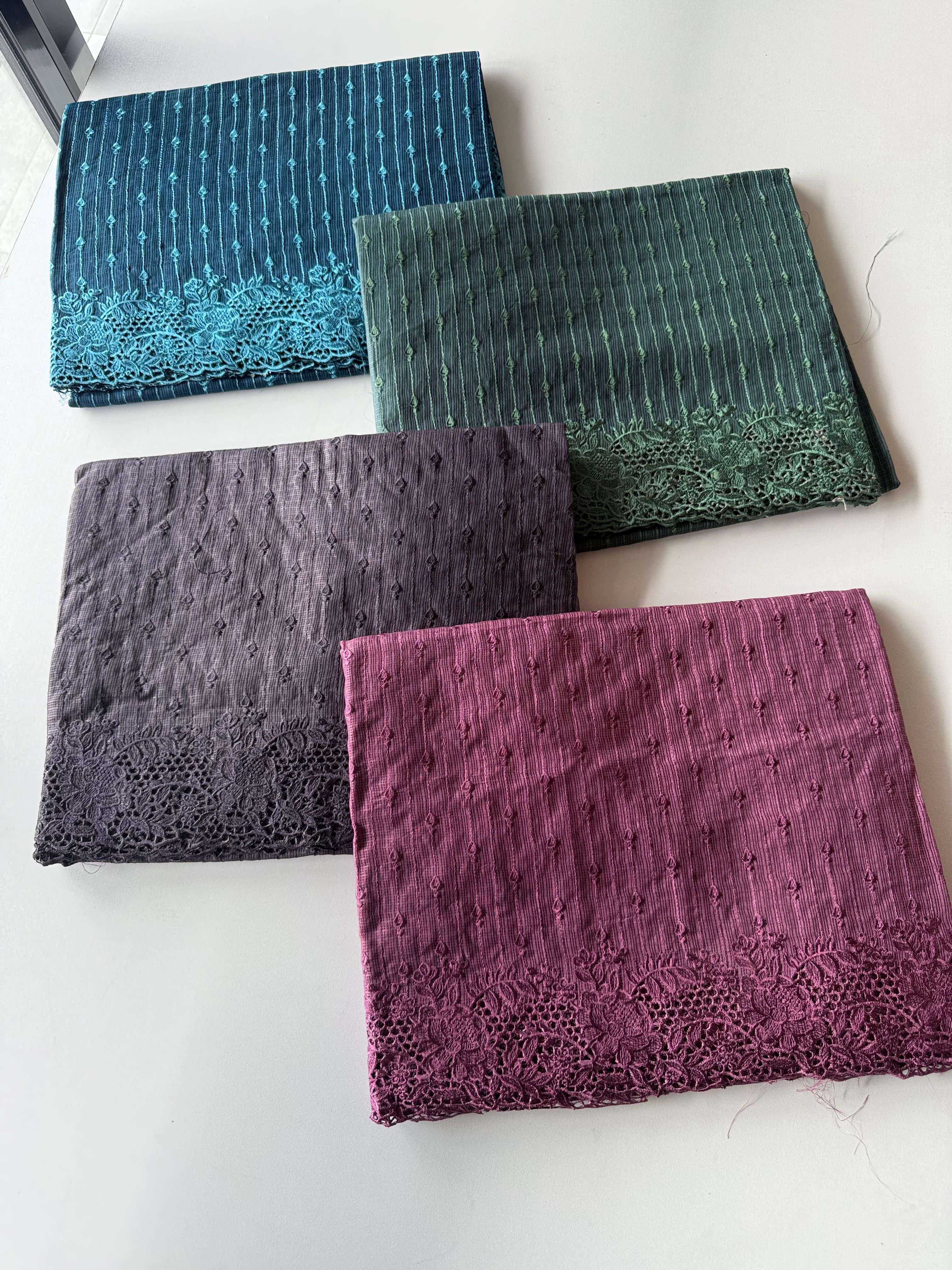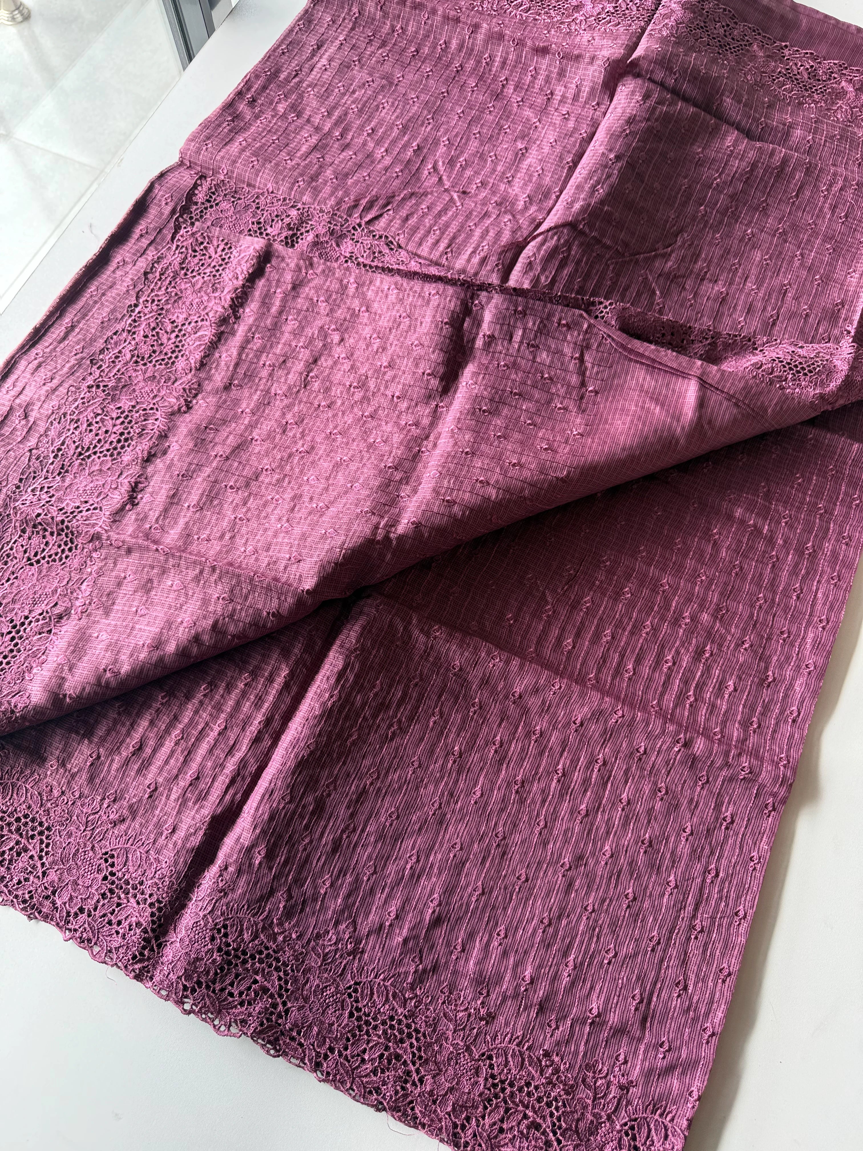 Silky Kota saree with delicate threadwork across the body and a beautifully detailed cutwork border. Paired with a plain blouse piece.