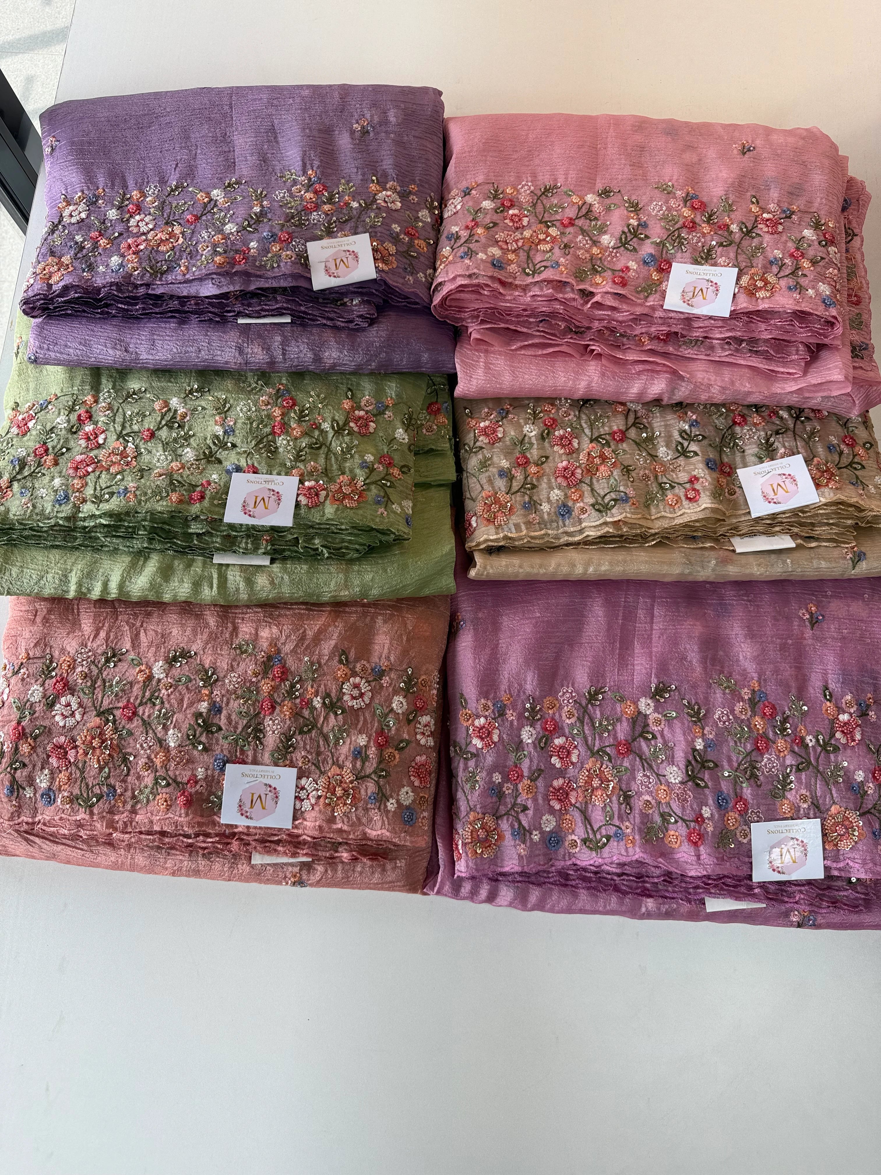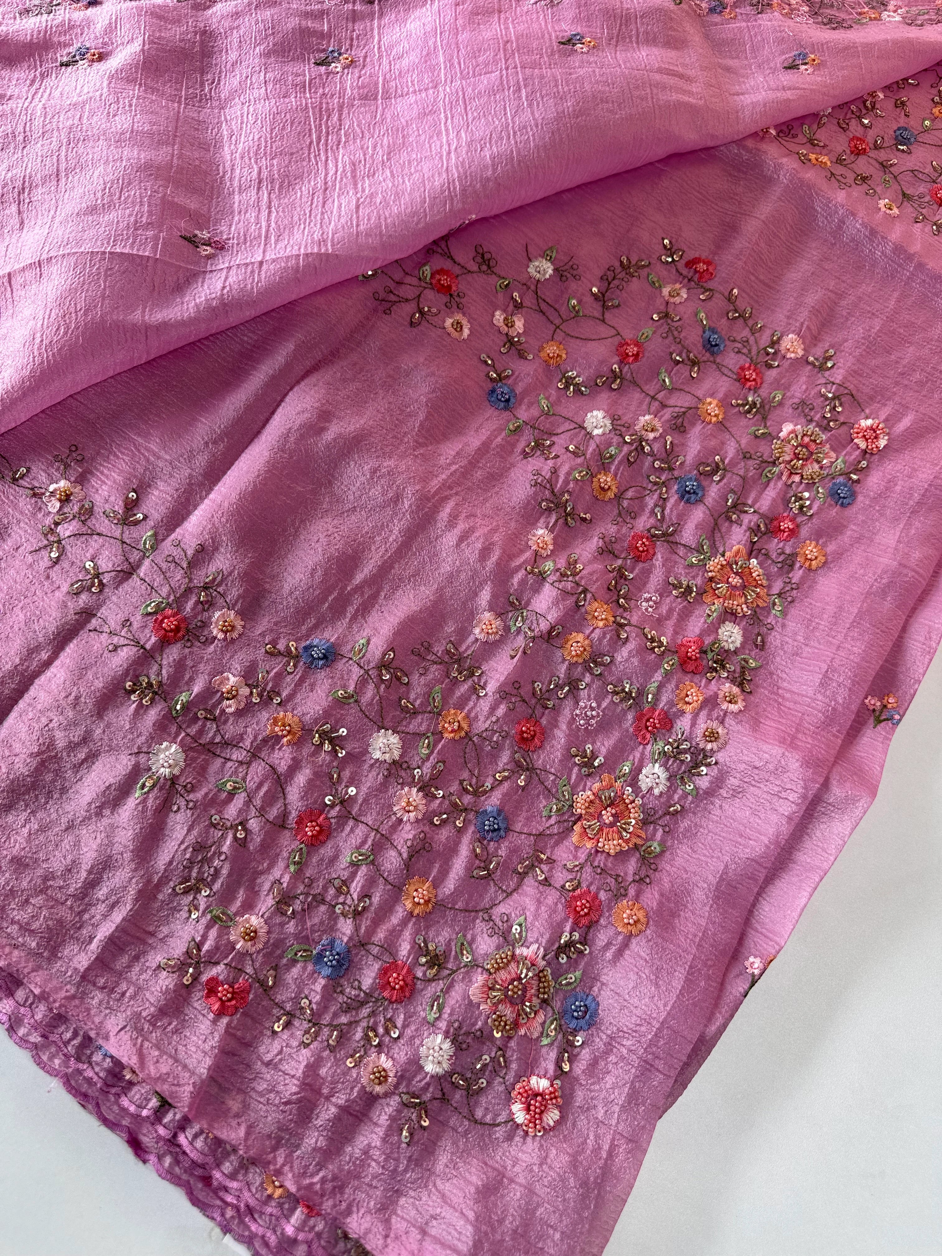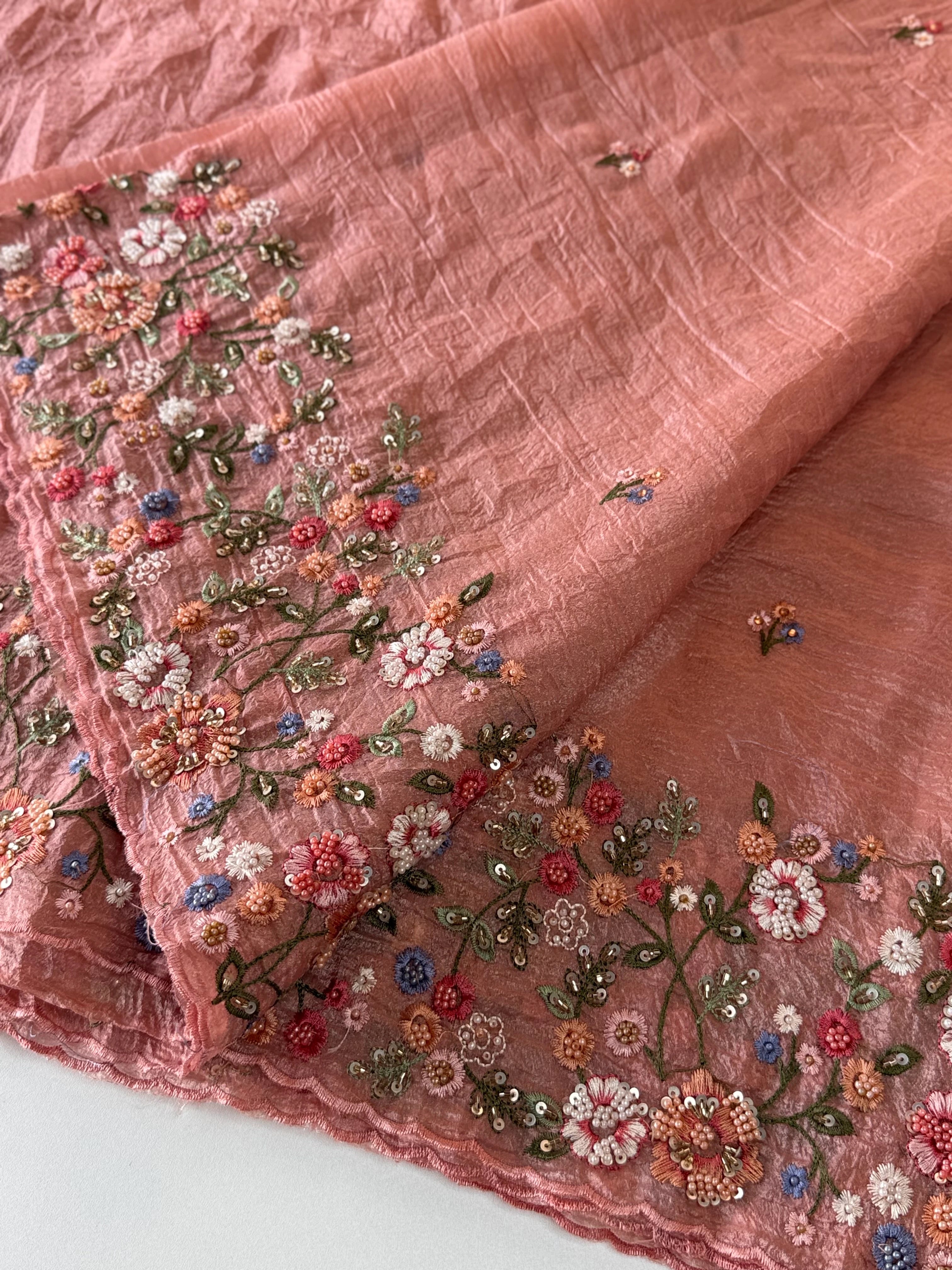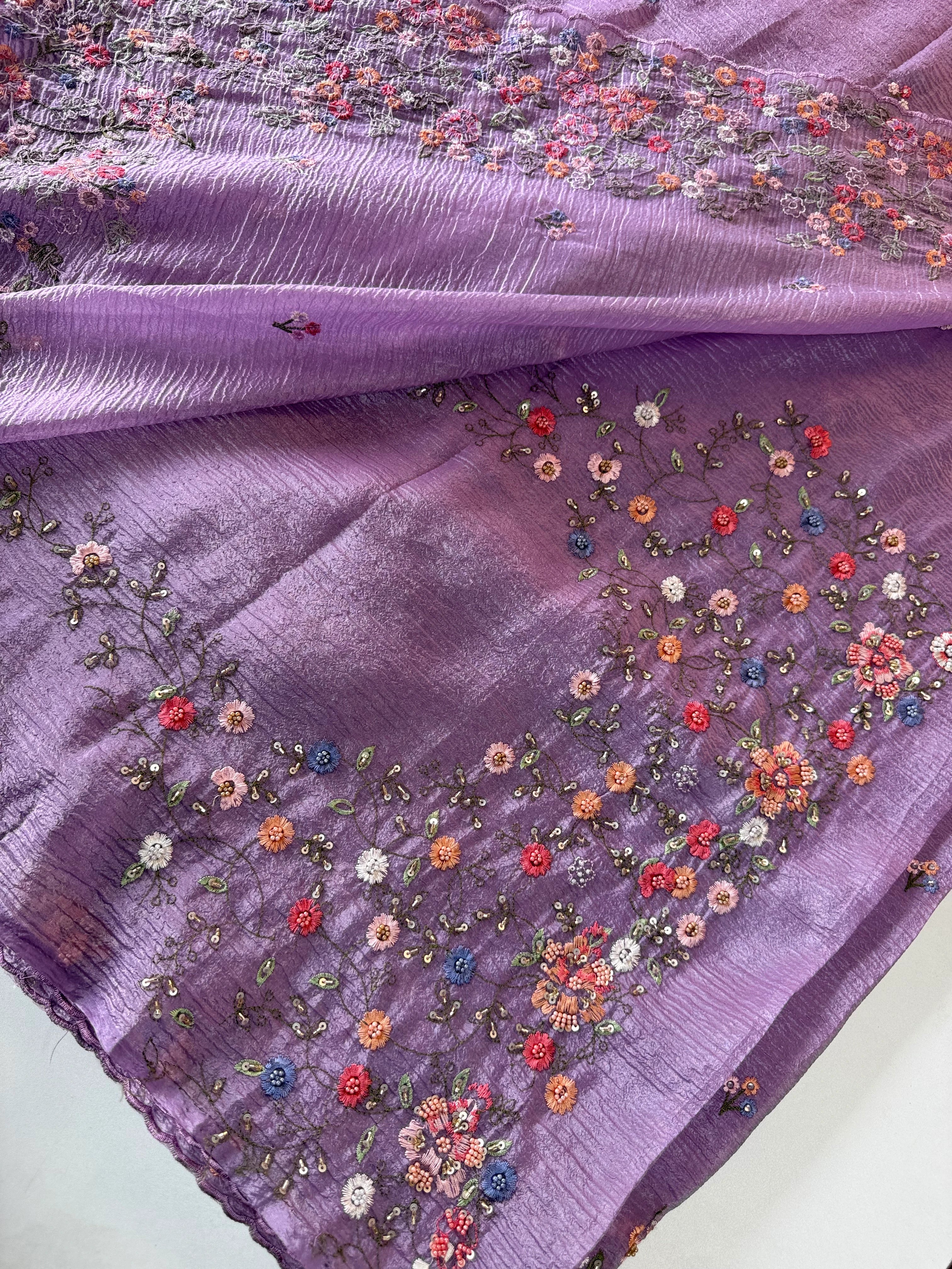 A beautifully textured crushed crepe saree adorned with all-over delicate threadwork, gracefully highlighted with cut beads, sugar beads, and pearls for a subtle shimmer. Comes with a matching running blouse piece featuring heavy embellishments on the sleeves, front, and back neckline—ensuring a rich, complete look. The lightweight, non-transparent crepe fabric drapes effortlessly, making it perfect for evening occasions and celebrations.
