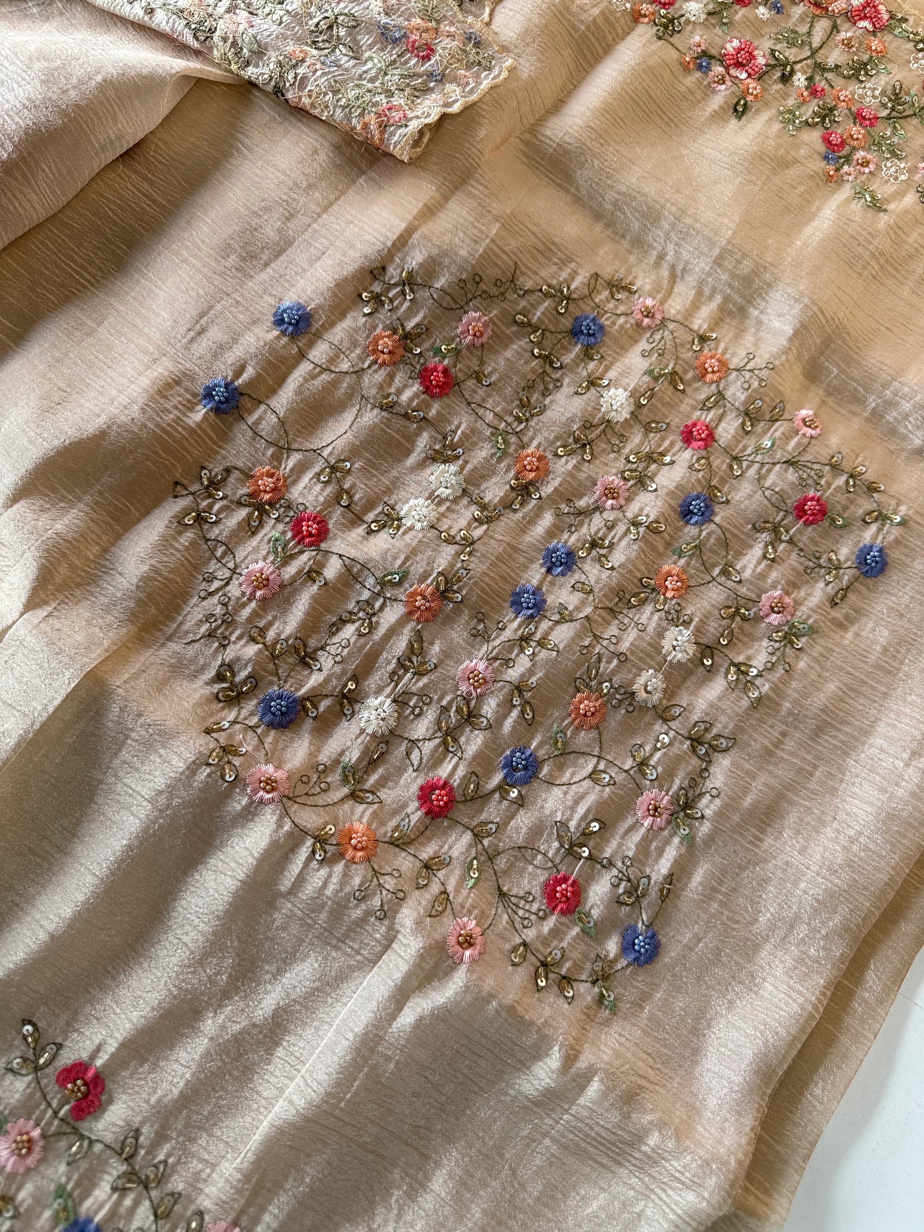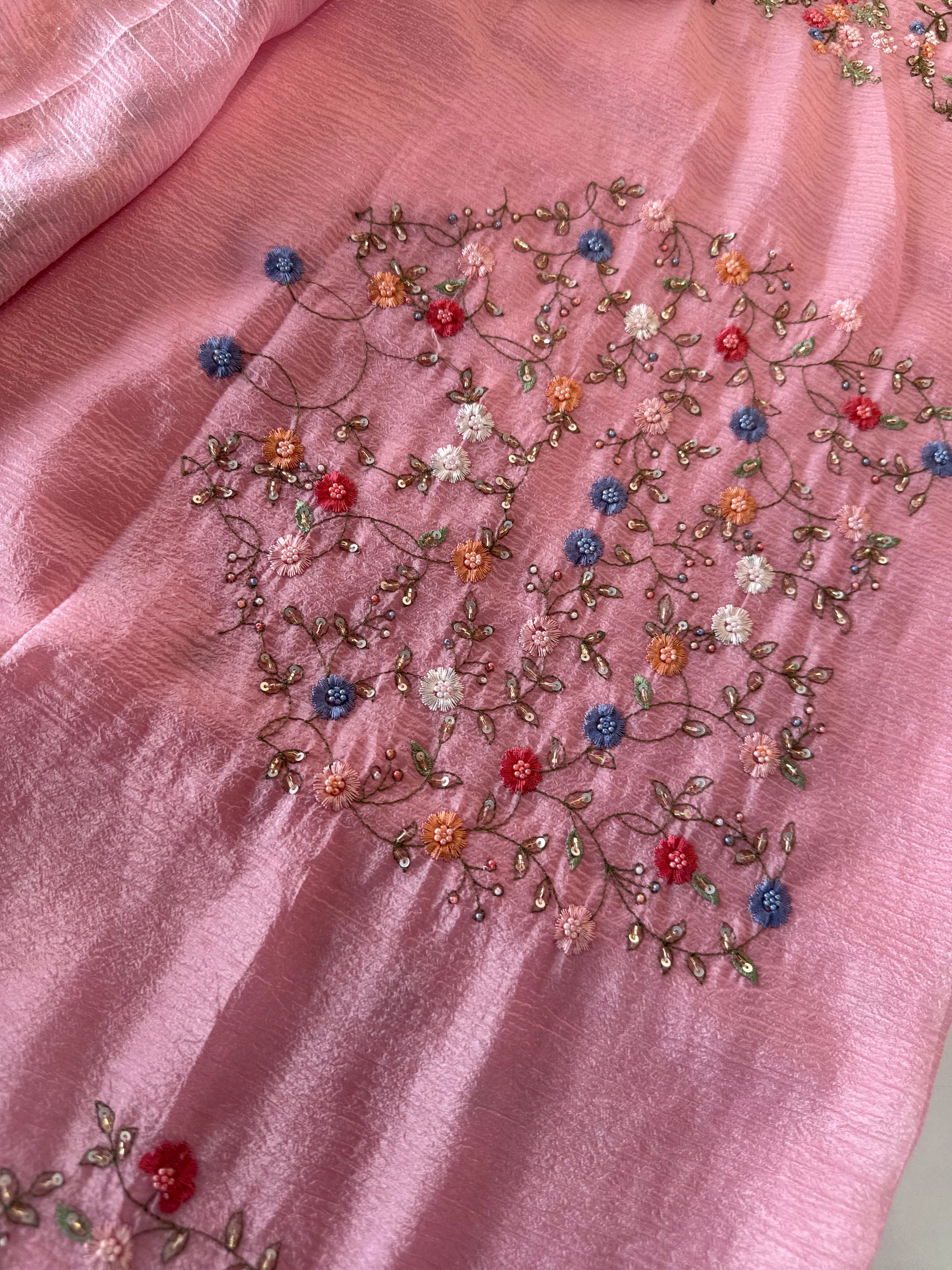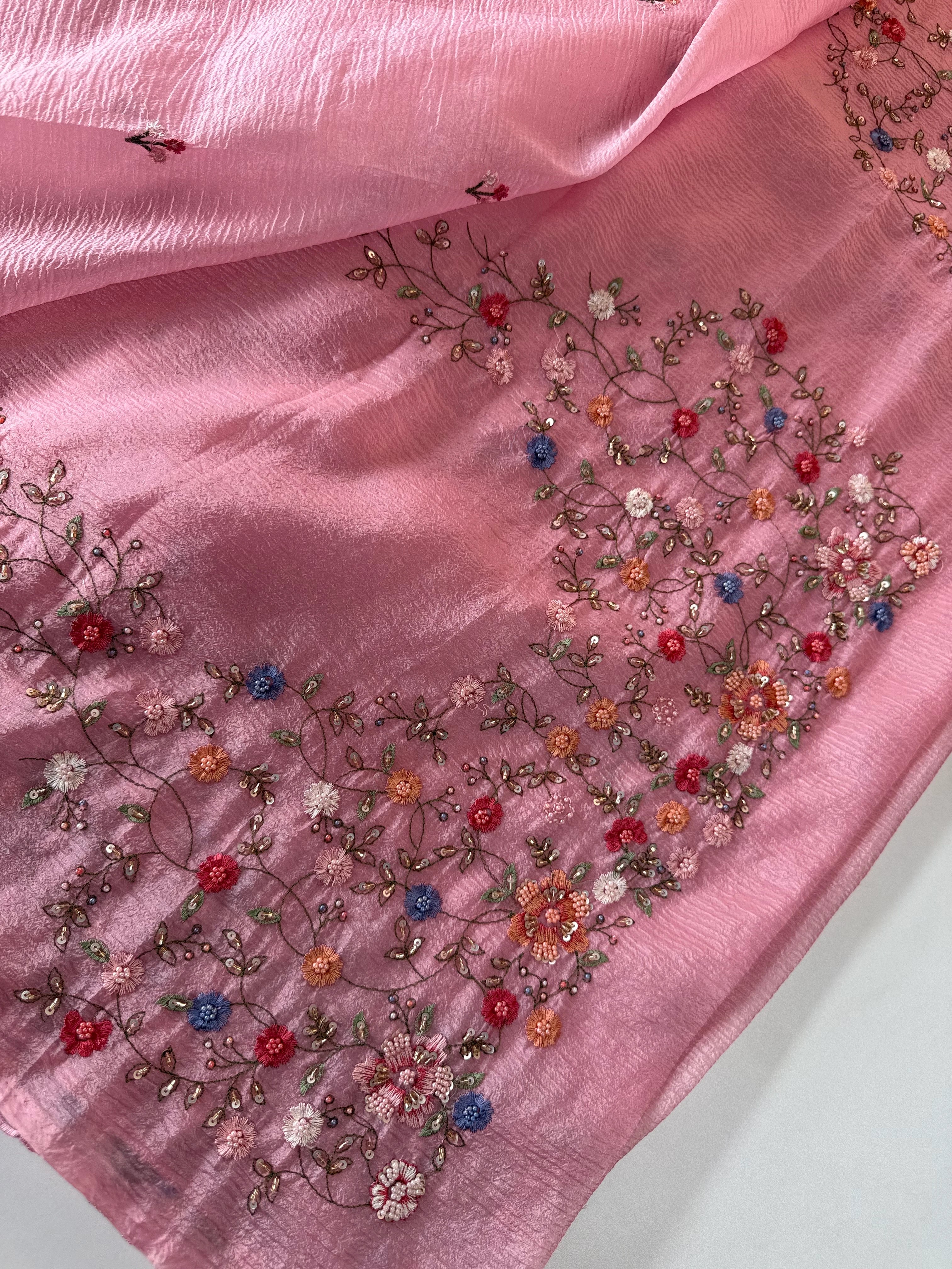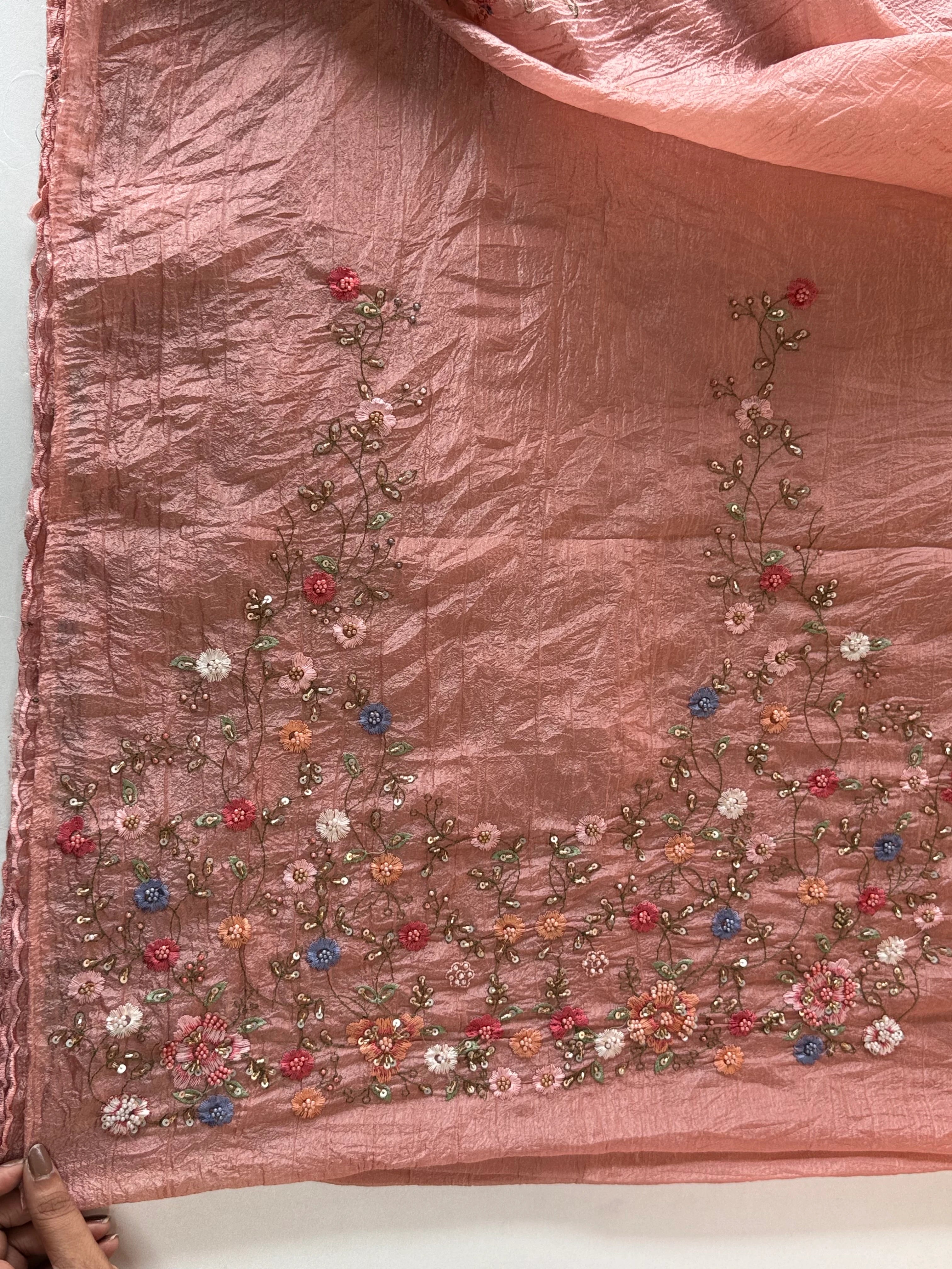 A beautifully textured crushed crepe saree adorned with all-over delicate threadwork, gracefully highlighted with cut beads, sugar beads, and pearls for a subtle shimmer. Comes with a matching running blouse piece featuring heavy embellishments on the sleeves, front, and back neckline—ensuring a rich, complete look. The lightweight, non-transparent crepe fabric drapes effortlessly, making it perfect for evening occasions and celebrations.