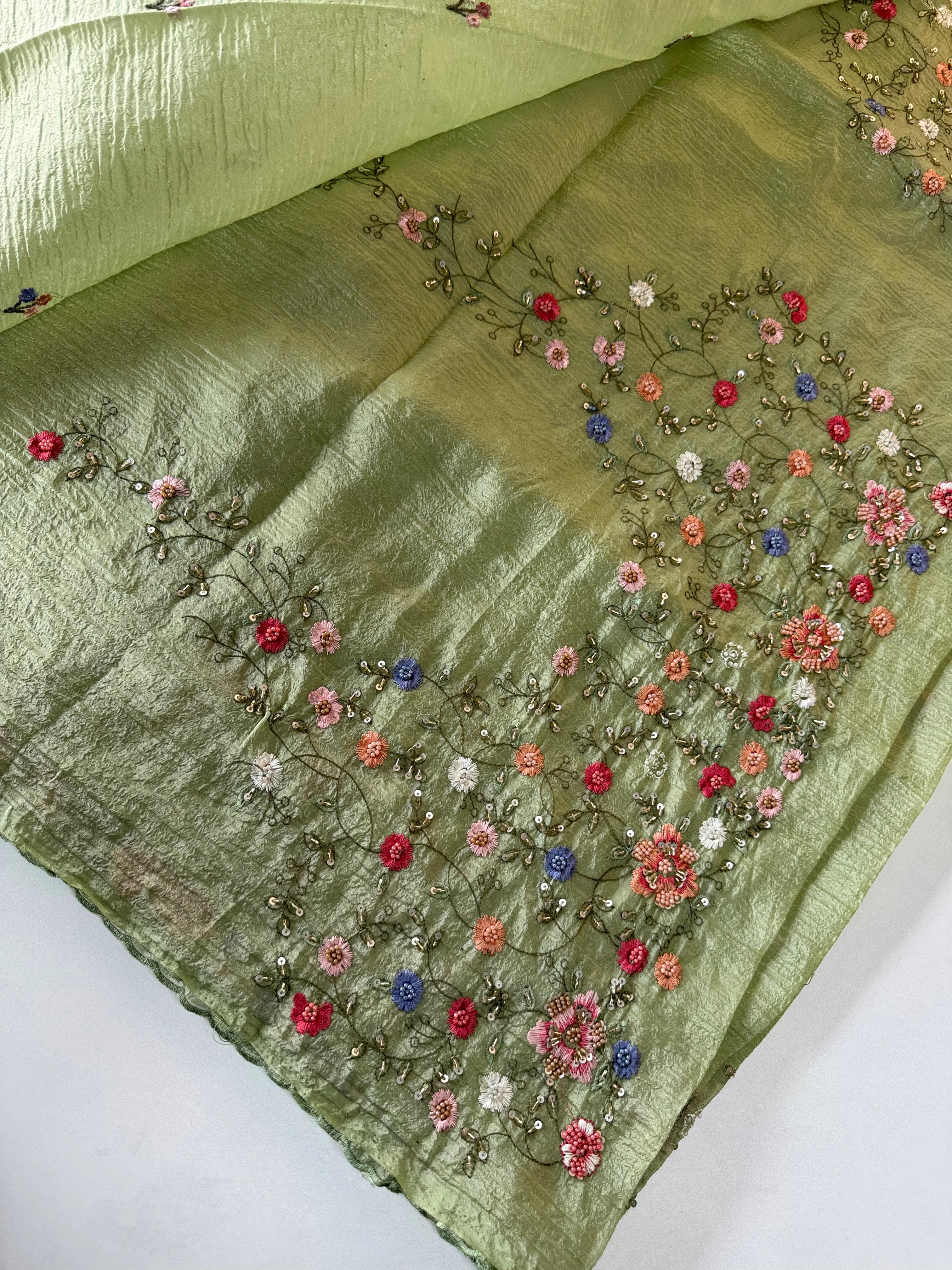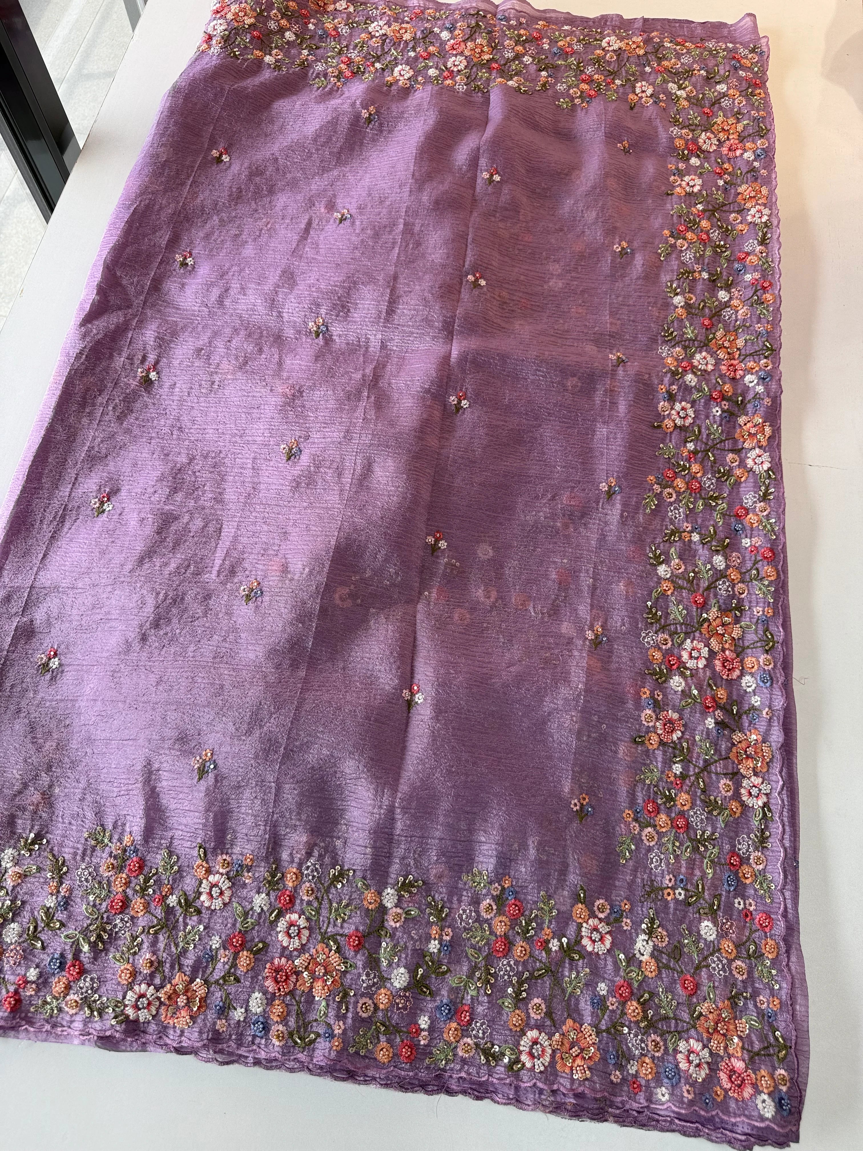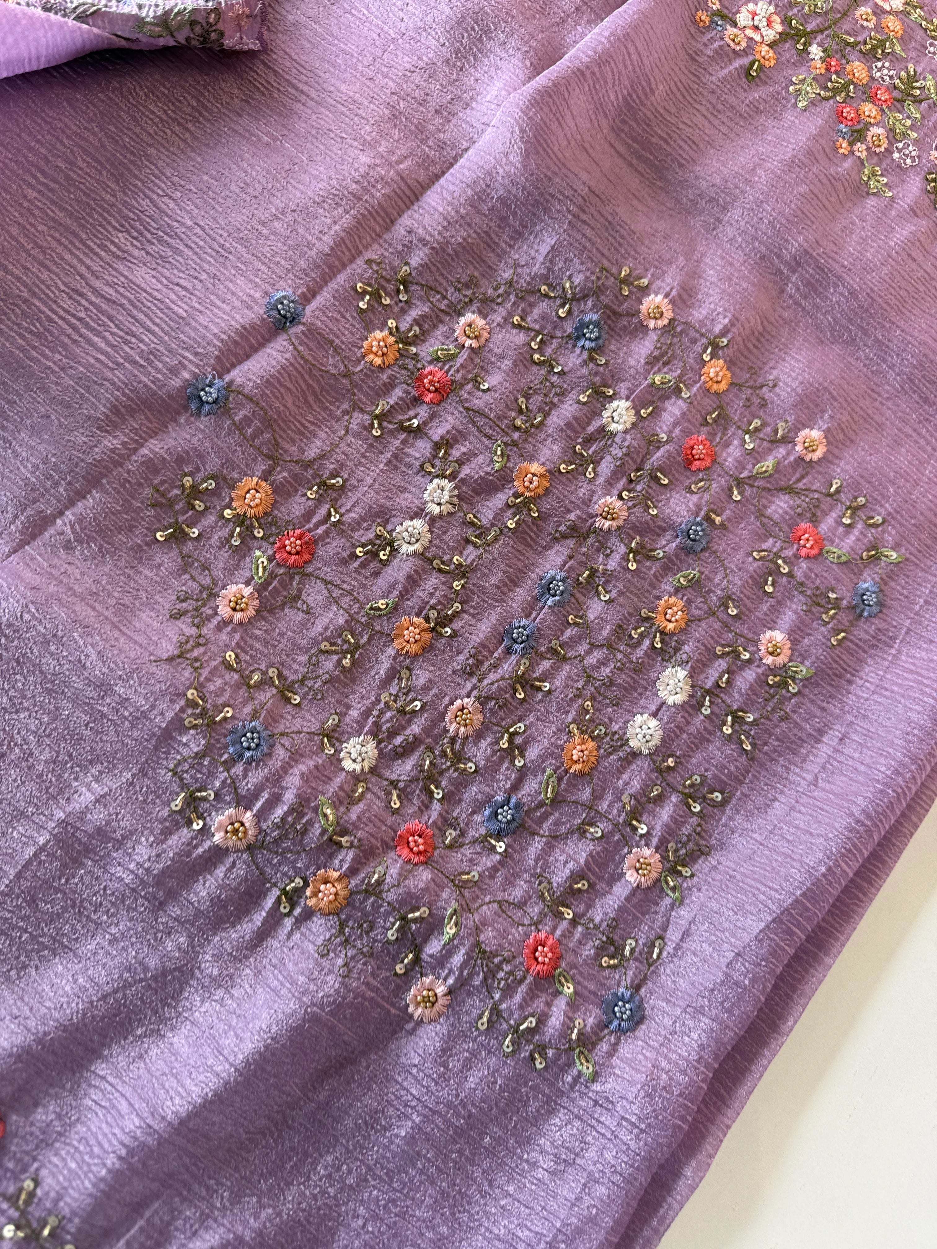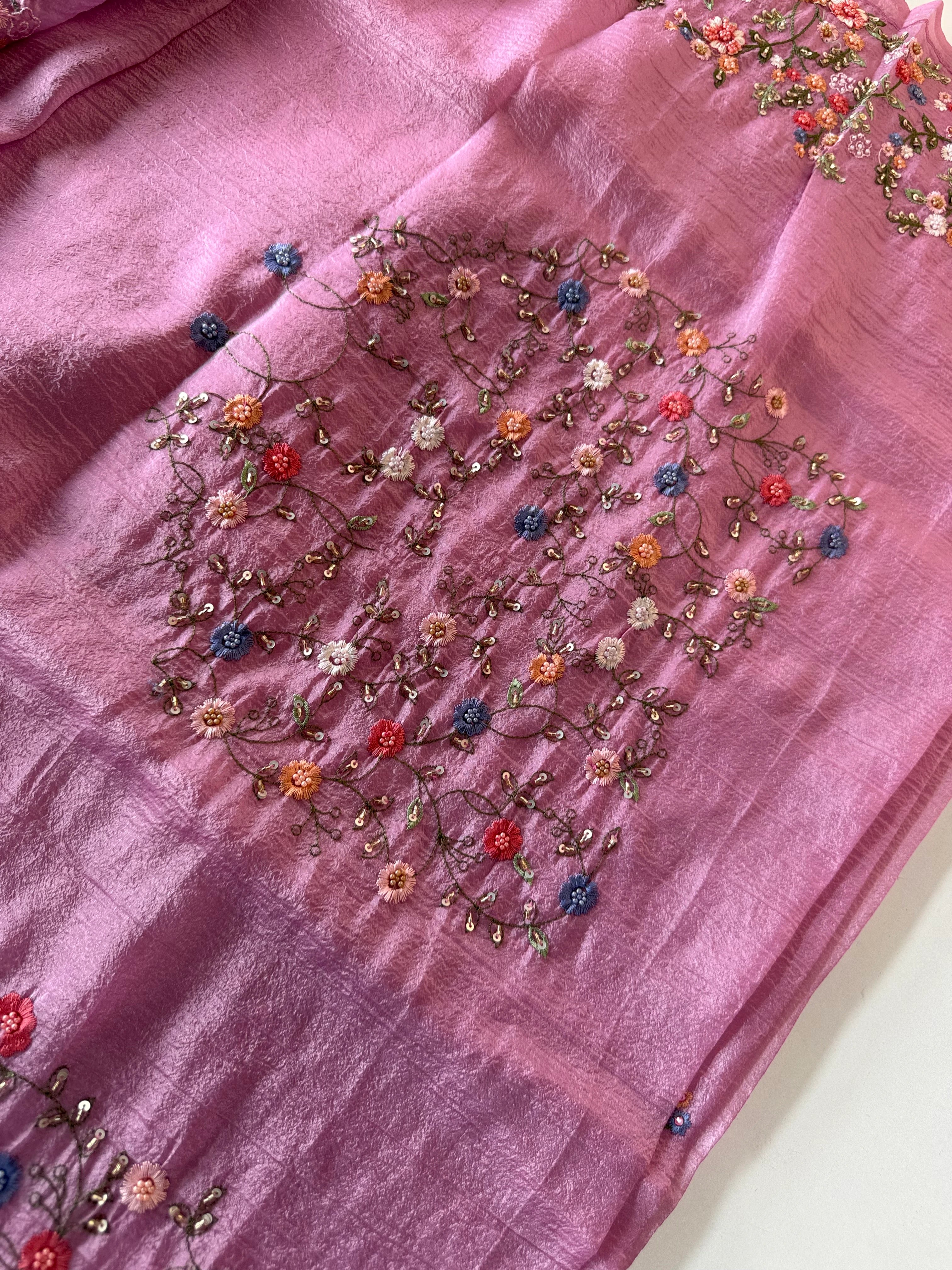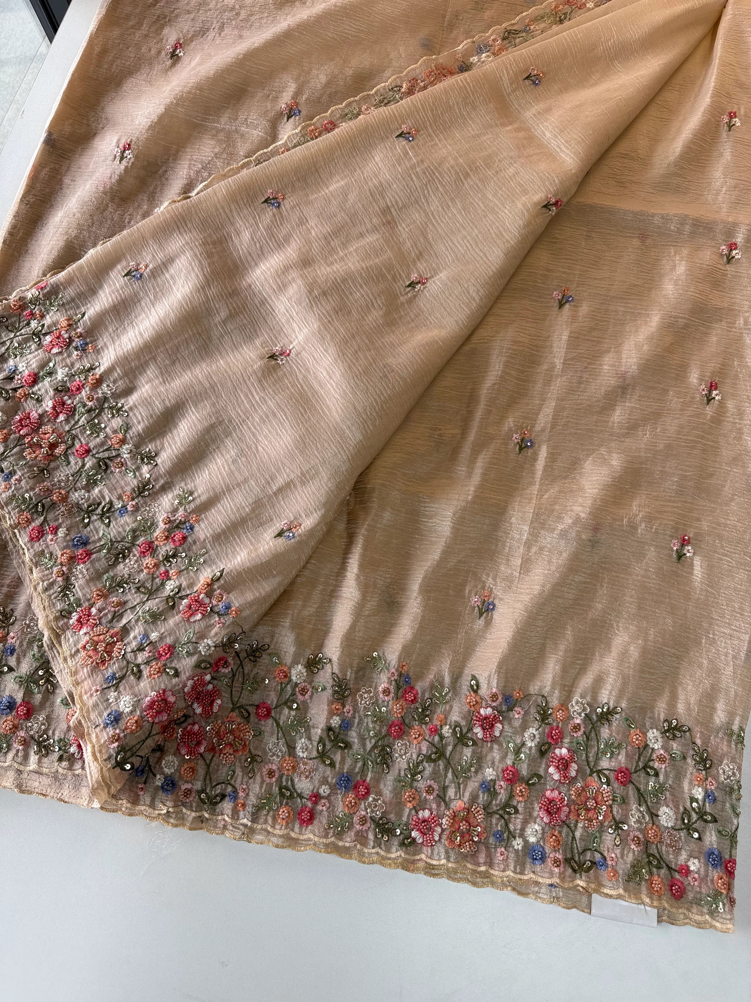 A beautifully textured crushed crepe saree adorned with all-over delicate threadwork, gracefully highlighted with cut beads, sugar beads, and pearls for a subtle shimmer. Comes with a matching running blouse piece featuring heavy embellishments on the sleeves, front, and back neckline—ensuring a rich, complete look. The lightweight, non-transparent crepe fabric drapes effortlessly, making it perfect for evening occasions and celebrations.