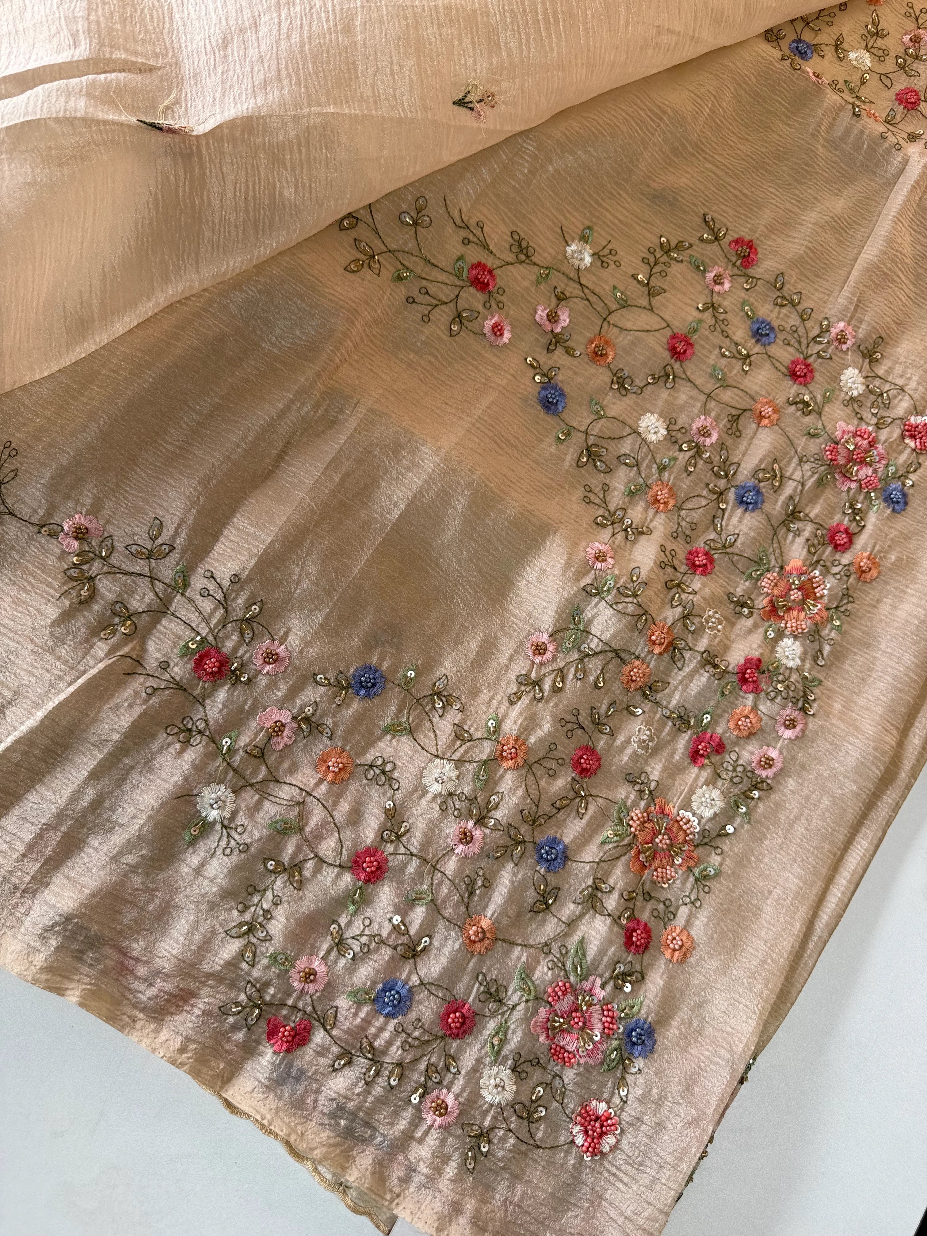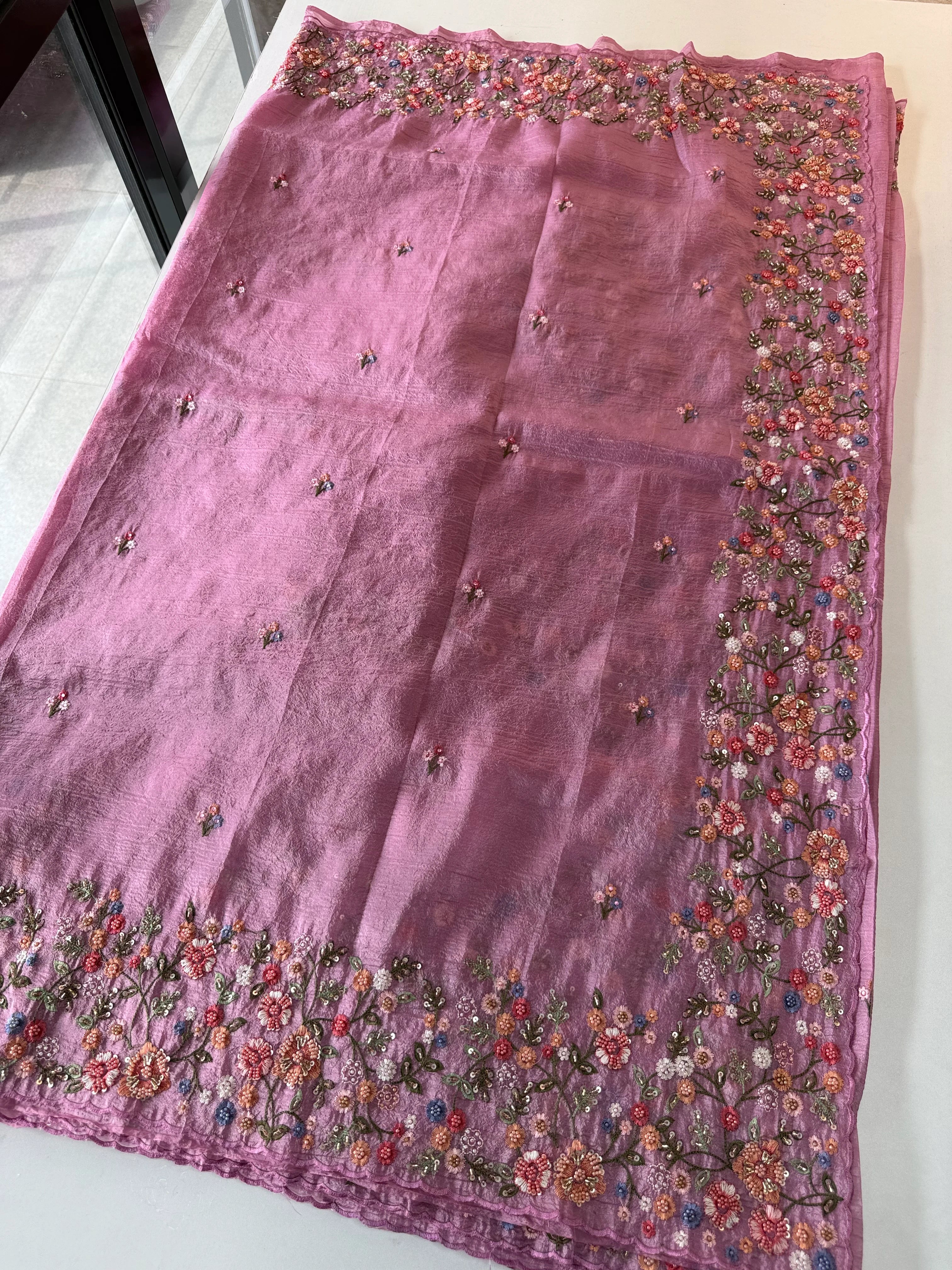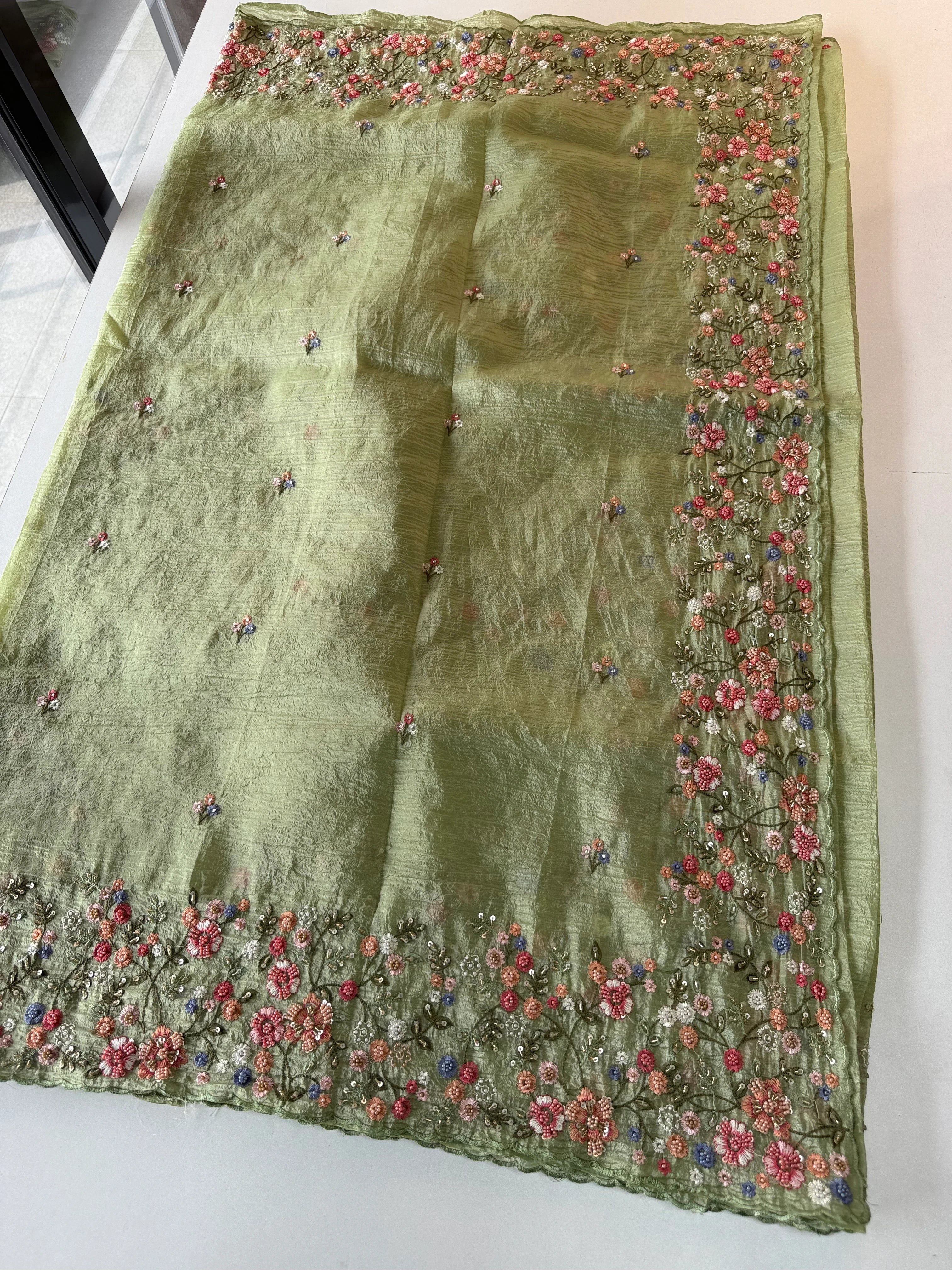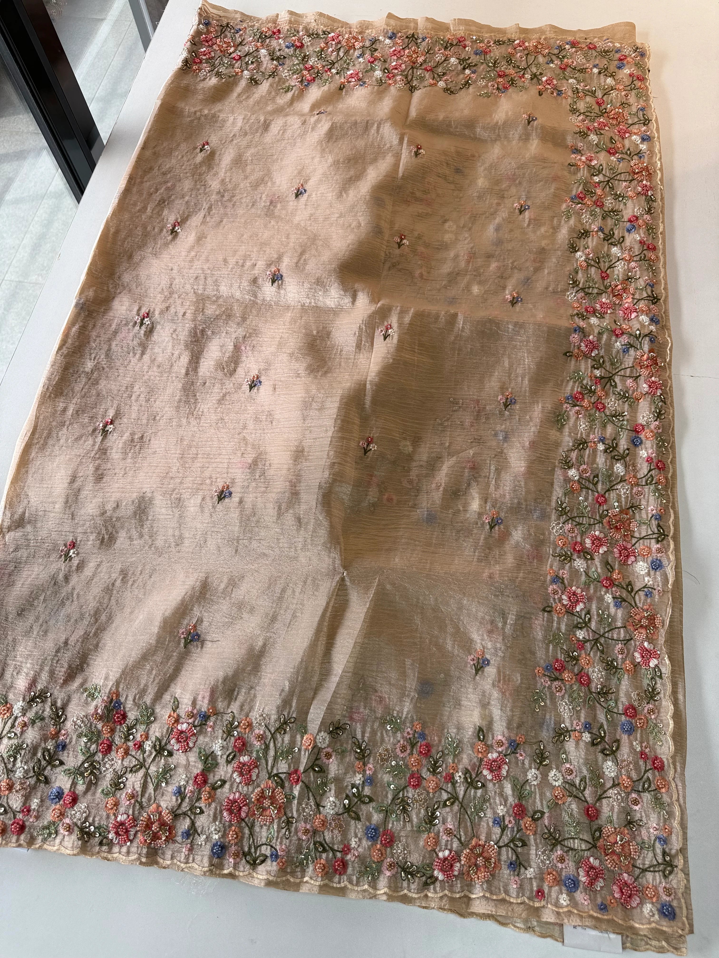 A beautifully textured crushed crepe saree adorned with all-over delicate threadwork, gracefully highlighted with cut beads, sugar beads, and pearls for a subtle shimmer. Comes with a matching running blouse piece featuring heavy embellishments on the sleeves, front, and back neckline—ensuring a rich, complete look. The lightweight, non-transparent crepe fabric drapes effortlessly, making it perfect for evening occasions and celebrations.