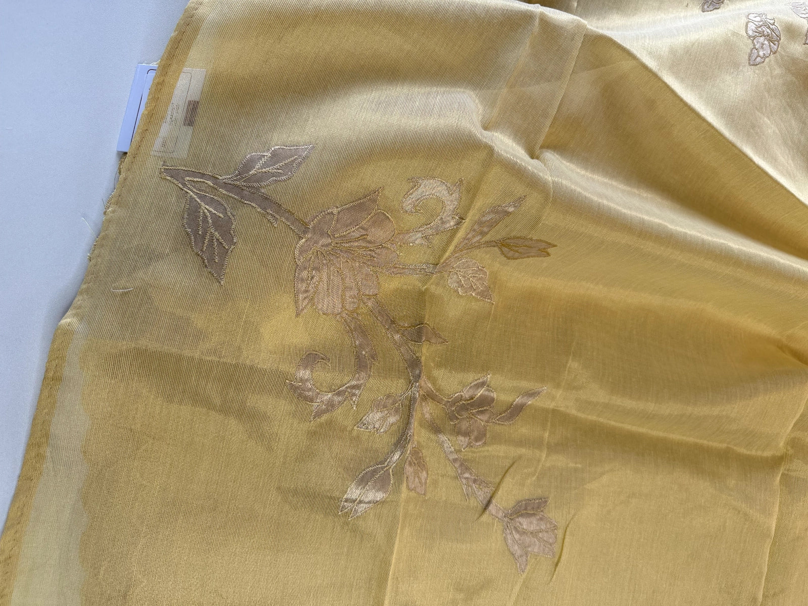 Chanderi tissue blend saree featuring golden appliqué work gracefully highlighted on the pallu. The borders are delicately scalloped, while golden appliqué motifs are scattered across the body for a subtle shimmer. The blouse piece carries dainty floral appliqué botas, complementing the saree beautifully. Lightweight and mildly transparent, this saree is perfect for an elegant and refined look.
