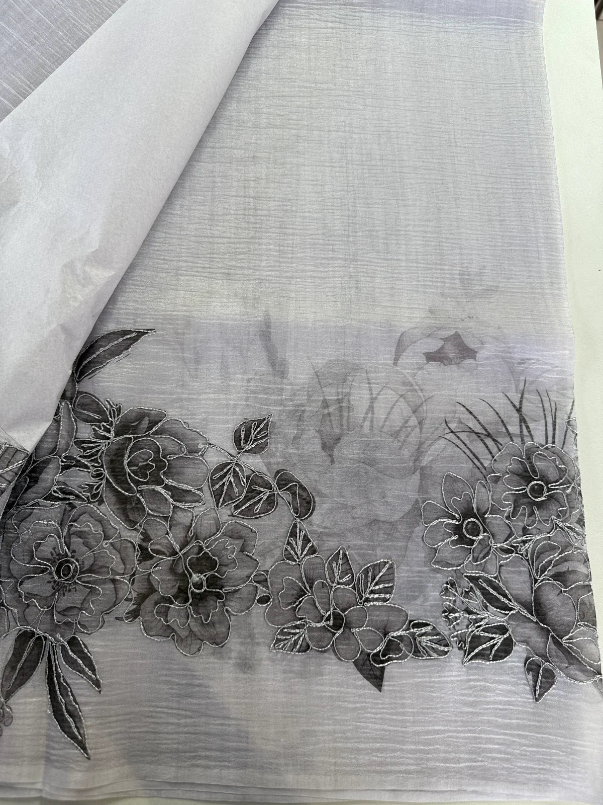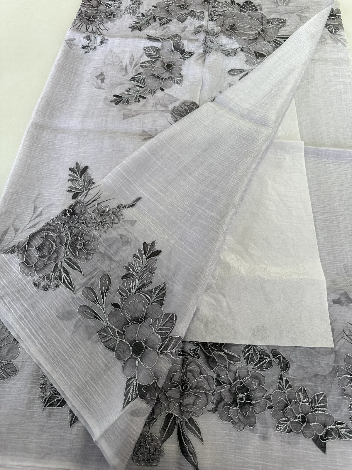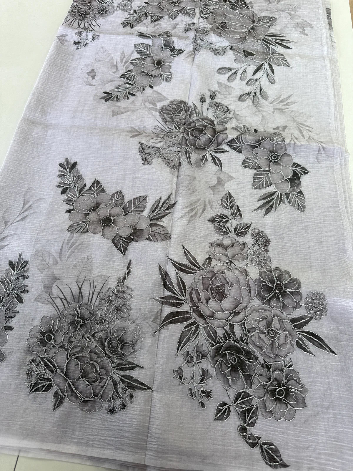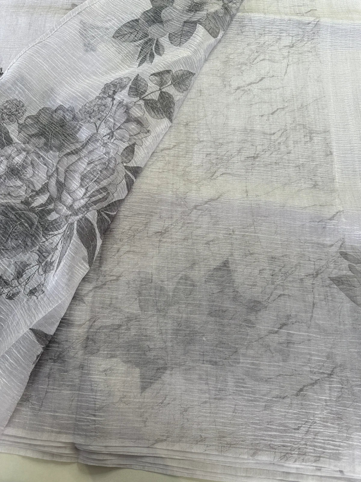This stunning Chinon saree features soft floral prints on a feather-light, flowy fabric that drapes beautifully without any transparency. Designed for effortless elegance, it’s easy to carry all day. Comes with a matching running blouse piece in the same small floral print for a seamless look.