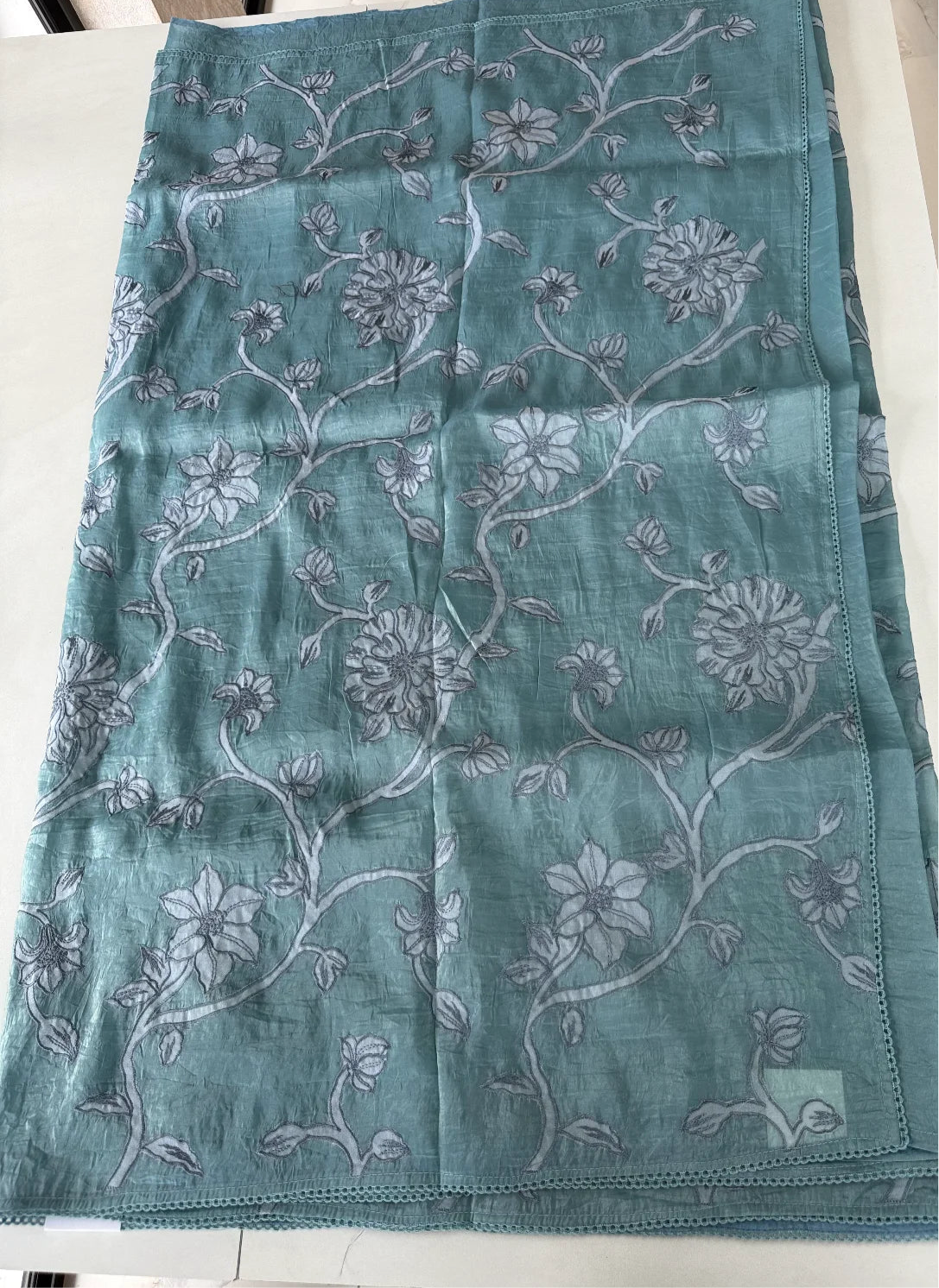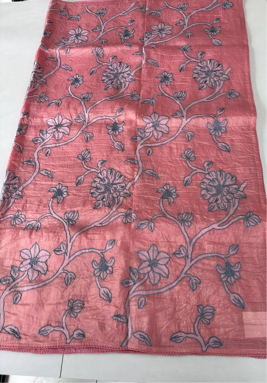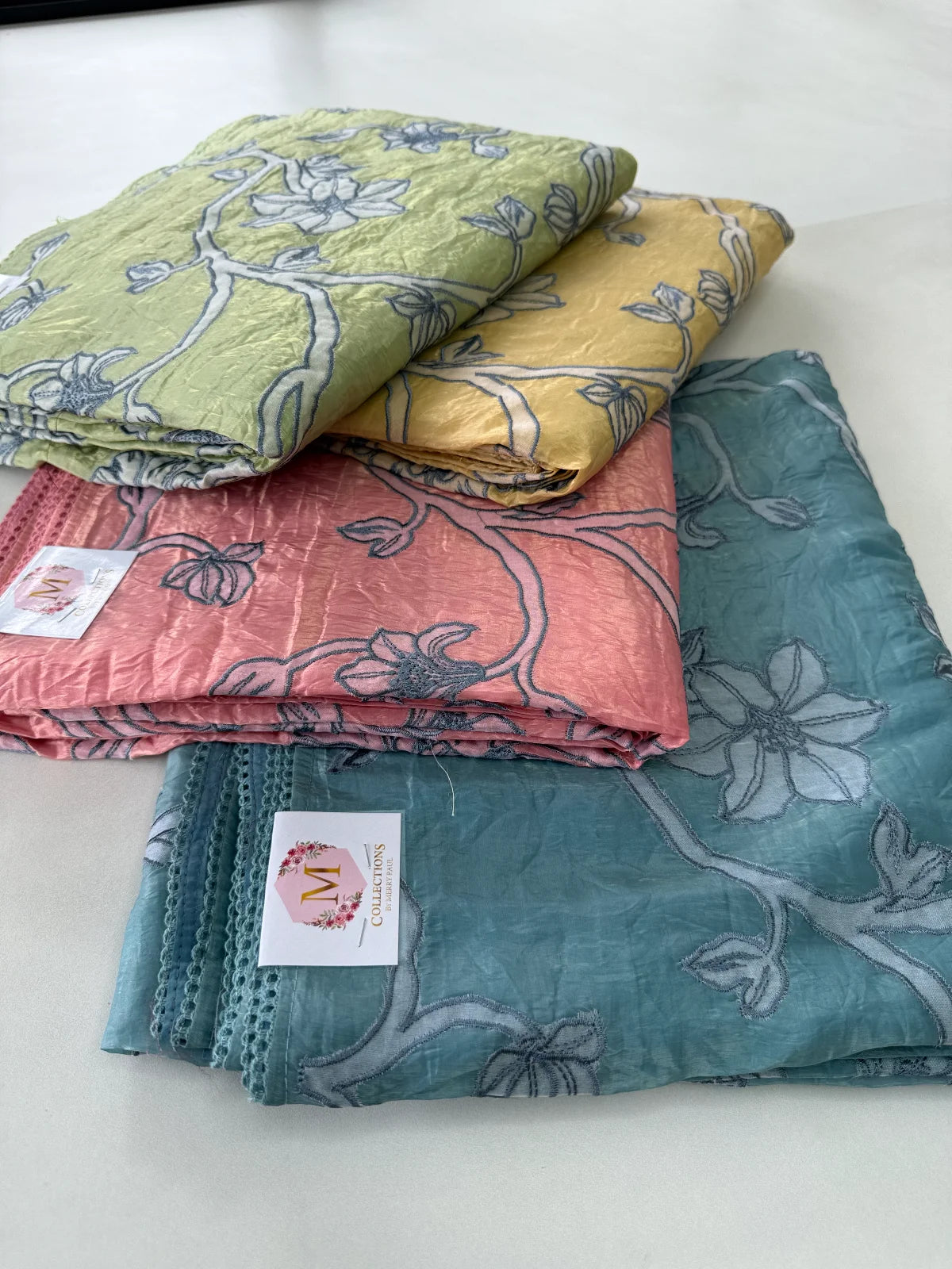 Elegant crushed organza saree featuring delicate threadwork spread throughout the body, giving it a soft, graceful charm. The fabric is lightweight, flowy, and non-transparent, making it easy to drape and perfect for all-day wear.