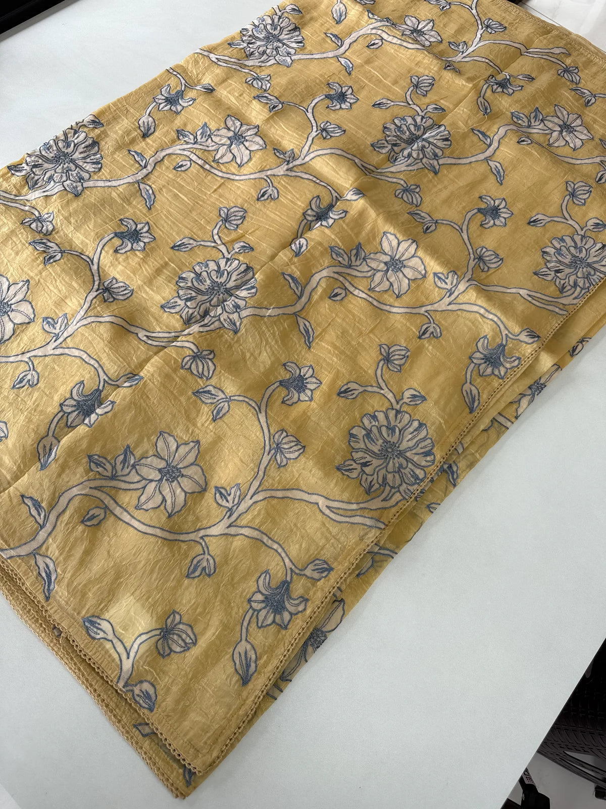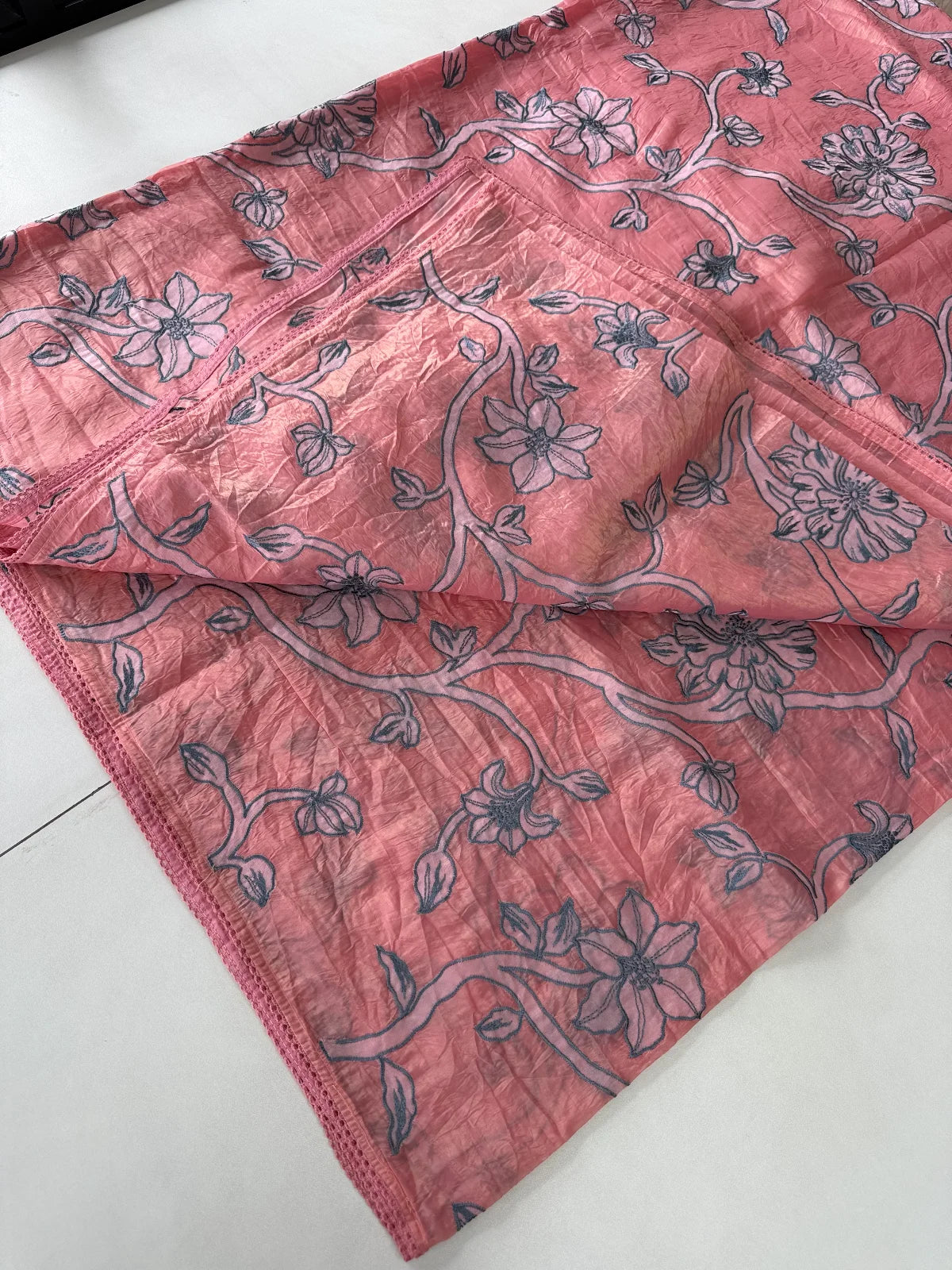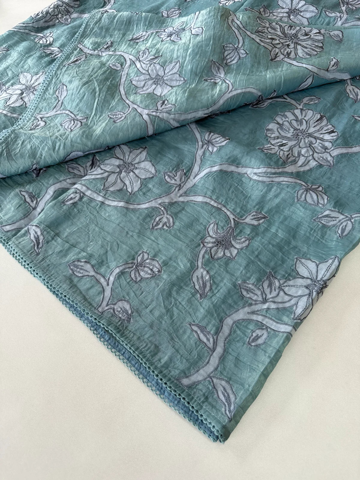 Elegant crushed organza saree featuring delicate threadwork spread throughout the body, giving it a soft, graceful charm. The fabric is lightweight, flowy, and non-transparent, making it easy to drape and perfect for all-day wear.