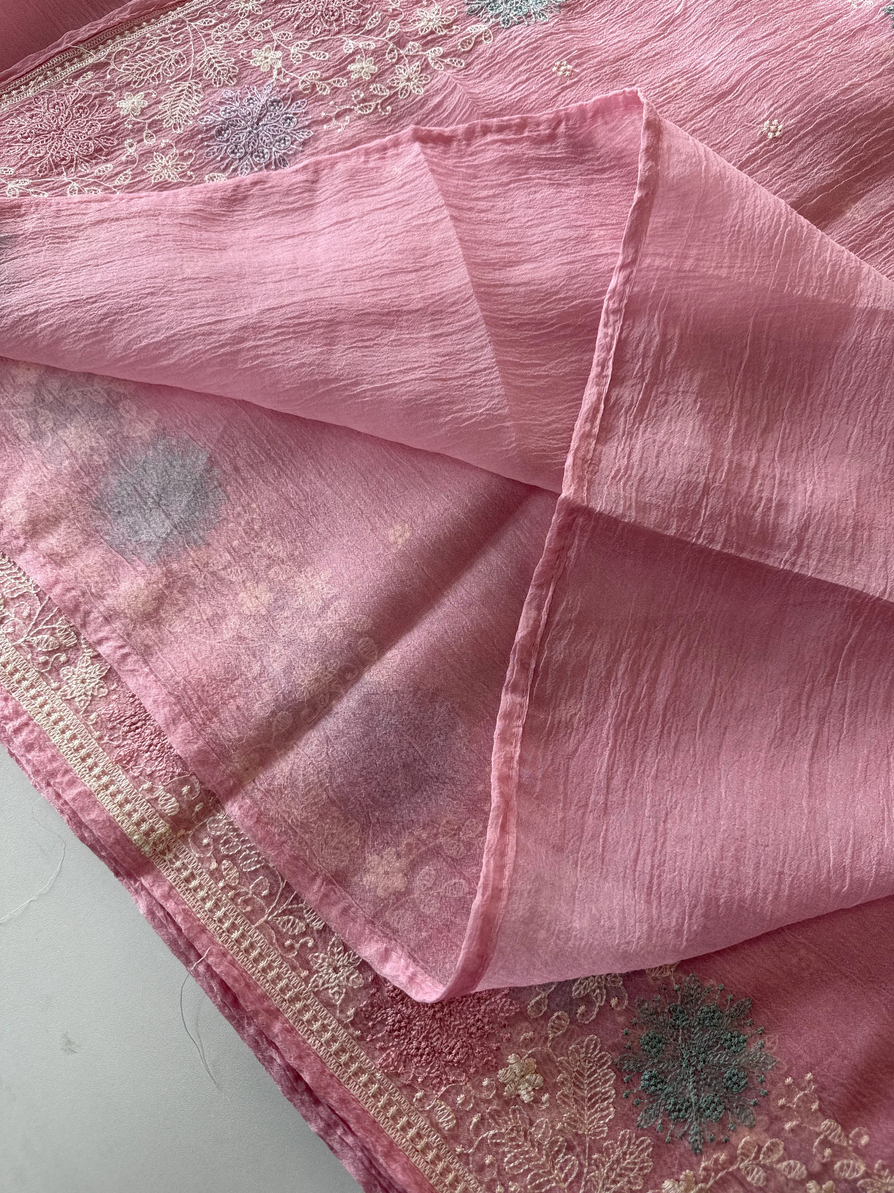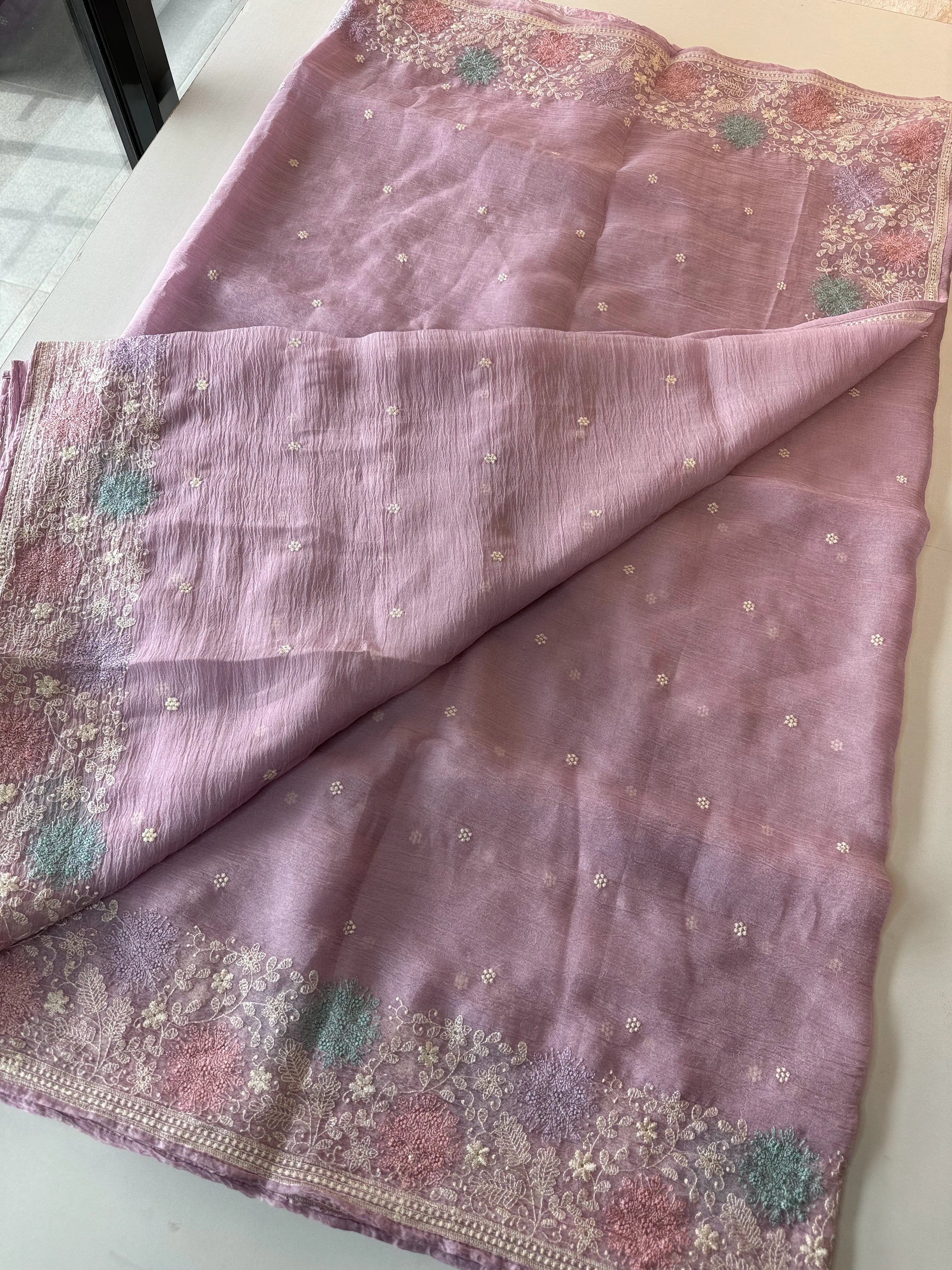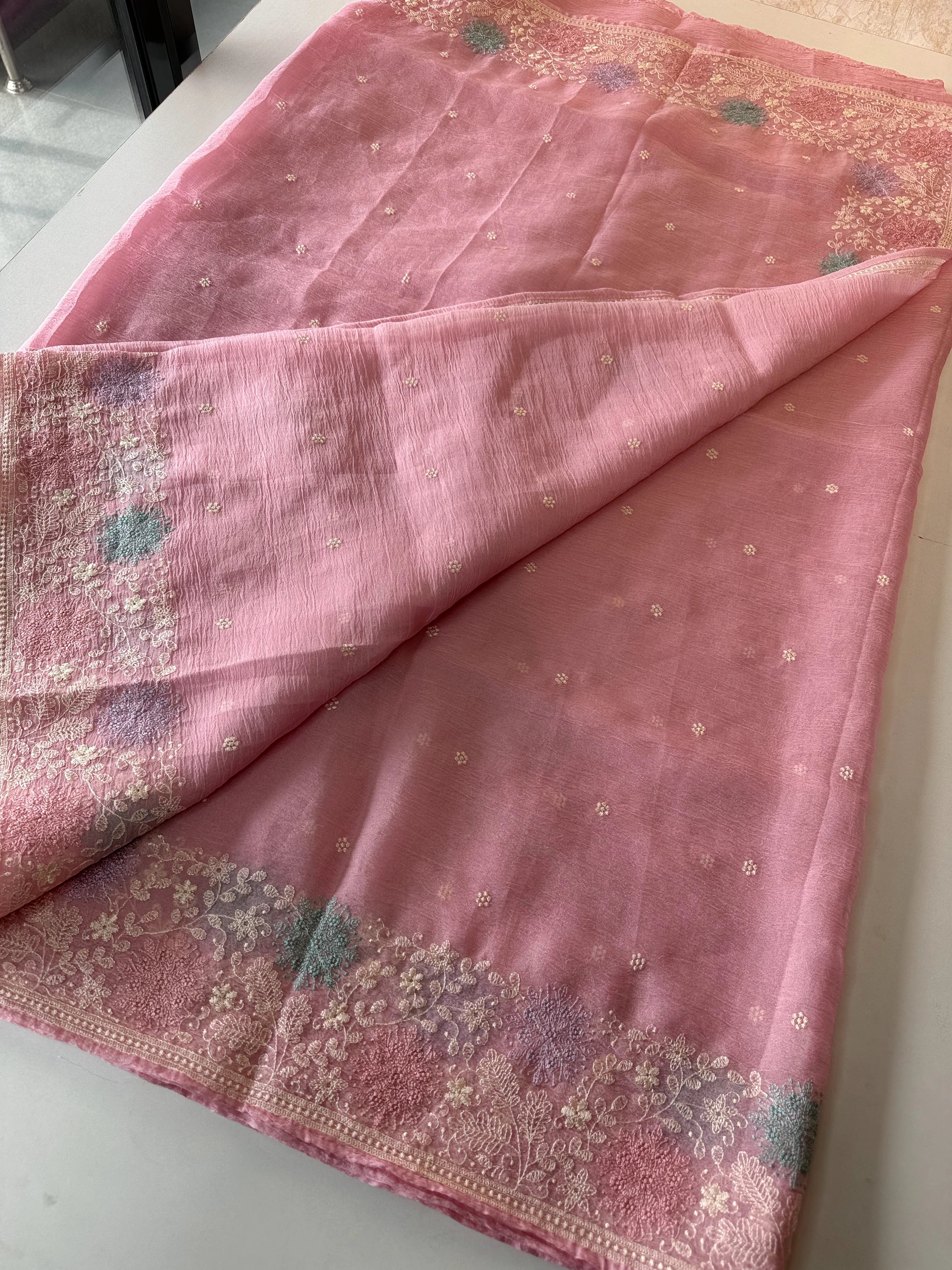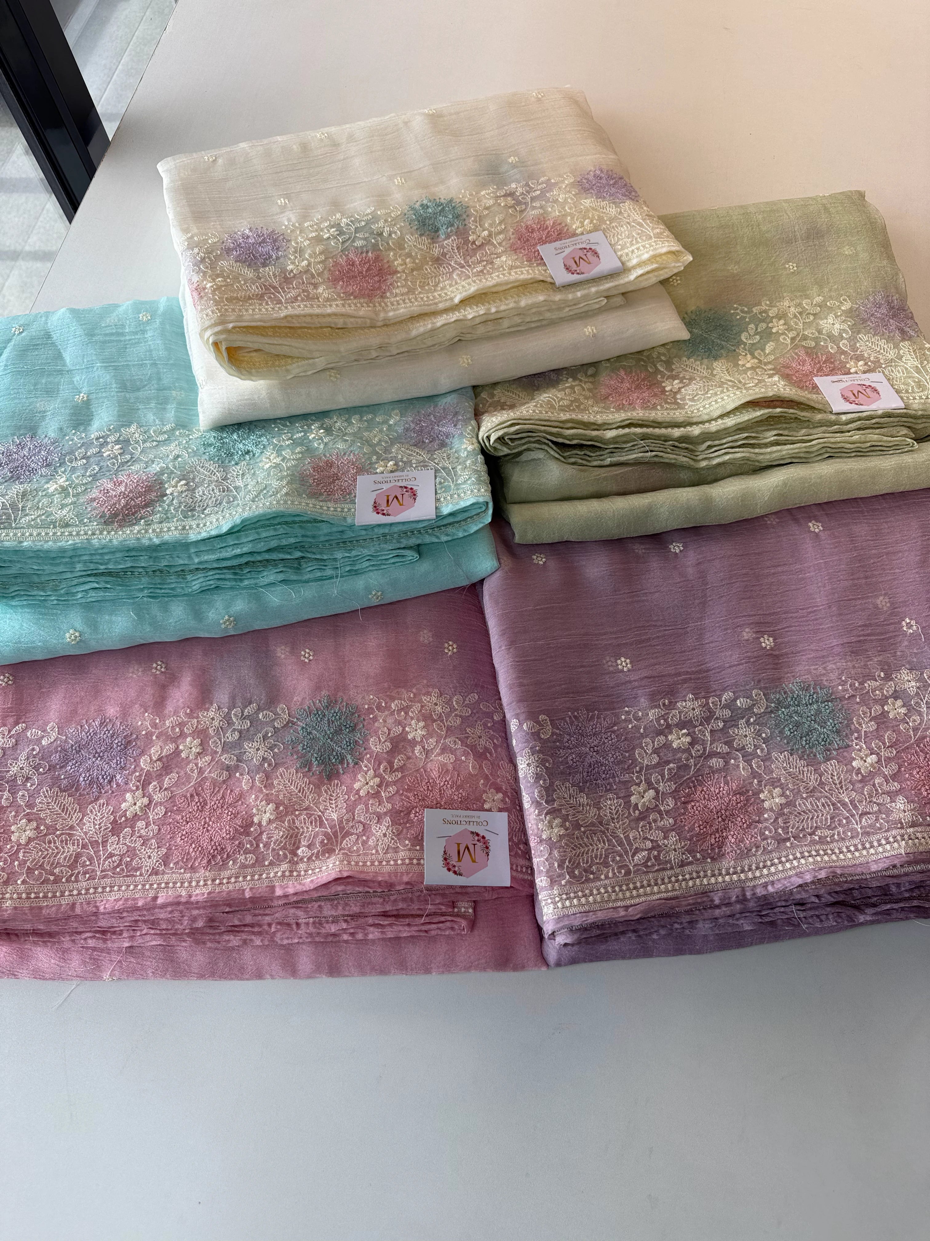 A brand-new texture in sarees – introducing mousam Crush! This fabric is feather-light, soft, and gracefully flowy, with a subtle sheer finish that adds elegance. Designed with a beautifully worked border, it’s perfect for party wear in a budget-friendly range.