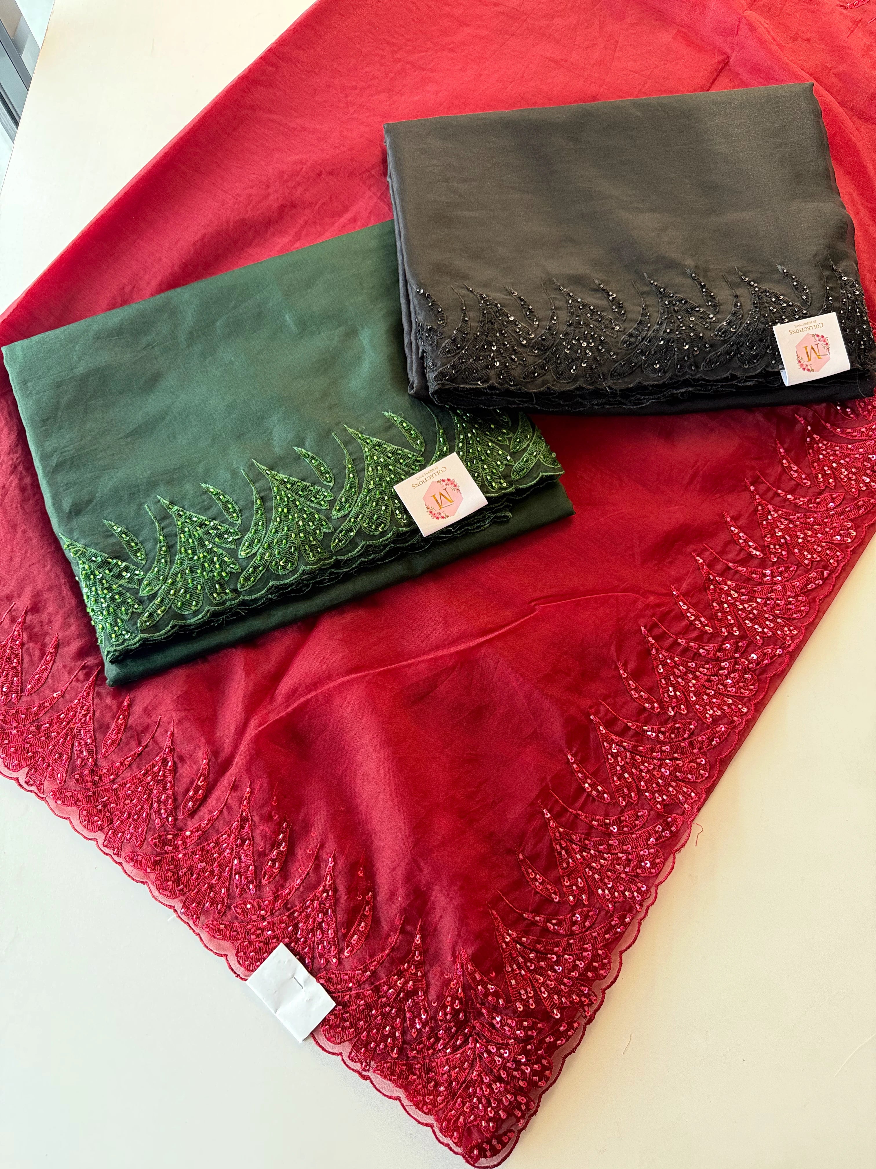 Soft organza saree with thread worked boarder with cutbead highlighting.Running blouse piece with sleeve end work, light weight , sheer fabric .