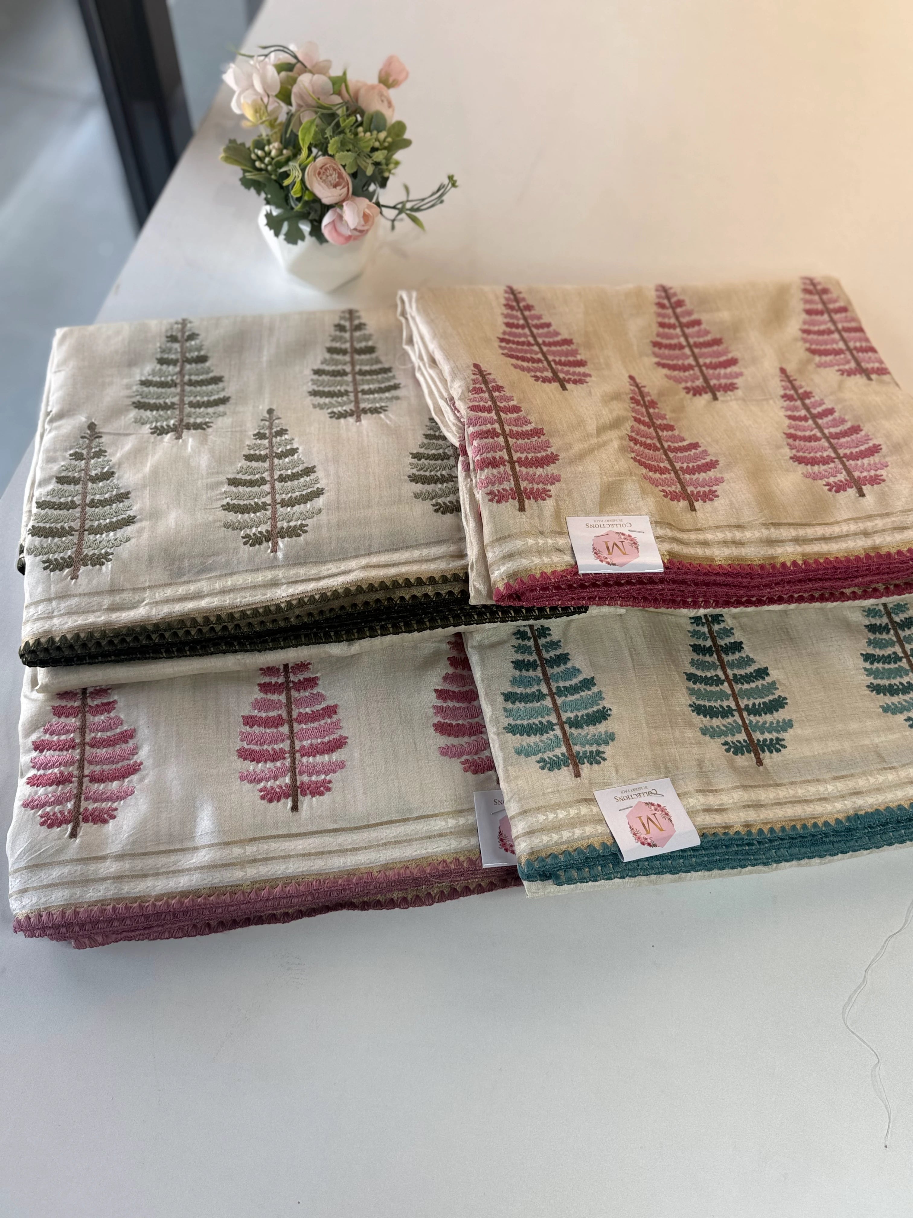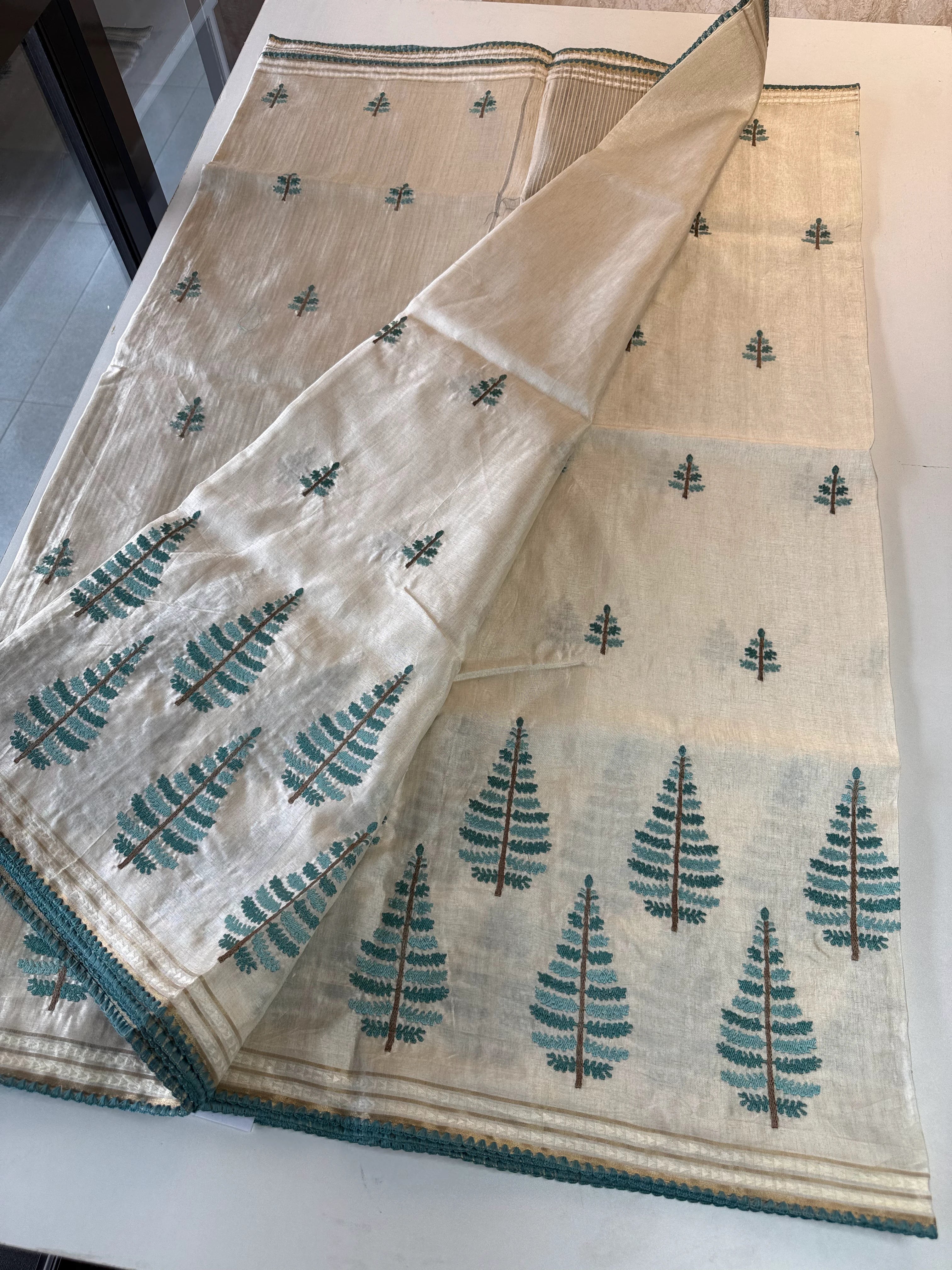 Elegant semi tussar saree featuring intricate thread embroidery along the border and pallu. The saree comes with a matching blouse piece, detailed with the stripes ,moderately Lightweight, graceful, and refined — perfect for festive and sophisticated occasions.