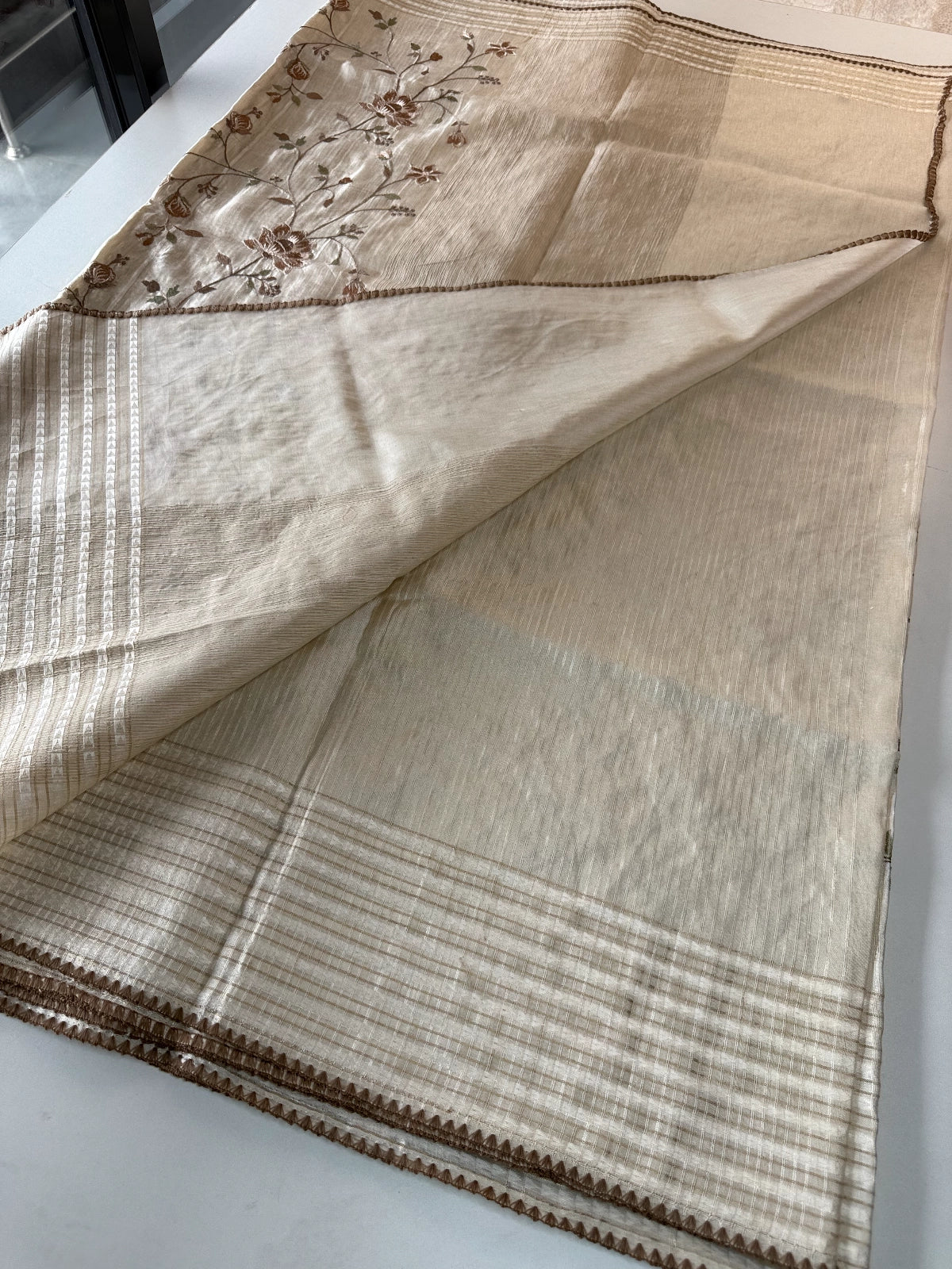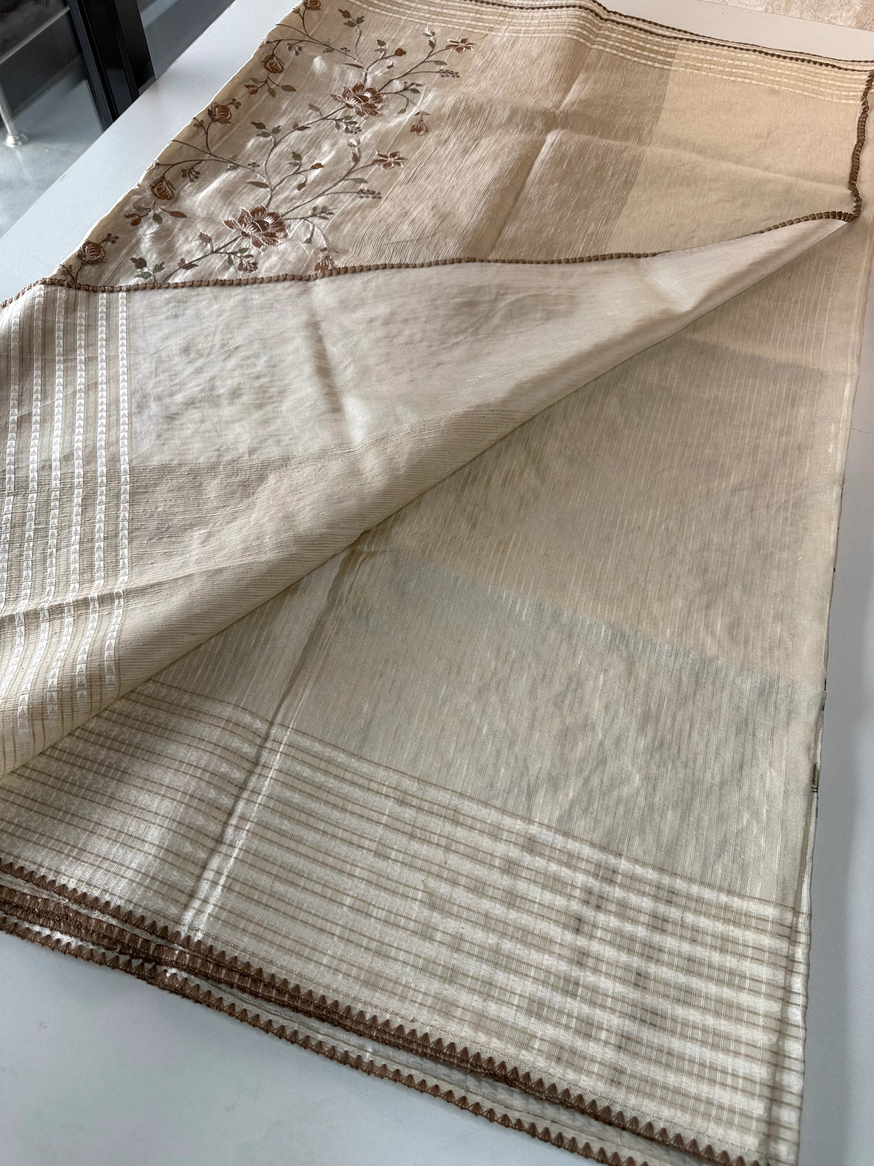 This elegant Semi-Tussar Saree features a soft Semi-jute pallu with intricate thread weaving patterns, adding a rich and artistic appeal. The saree body showcases fine threadwork that enhances its graceful texture and traditional charm.