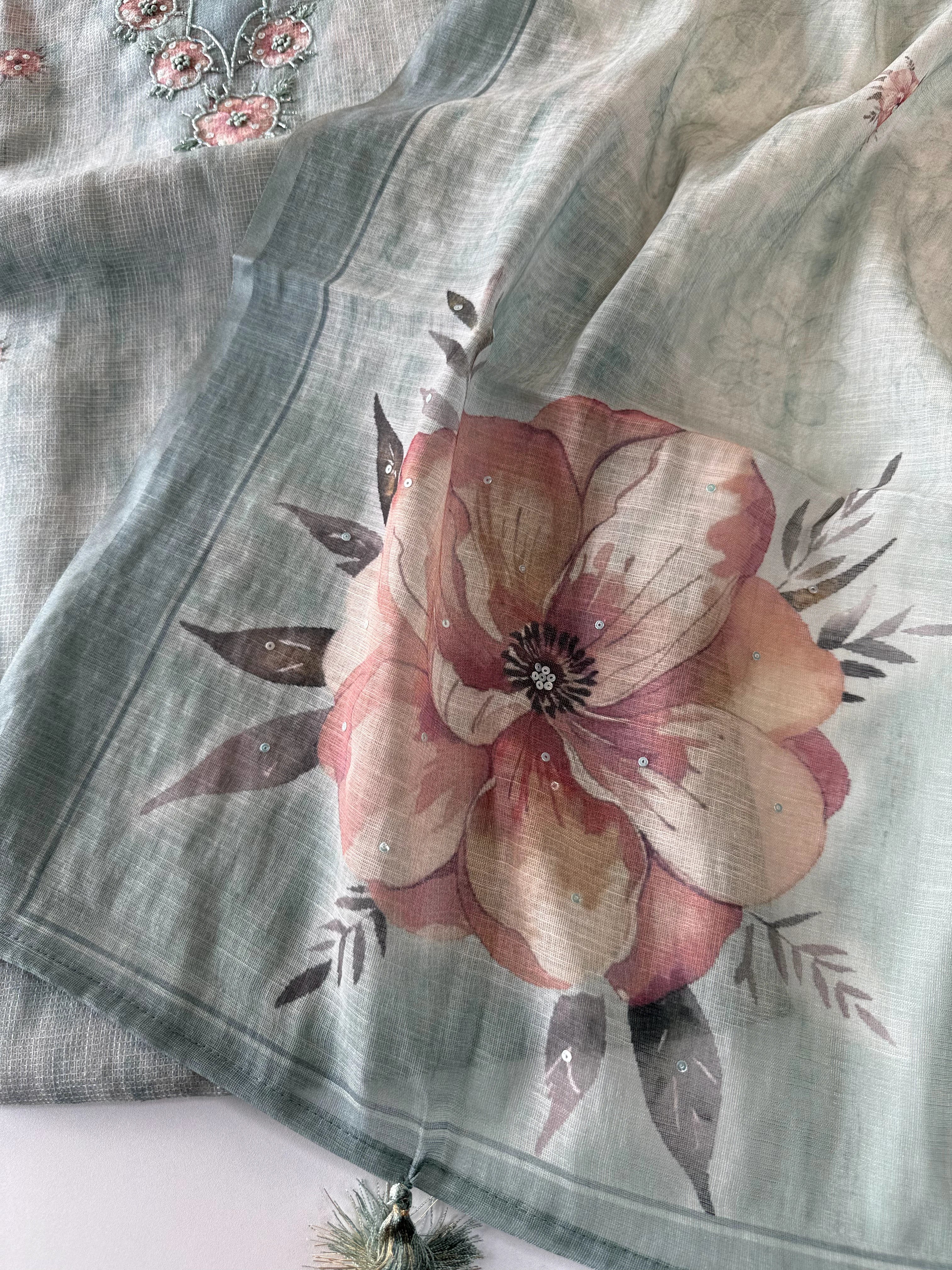 Net Kotta Salwar Set – A graceful ensemble featuring a net kotta top adorned with delicate handwork on the neckline. Paired with a linen-blend dupatta in soft floral prints and a comfortable cotton bottom, this set blends elegance with everyday wearability. Perfect for light occasions and casual gatherings.
