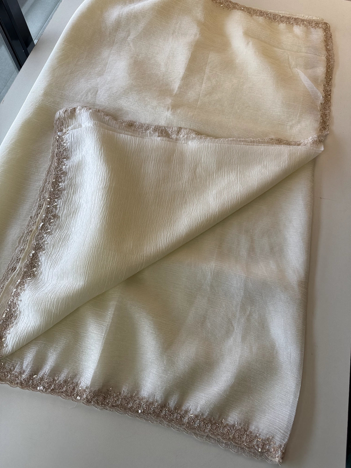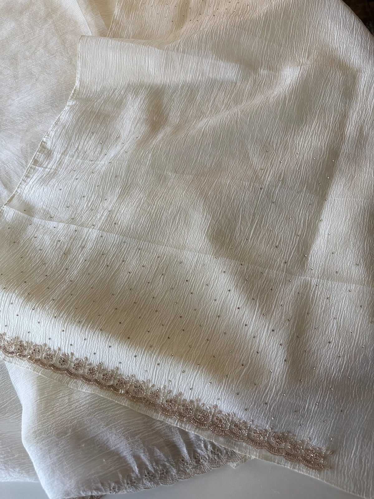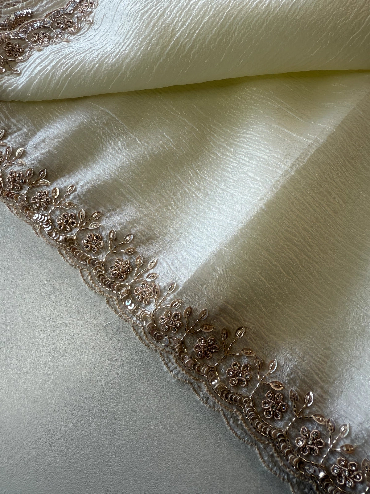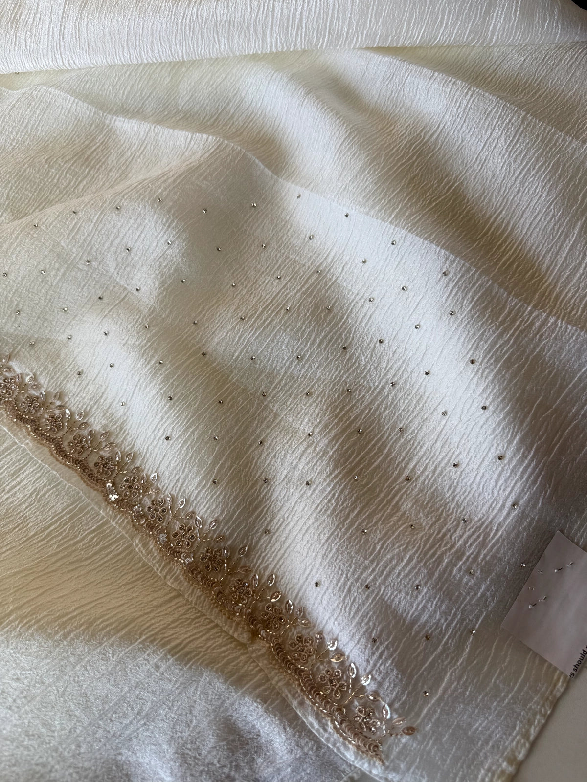 Platinum Crushed Georgette Saree – Crafted from premium fleece-like georgette fabric, this saree offers a soft, flowy drape with a non-transparent finish. The border is intricately hand-embellished with cut beads, sequins, and stones, adding a refined shimmer to its elegant tone. The matching blouse features stonework across the sleeves and back neck, beautifully complemented with border detailing similar to the saree. A simple yet graceful Pateva saree, perfect for sophisticated occasions and luxury gatherings.
