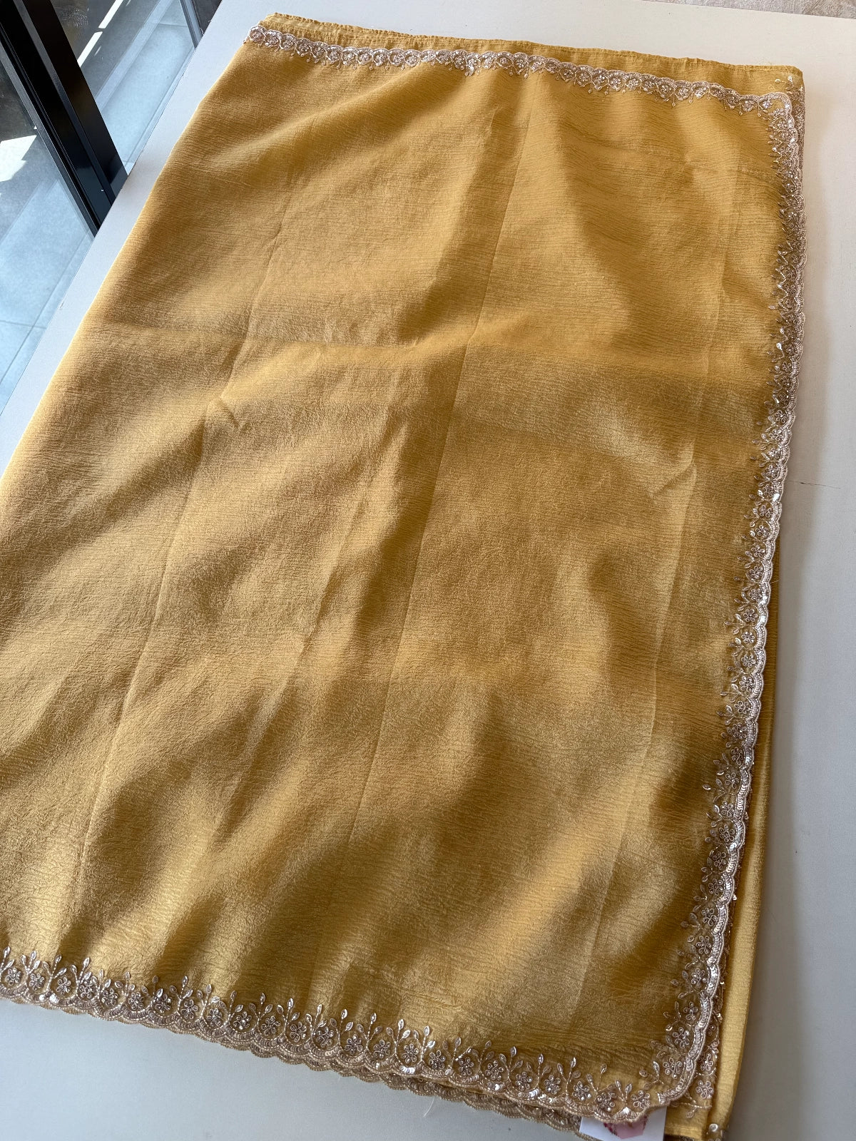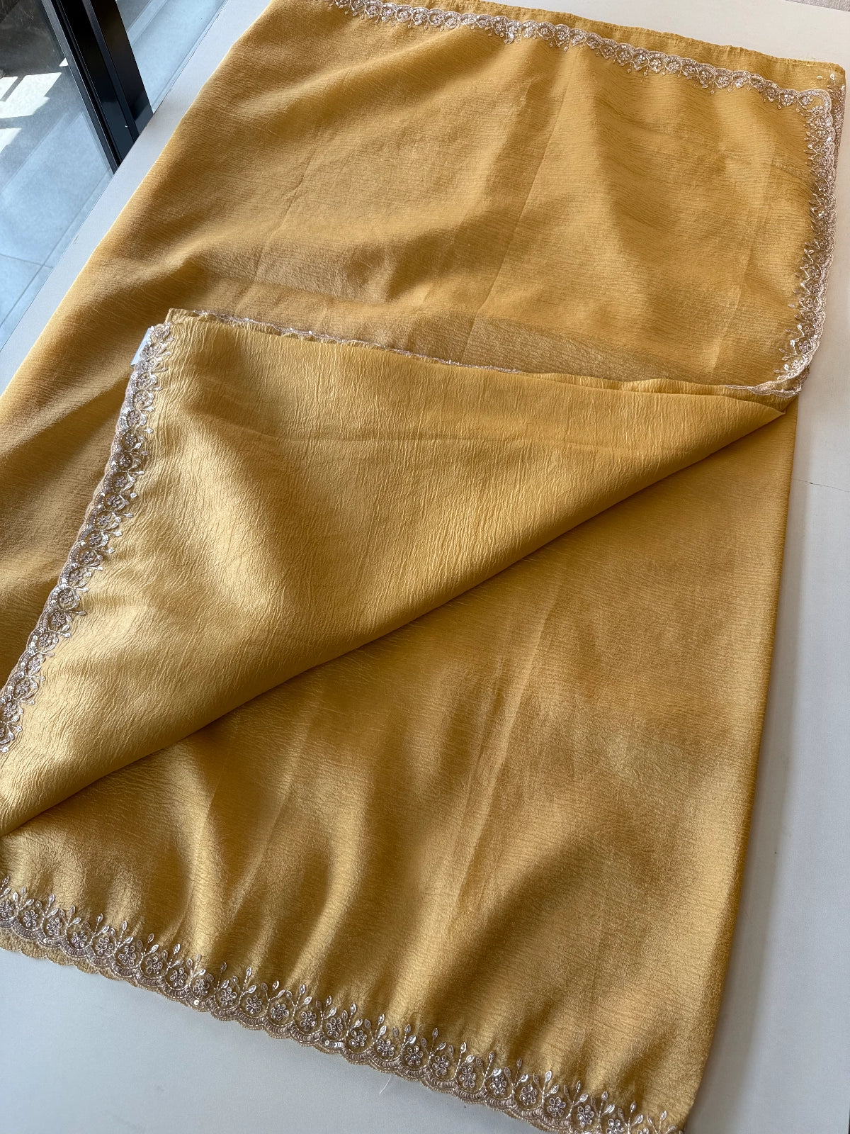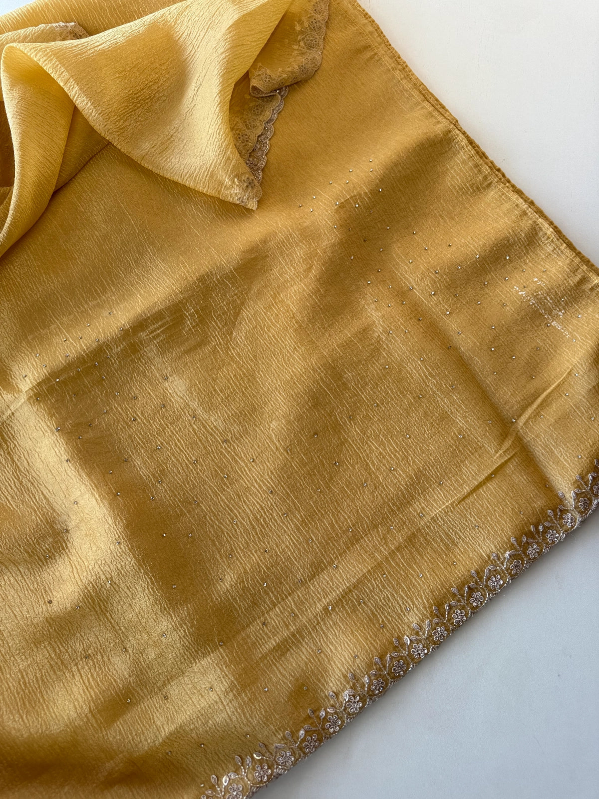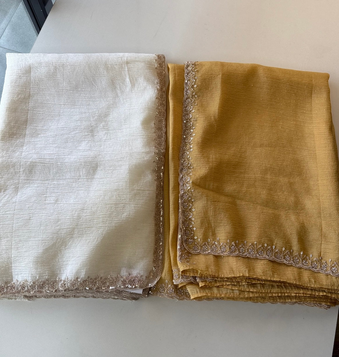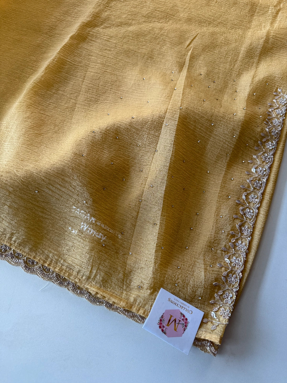 Platinum Crushed Georgette Saree – Crafted from premium fleece-like georgette fabric, this saree offers a soft, flowy drape with a non-transparent finish. The border is intricately hand-embellished with cut beads, sequins, and stones, adding a refined shimmer to its elegant tone. The matching blouse features stonework across the sleeves and back neck, beautifully complemented with border detailing similar to the saree. A simple yet graceful Pateva saree, perfect for sophisticated occasions and luxury gatherings.