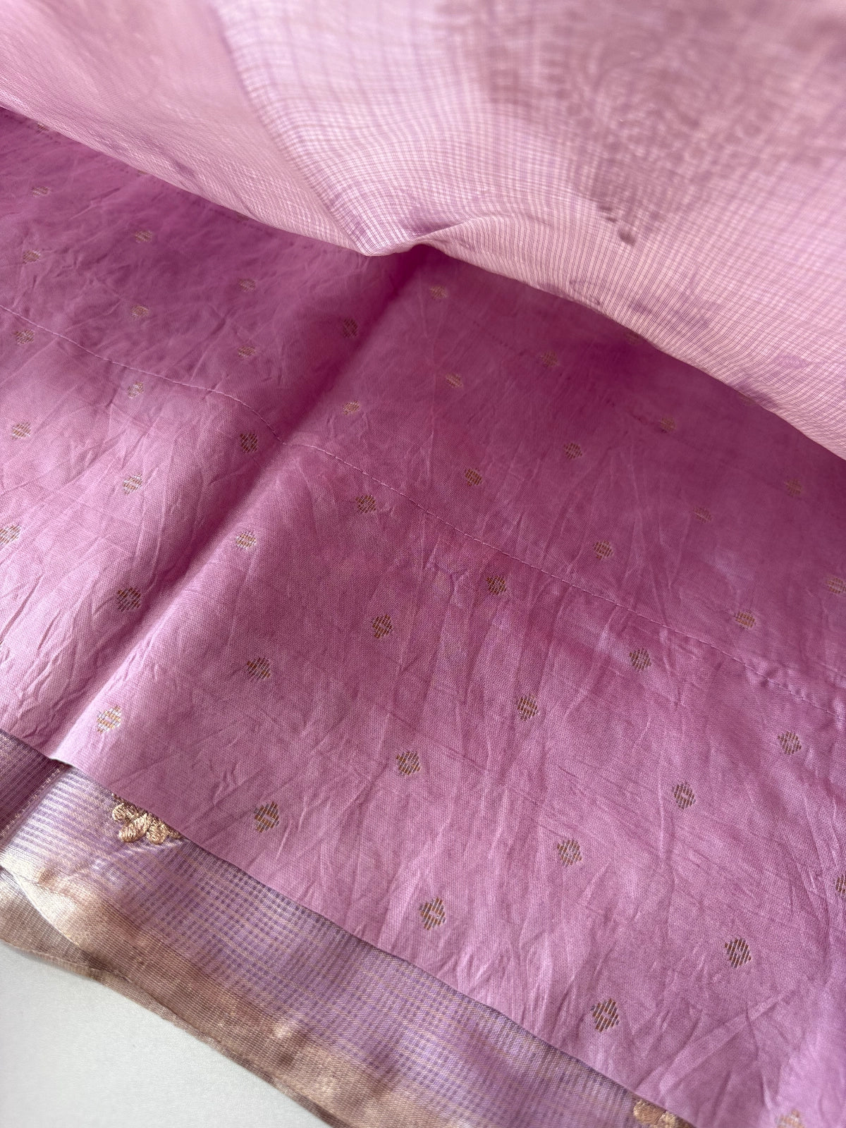 A graceful Silky Kota saree adorned with delicate threadwork across the body and intricate Geri butta motifs along the border. The saree exudes a subtle shimmer and fine craftsmanship, making it a refined choice for festive and traditional occasions. Comes with a Banarasi weaved premium Santoon blouse piece in the same tone, adding to its luxurious appeal. Lightweight, breathable, and effortlessly elegant — perfect for celebrations and special gatherings.