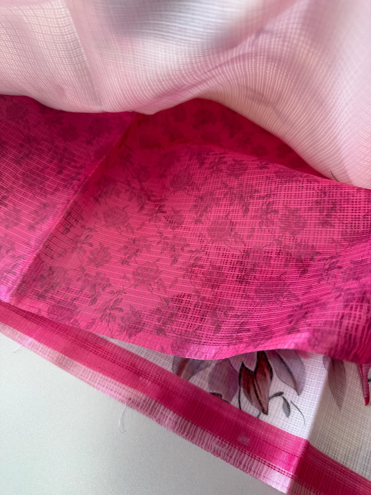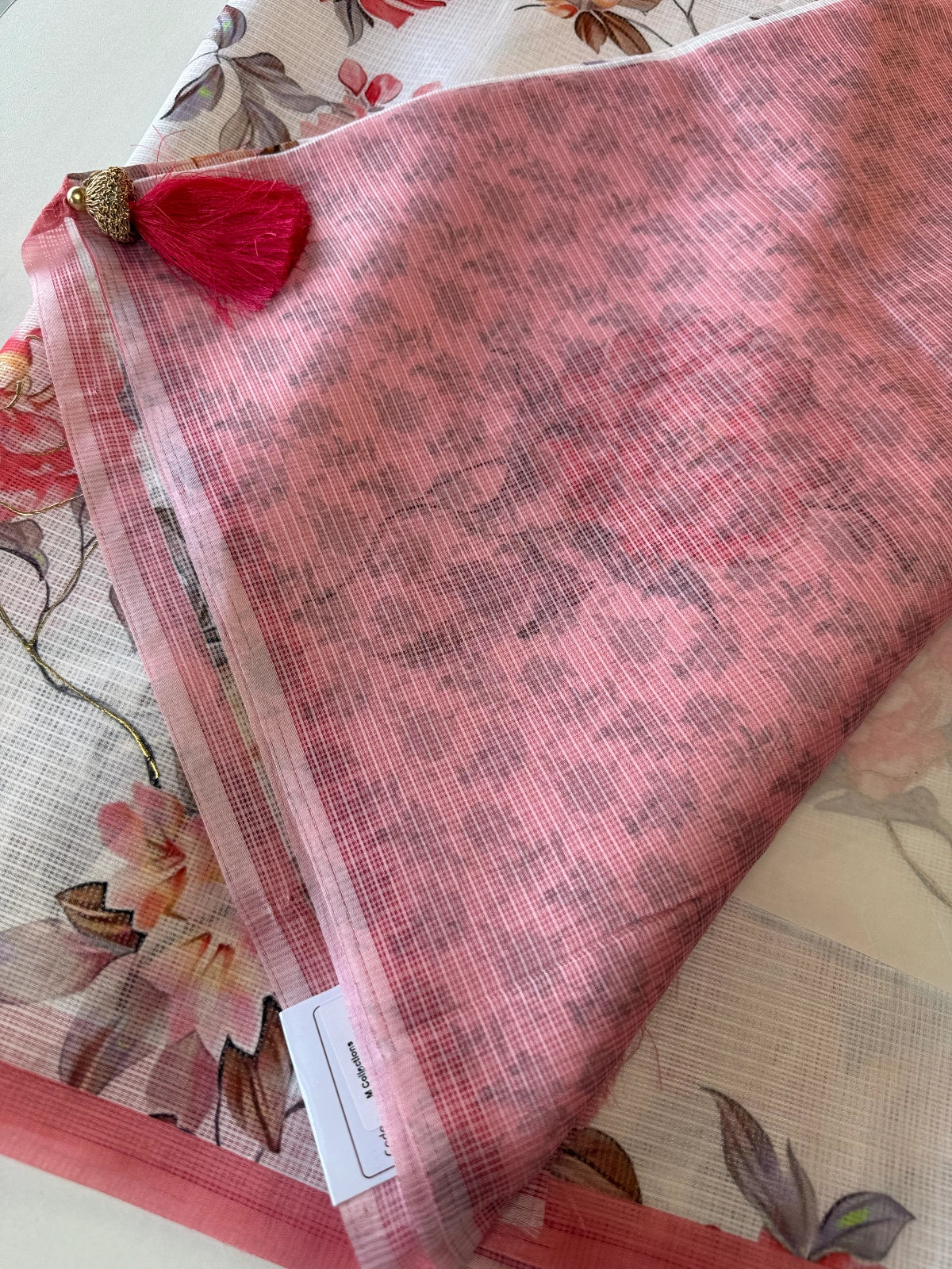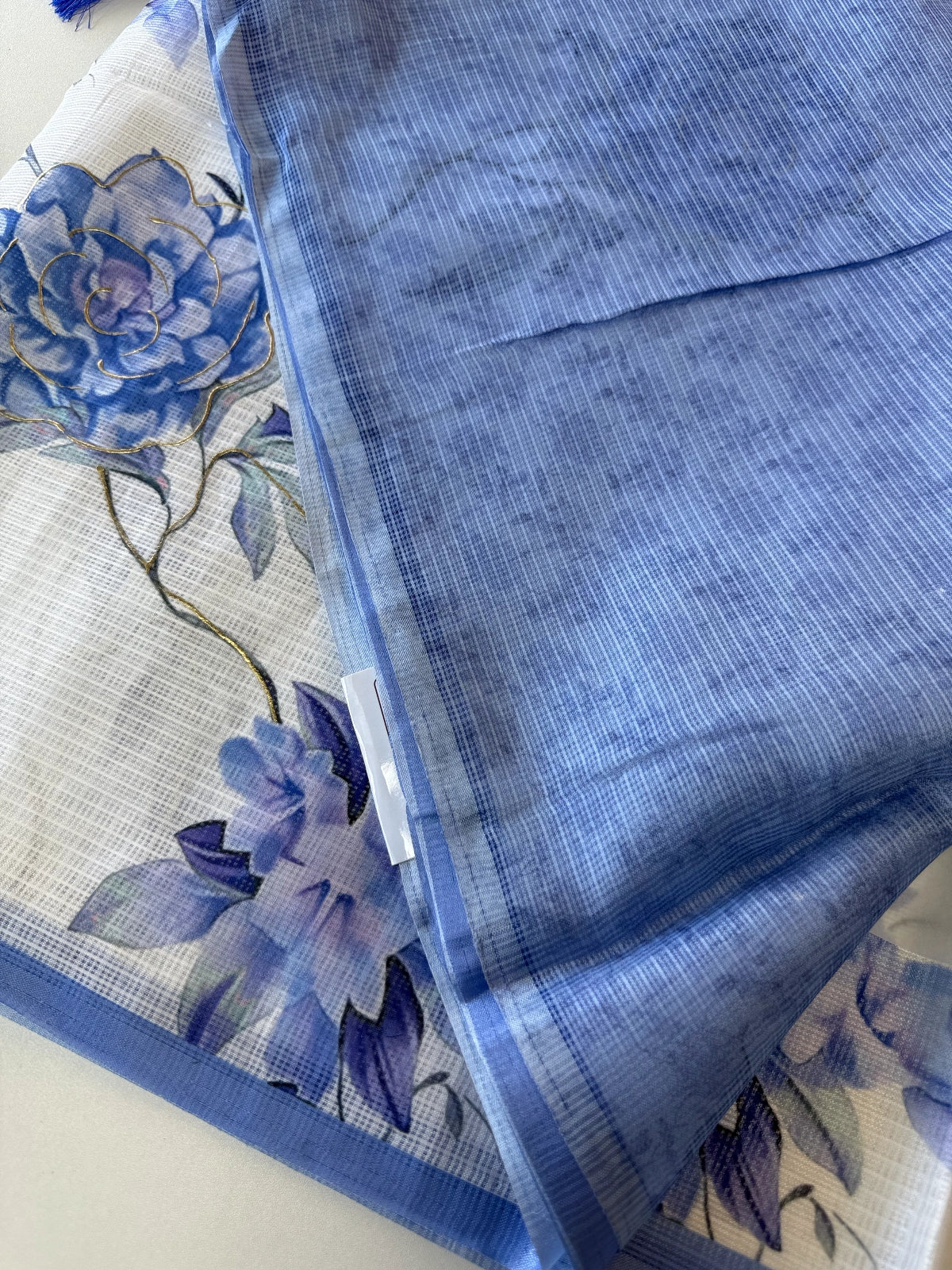 silky kotta saree with screen print comes with running contrast running blouse piece. Feather light .