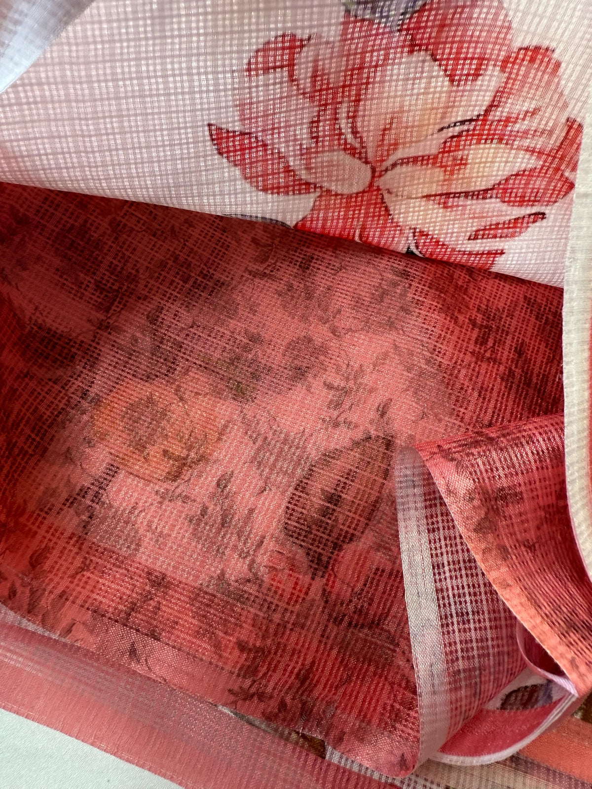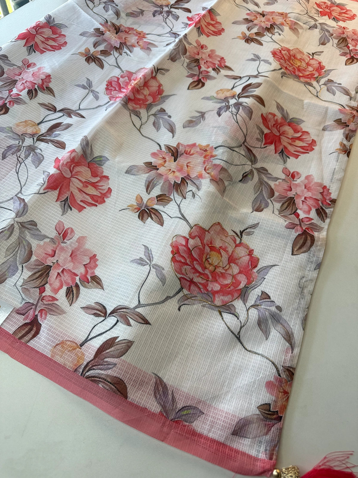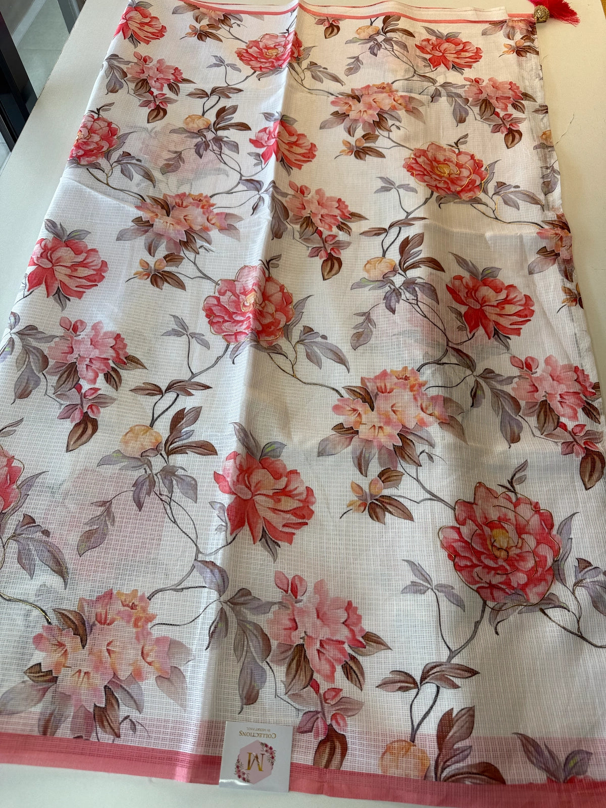 silky kotta saree with screen print comes with running contrast running blouse piece. Feather light .