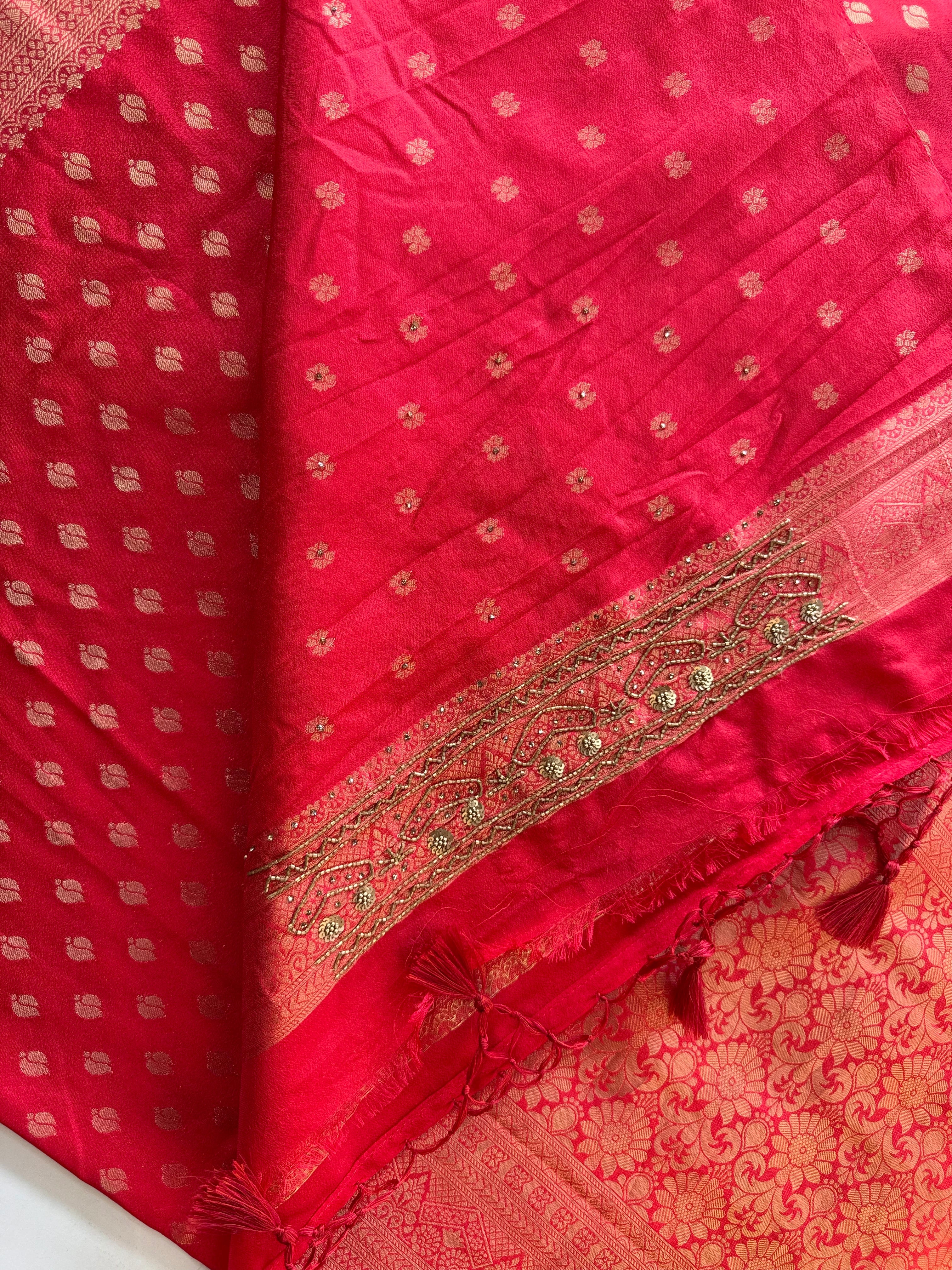 Elegant Georgette Banarasi saree featuring intricate silver zari weaving with delicate tassel edging that adds a touch of luxury. The saree comes with a running blouse piece beautifully enhanced with handwork detailing on the sleeves and neckline, blending traditional craftsmanship with contemporary grace. Perfect for wedding functions, festive wear, and party occasions, this saree captures timeless Banarasi charm in a lightweight georgette drape .