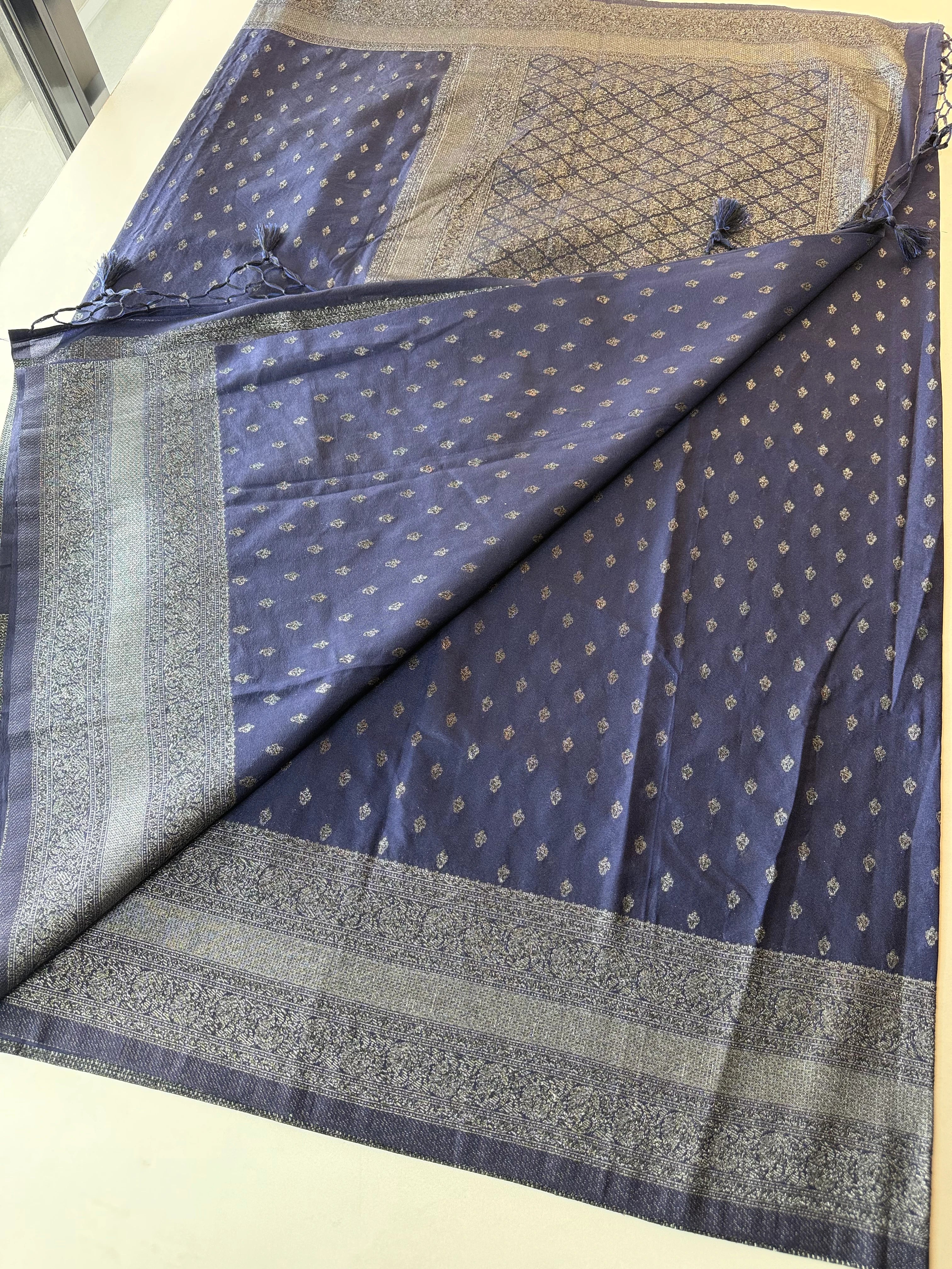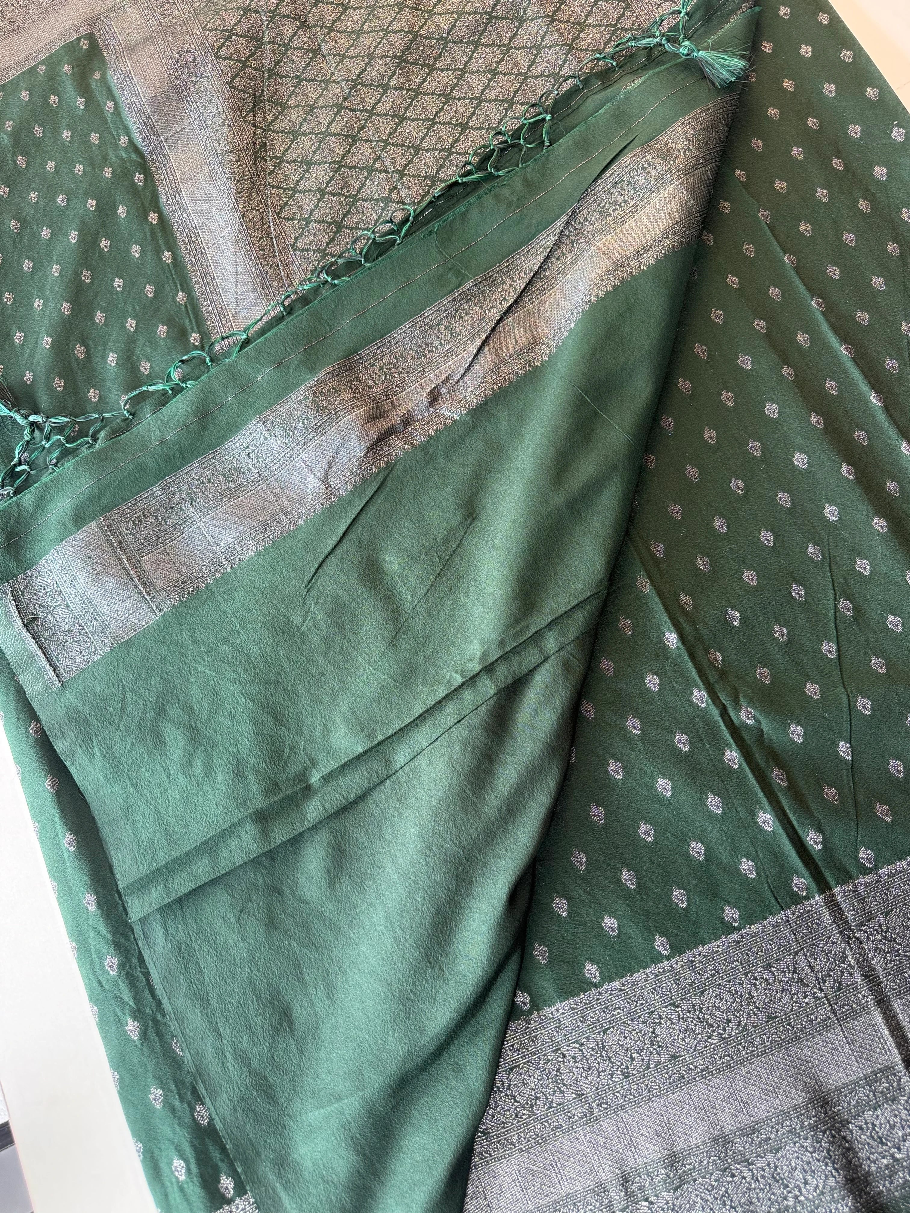 Beautiful Georgette Banarasi saree woven with rich silver zari detailing that adds a graceful shimmer to every fold. The saree comes with a matching running blouse piece, maintaining the same elegant weave. Lightweight and flowy, this Banarasi georgette saree is perfect for festive and traditional occasions, combining timeless Banarasi craftsmanship with soft georgette comfort.