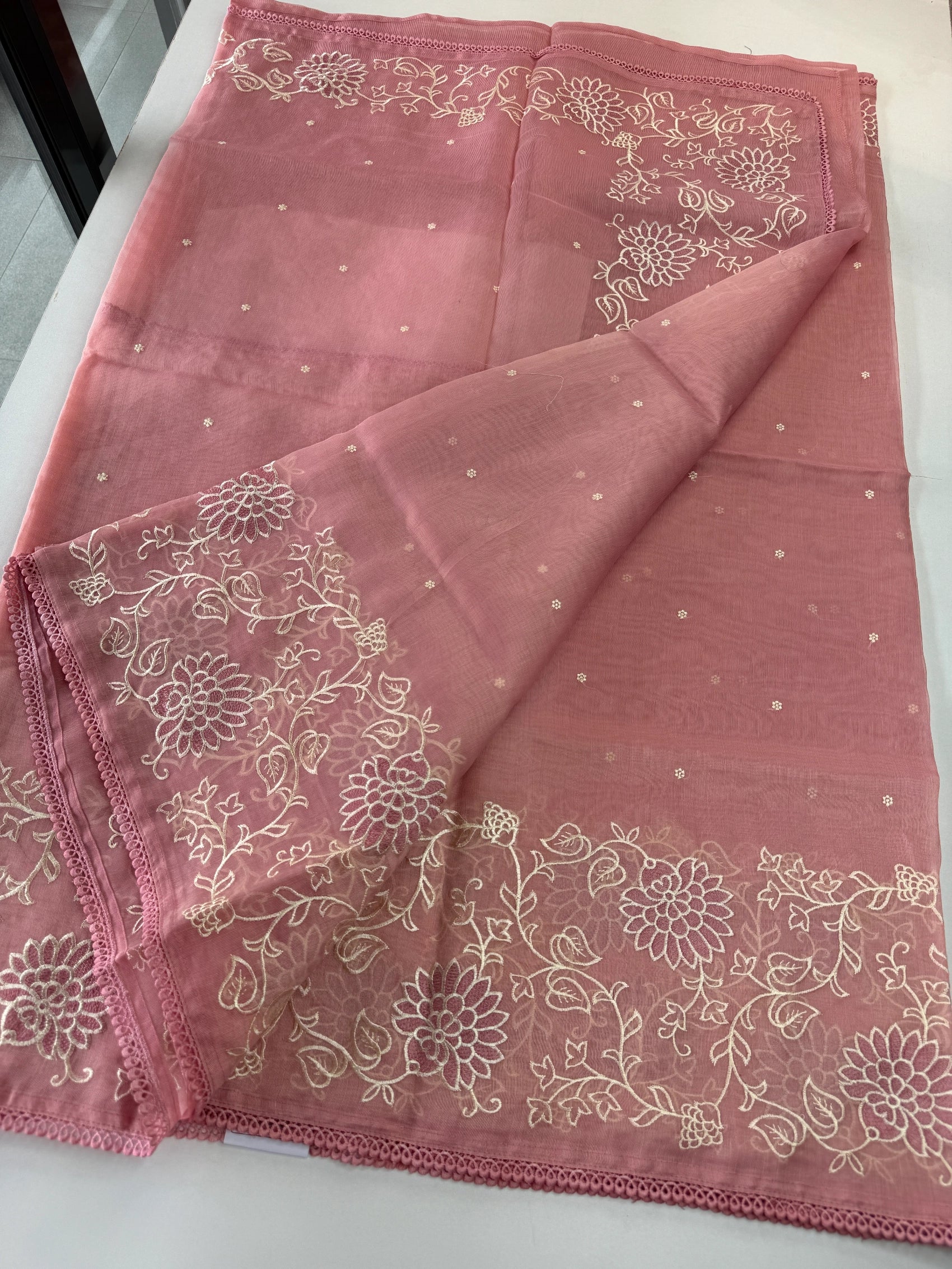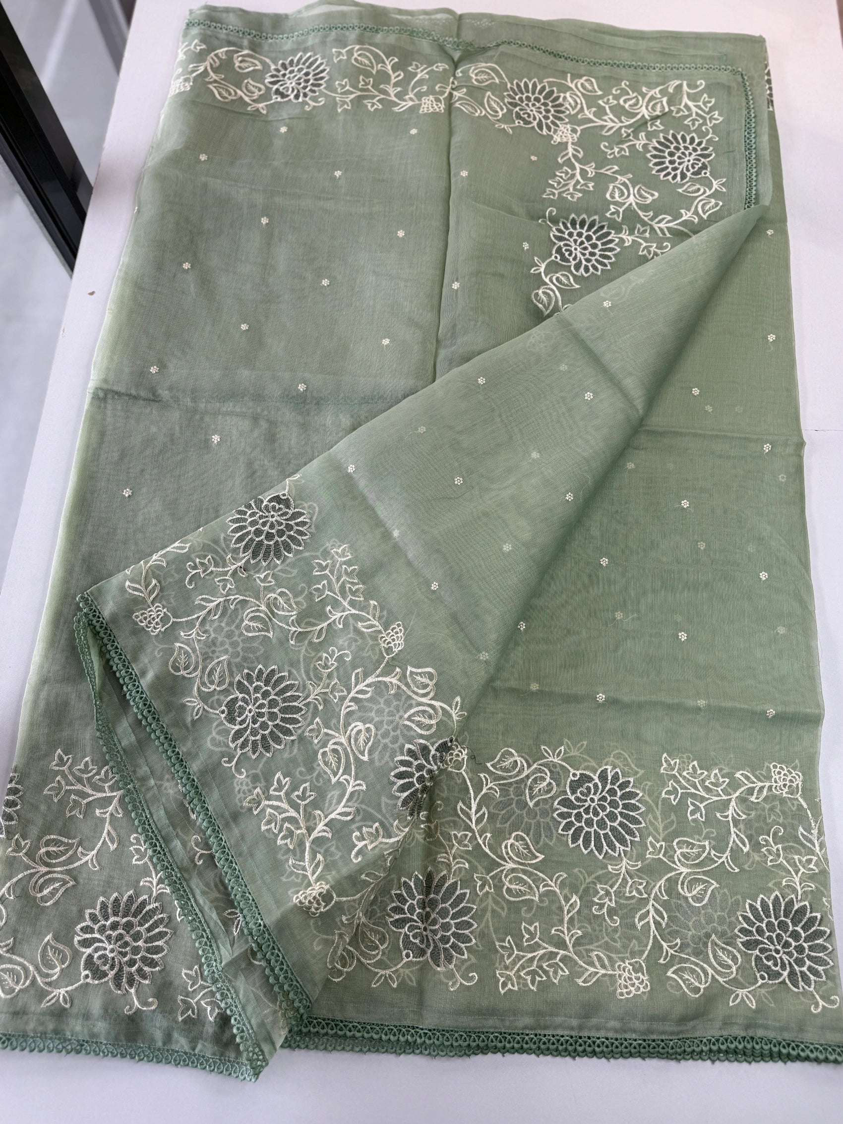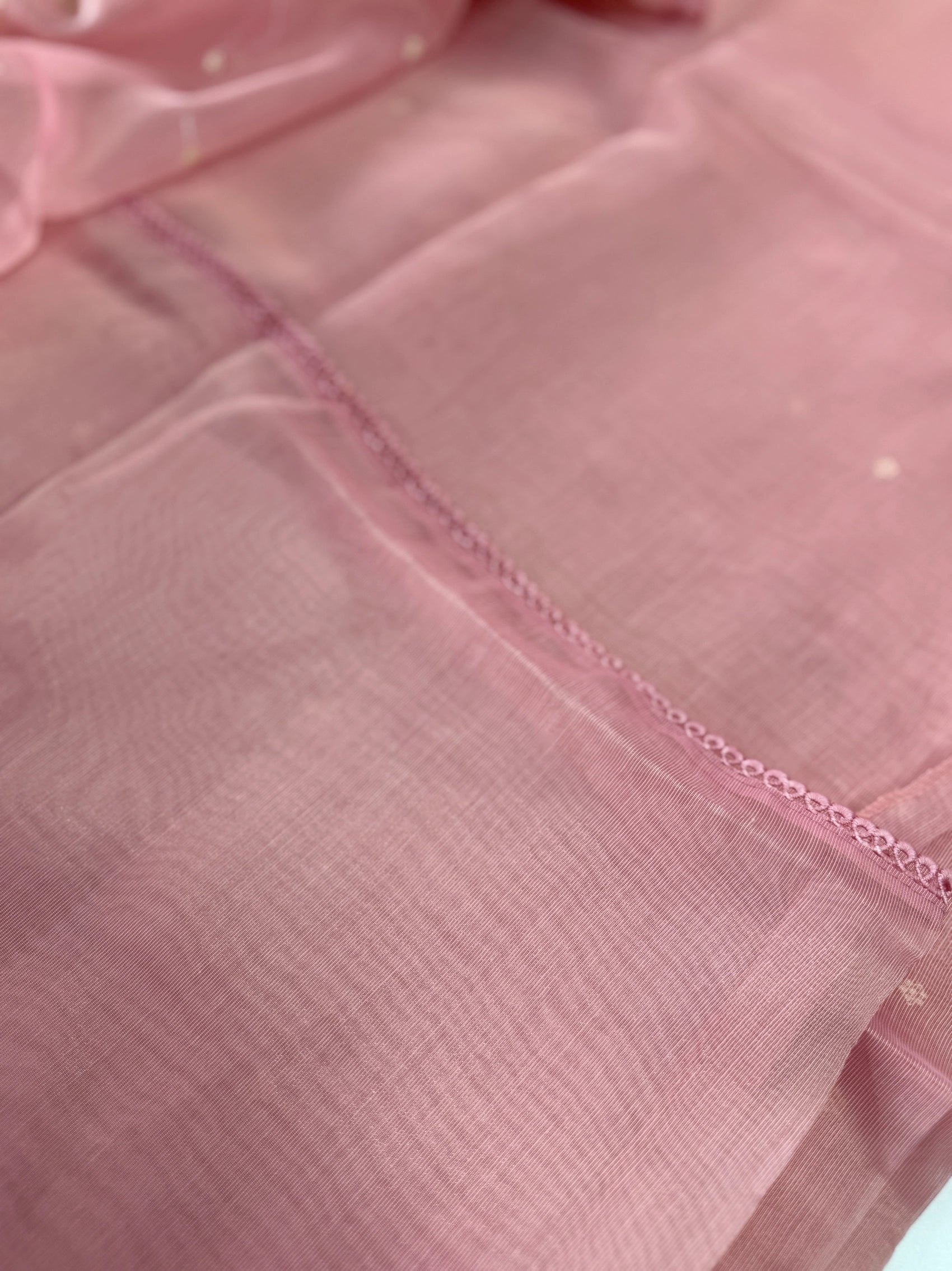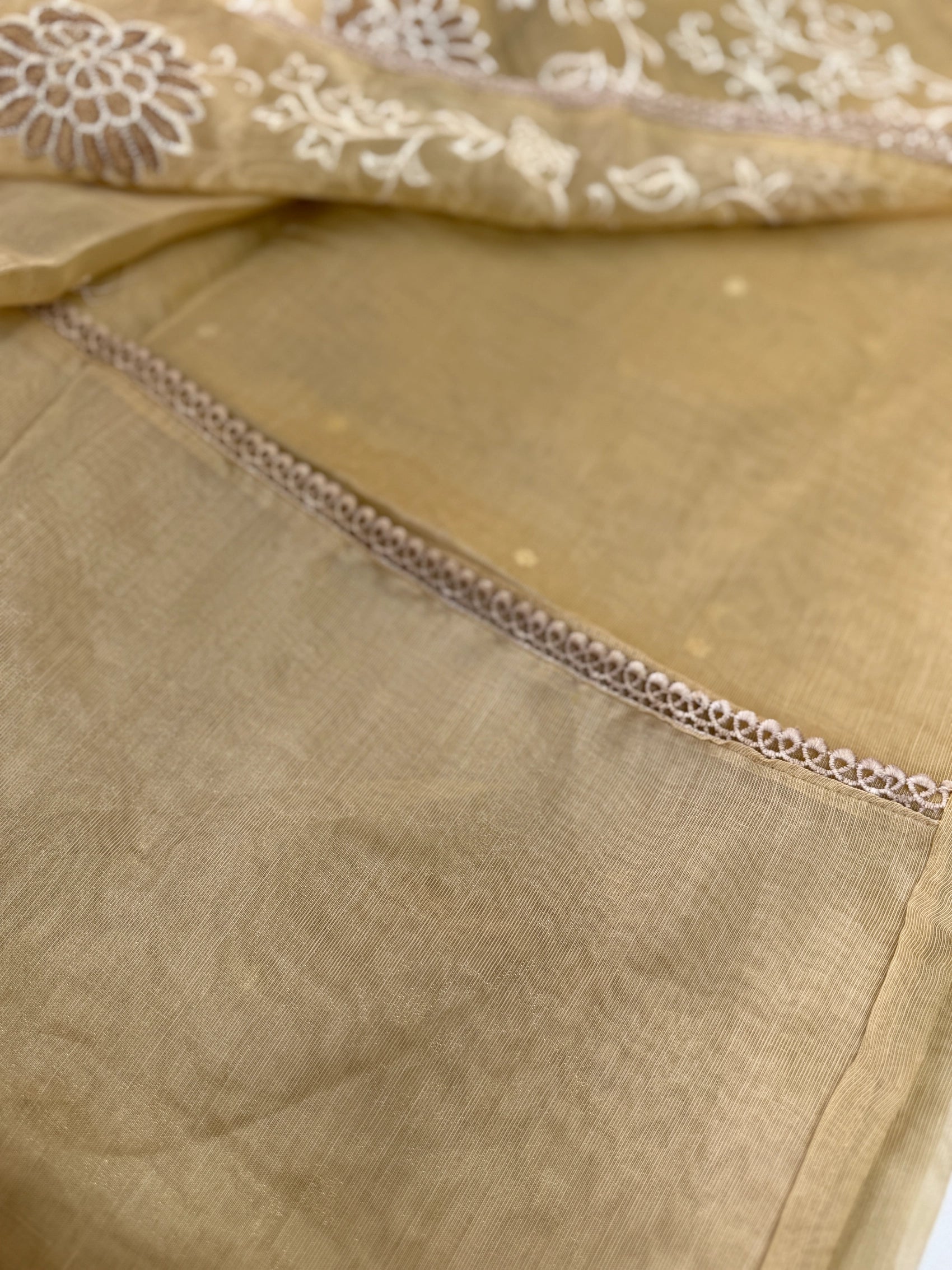 Chanderi Tissue Saree featuring a fully thread-worked floral border, soft butta detailing on the body, and a matching running blouse piece with sleeve-end embroidery. Lightweight, graceful, and perfect for any occasion.