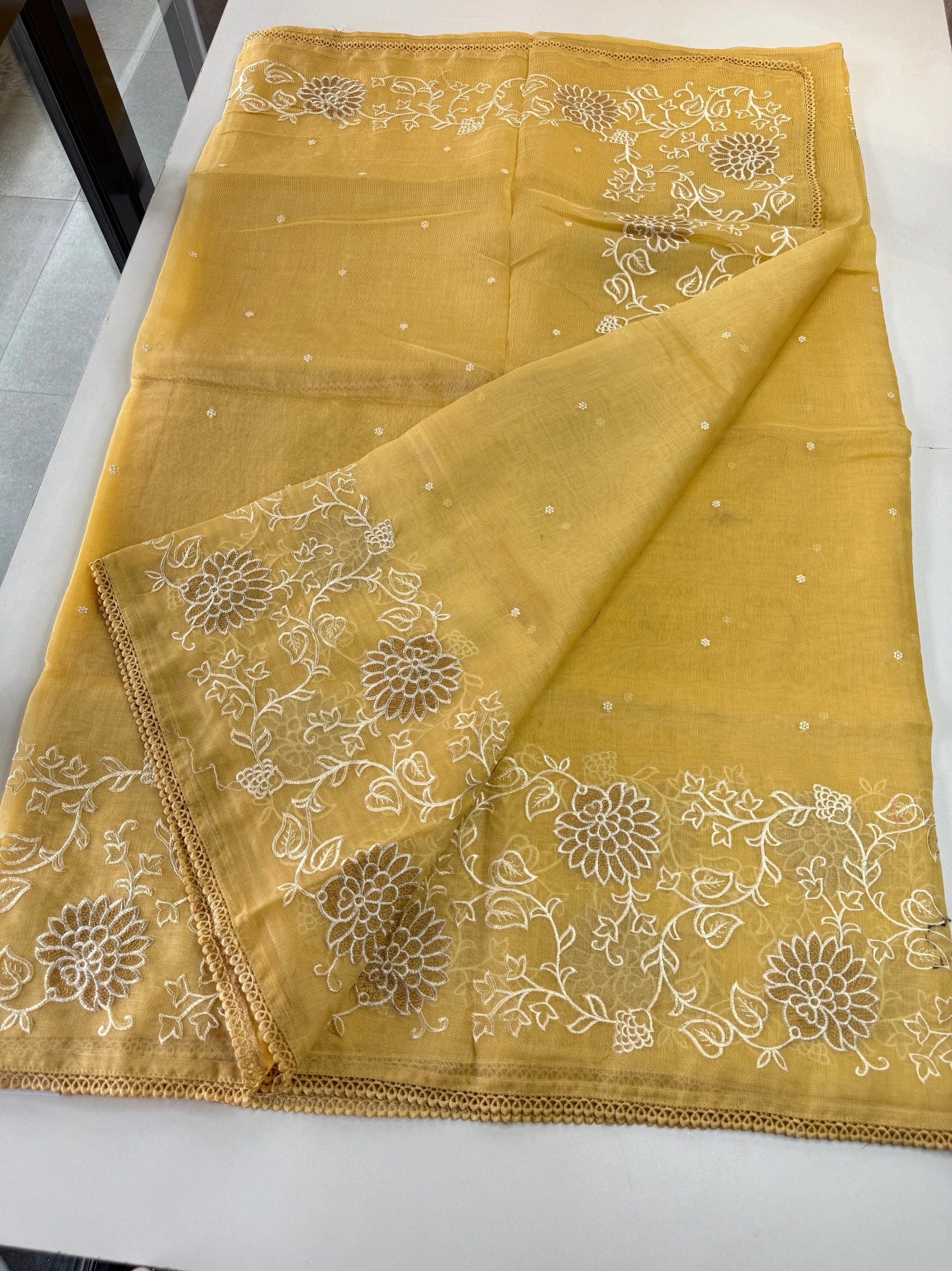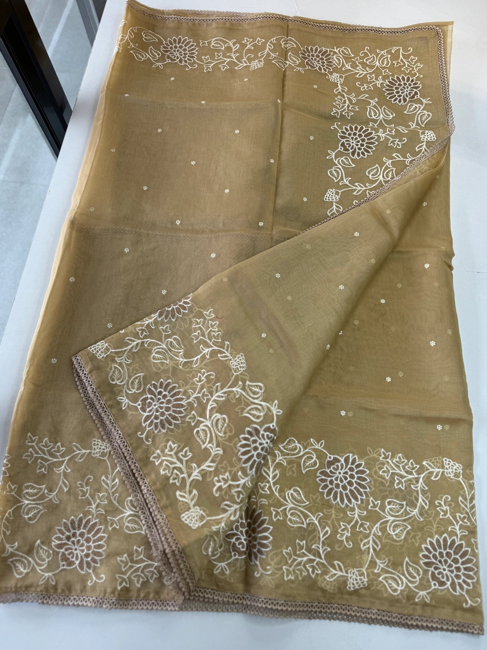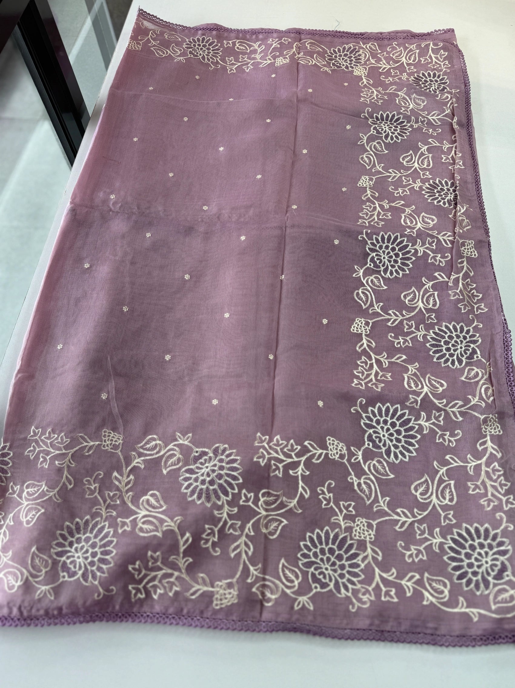 Chanderi Tissue Saree featuring a fully thread-worked floral border, soft butta detailing on the body, and a matching running blouse piece with sleeve-end embroidery. Lightweight, graceful, and perfect for any occasion.