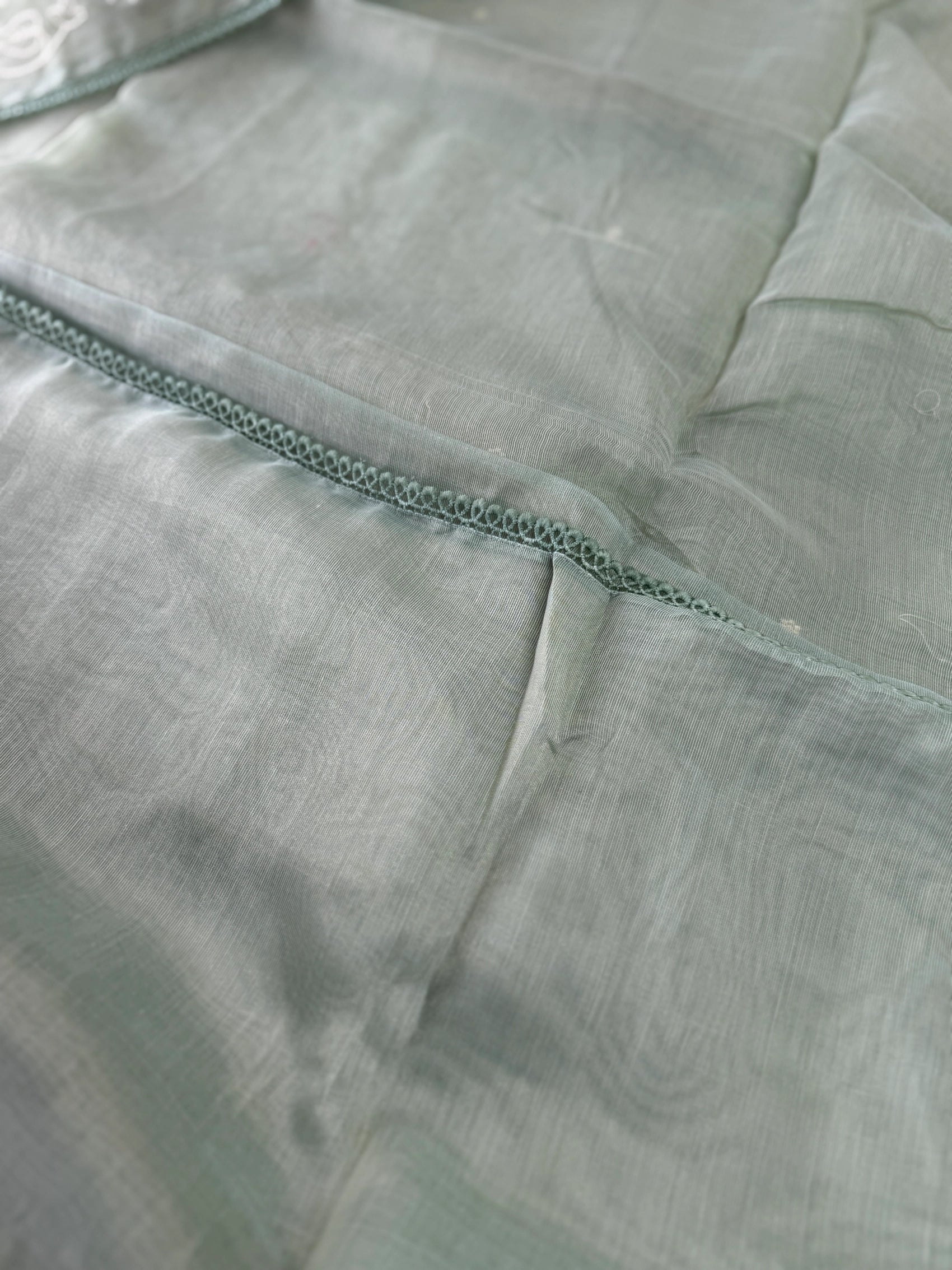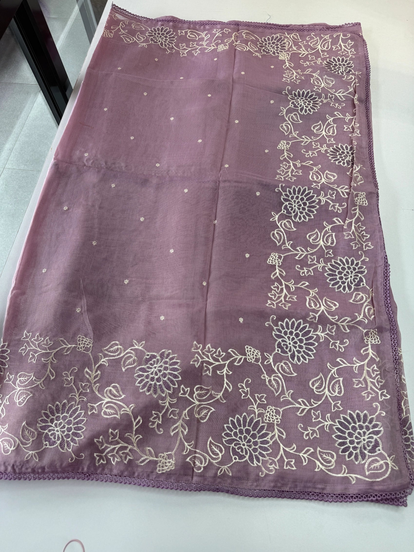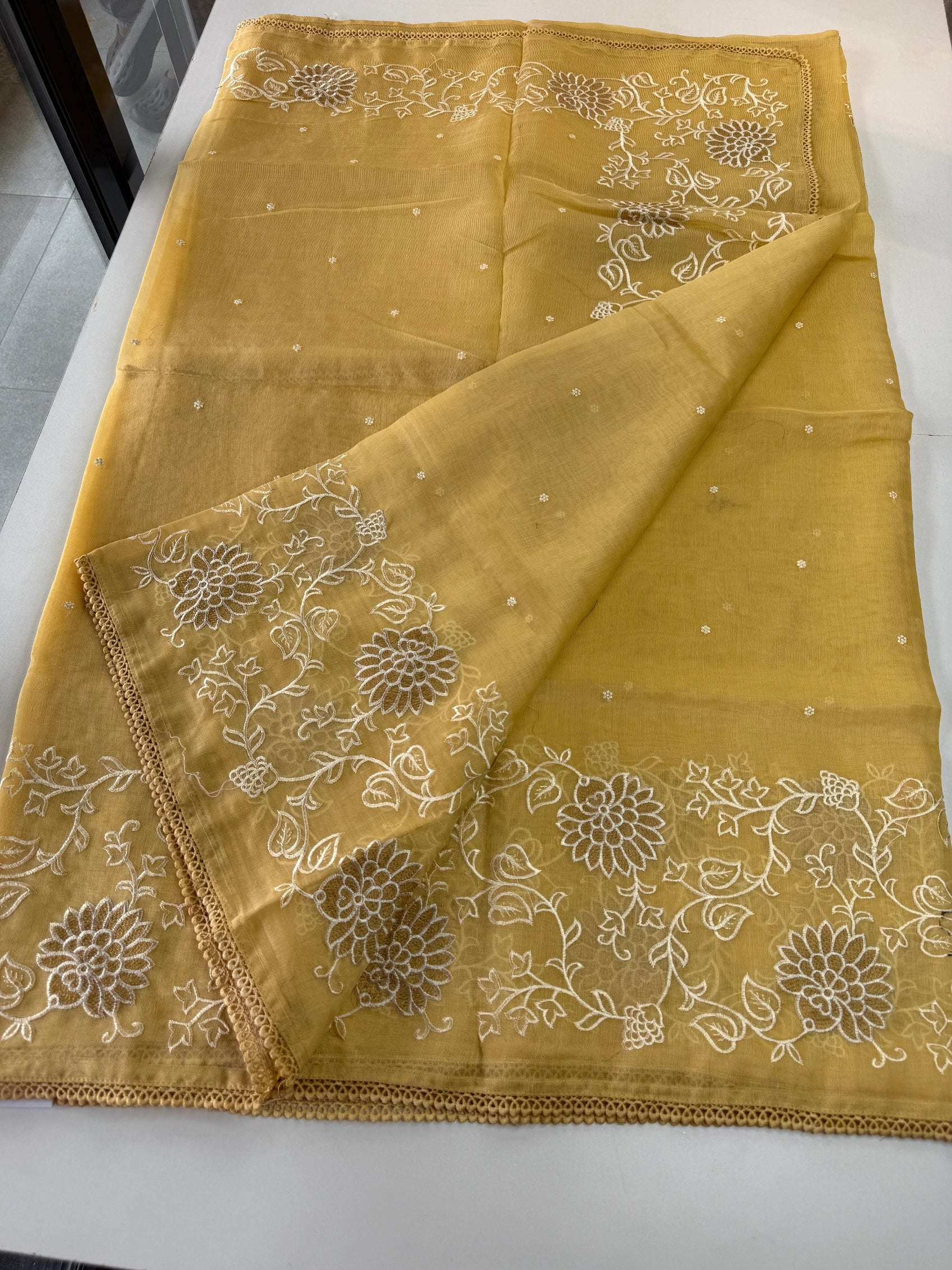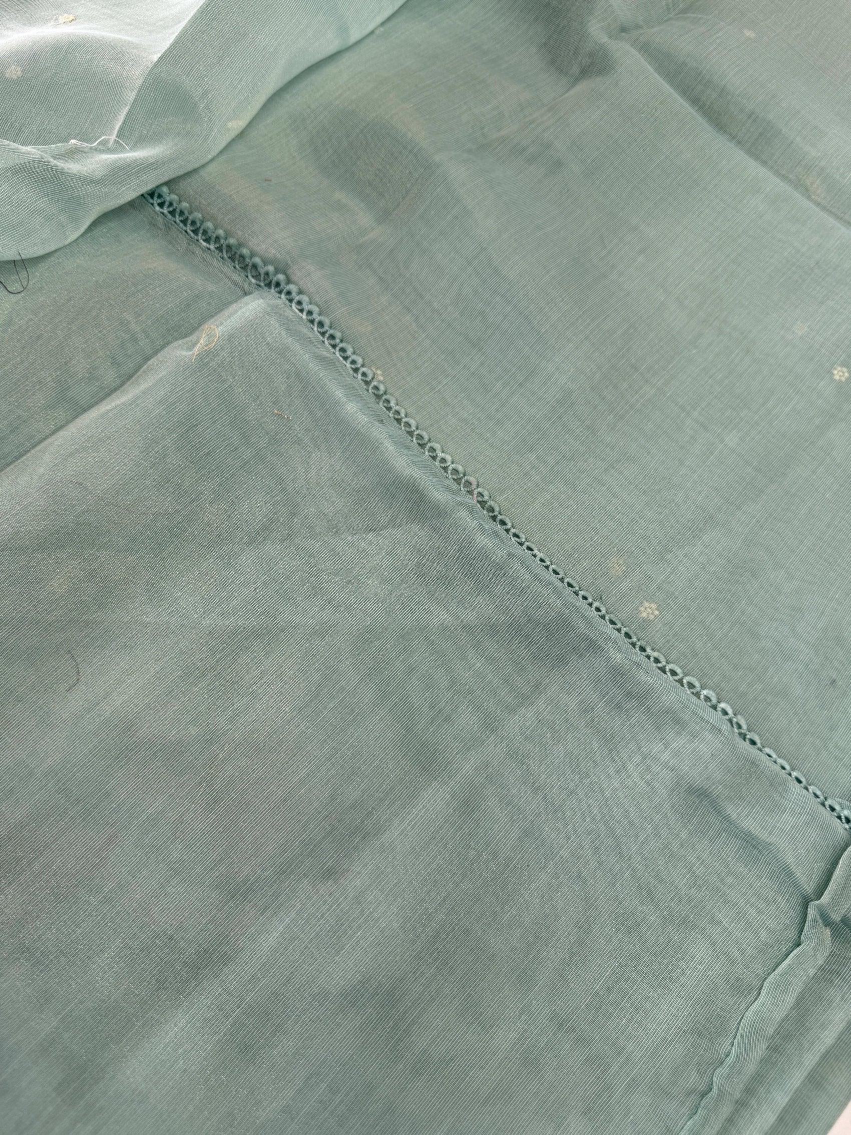 Chanderi Tissue Saree featuring a fully thread-worked floral border, soft butta detailing on the body, and a matching running blouse piece with sleeve-end embroidery. Lightweight, graceful, and perfect for any occasion.