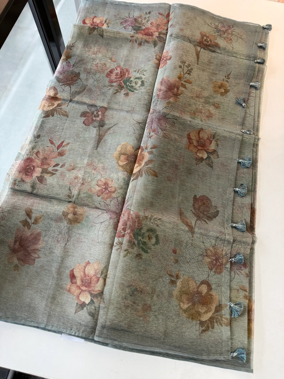 A stunning tissue feather-light crushed saree featuring a soft printed design that blends elegance with comfort. The lightweight crushed texture offers a graceful drape, making it perfect for festive occasions or casual gatherings.