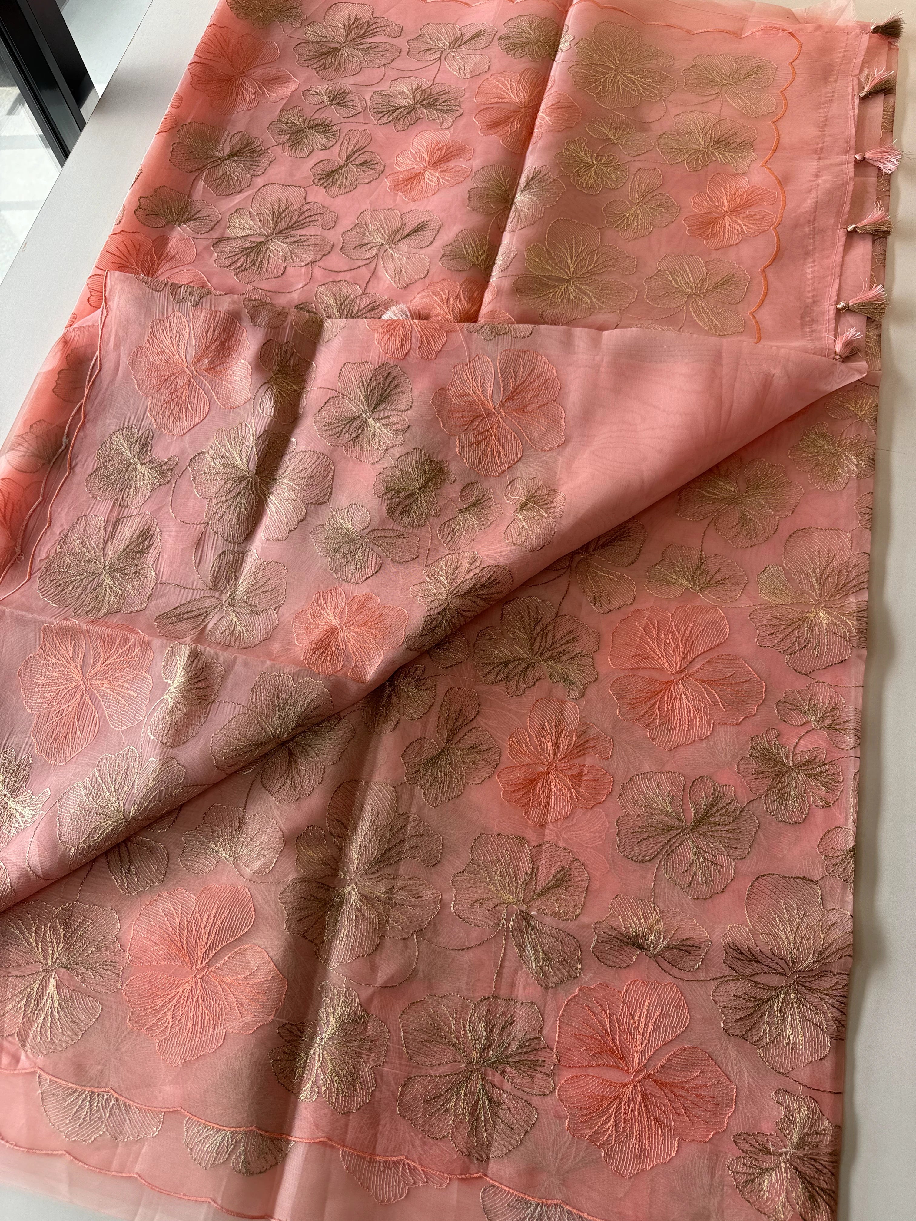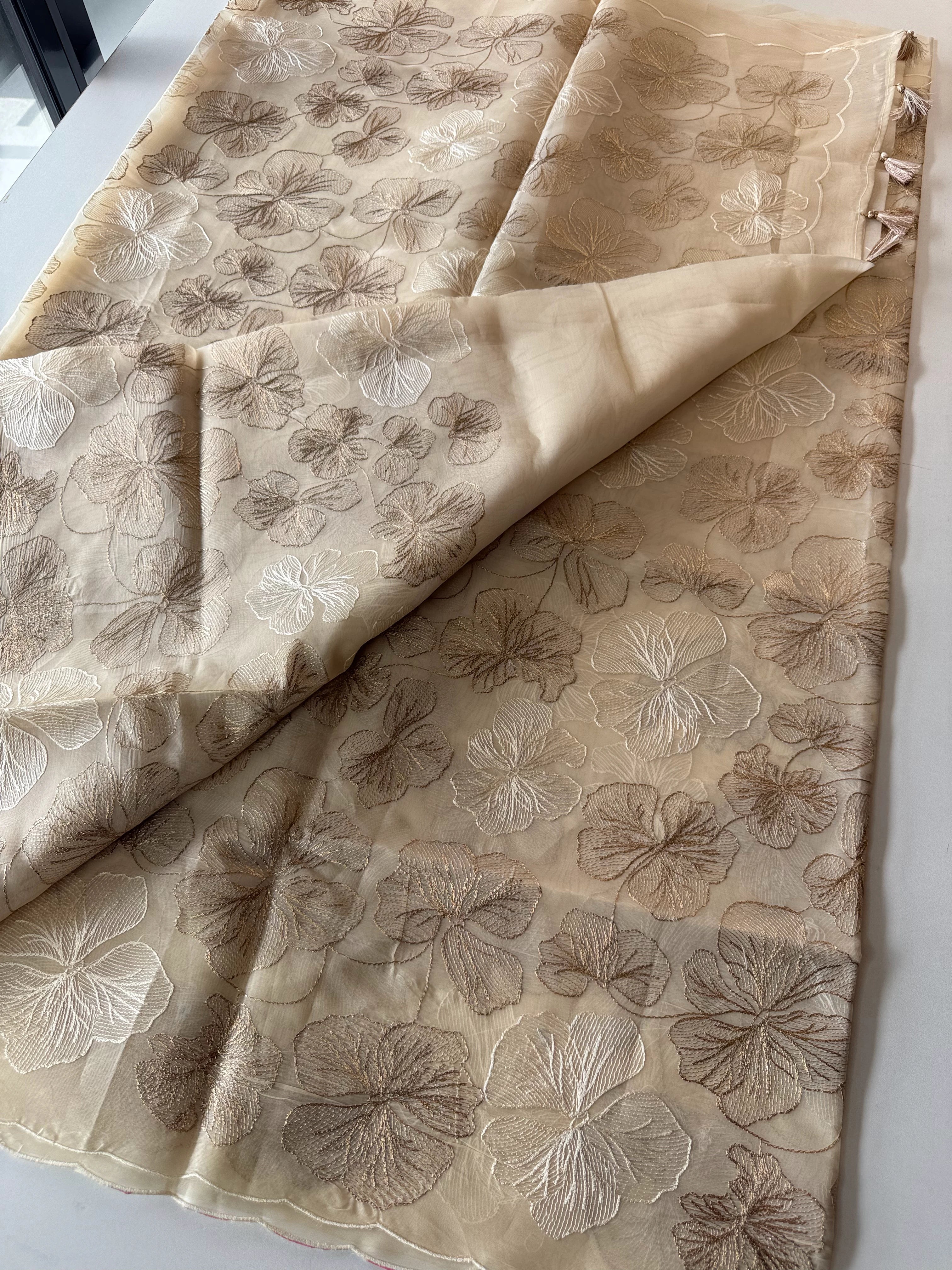 Organza Saree – This elegant drape features a scalloped border edging, with the body adorned in golden geri highlights and tone-on-tone threadwork in delicate floral patterns throughout. The fabric is slightly transparent with a moderate stiffness, giving it both structure and grace. The matching blouse carries a smaller floral pattern, completing the look with subtle sophistication.