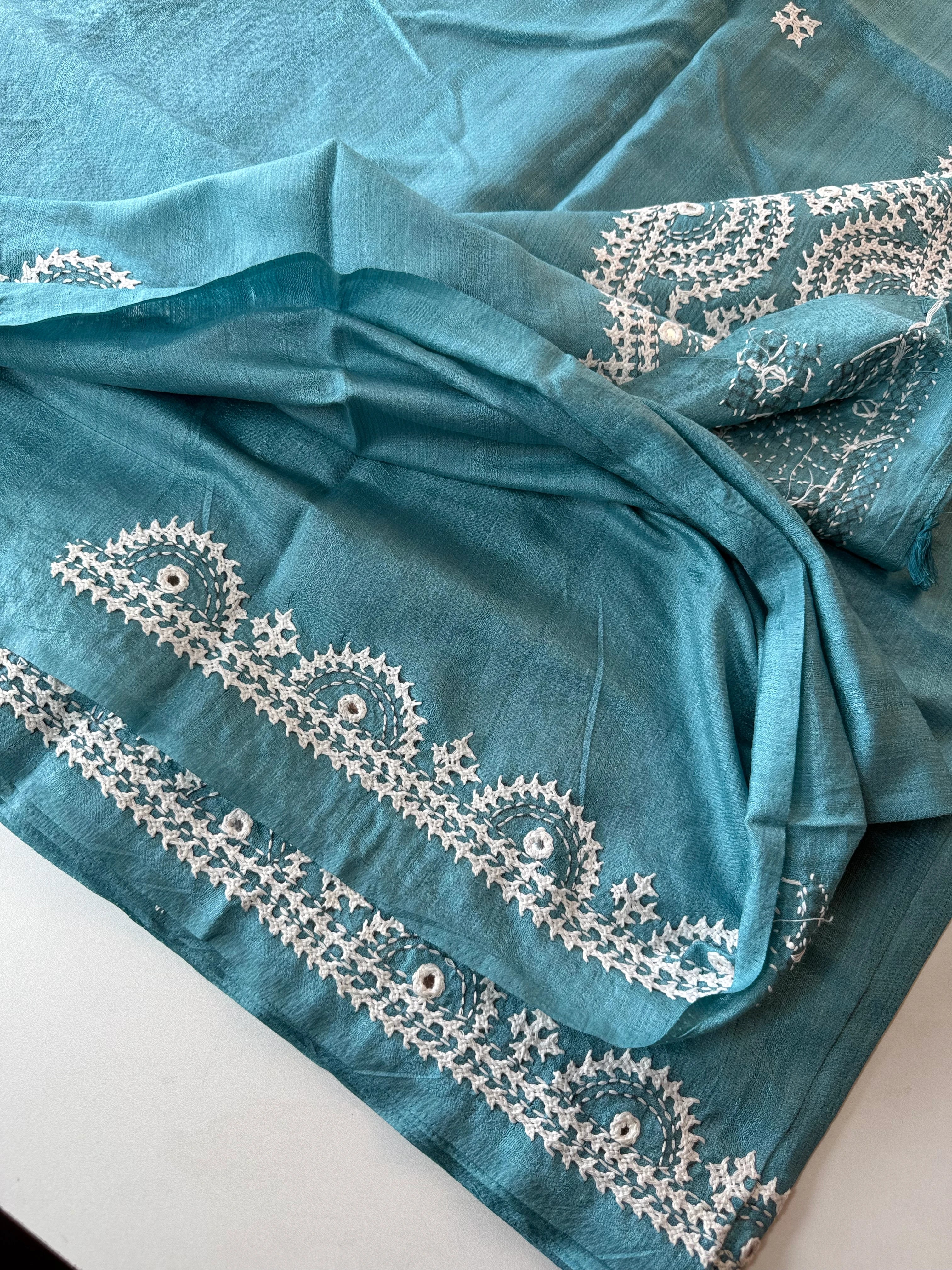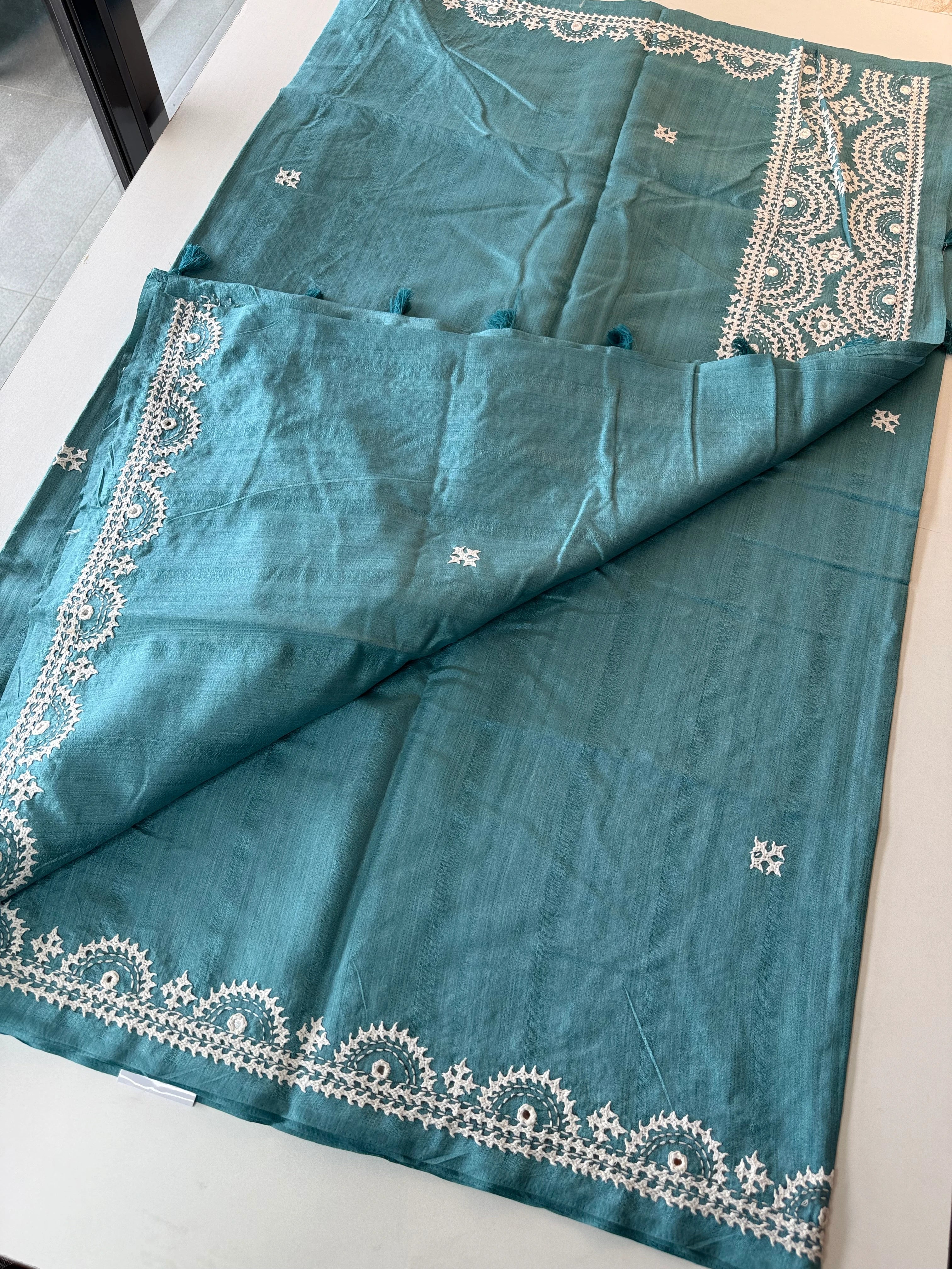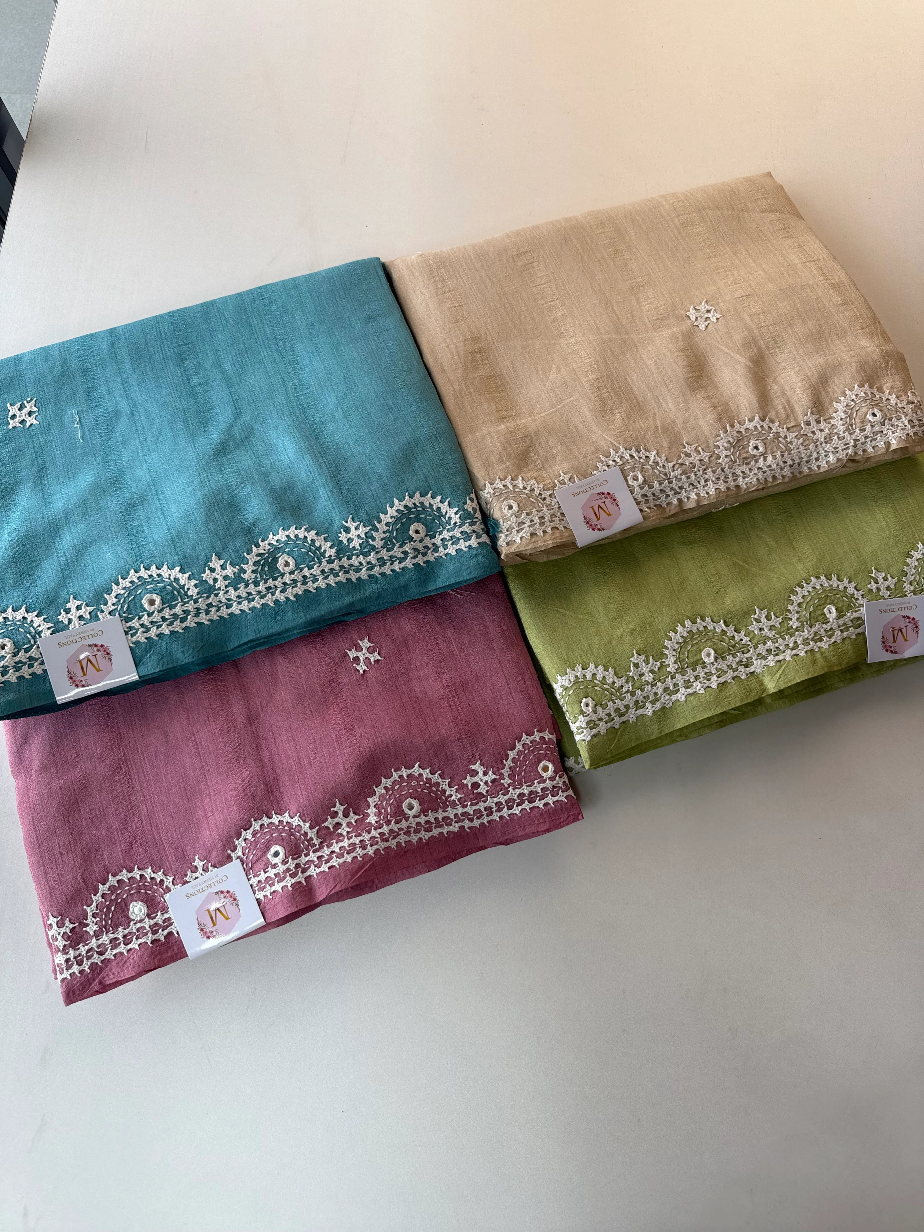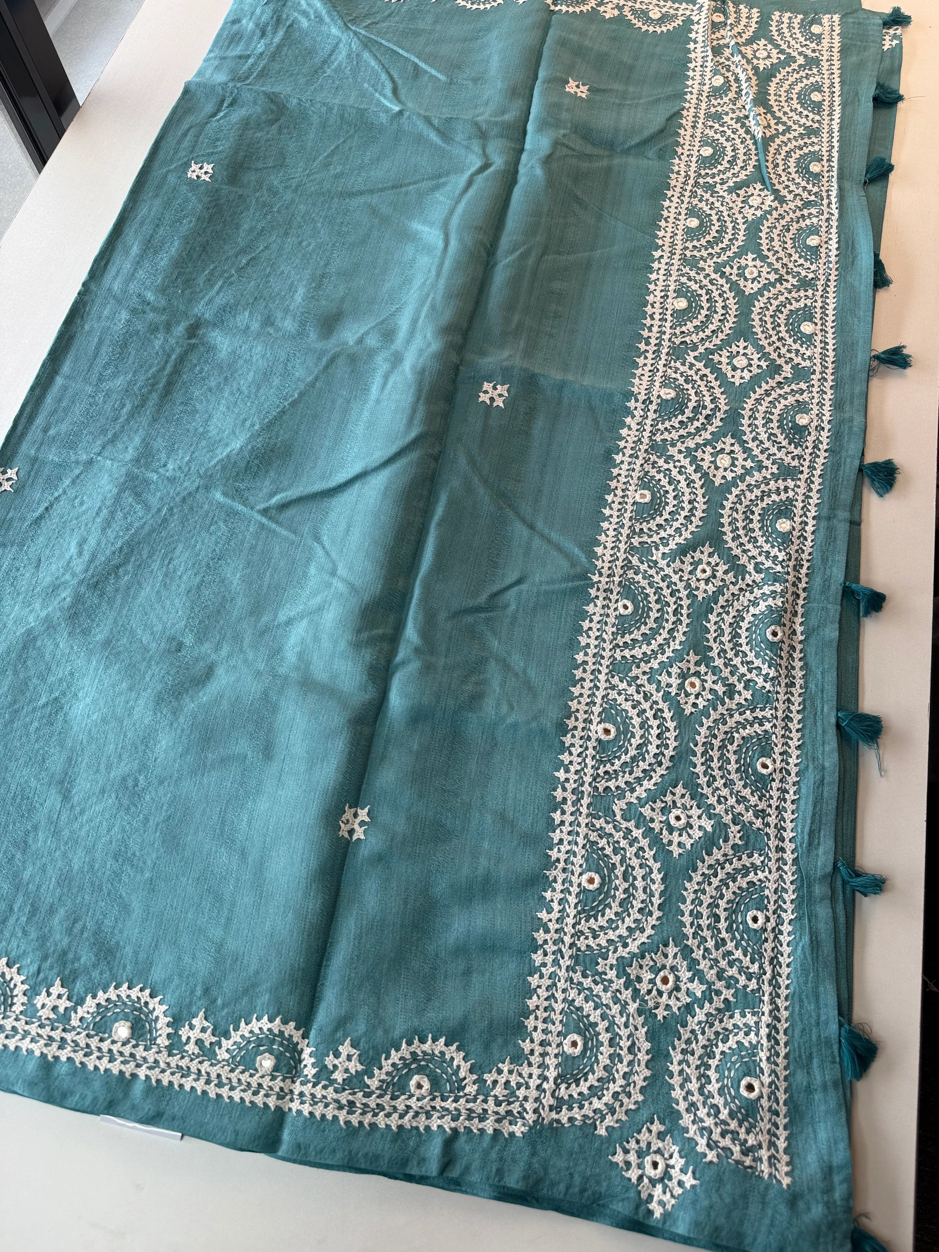 Elegant semi tussar saree featuring intricate thread embroidery with subtle mirror highlights along the border and pallu. The saree comes with a matching blouse piece, detailed with the same embroidery on the sleeve ends. Lightweight, graceful, and refined — perfect for festive and sophisticated occasions.