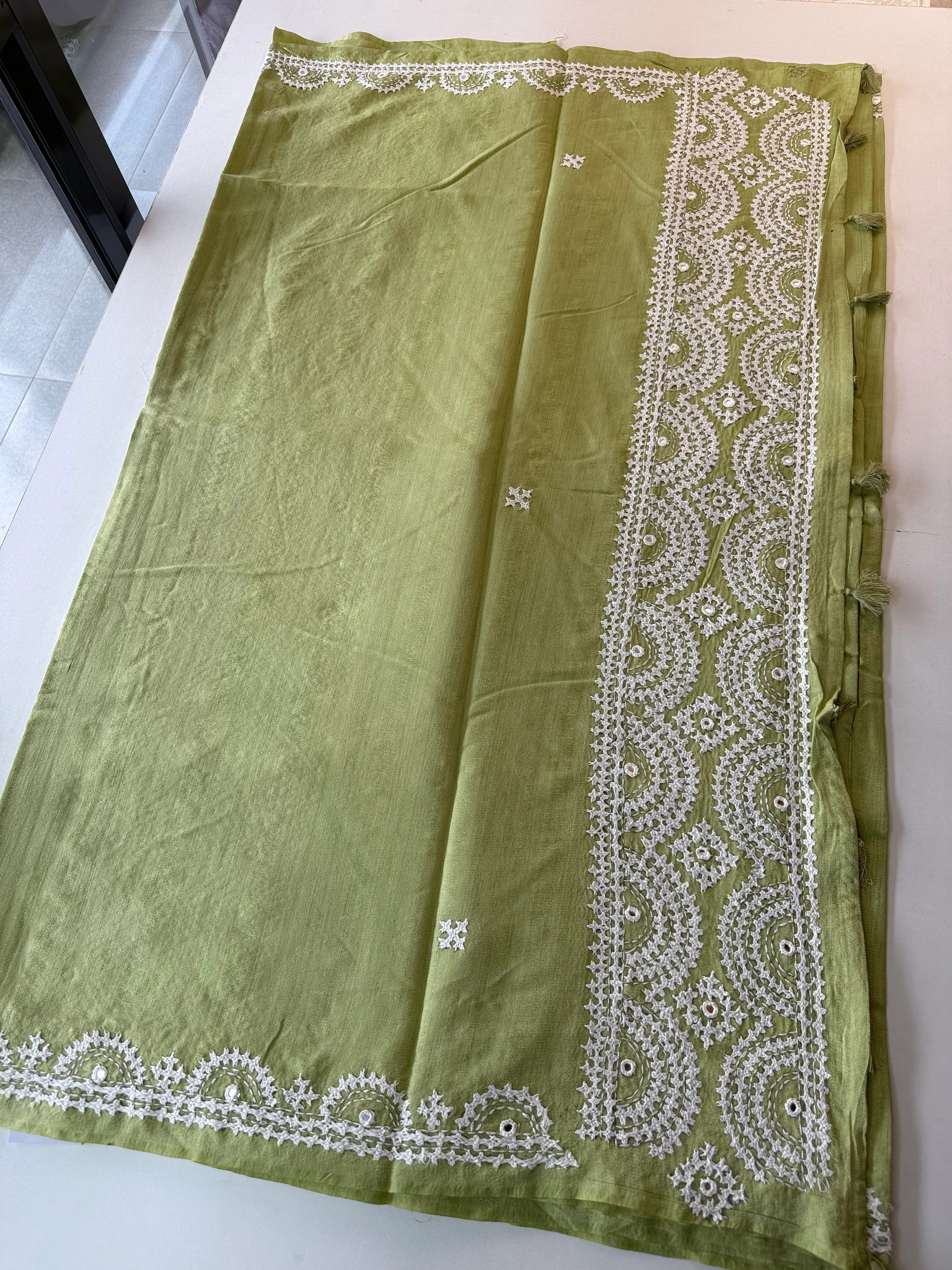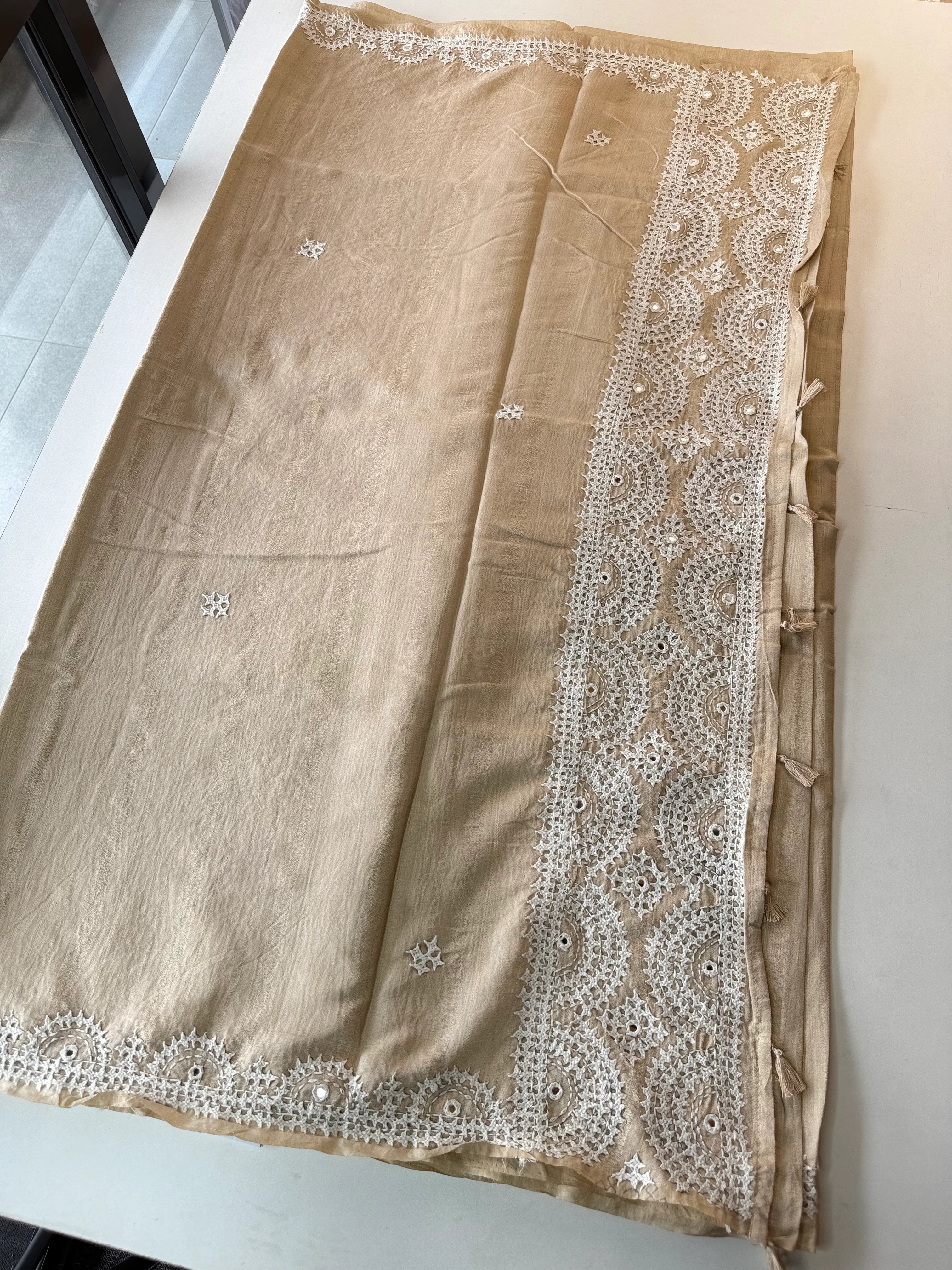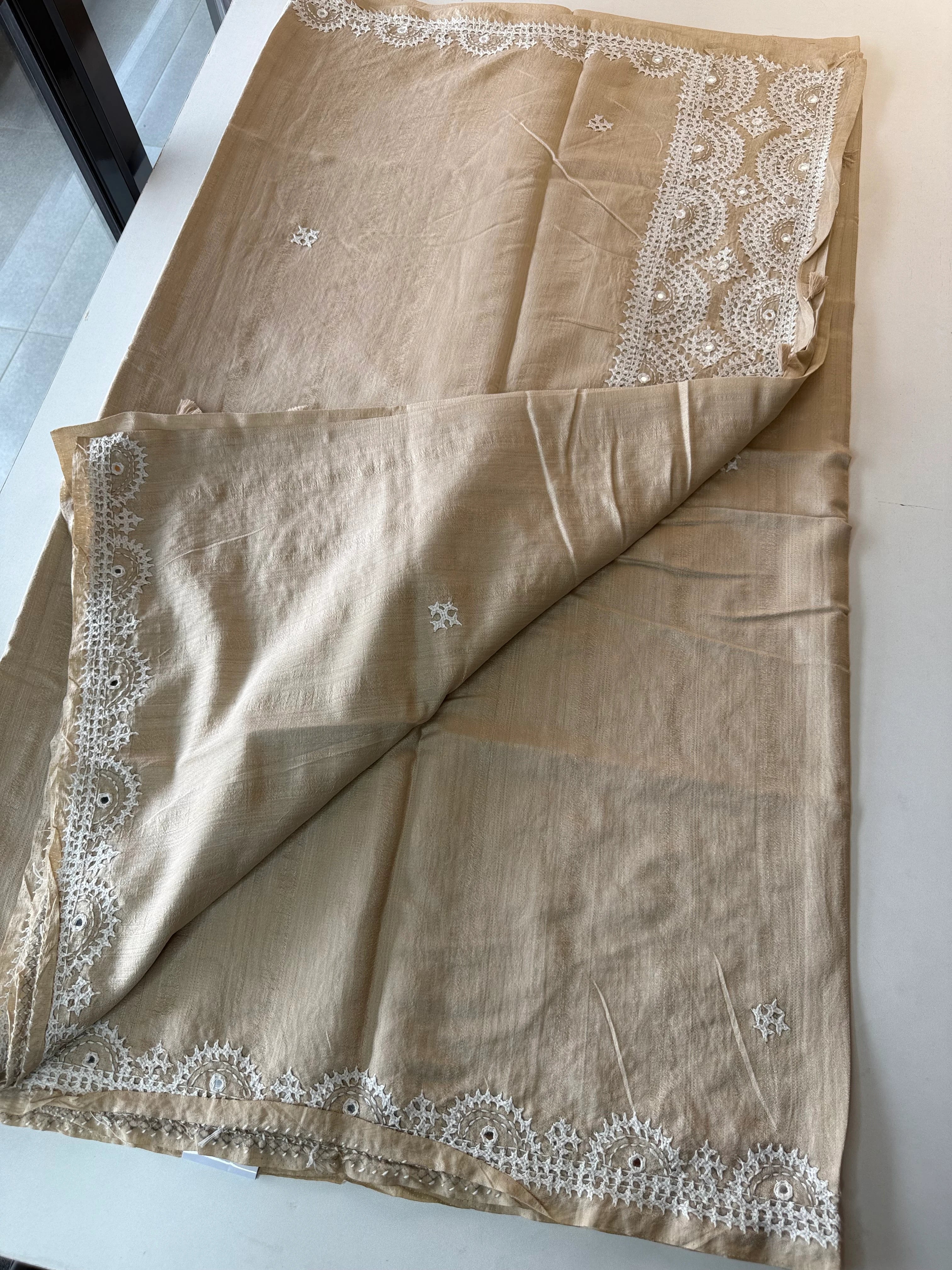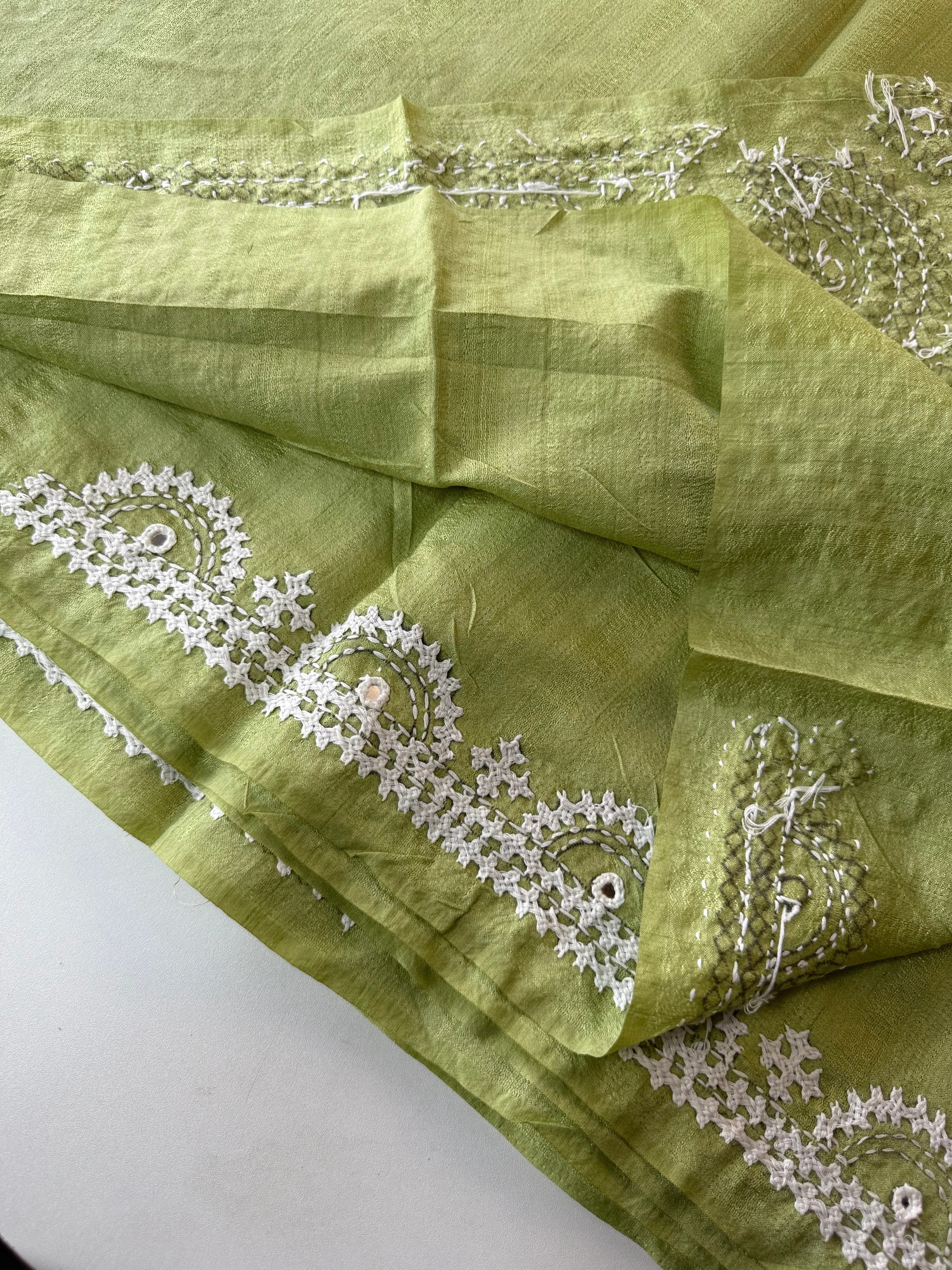 Elegant semi tussar saree featuring intricate thread embroidery with subtle mirror highlights along the border and pallu. The saree comes with a matching blouse piece, detailed with the same embroidery on the sleeve ends. Lightweight, graceful, and refined — perfect for festive and sophisticated occasions.
