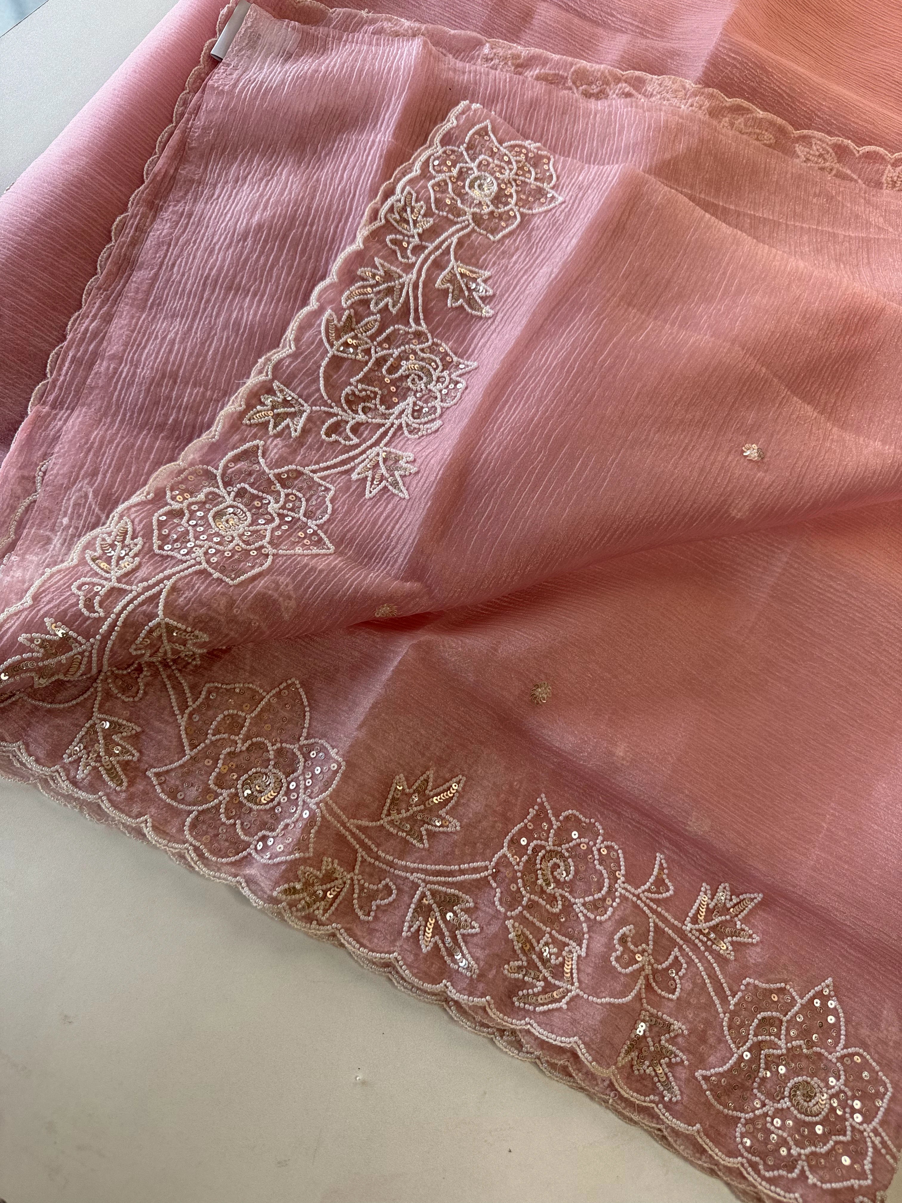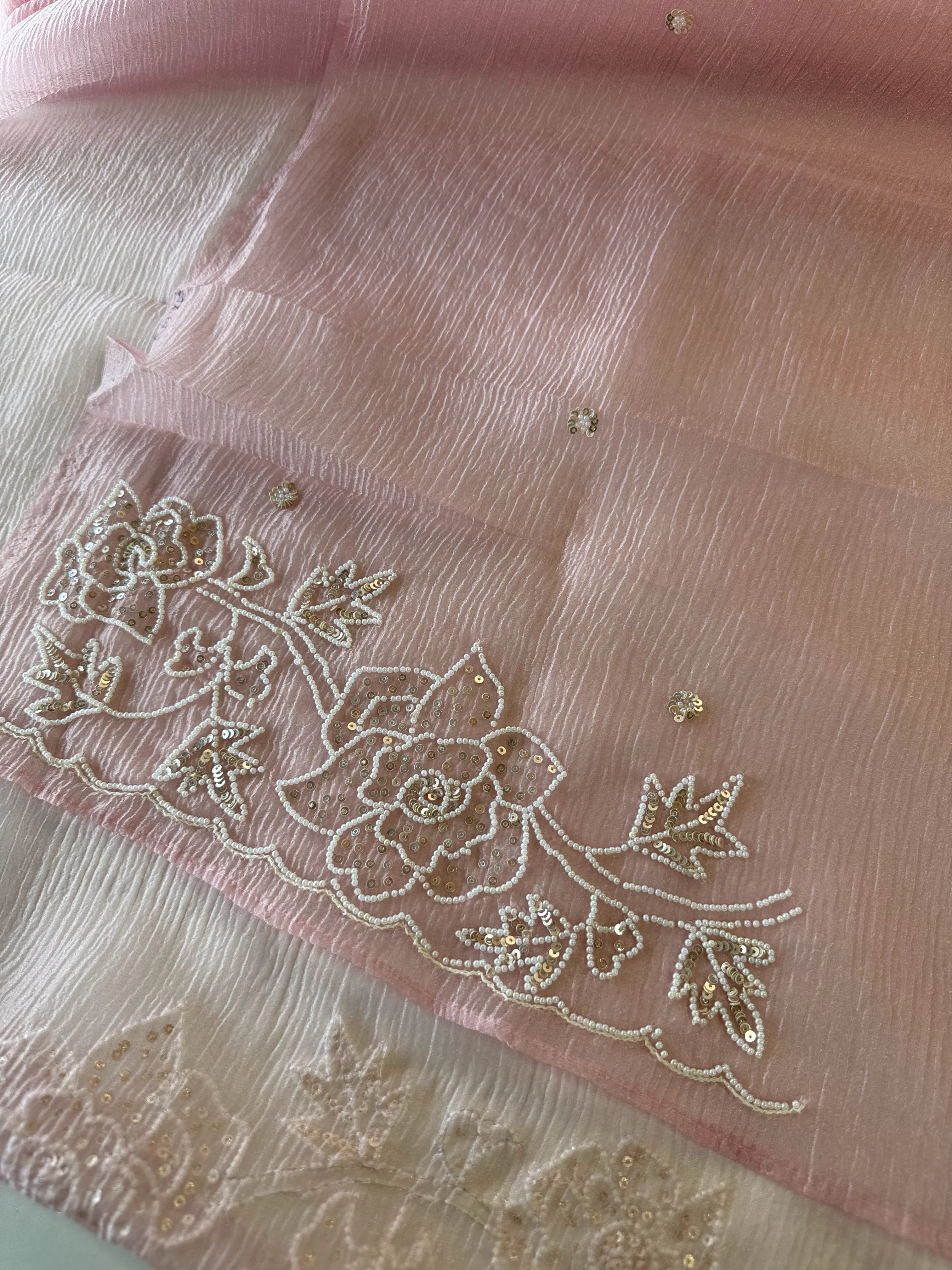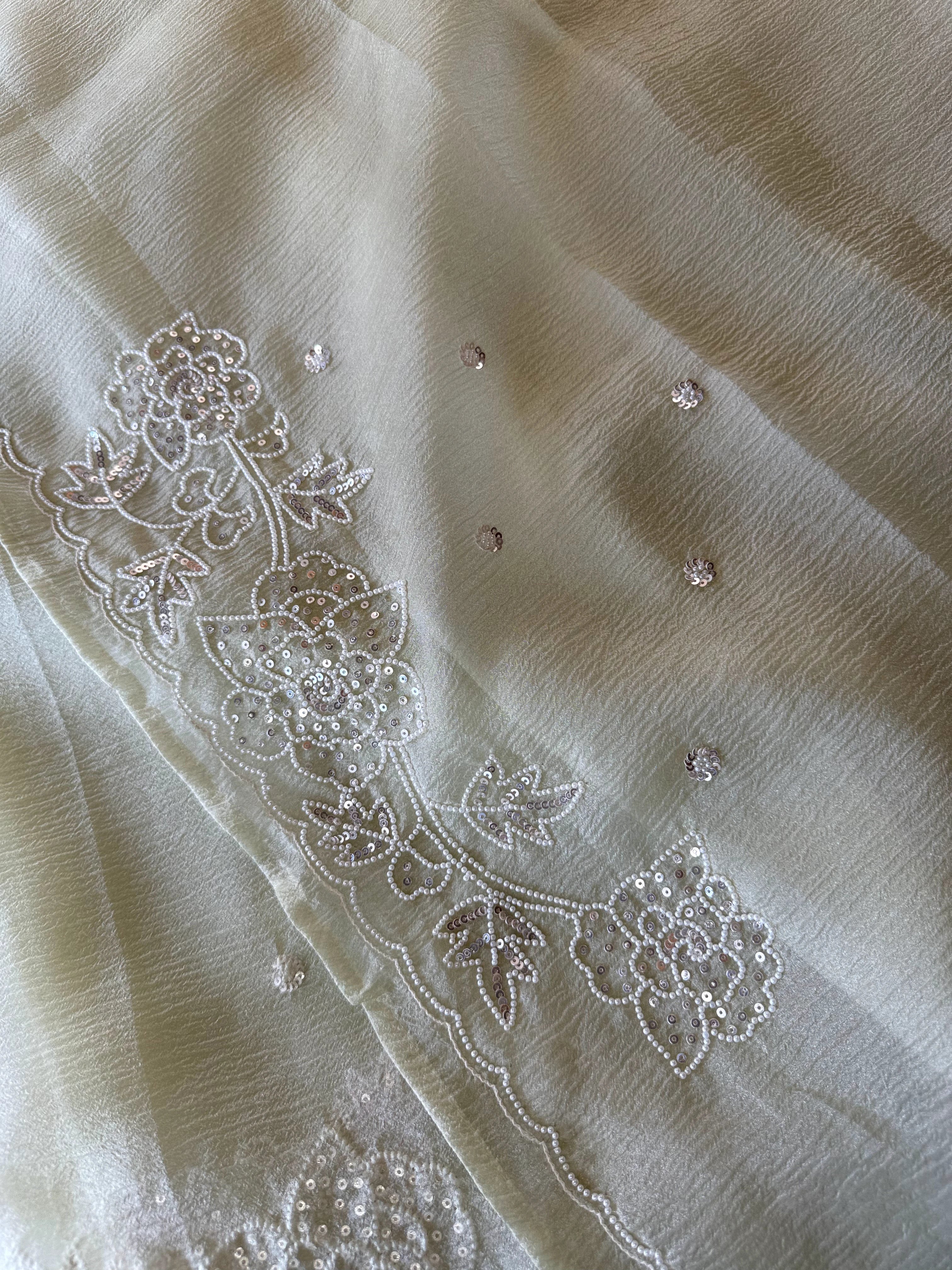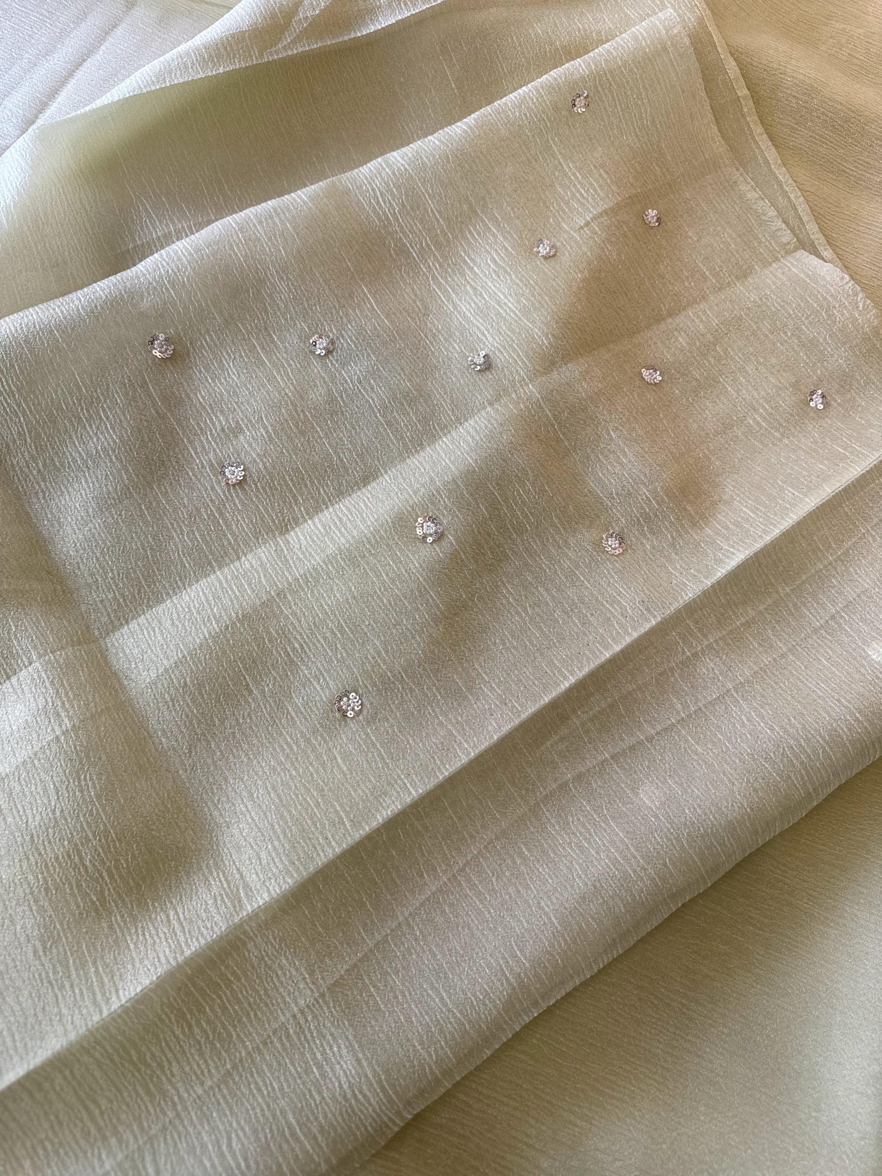 Platinum Crush Saree – A graceful drape featuring exquisite pearl work along the borders throughout. Feather-light and flowy, with a very mild transparency that adds an elegant charm. The blouse comes with delicate scattered pearl work at the back, while the sleeve ends carry matching border detailing for a refined finish.