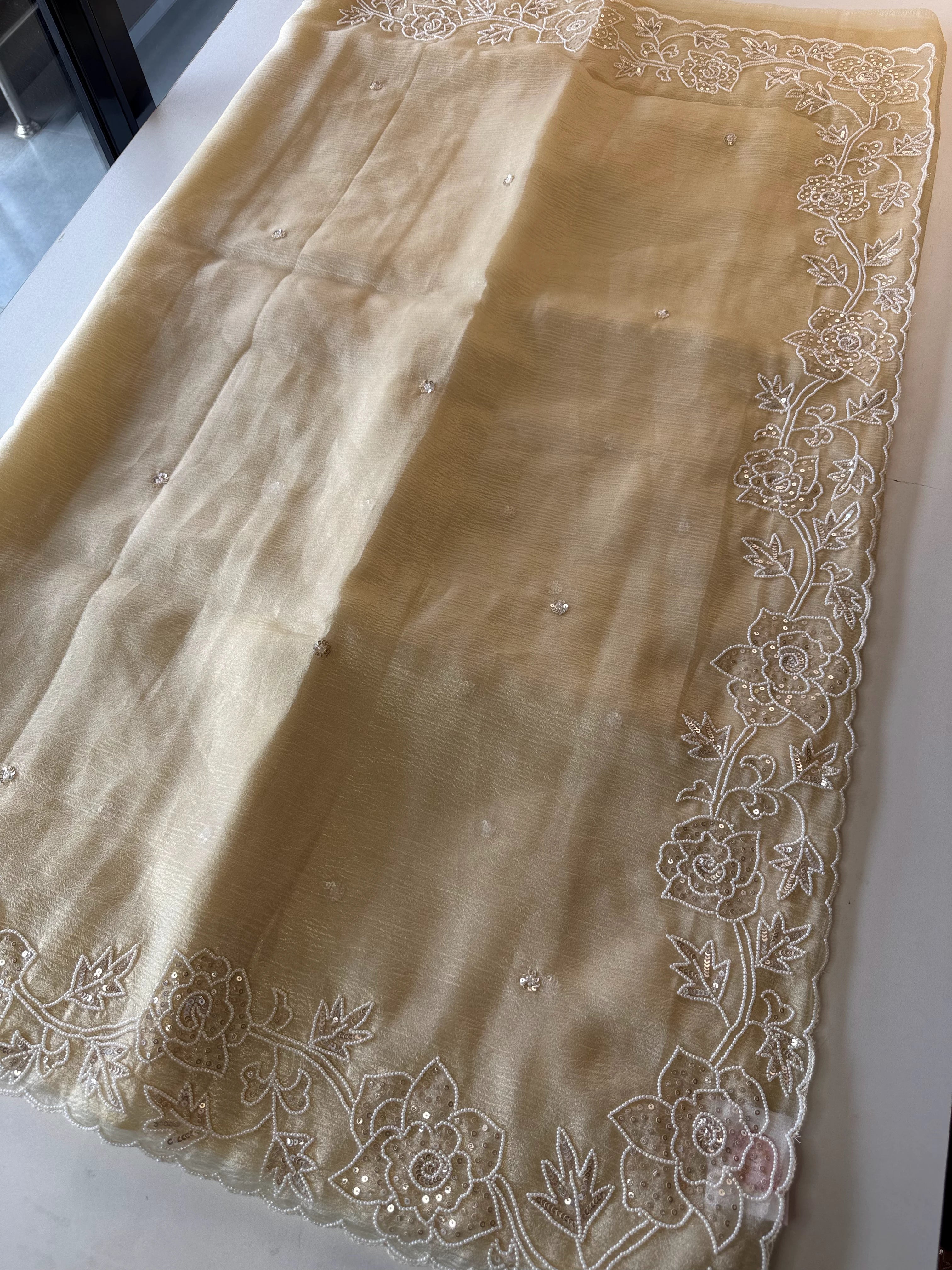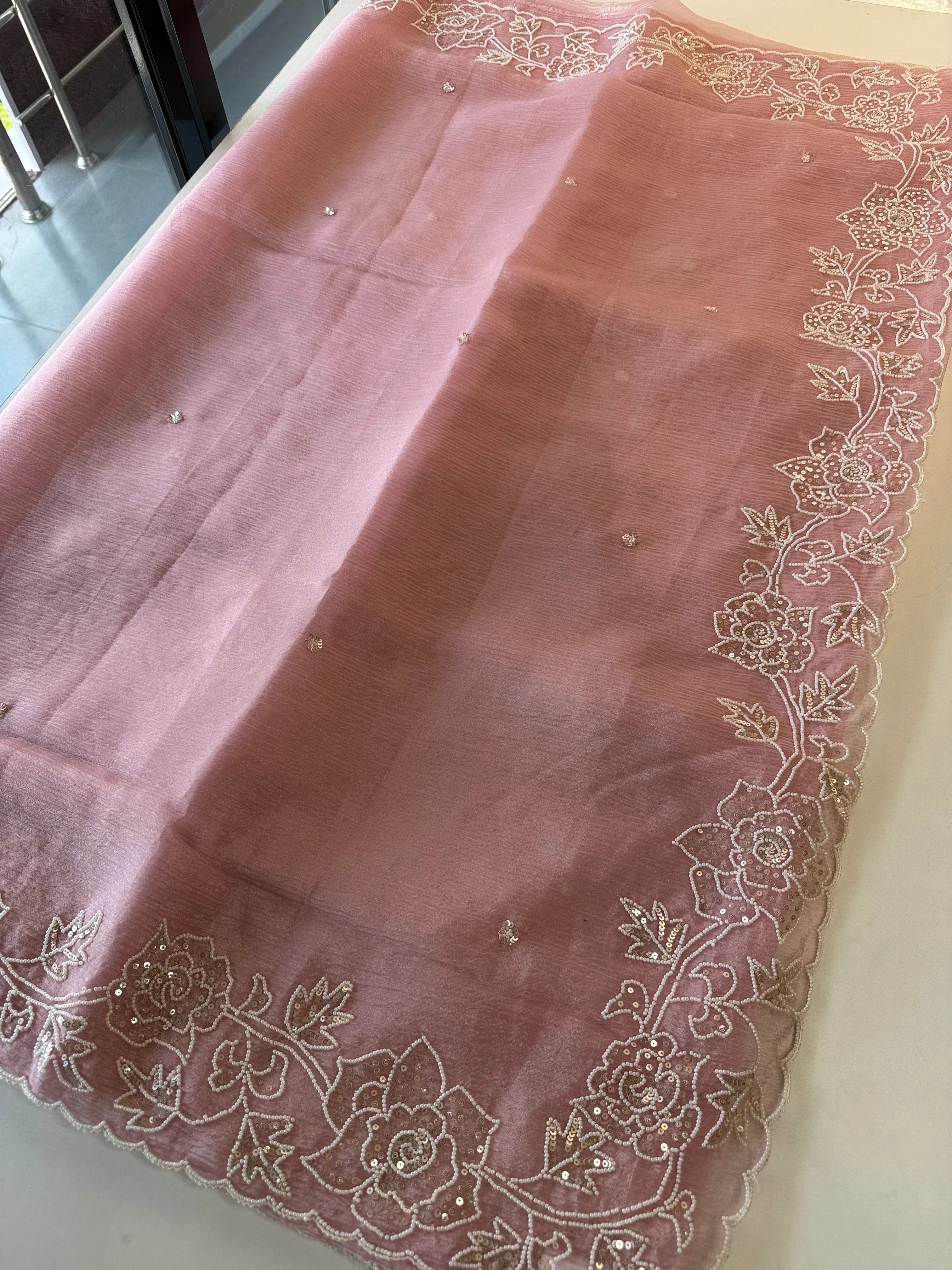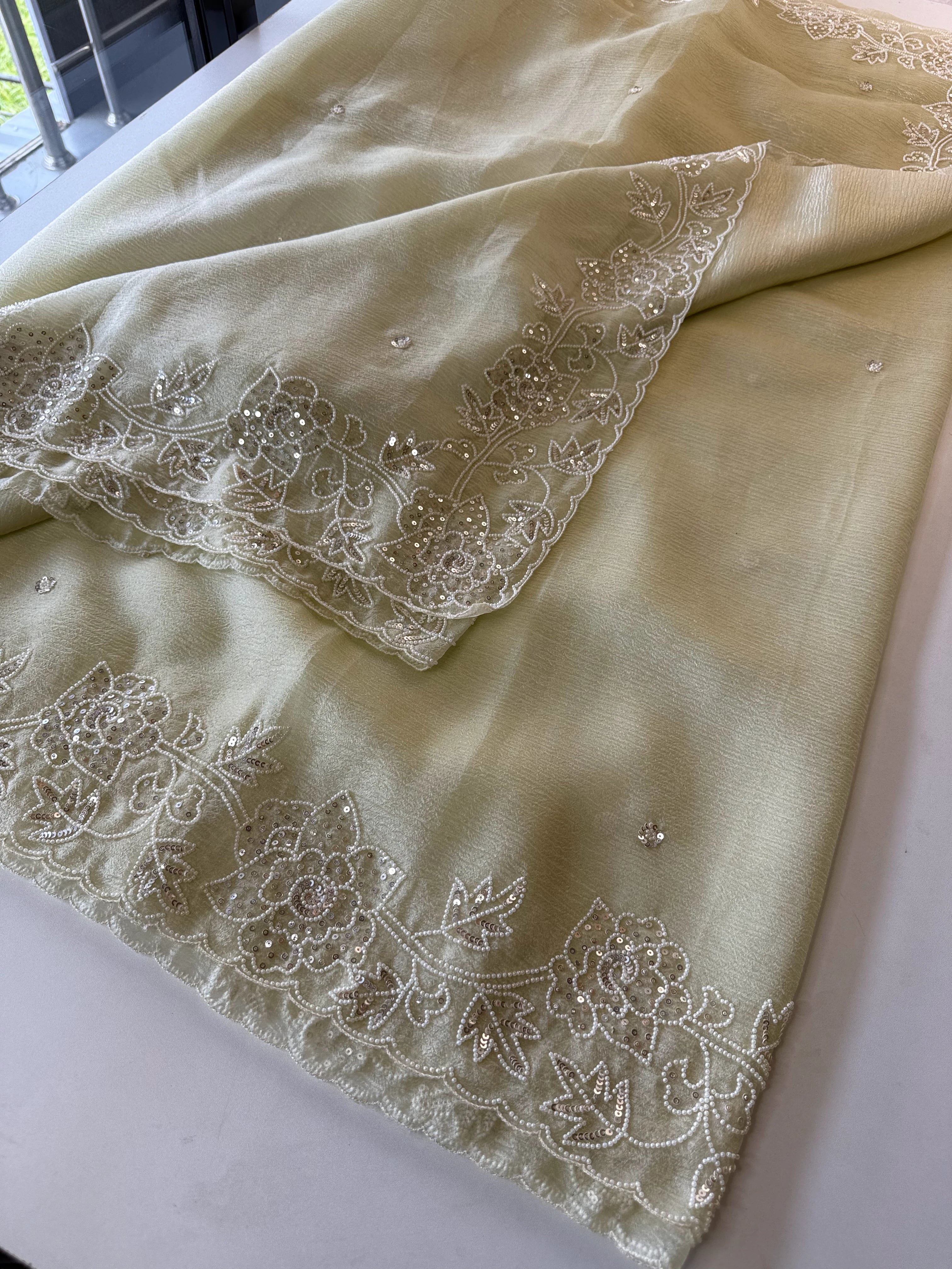 Platinum Crush Saree – A graceful drape featuring exquisite pearl work along the borders throughout. Feather-light and flowy, with a very mild transparency that adds an elegant charm. The blouse comes with delicate scattered pearl work at the back, while the sleeve ends carry matching border detailing for a refined finish.