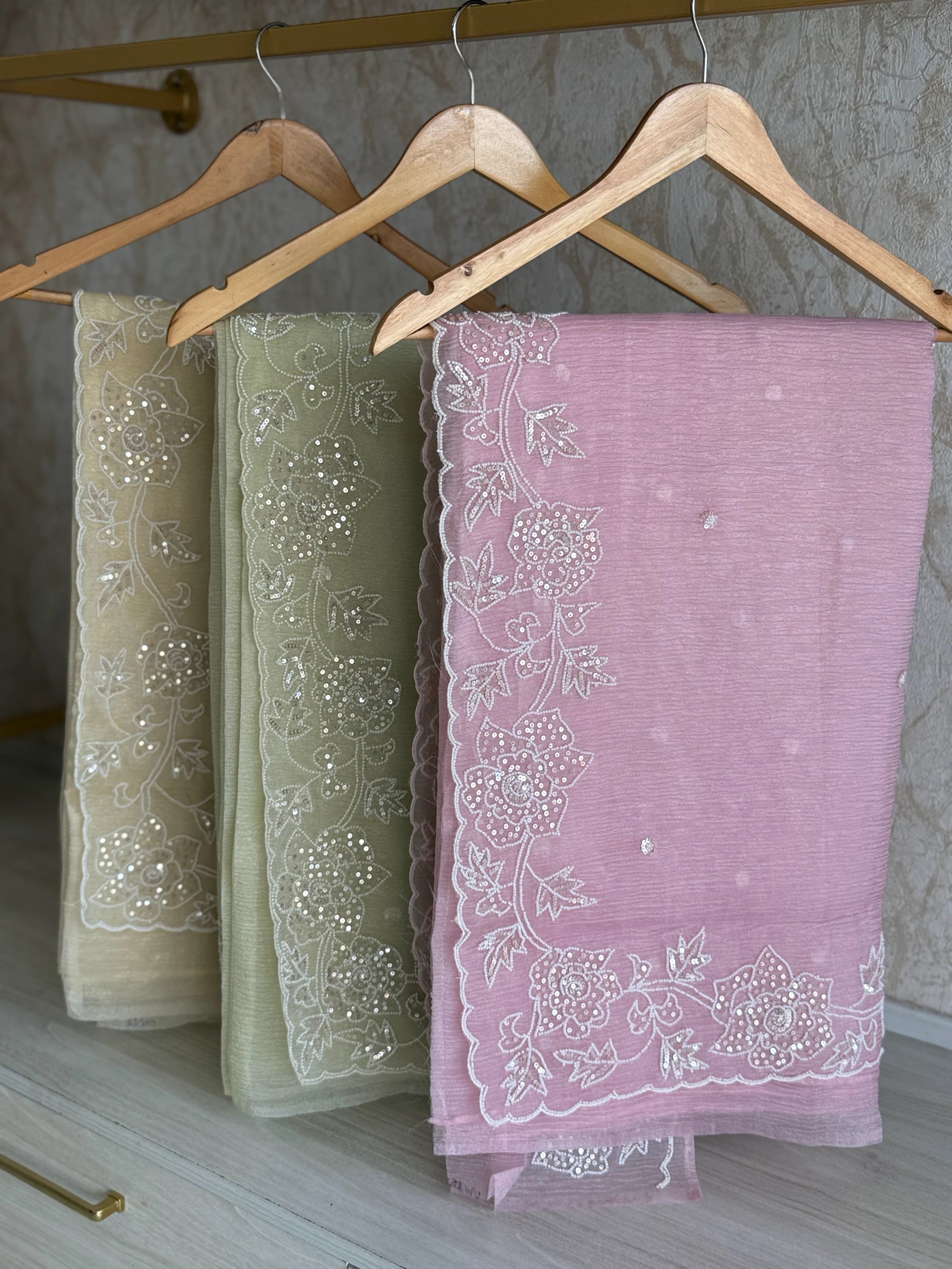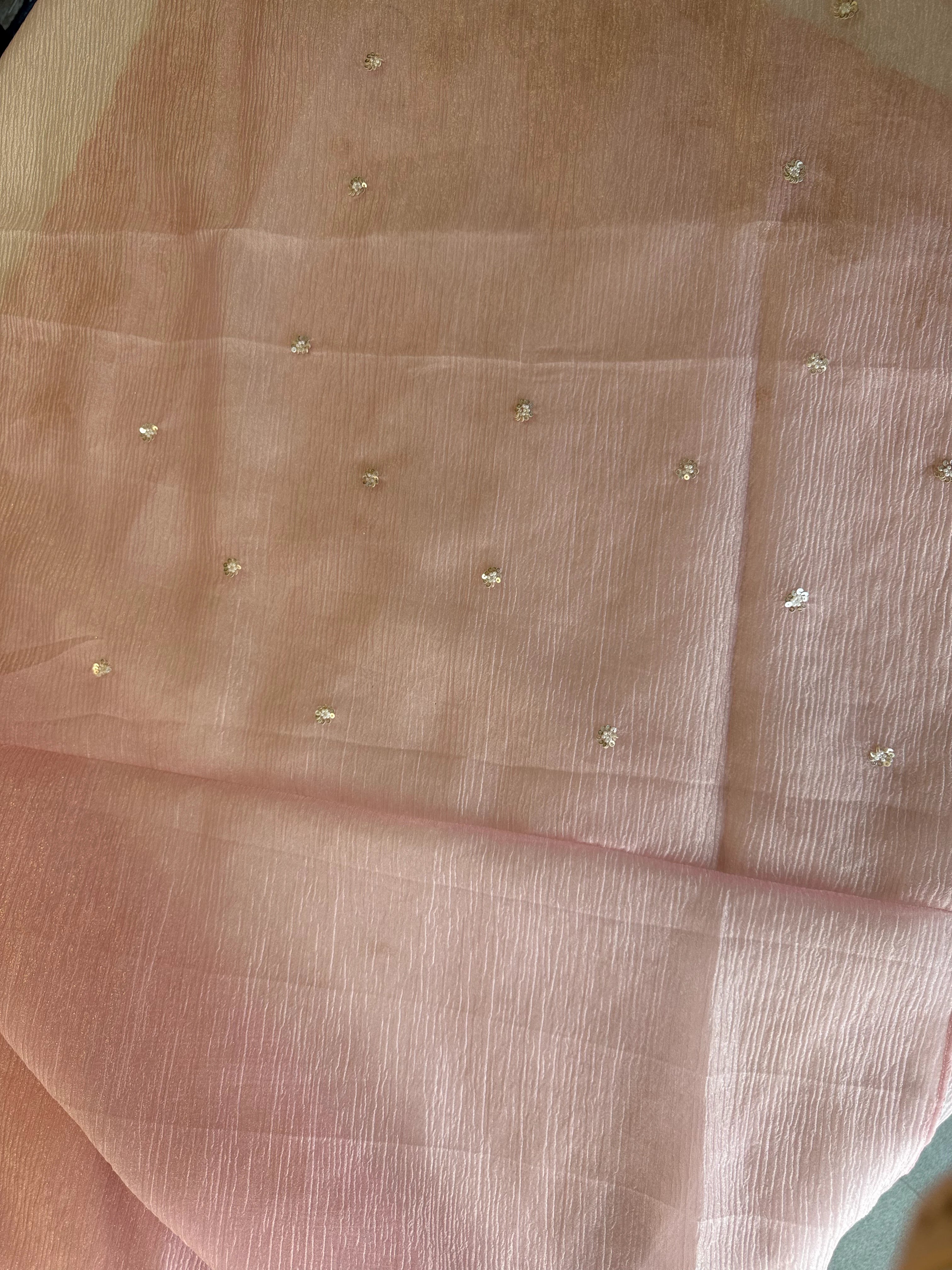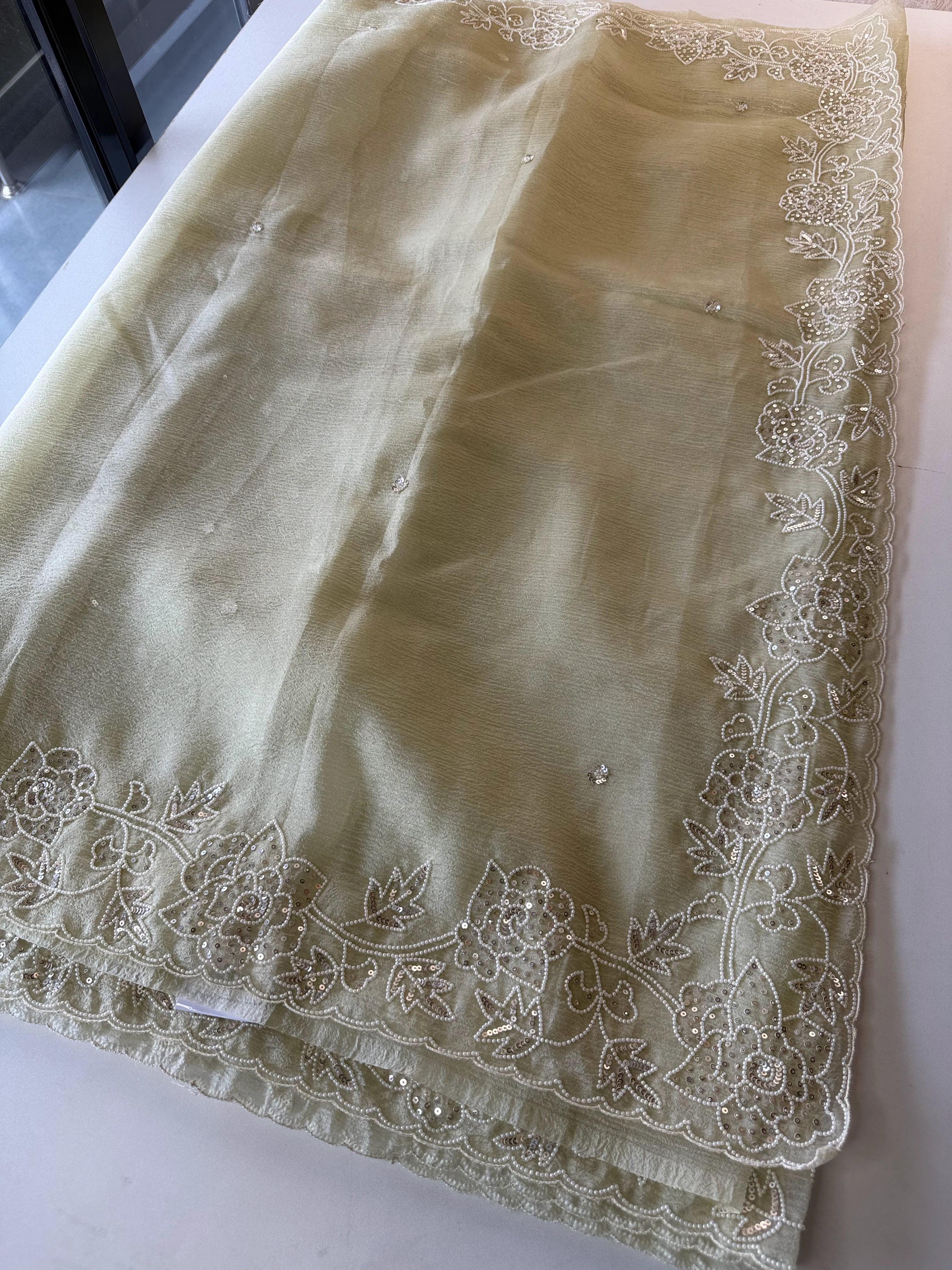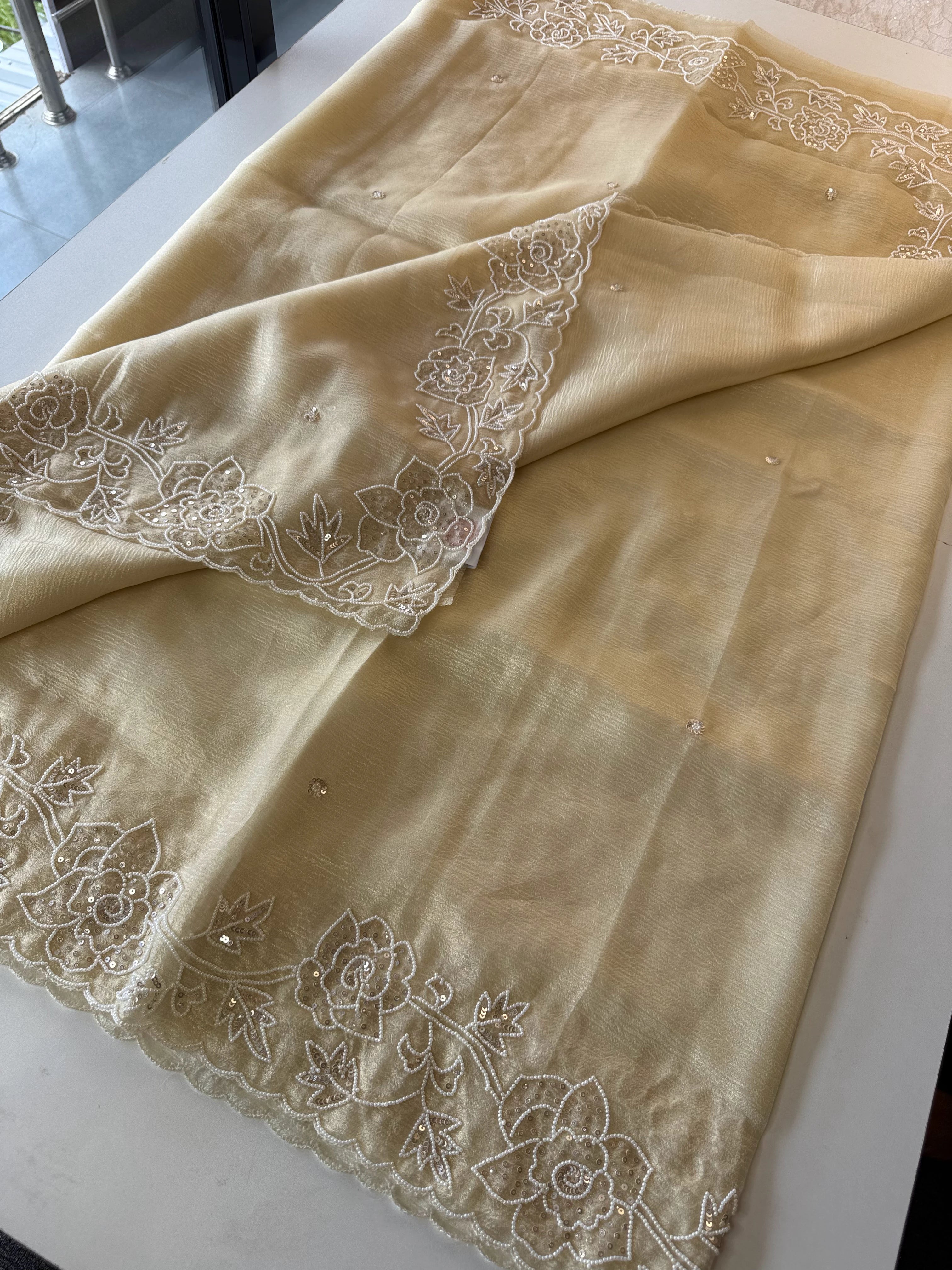 Platinum Crush Saree – A graceful drape featuring exquisite pearl work along the borders throughout. Feather-light and flowy, with a very mild transparency that adds an elegant charm. The blouse comes with delicate scattered pearl work at the back, while the sleeve ends carry matching border detailing for a refined finish.